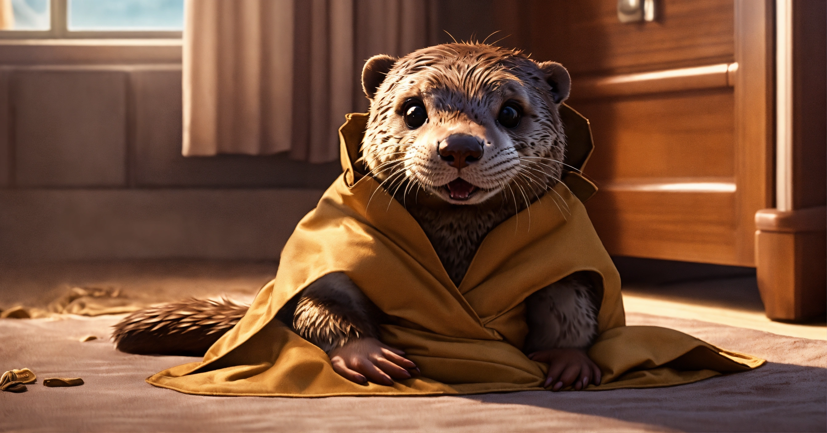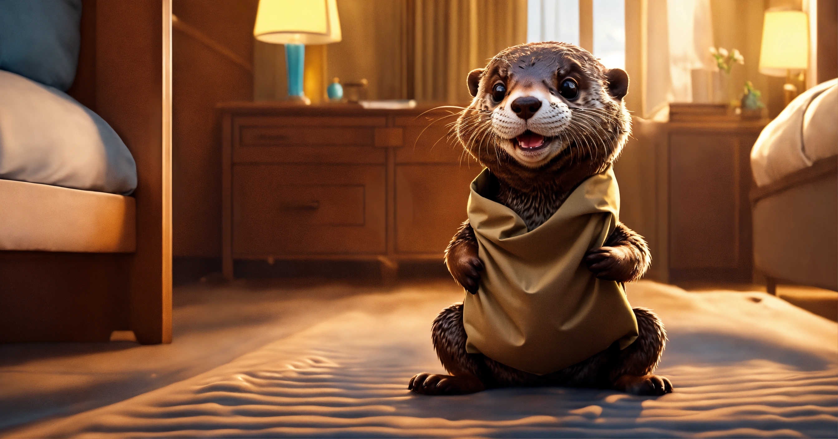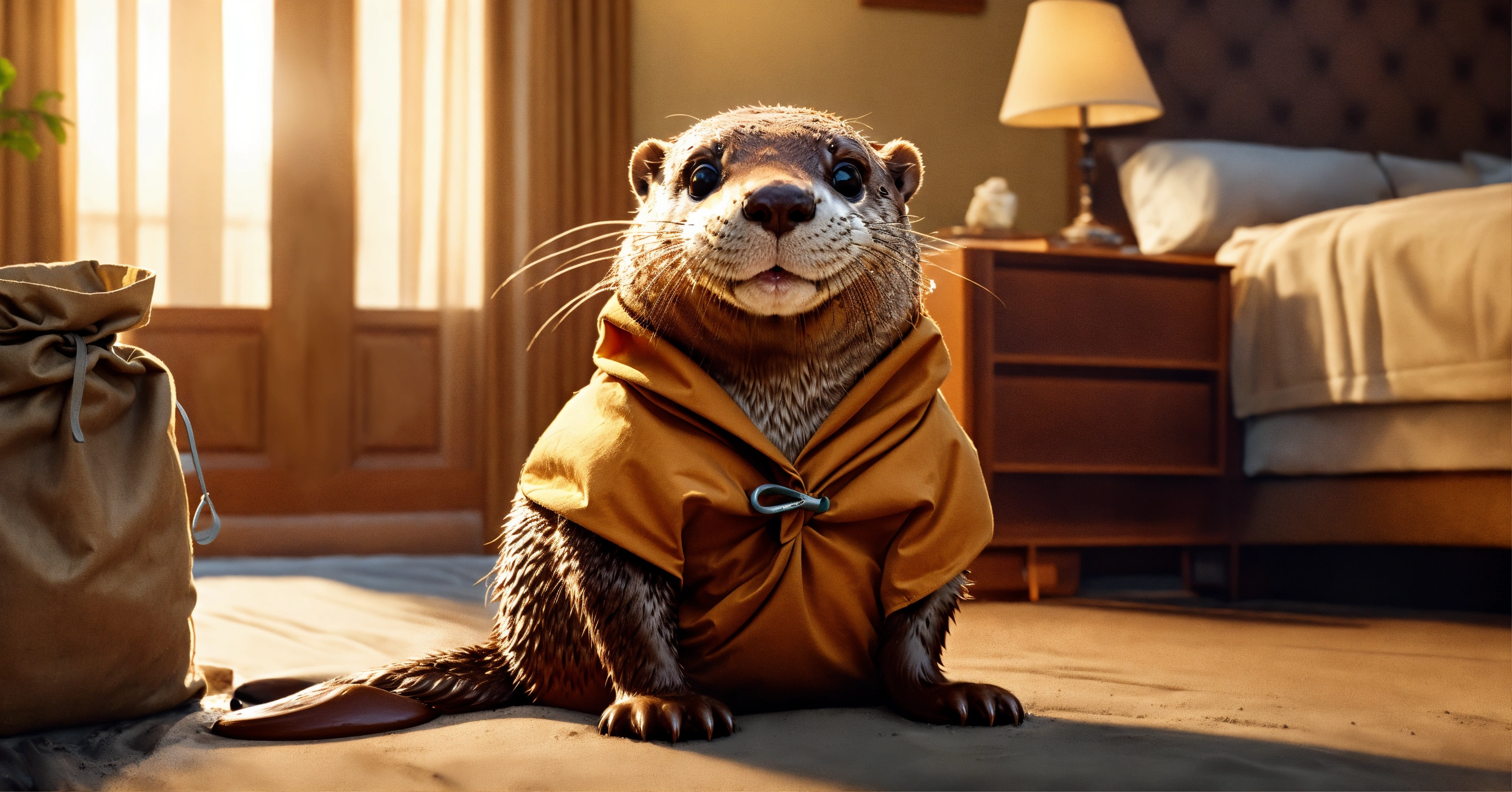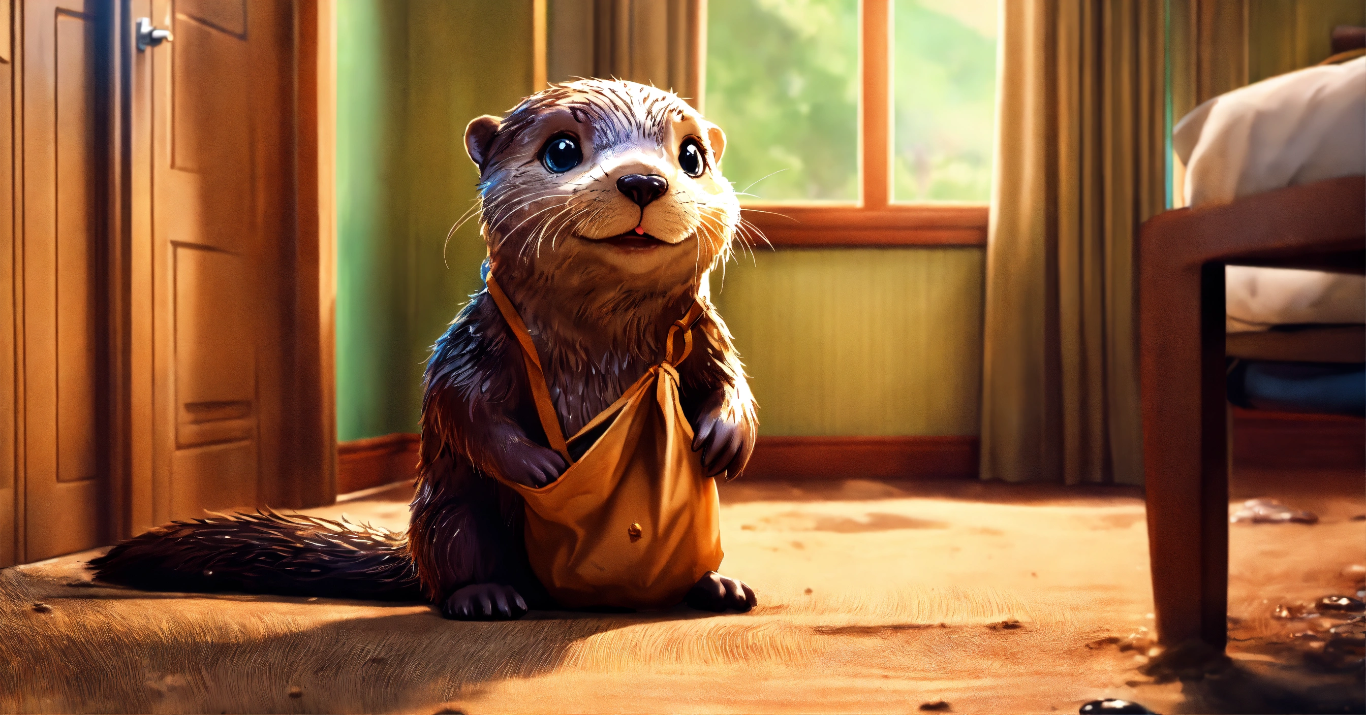 A muddy otter coming out a sack dirty but cute on a hotel room cartoon