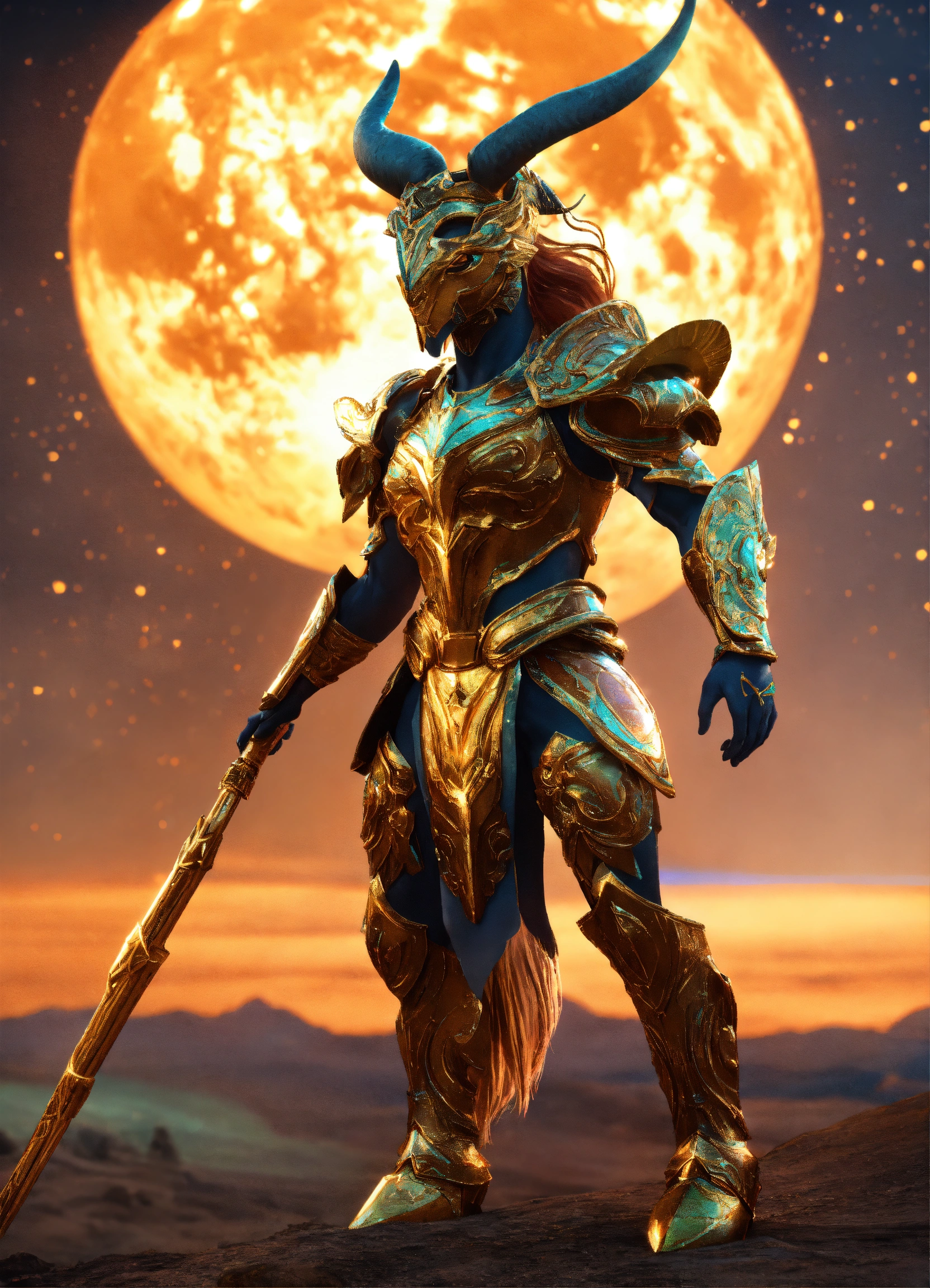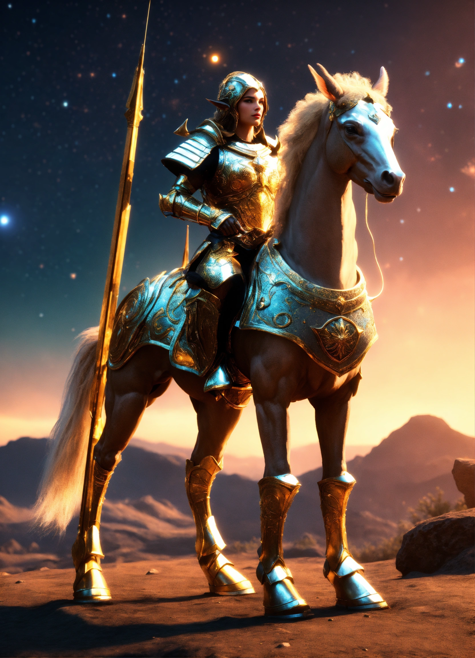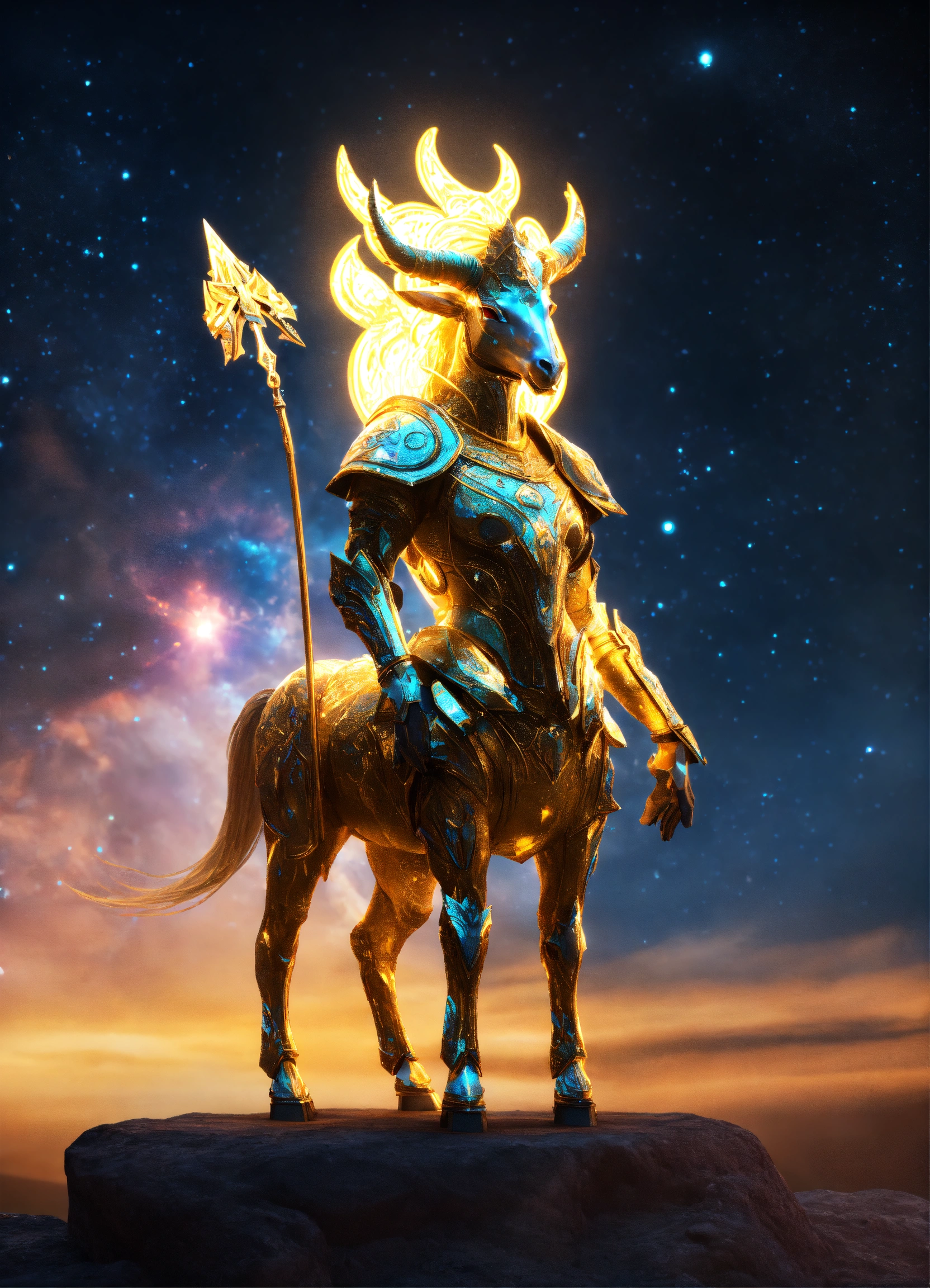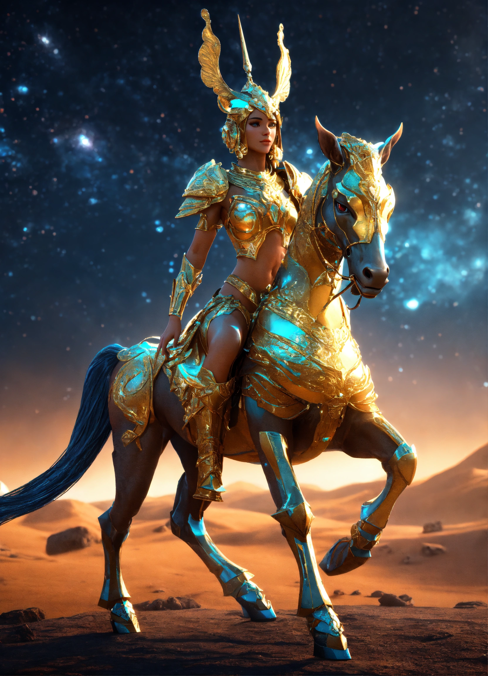 Celestial centaurion in 8k ultra 3d, this centaur-like creature dons celestial armor that gleams with an otherworldly radiance, embodying the essence of cosmic protection.