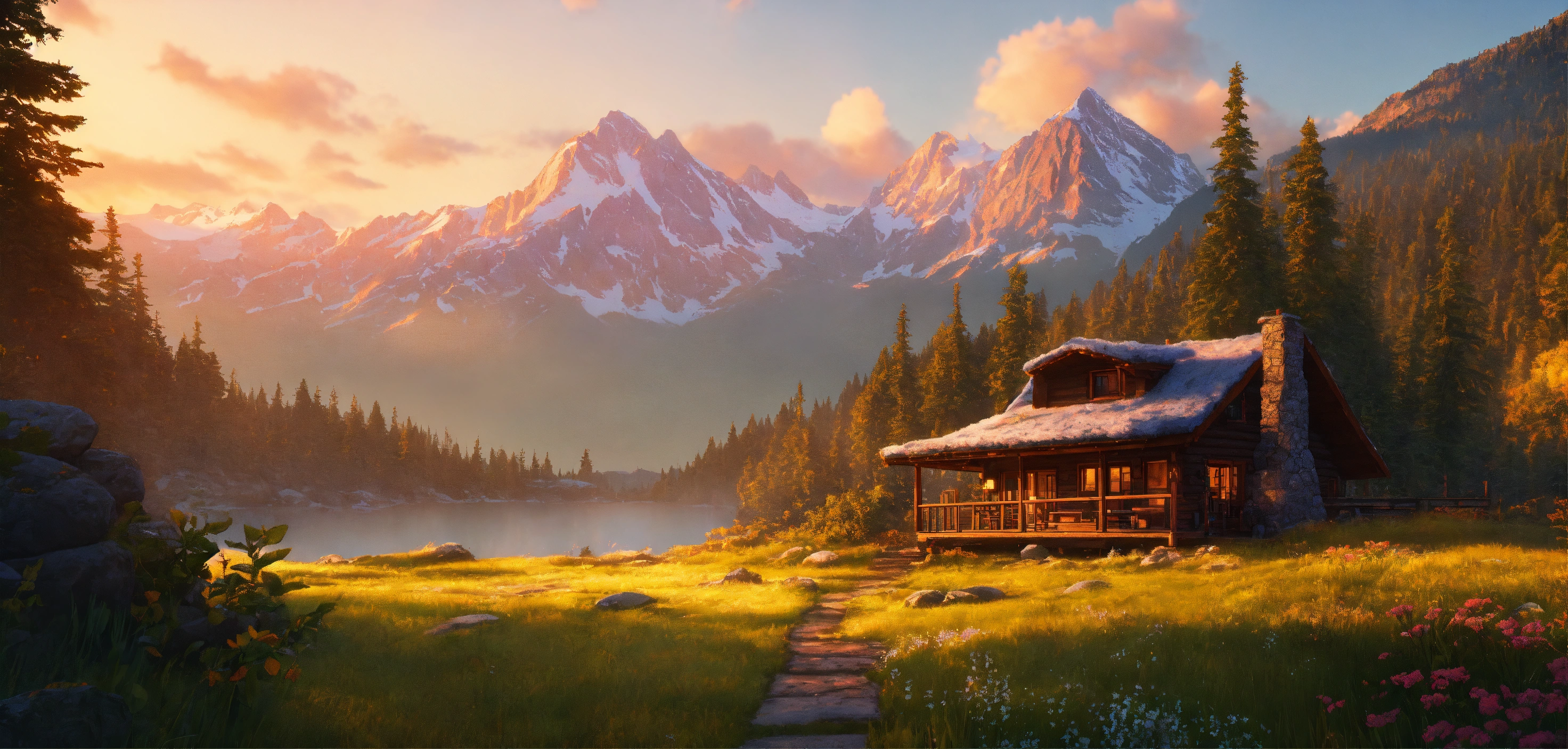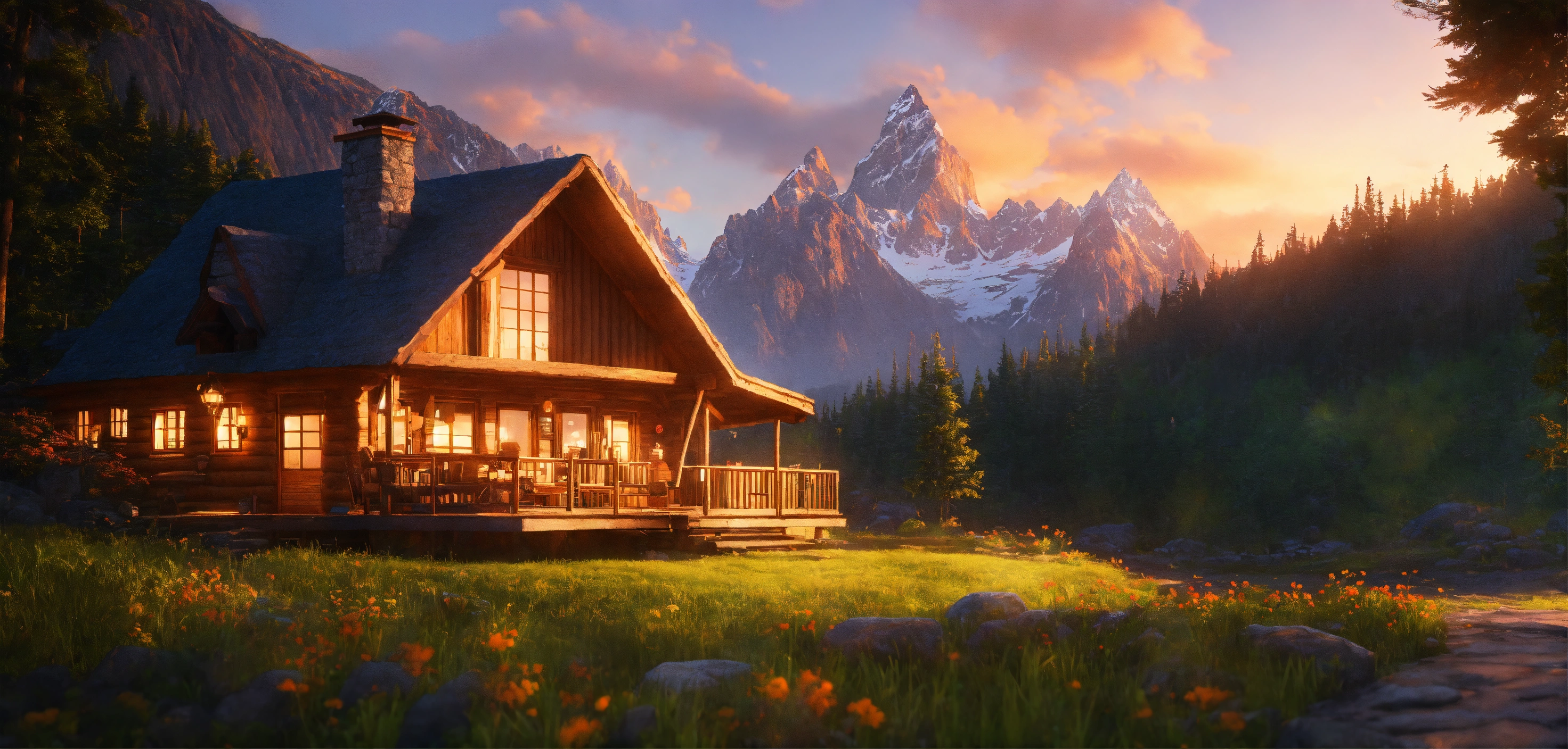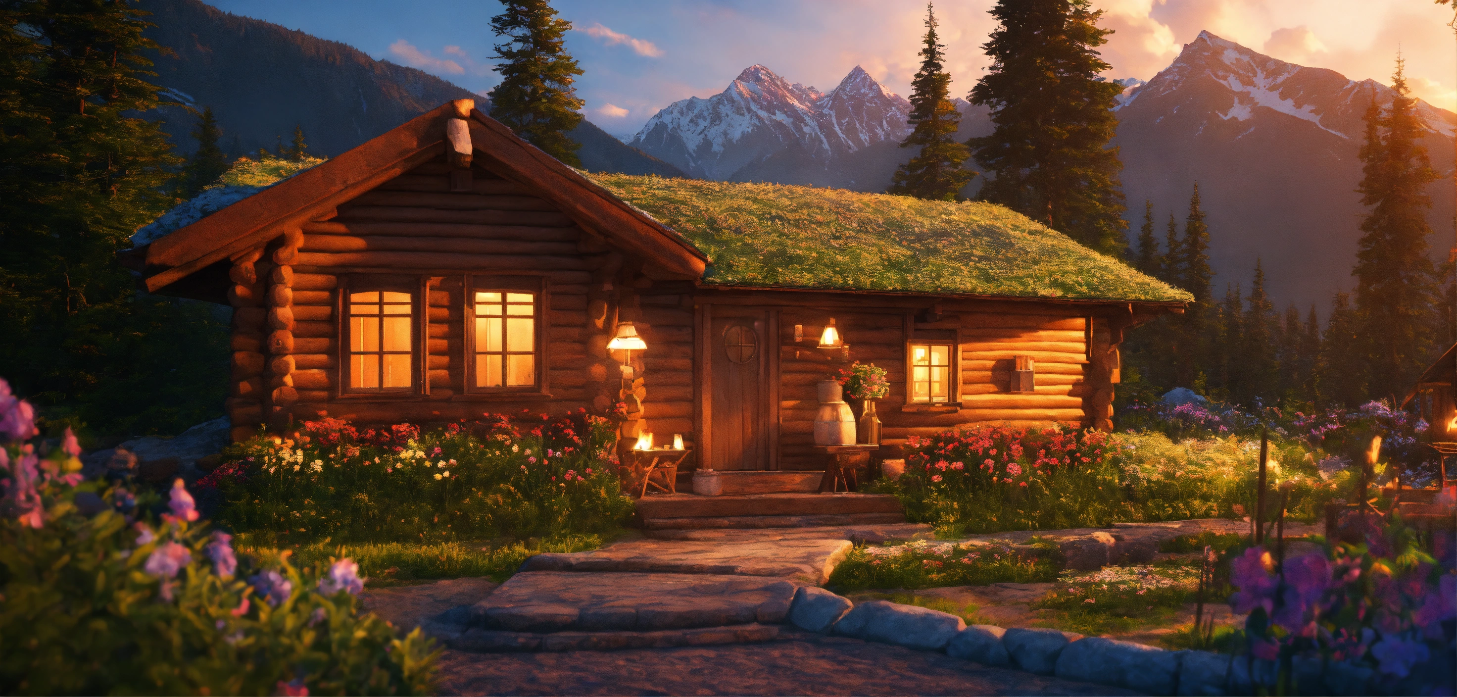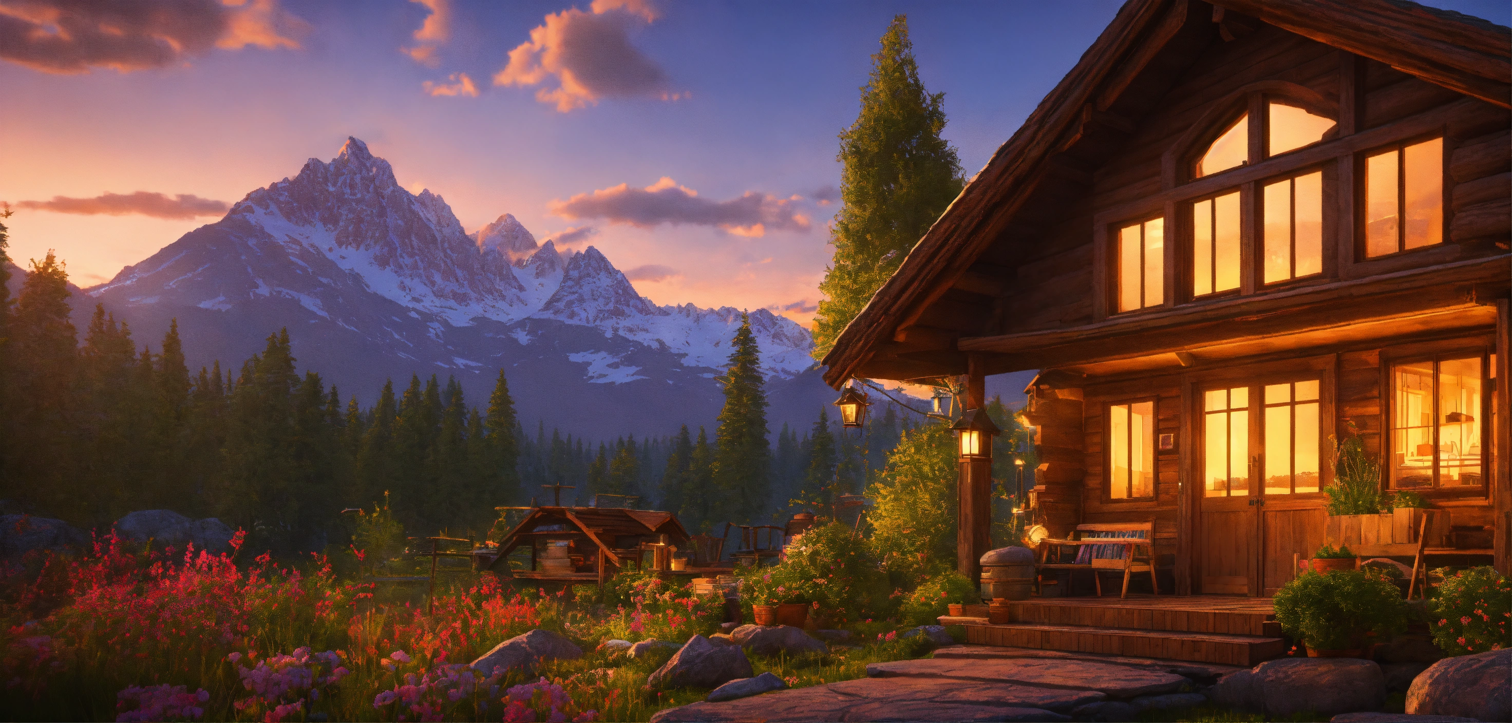 Stock photo of nature, herbs, natural remedies, outside of a beautiful warm cabin lodge with the warm snowpeaked idyllic mountains behind the cabin, warm and cozy dawn natural cinematic scene, in the art style of hayao miyazaki-like, quaint ambient lighting highly detailed, high resolution, scene from disney or pixar movie high resolution 3d ai detailsimilar to product from midjourney ai
