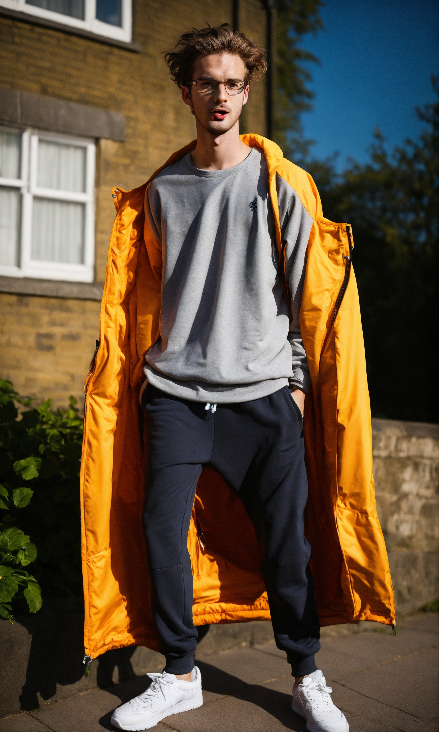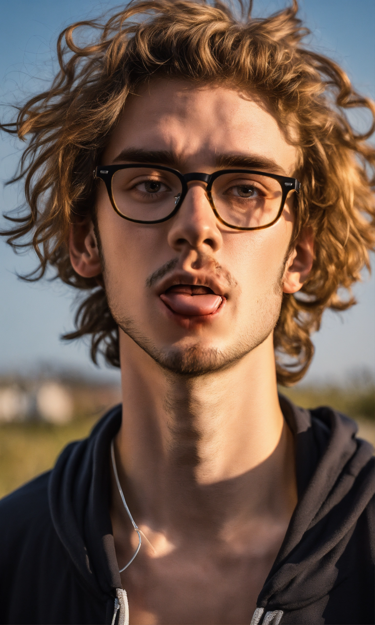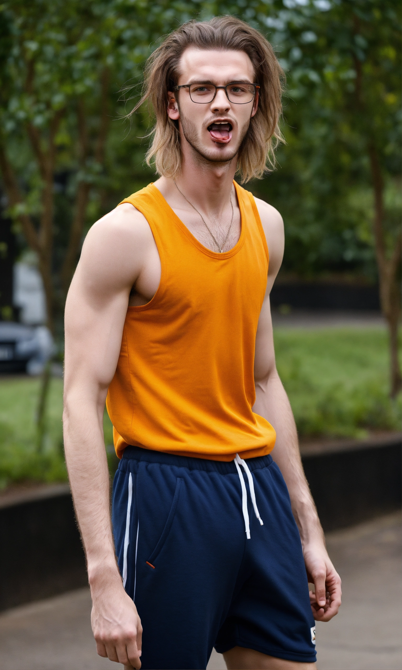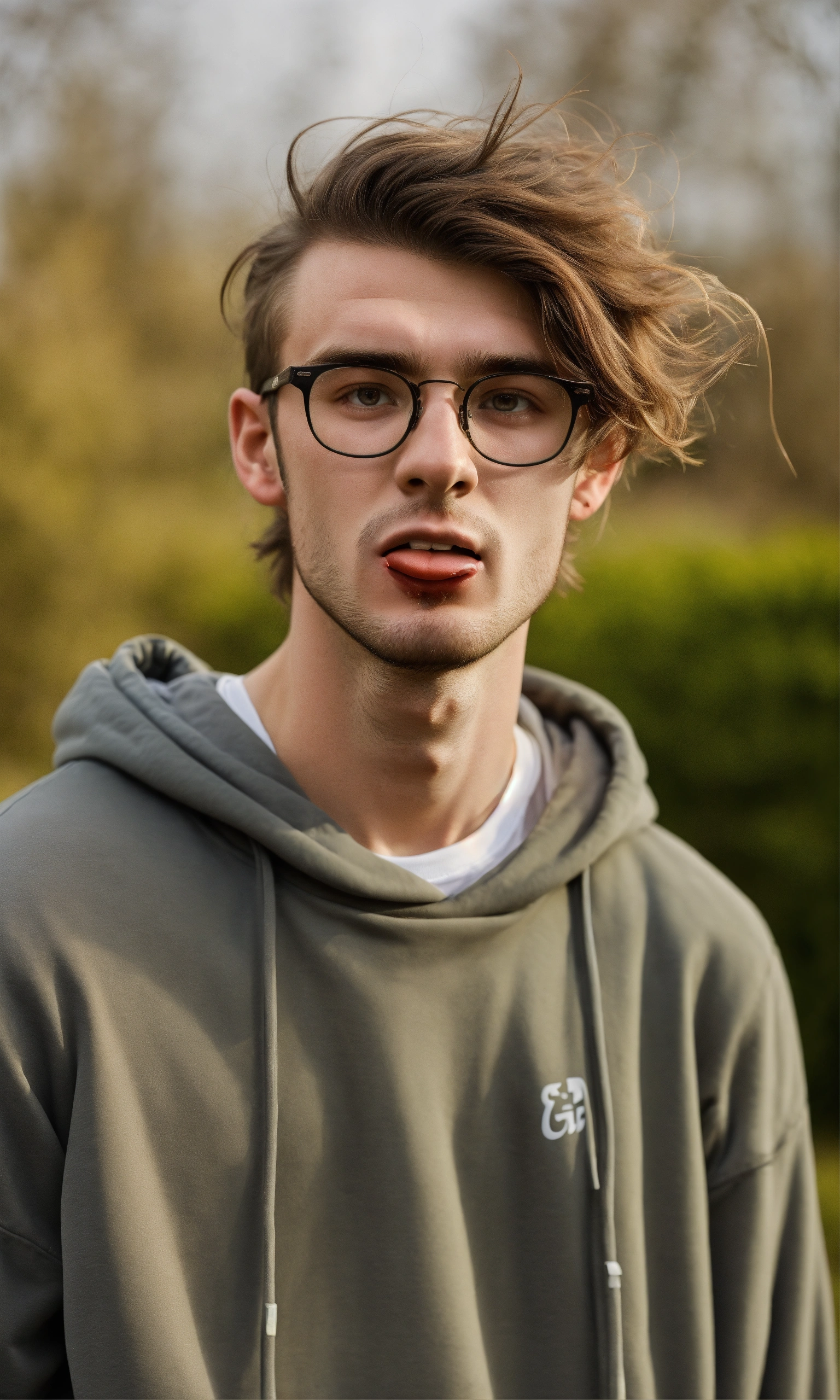 Ugly, skinny, 25 year old british man, he is wearing jogging bottoms, he has greasy hair and is wearing glasses, his tongue is on fire