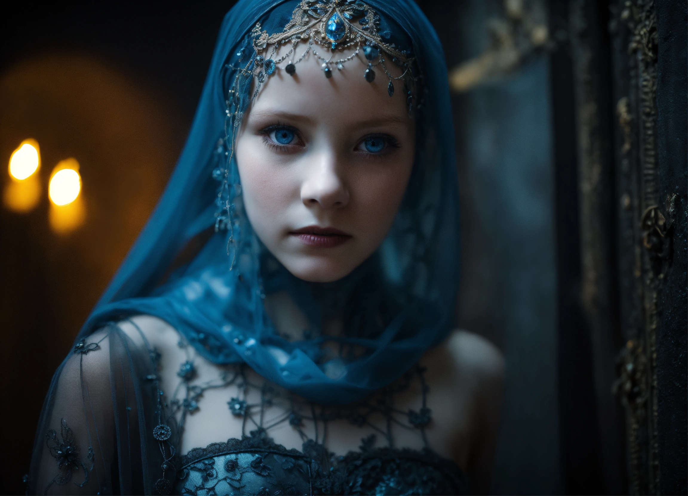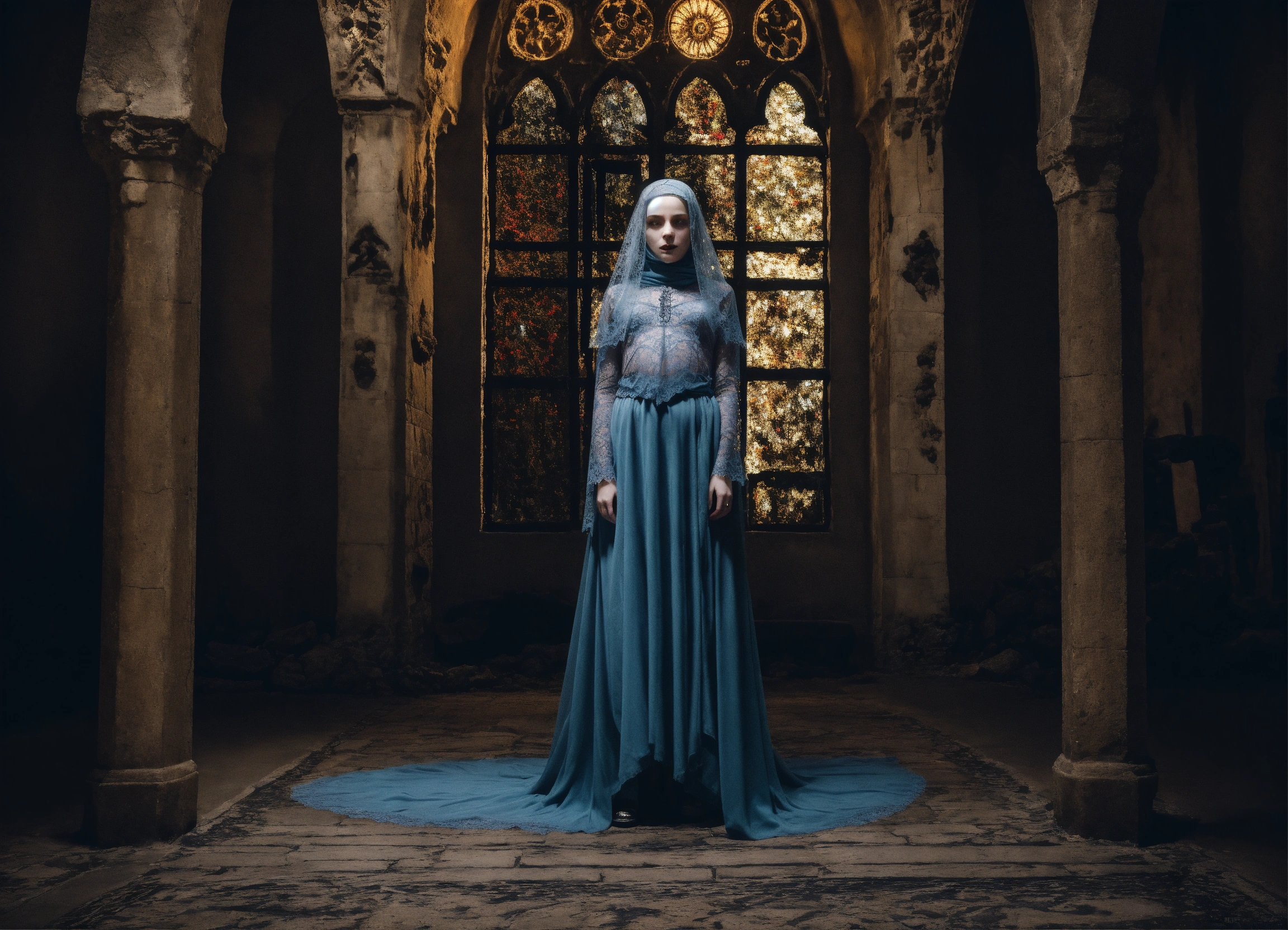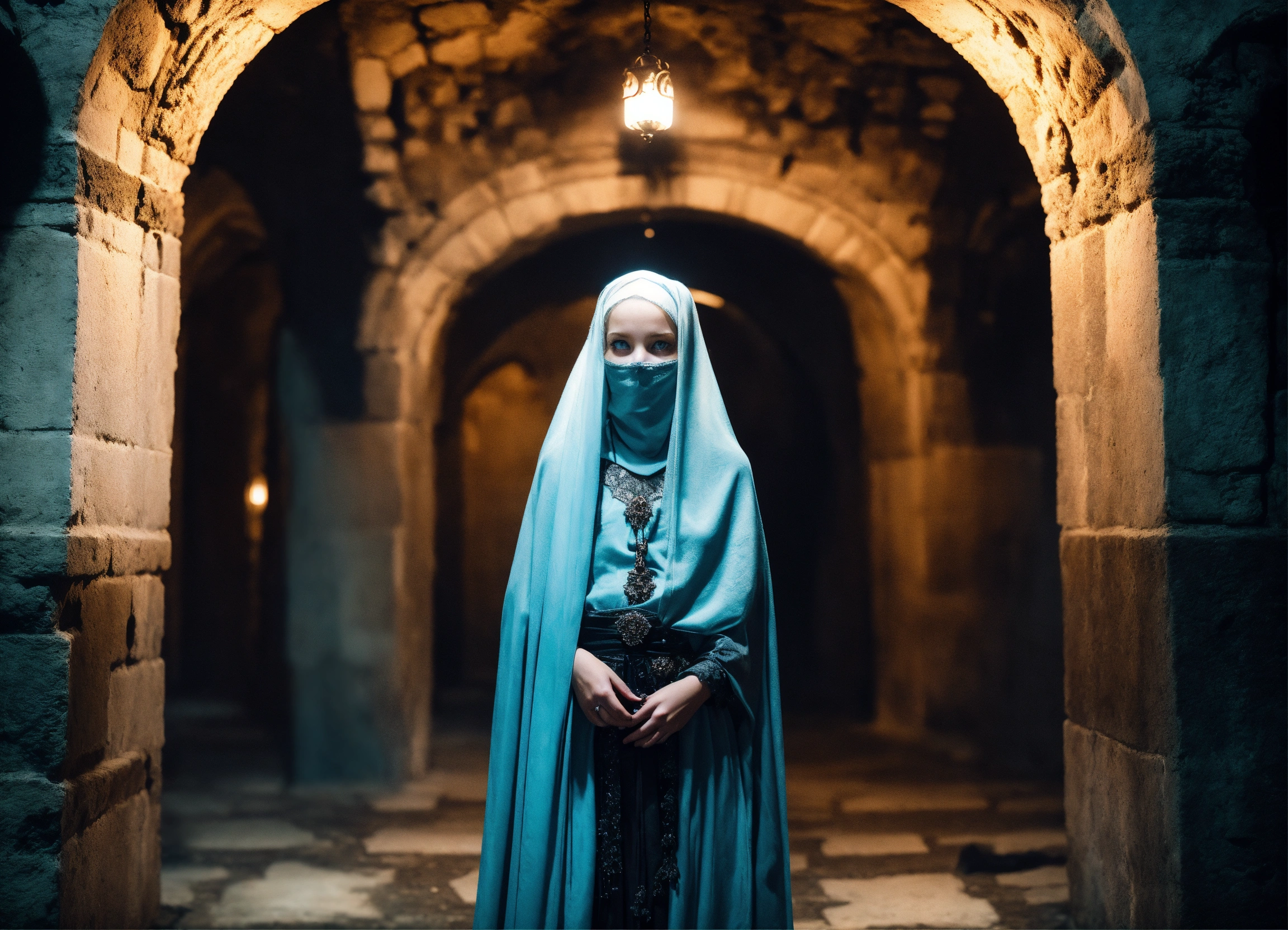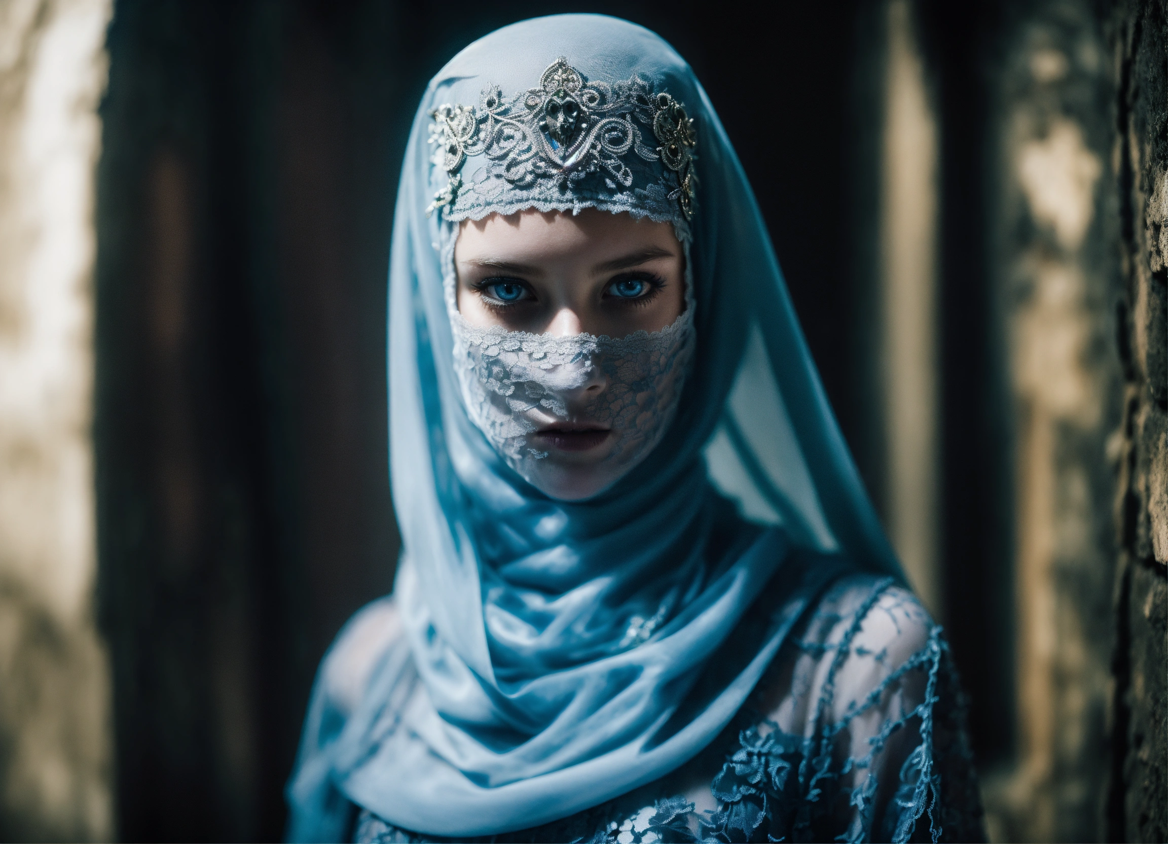 Body portrait of a very childish deadly pale ultra slim twelve year old female child, she is a goth necromancer with waist long silverwhite hair, lace niqab, face veil, belly dancer outfit, ultra skinny, ultra slim body, ultra emaciated body, completely emaciated, ultra narrow face, alabaster skin, pale as a corpse, glowing blue eyes, ultra slim face, innocent looking, in a gloomy crypt, lasziv, kindlich, unschuldig, childlike, graceful, wispy, glowing blue eyes, ghostly, dead, evil, demonic, undead, darkness, grotesque, mysterious, dark, cold ambient lighting, extremely detailed, fantasy, medieval setting