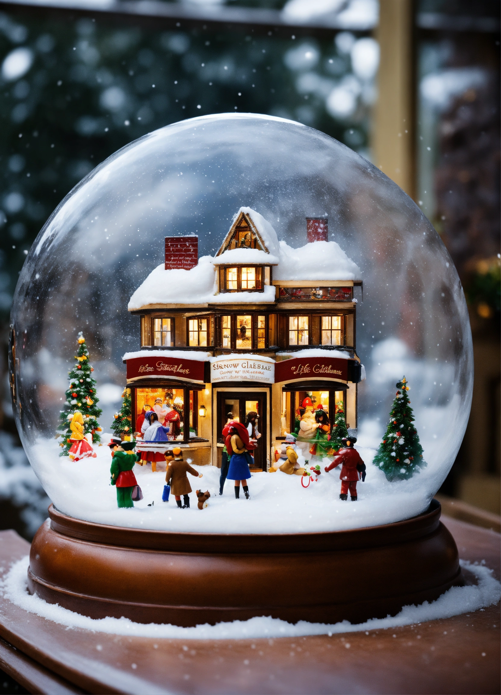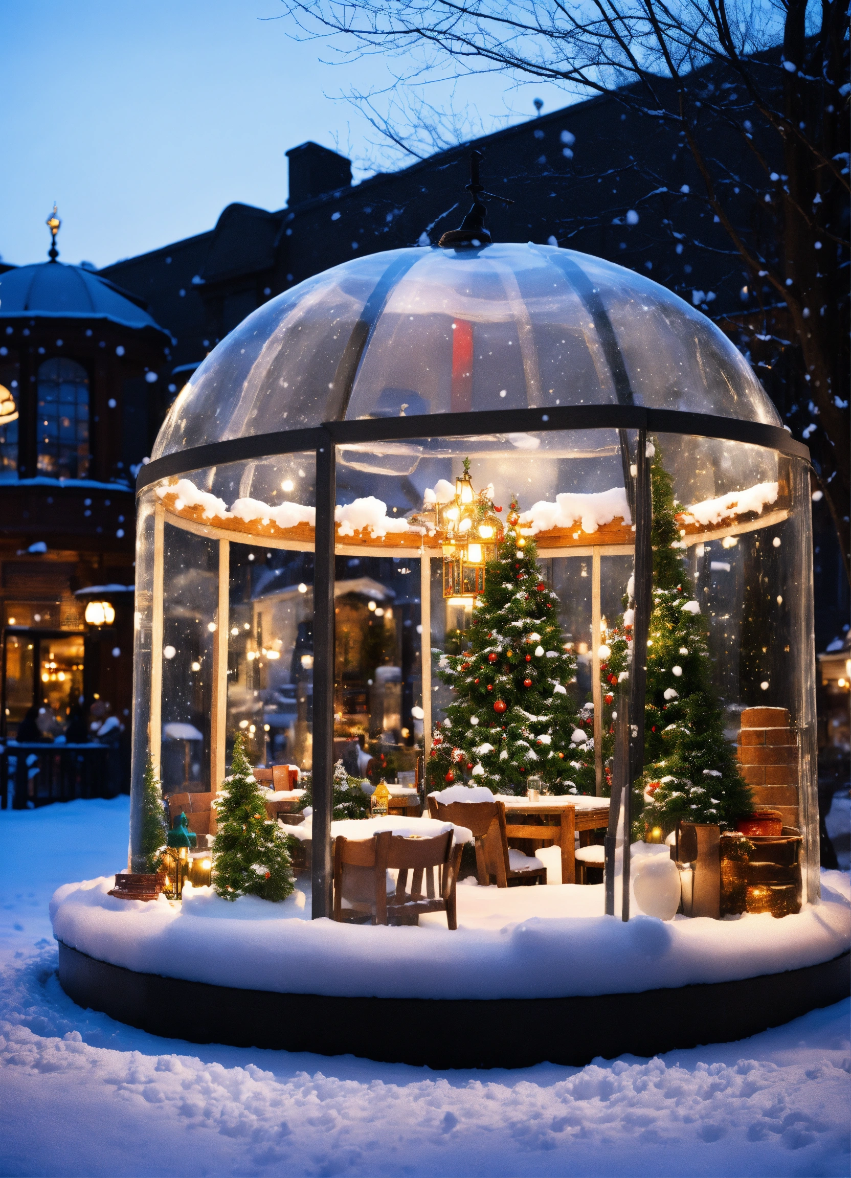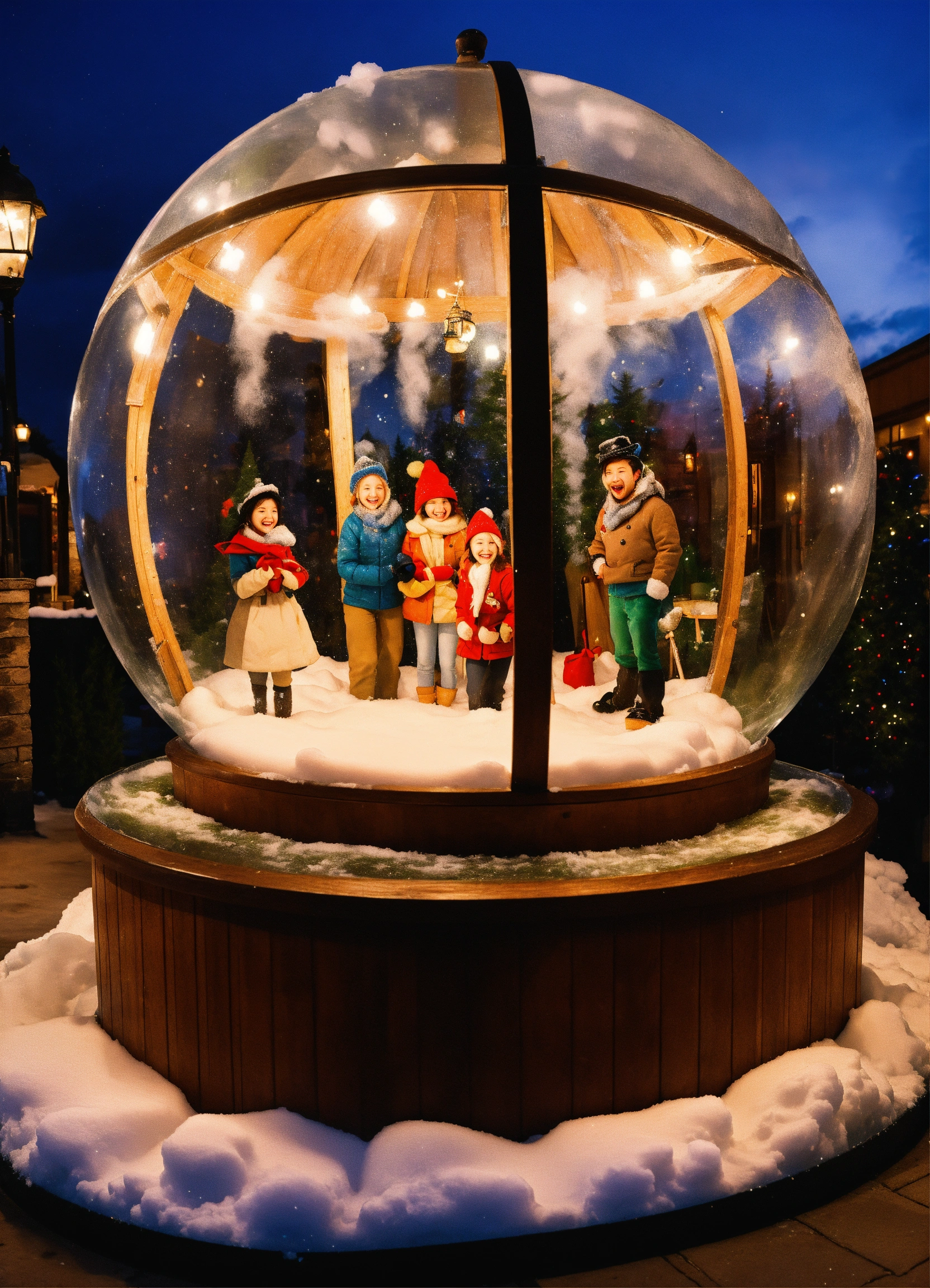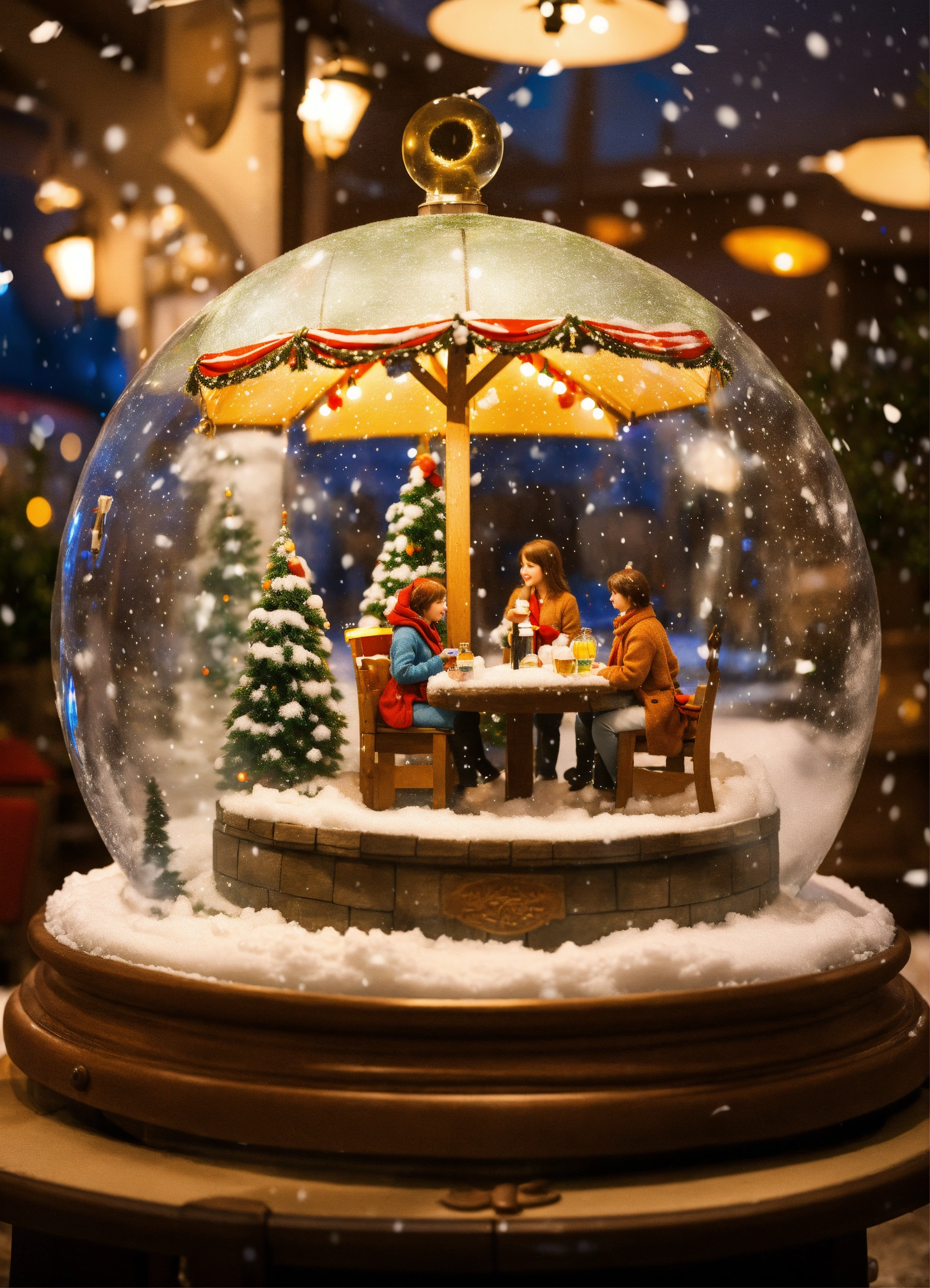 Generate an imaginative scene of friends inside a life-sized snow globe situated in front of the restaurant. the snow globe should have a charming cloud and umbrella theme, complete with artificial snow gently falling around the friends inside