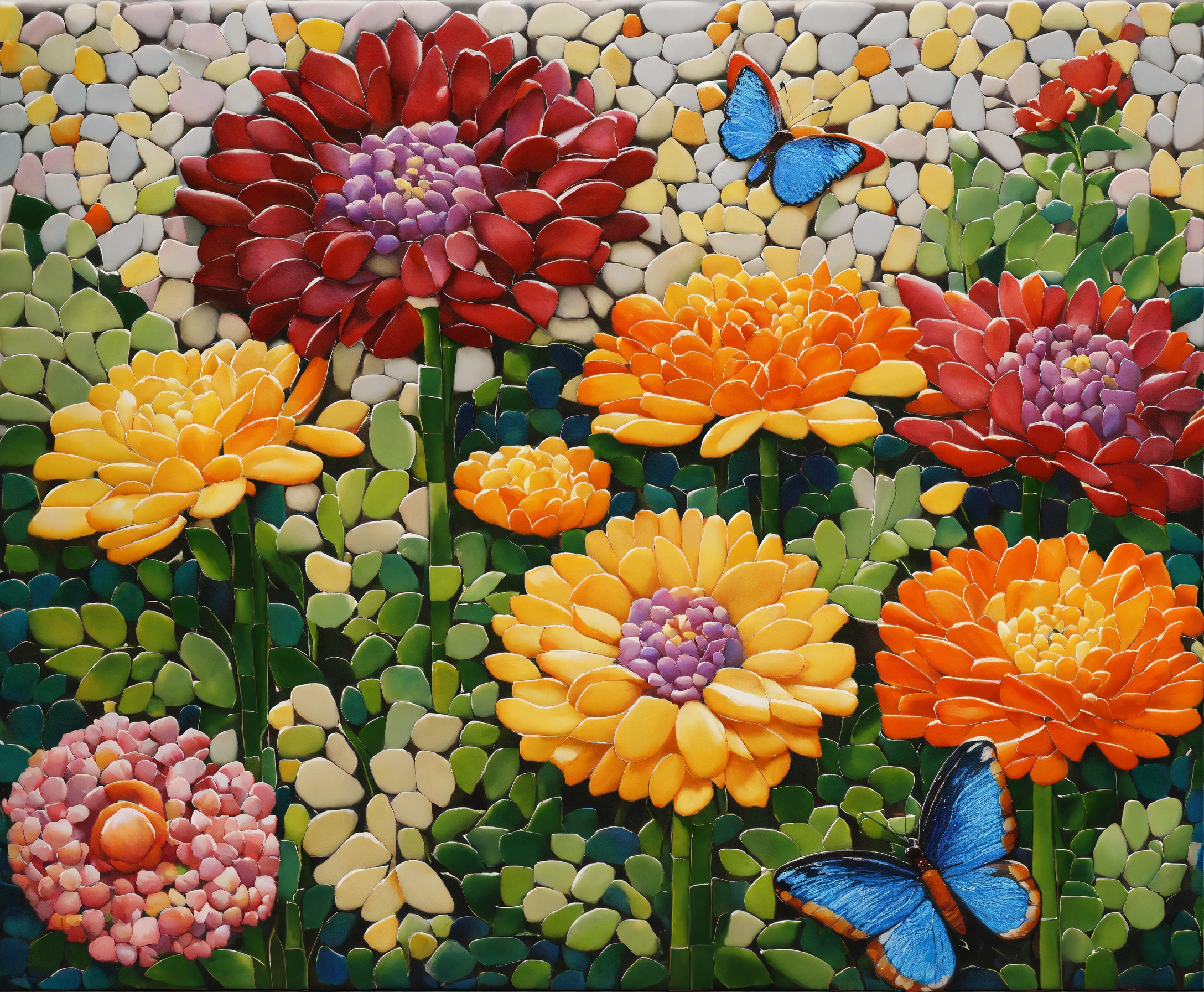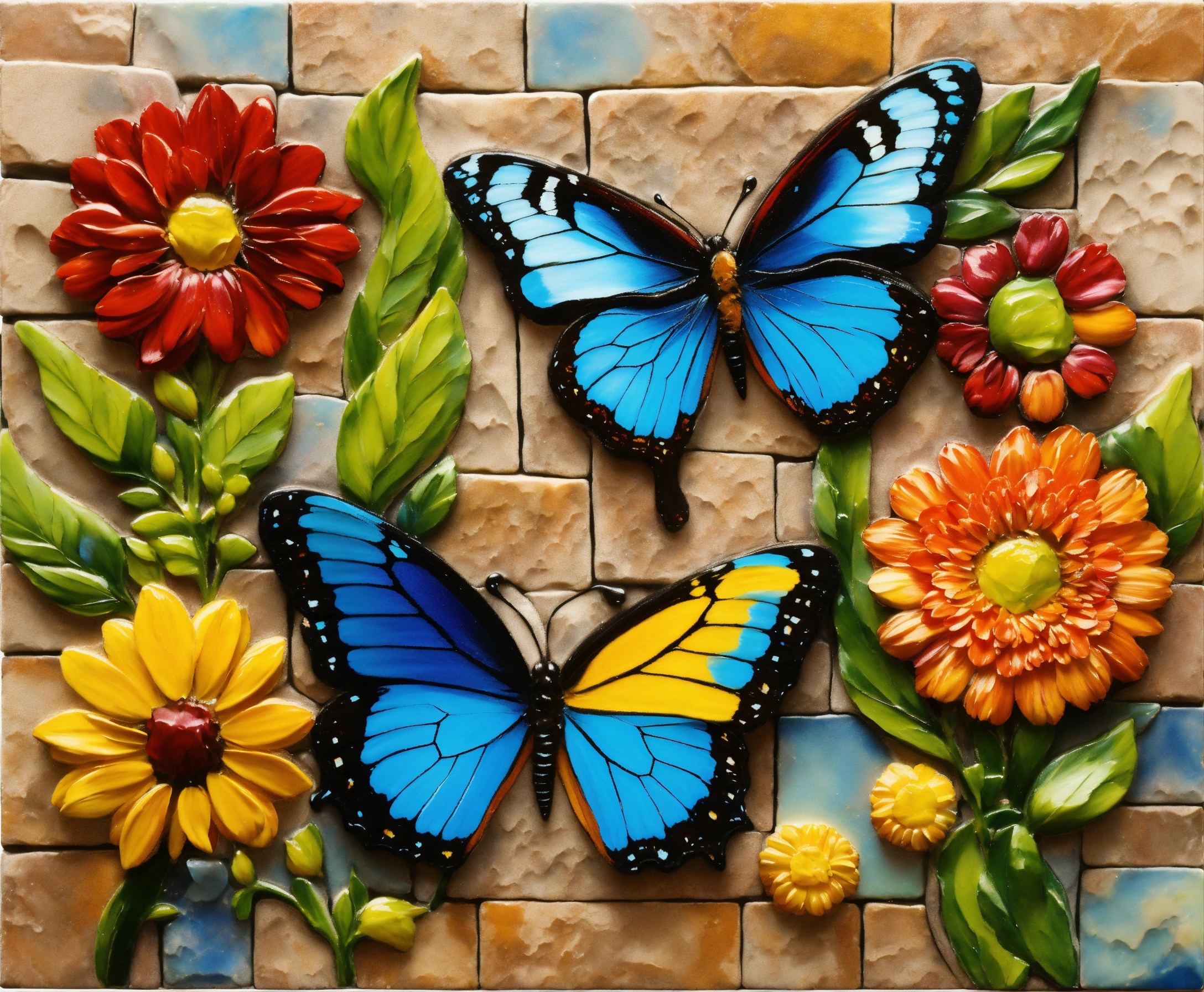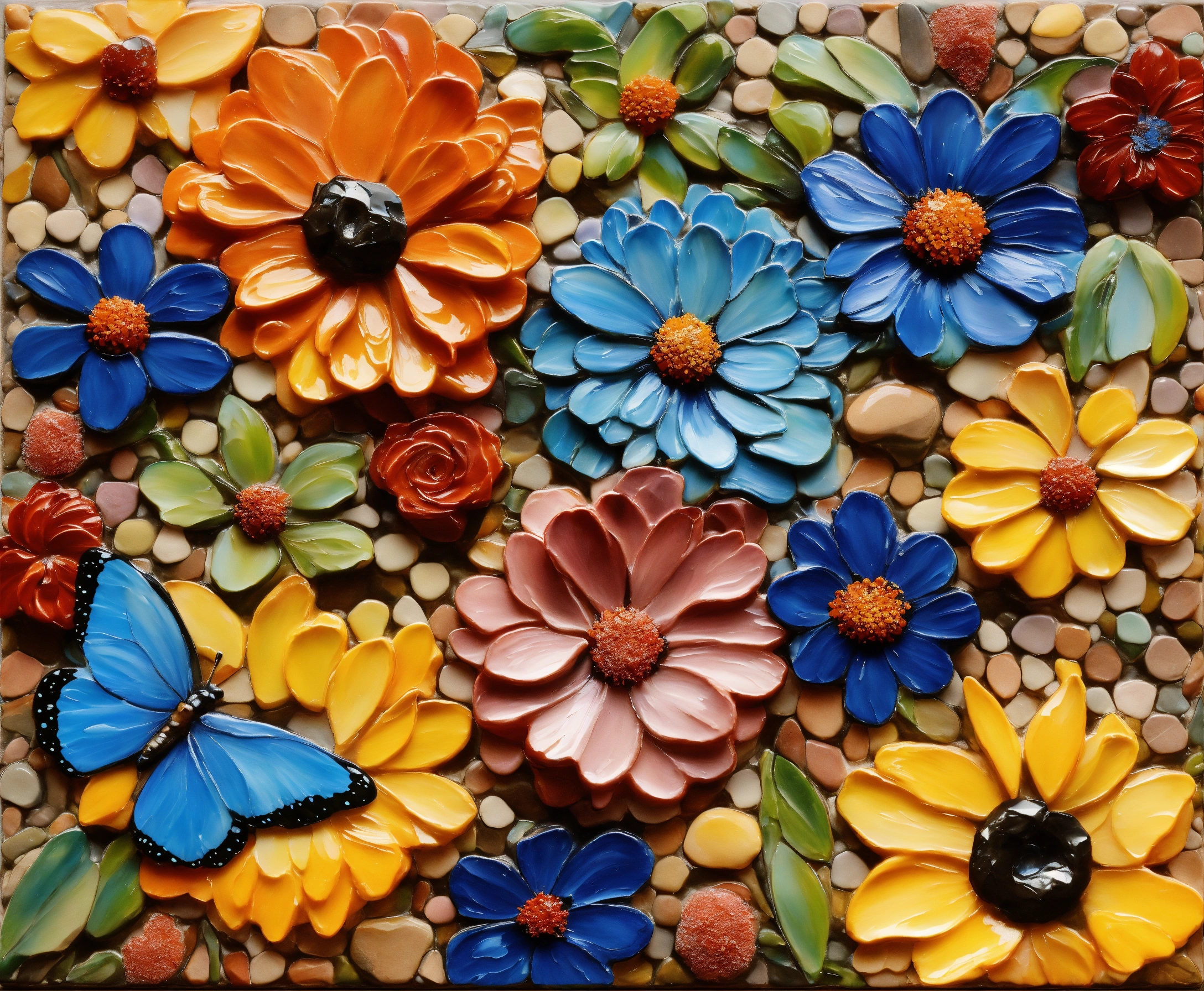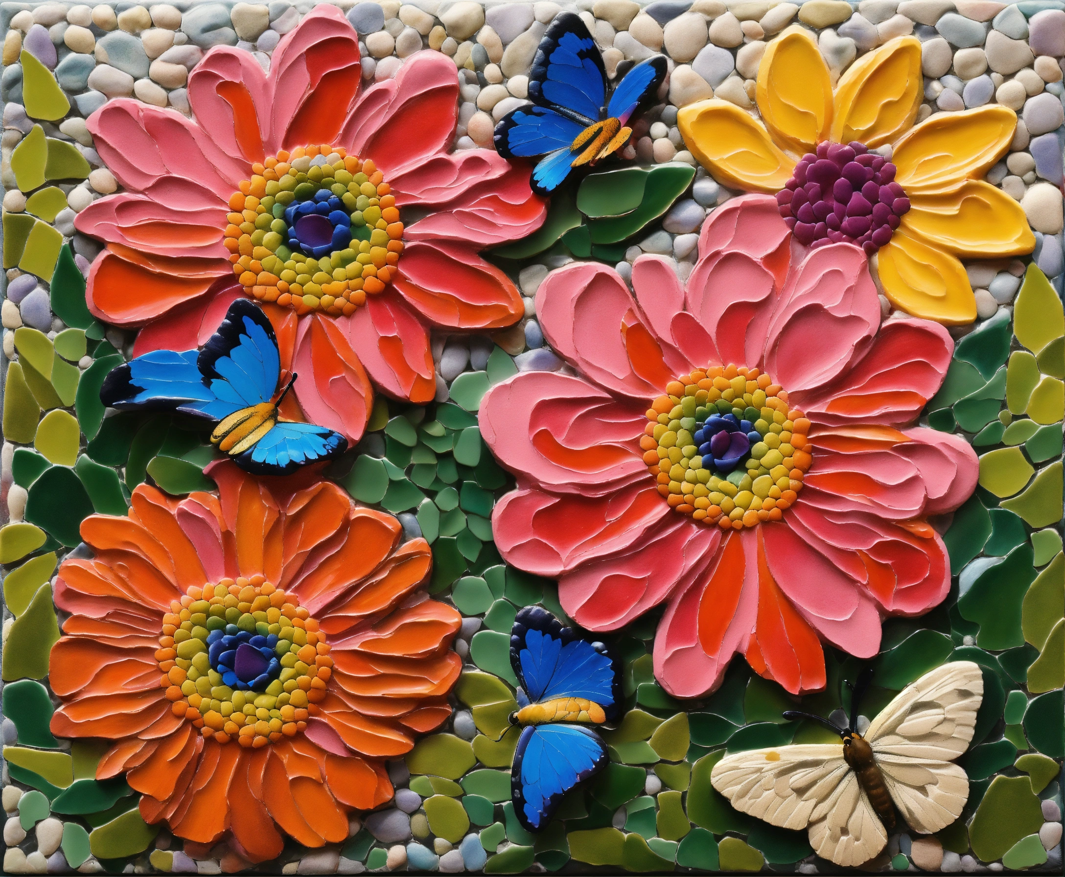 Multi colored flowers butterflies stone sculptures, pointillism paintings, impasto texture --tile --ar 938