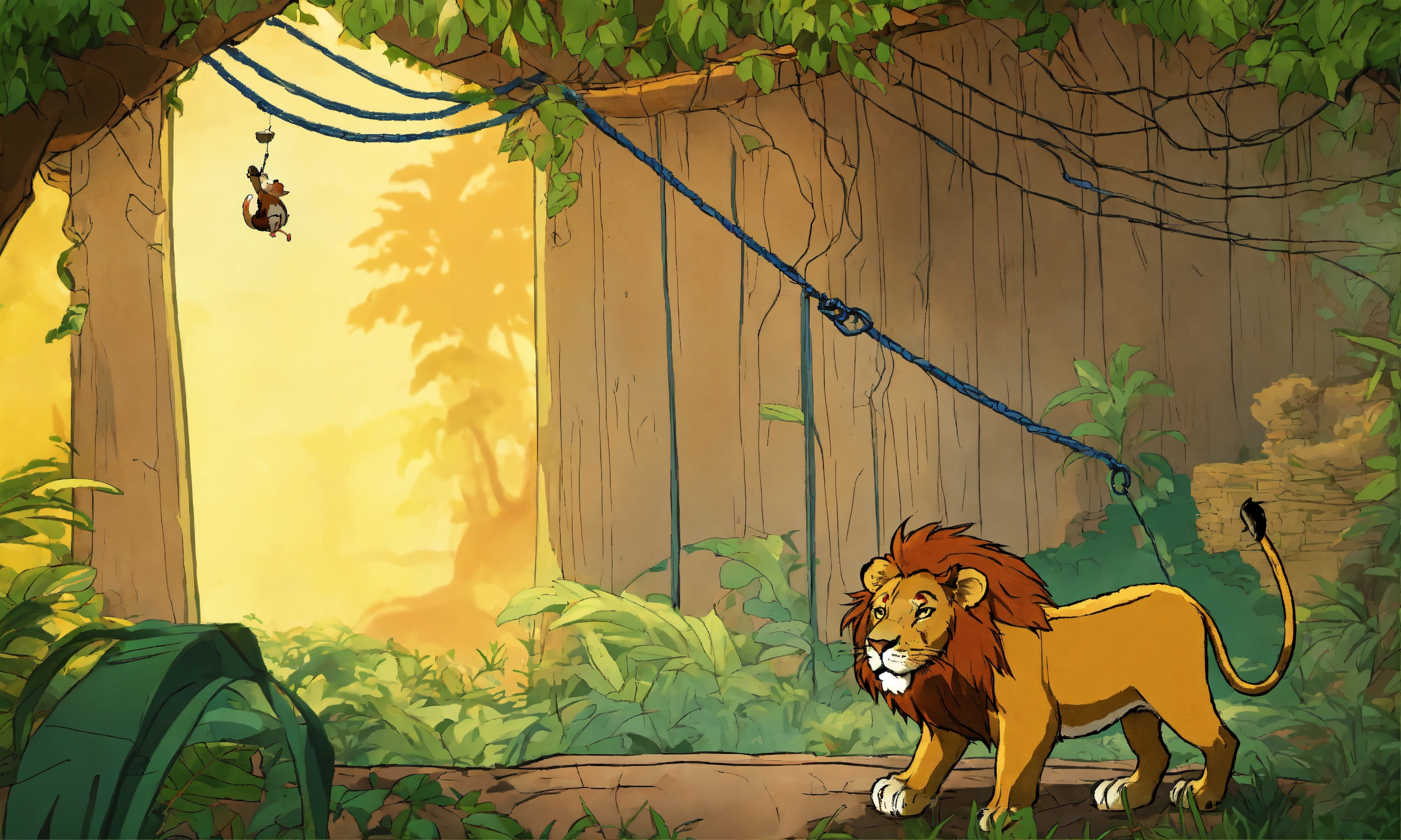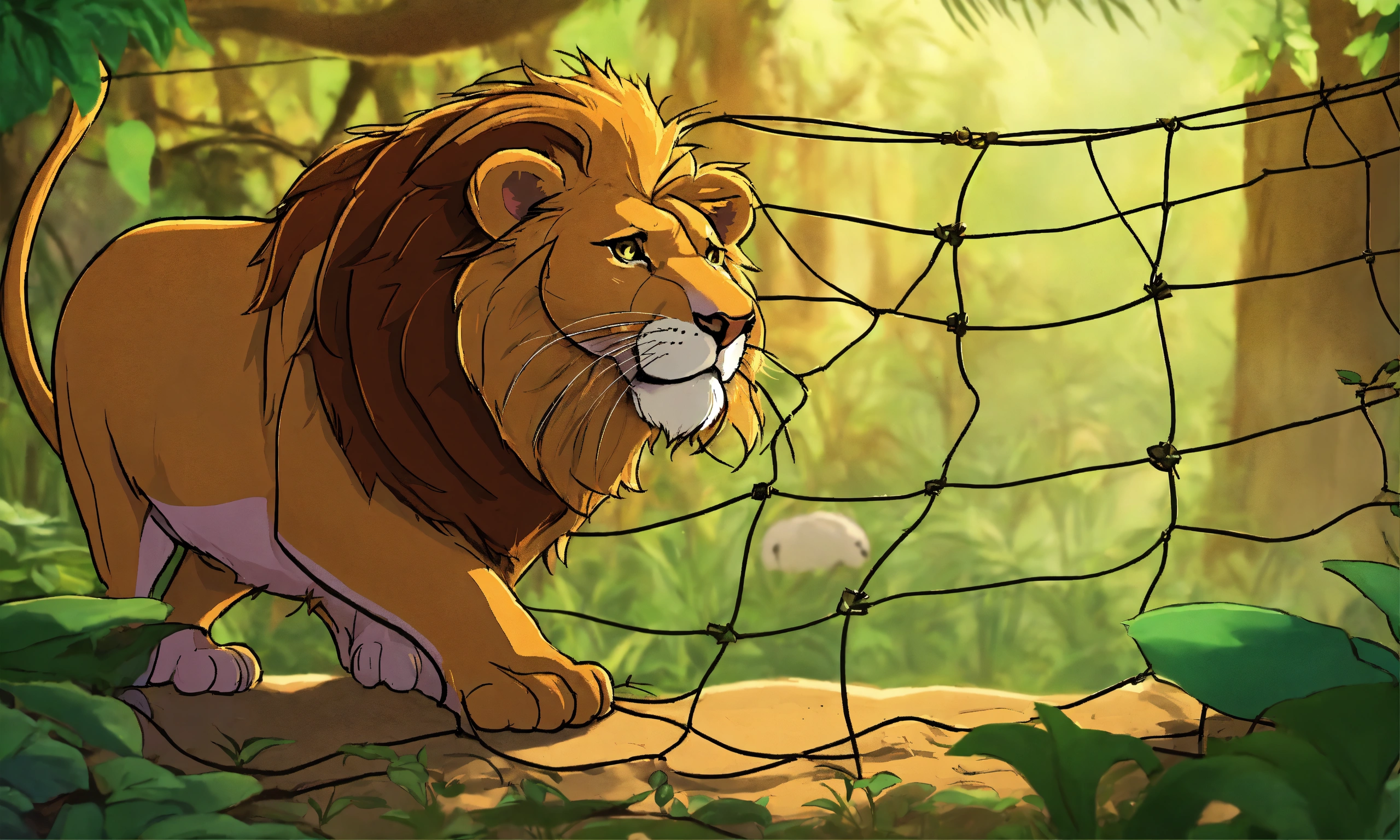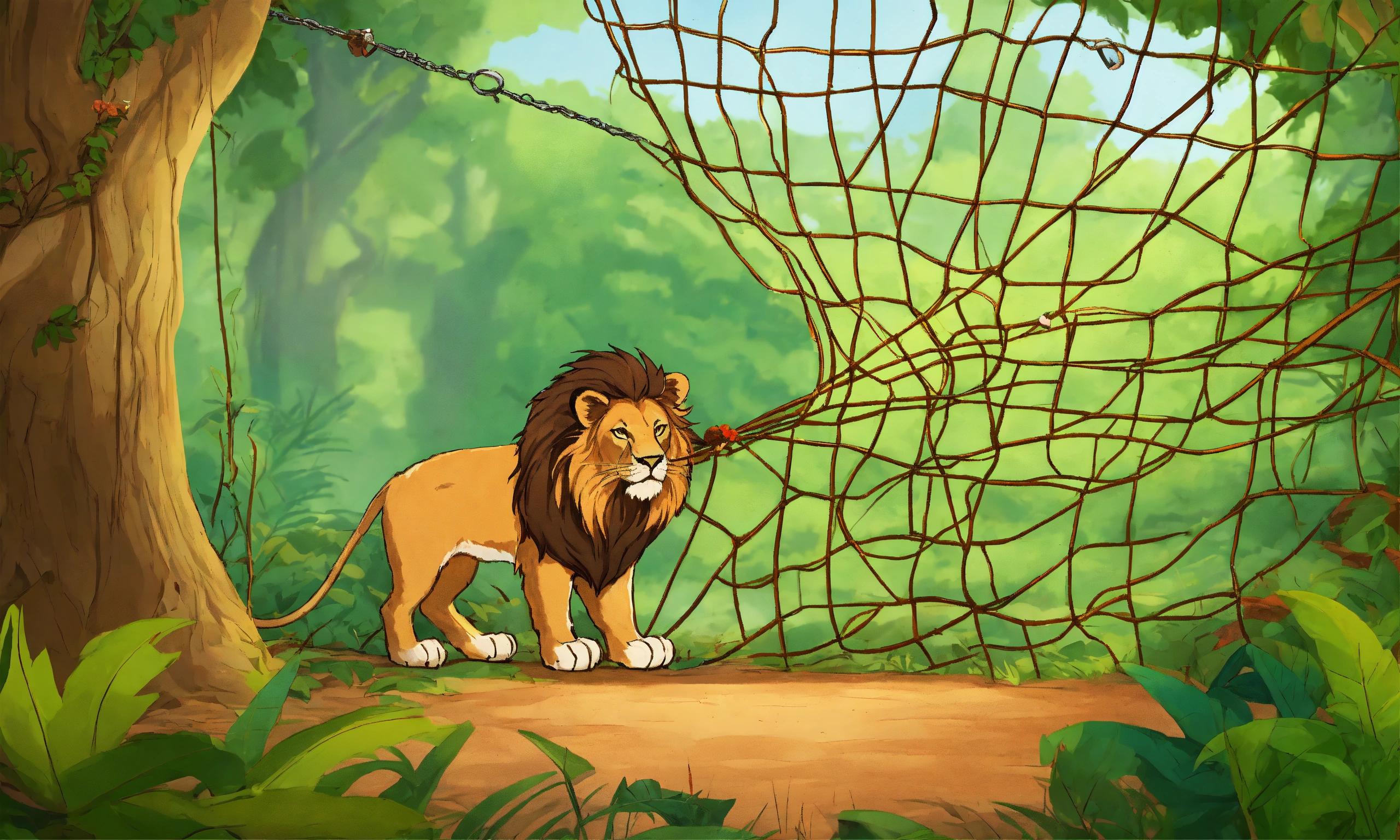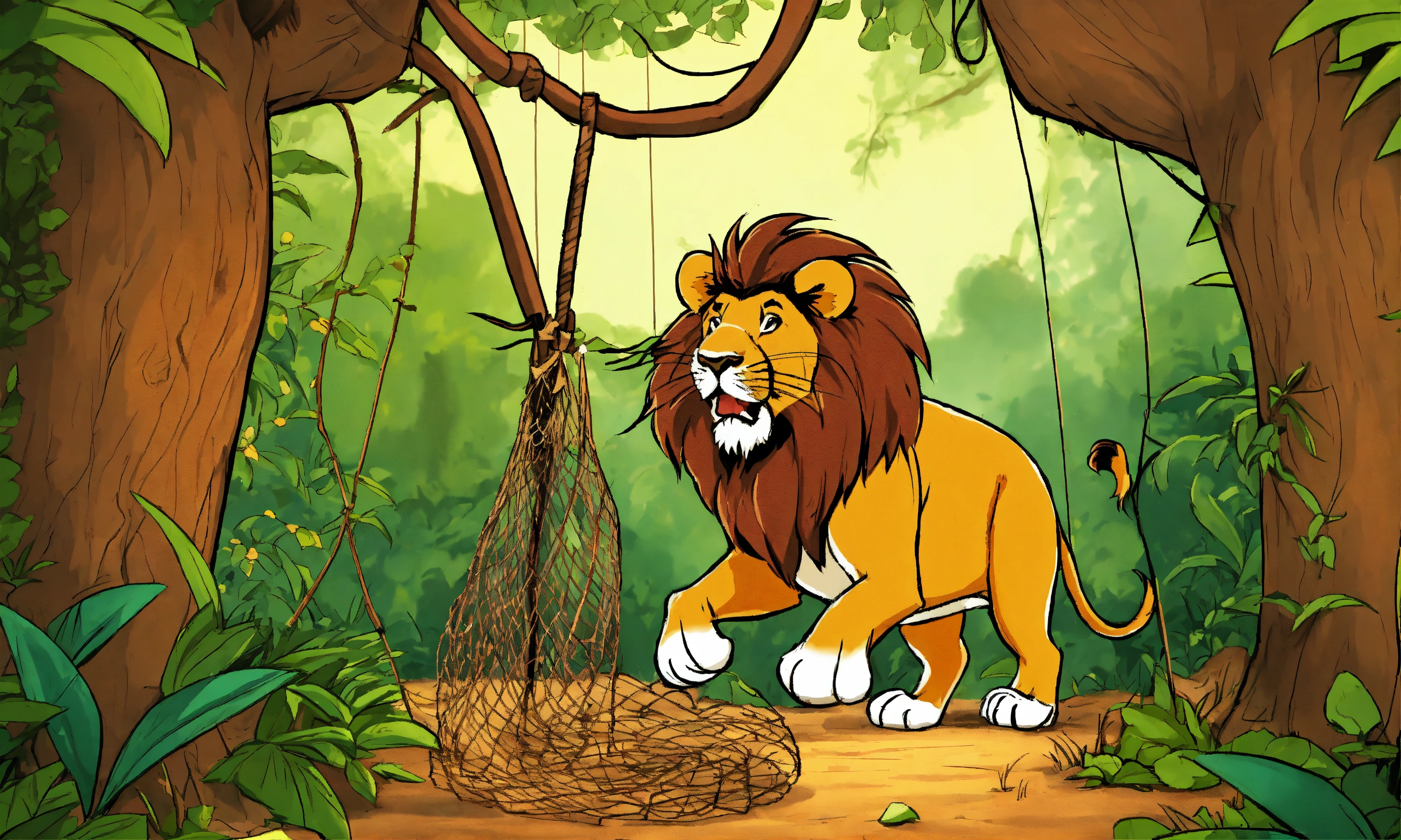 Cartoon in a jungle mouse cut net in which big lion was captured and trapped then hang to the tree