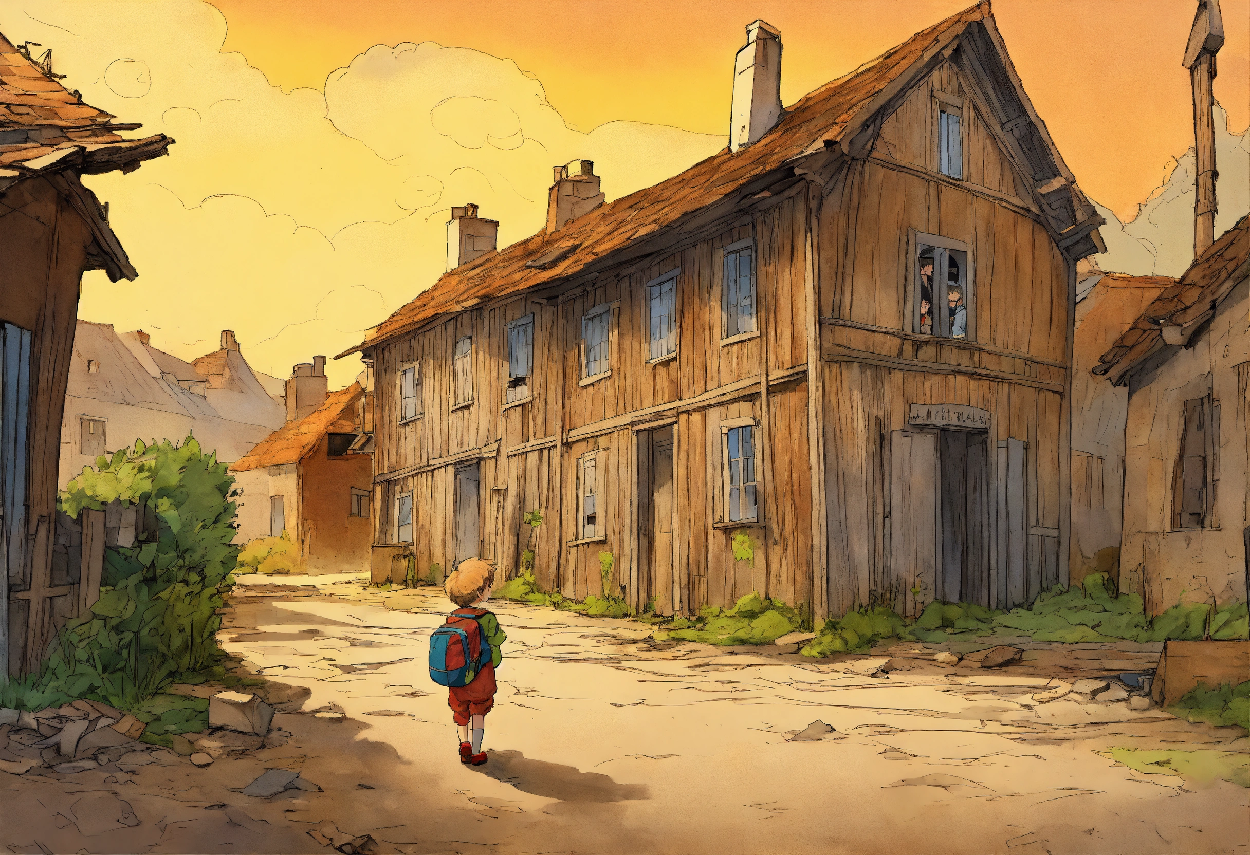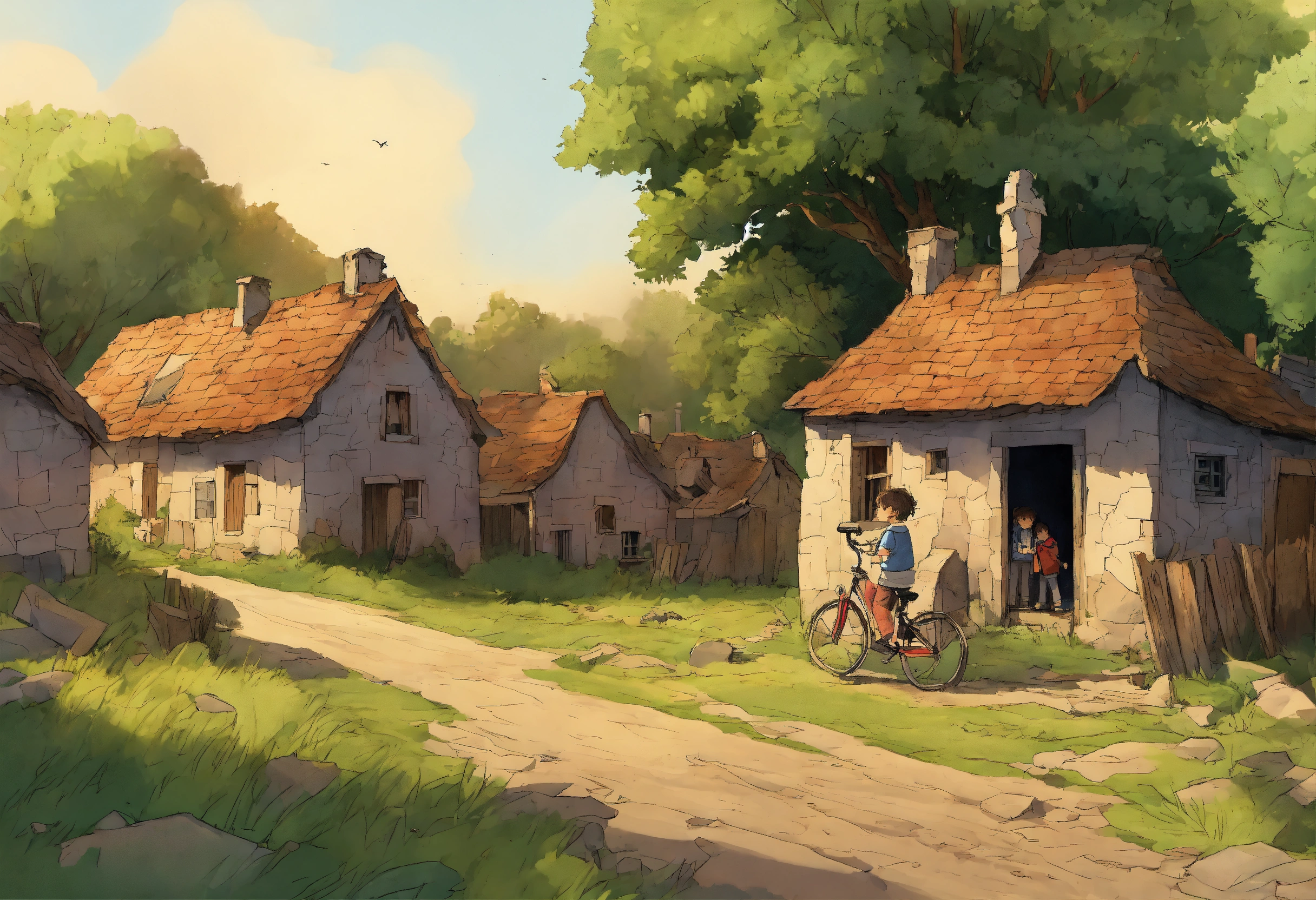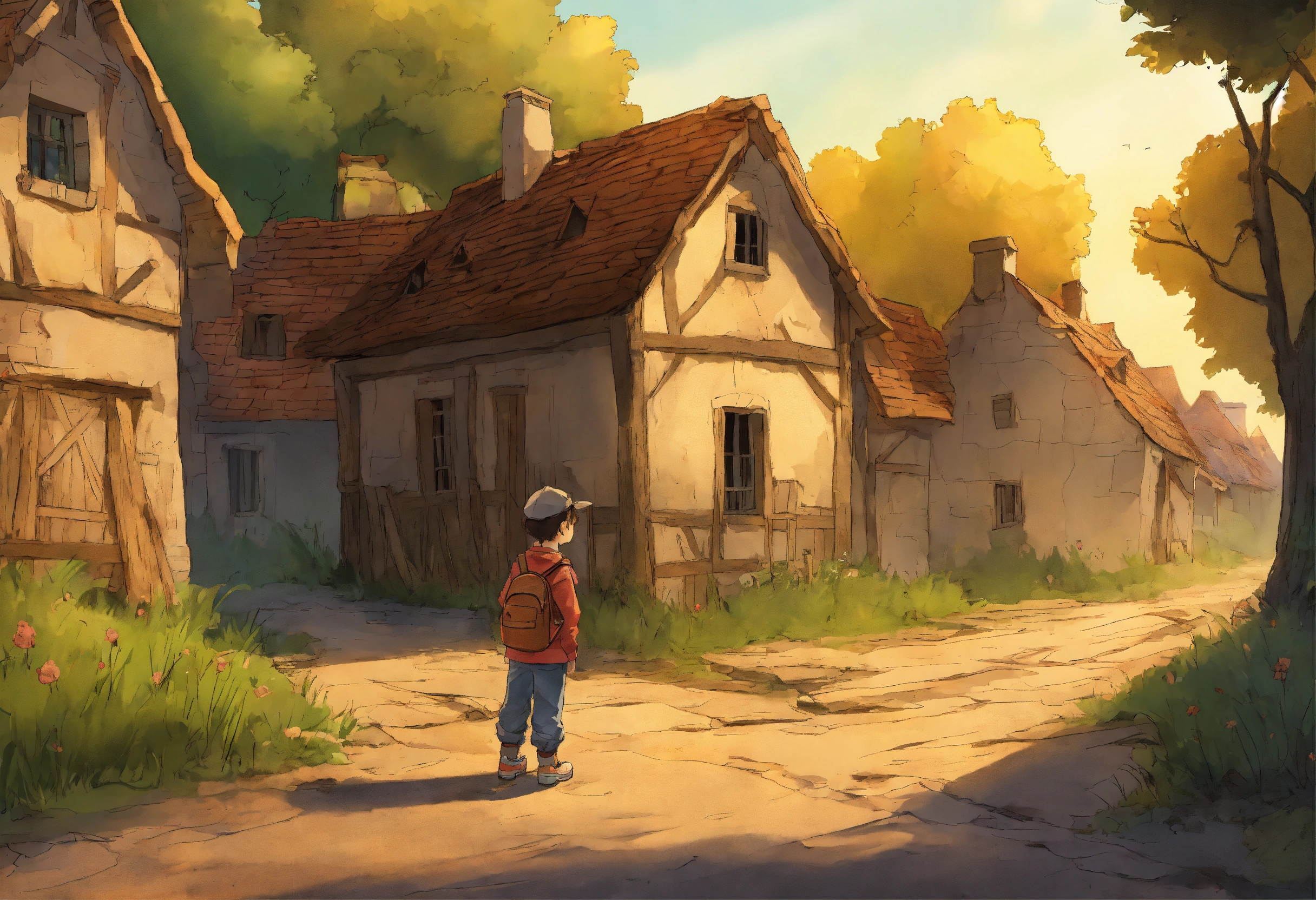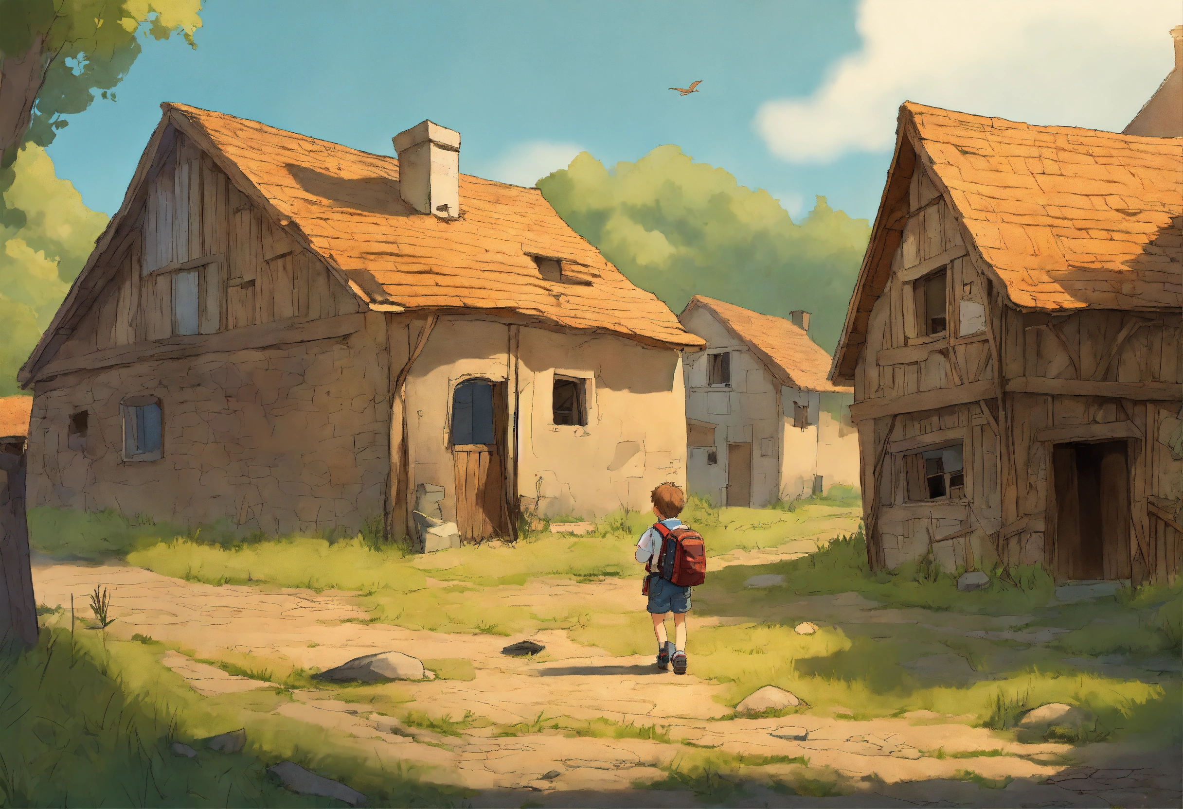 1 enfant est dans un village abandonné, part à rechercher des trésors de l'histoire avec ses 1 ami. cartoon.