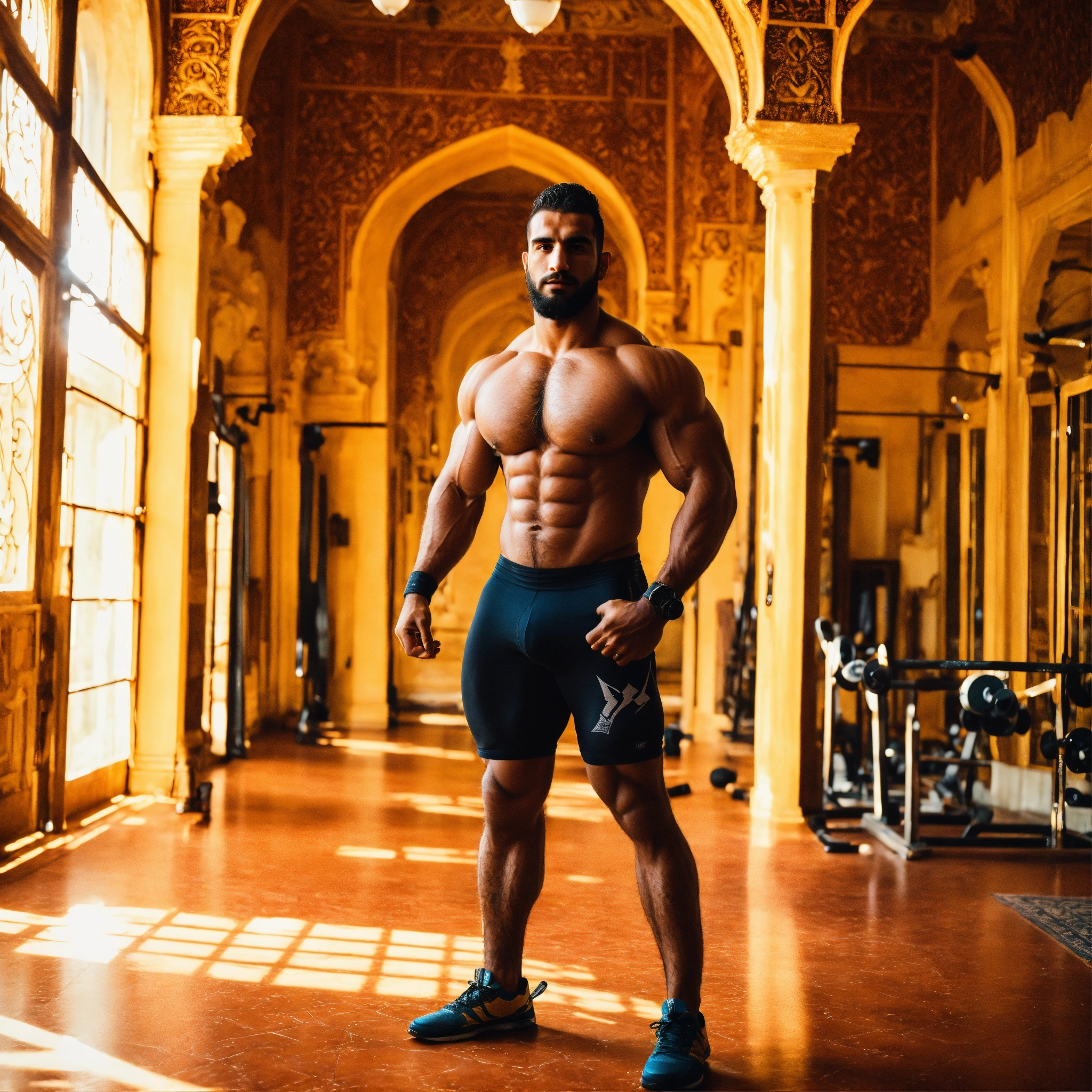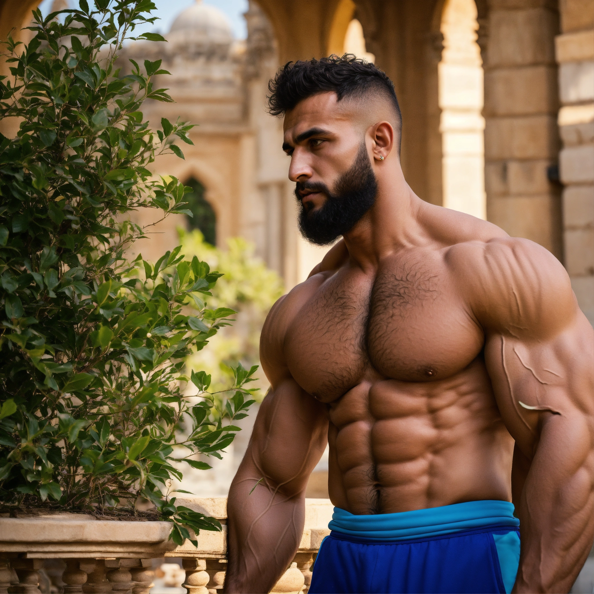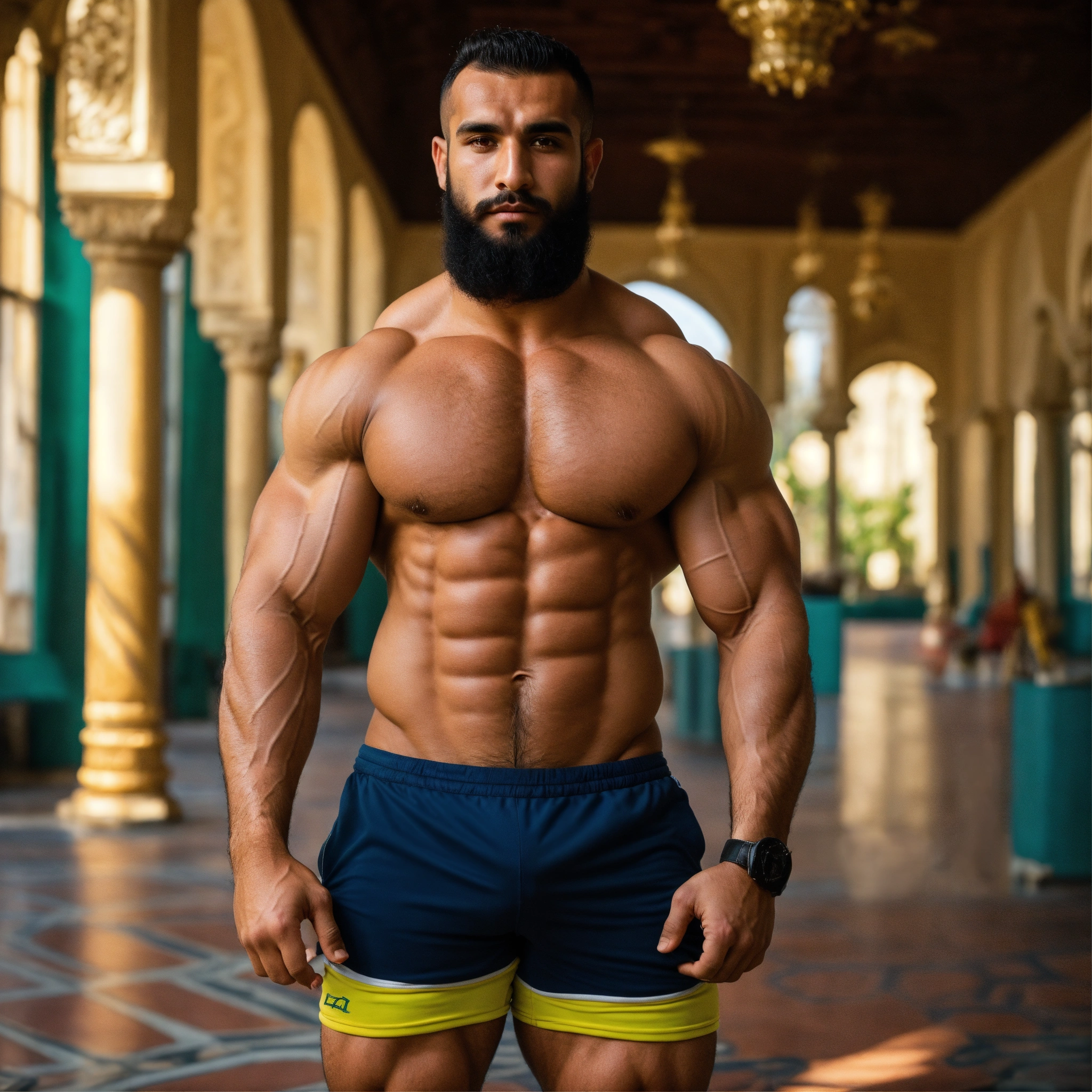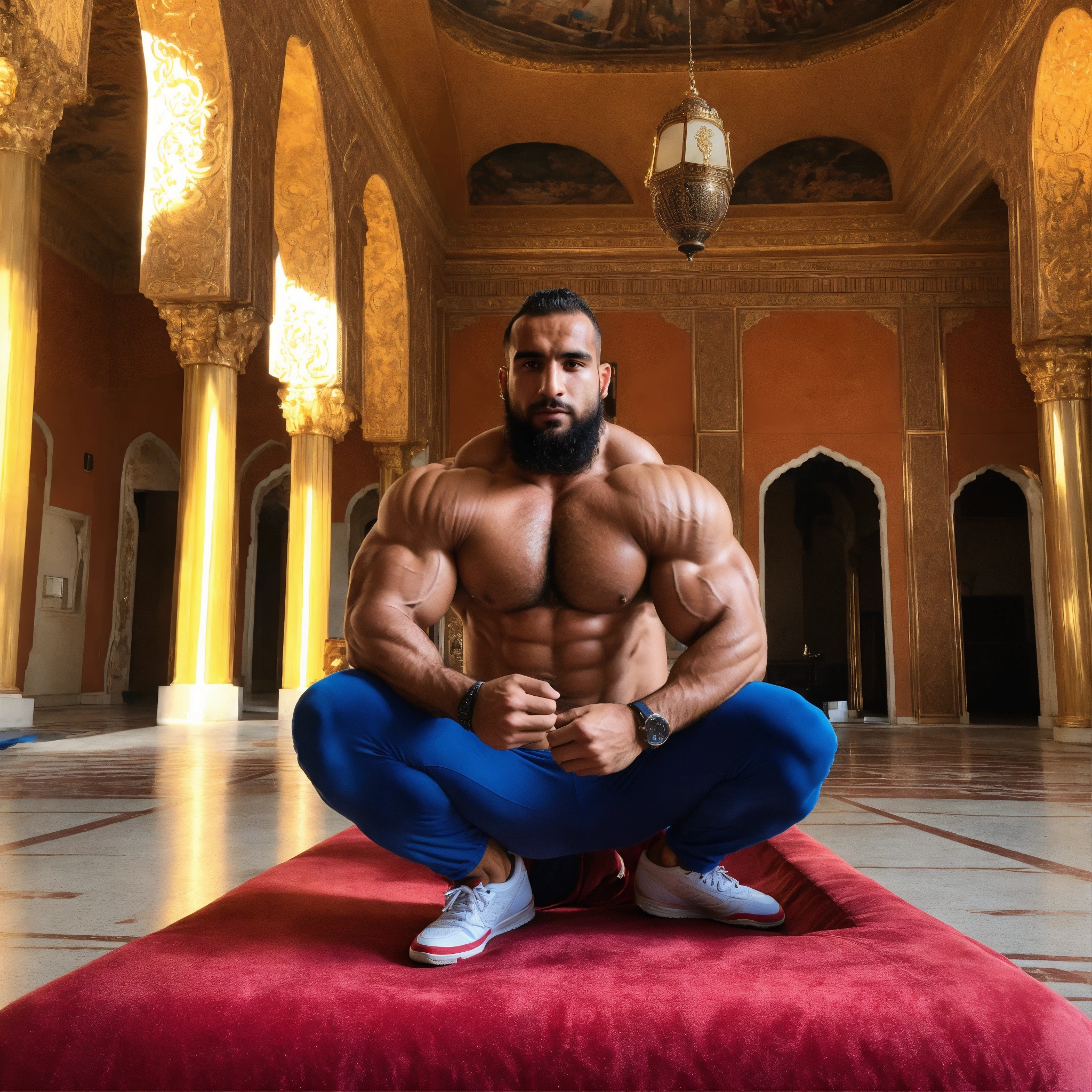 30-year-old hairy algerian man with big muscles, big bodybuilder, body like a wrestler, in a beautiful palace