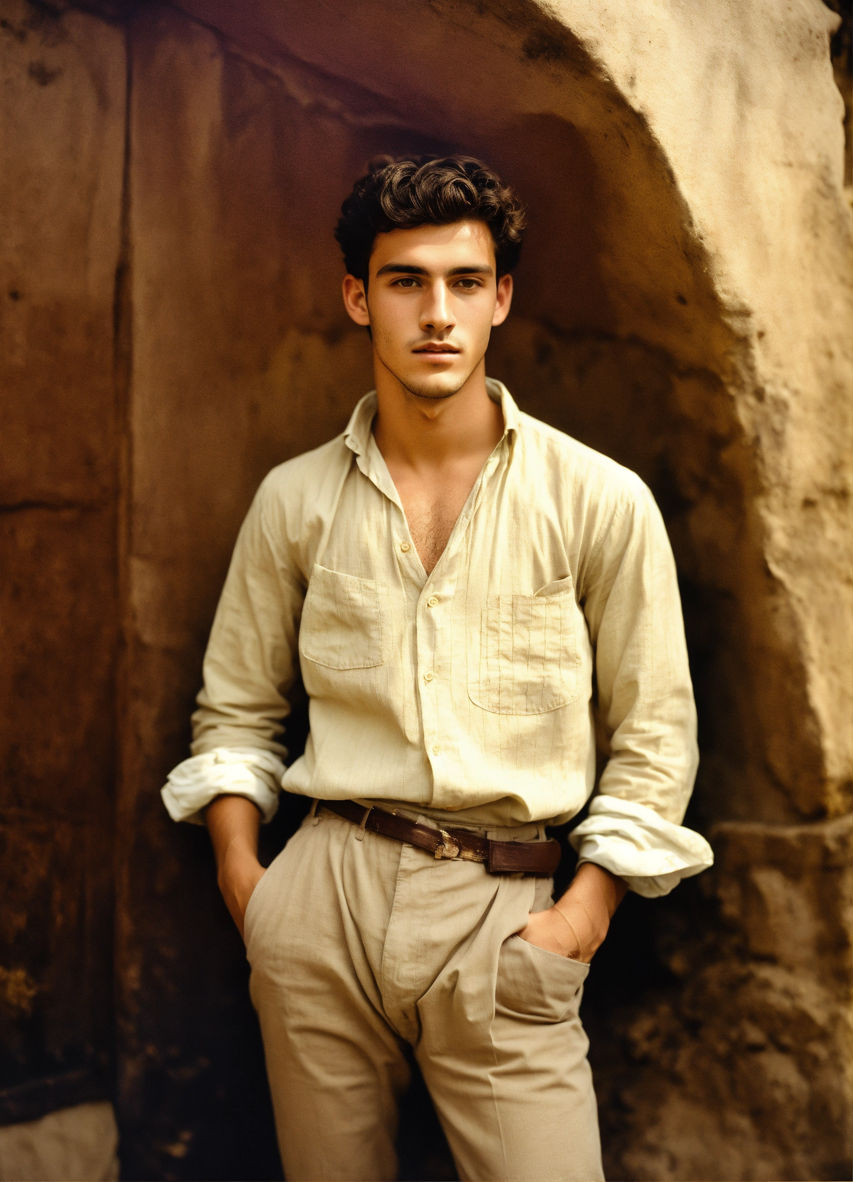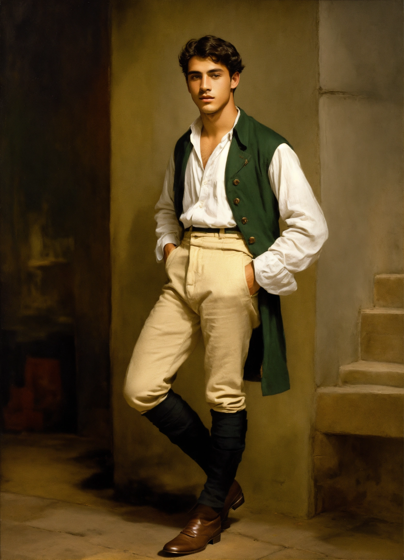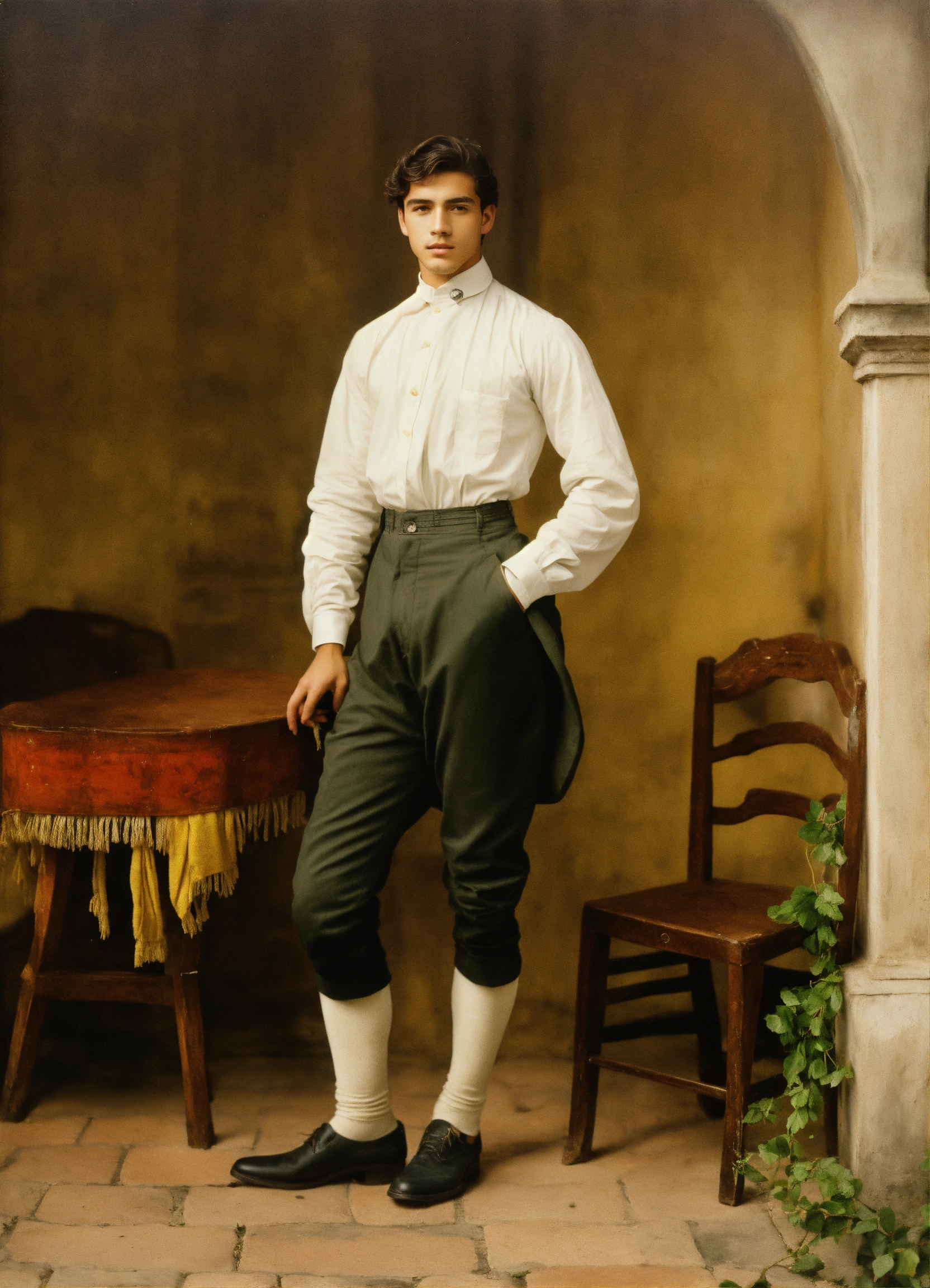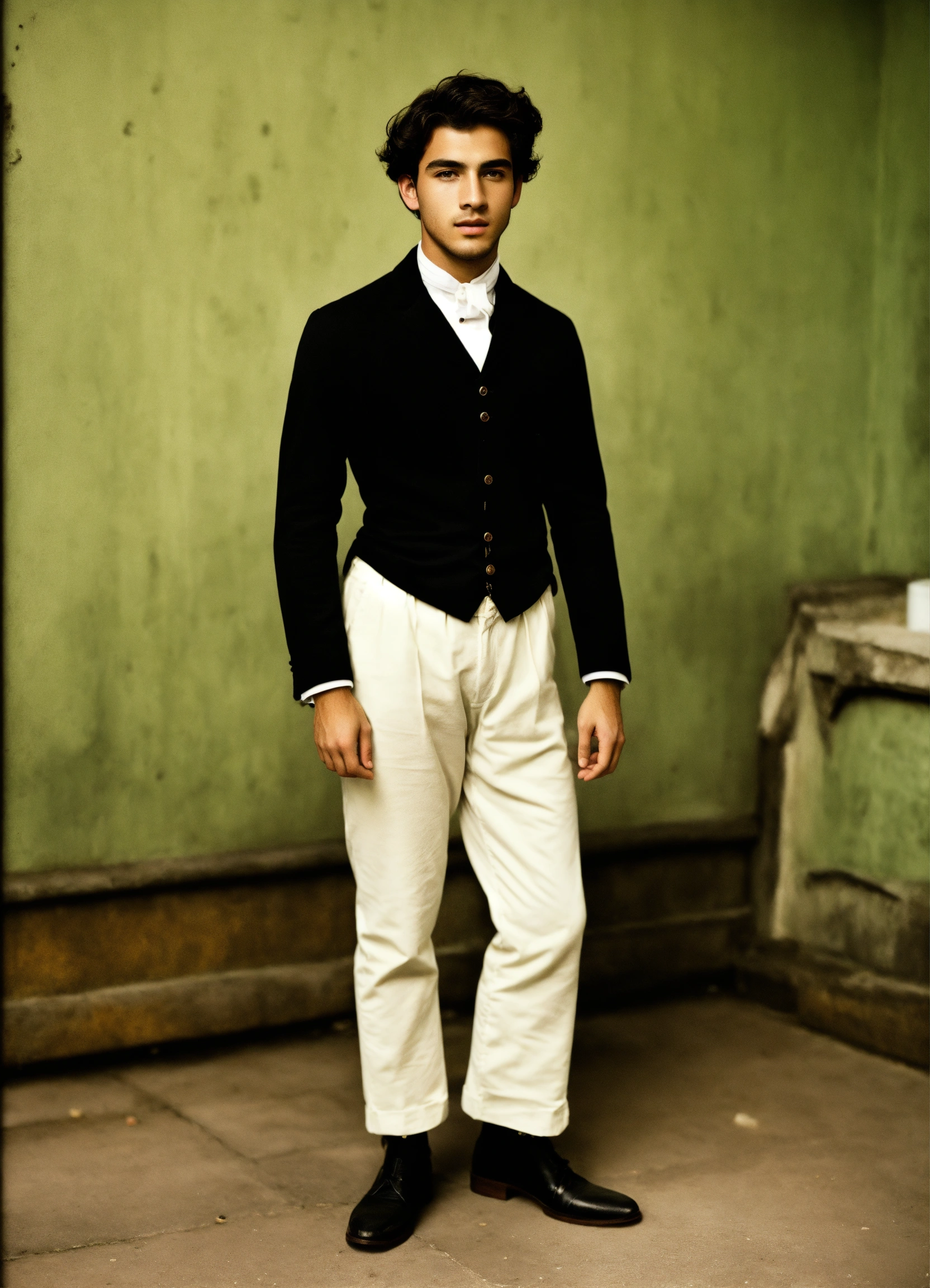 Un joven italiano de 23 años del siglo xix, flaco, con camisa blanca sucia y pantalón marrón, la ropa un poco rota, con la cara sucia también y pálida. pelo color negro. alpargatas. con una mandolina.