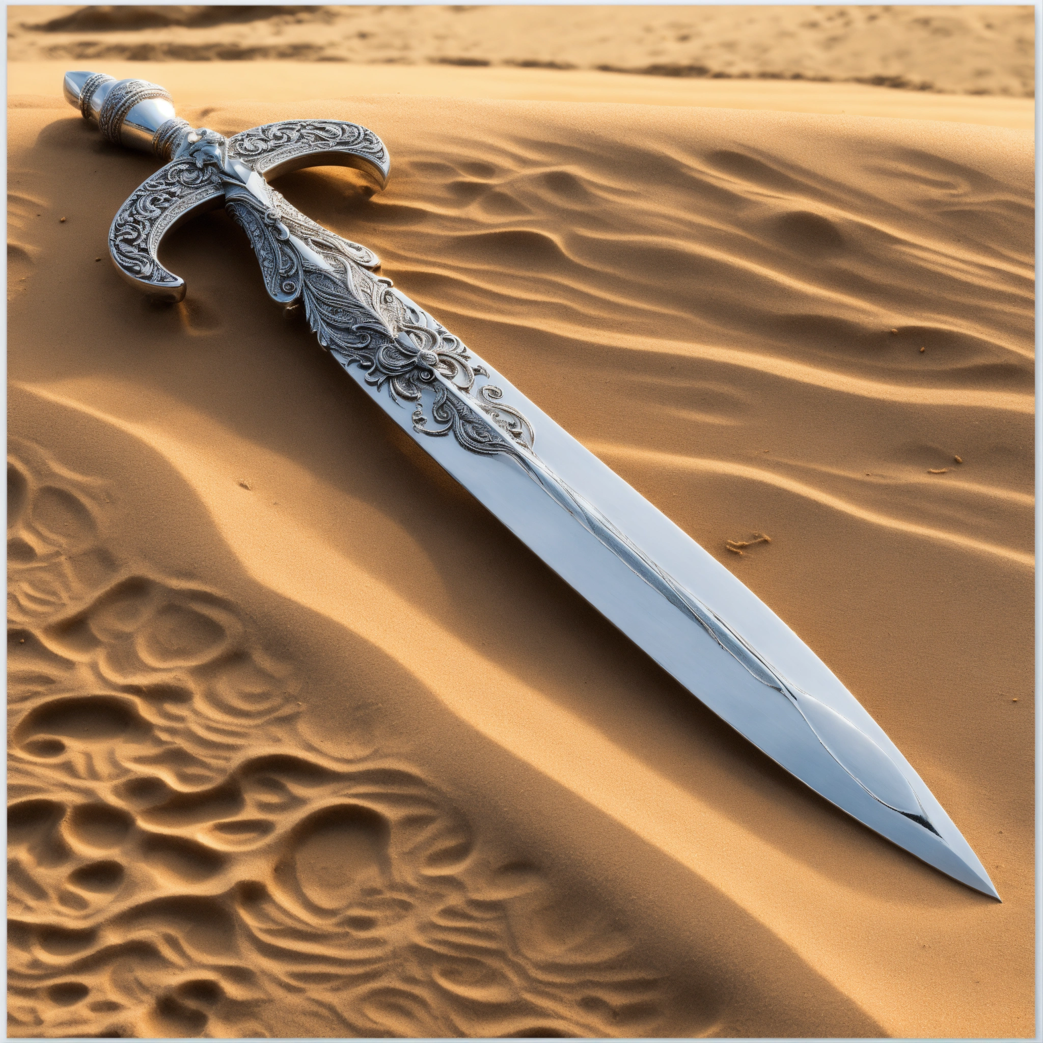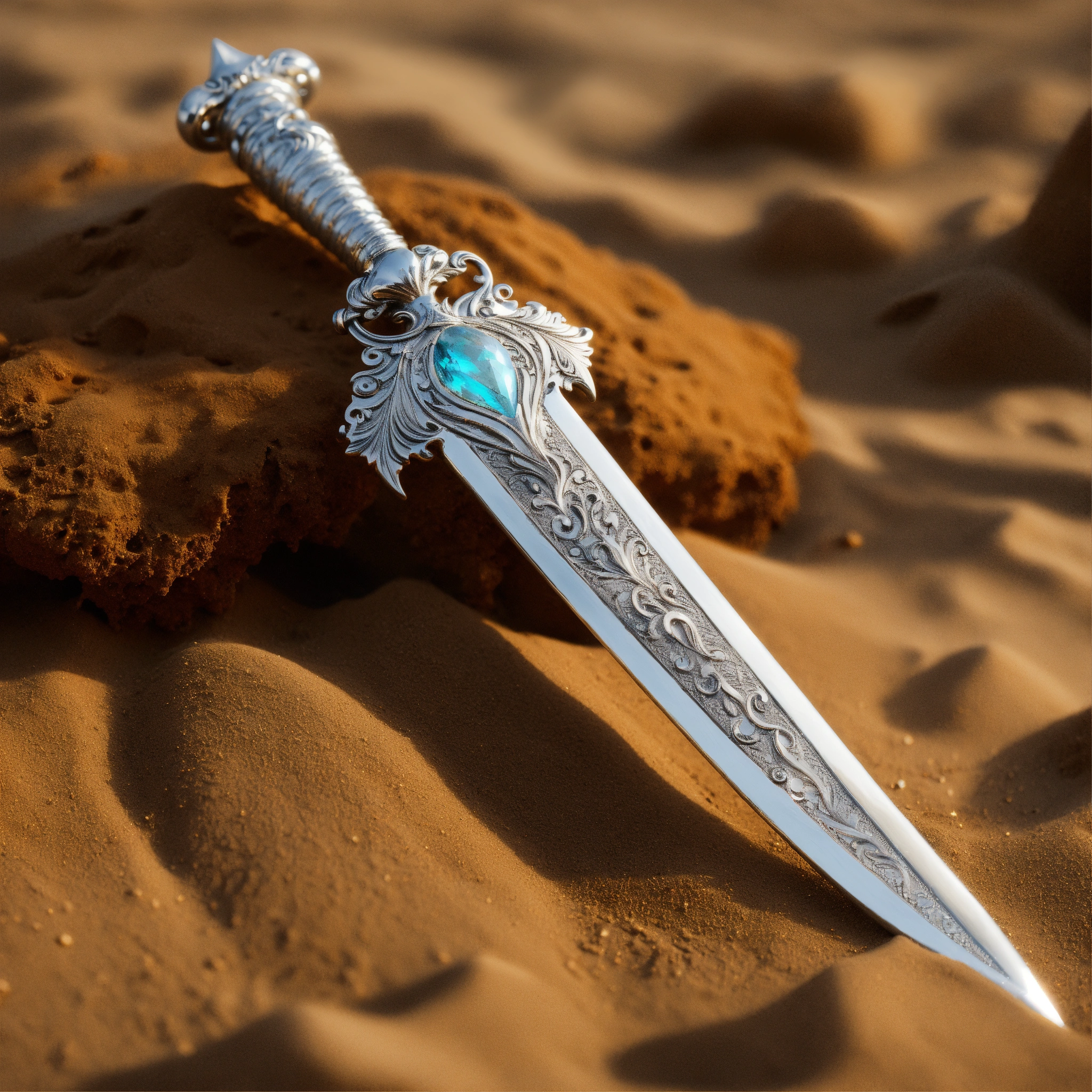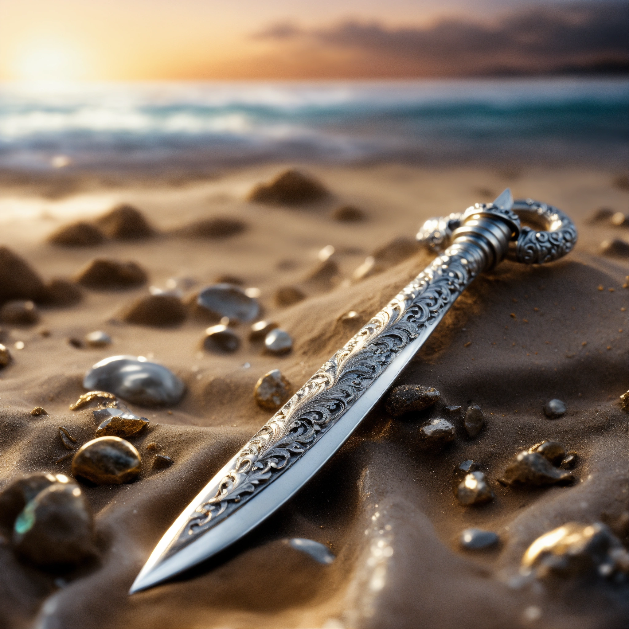 8k, picture of a narrow and delicate wavy dagger made of lunar-silver, highly ornamented, handle is wrapped with silver wire, very detailed, ultra realistic, lays on the beach in the sand, fantasy