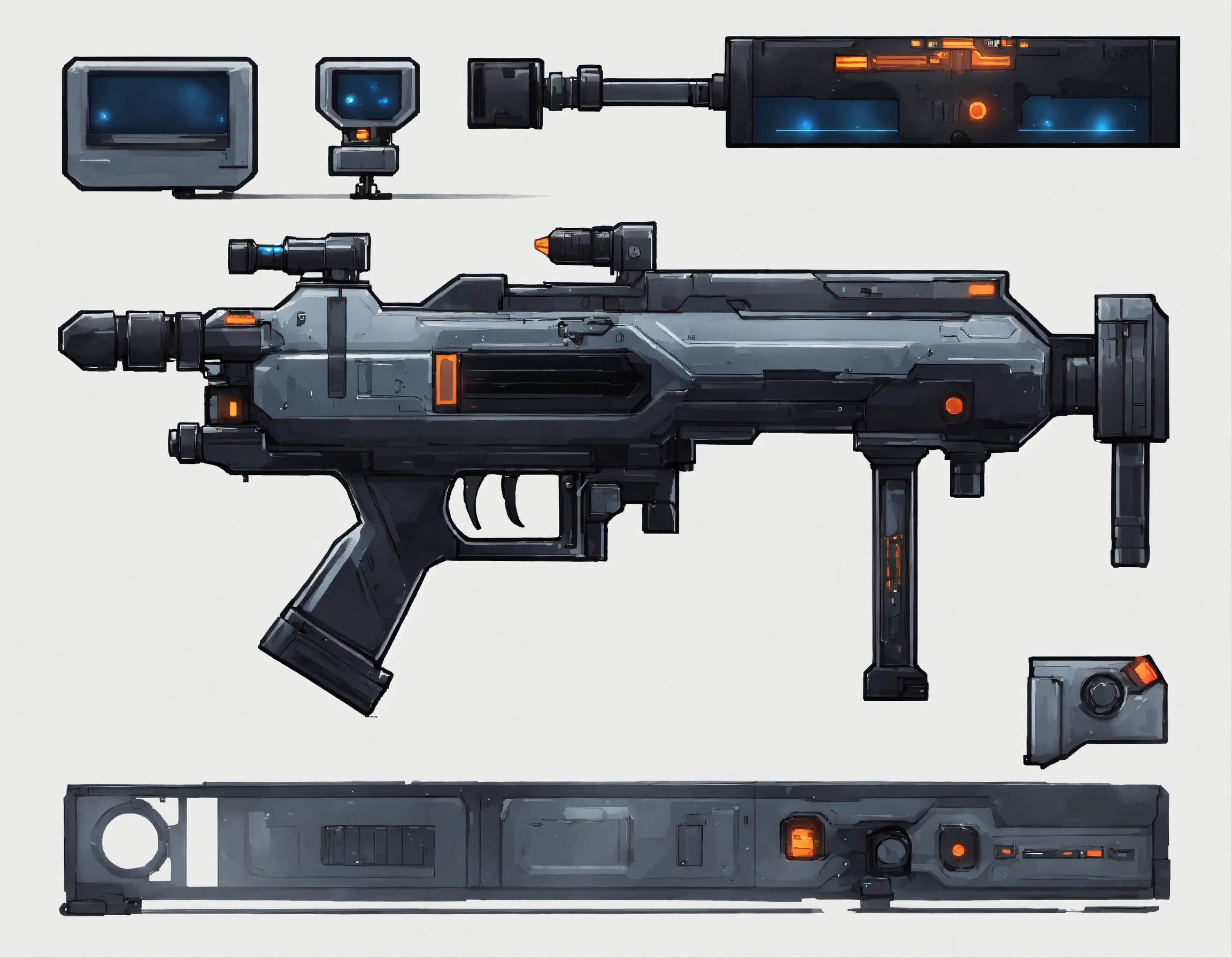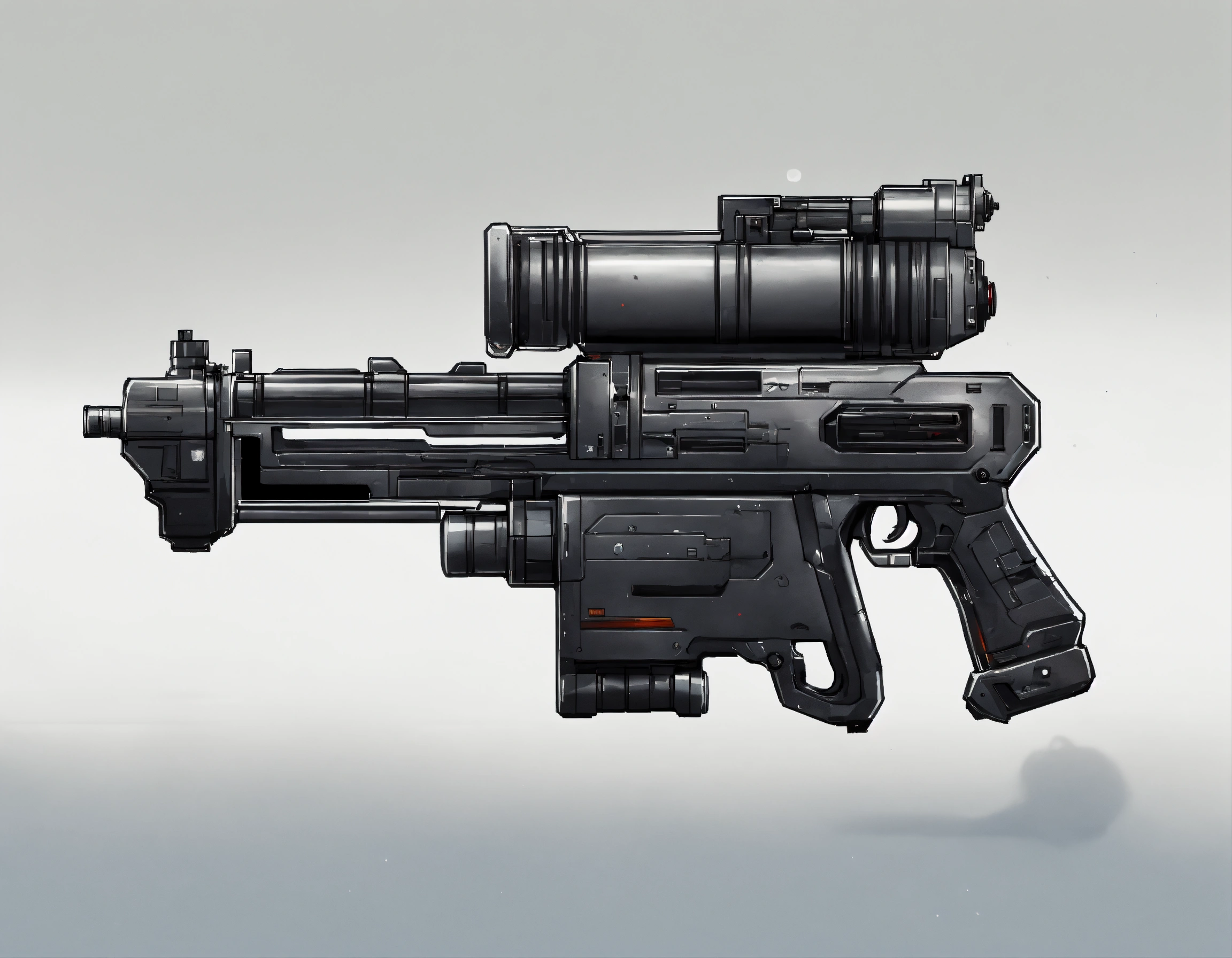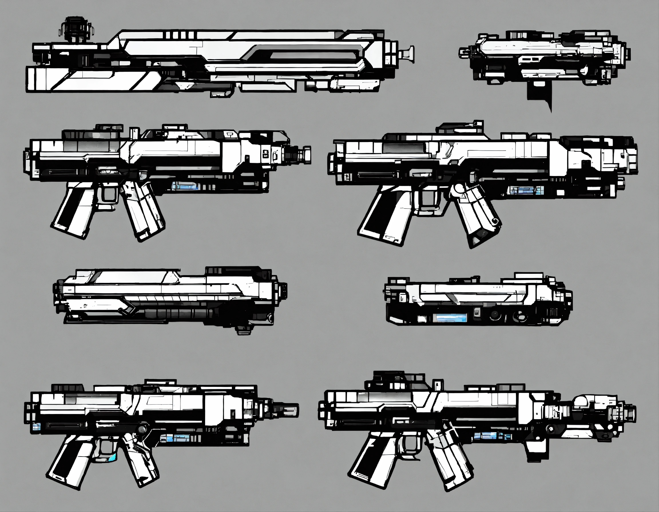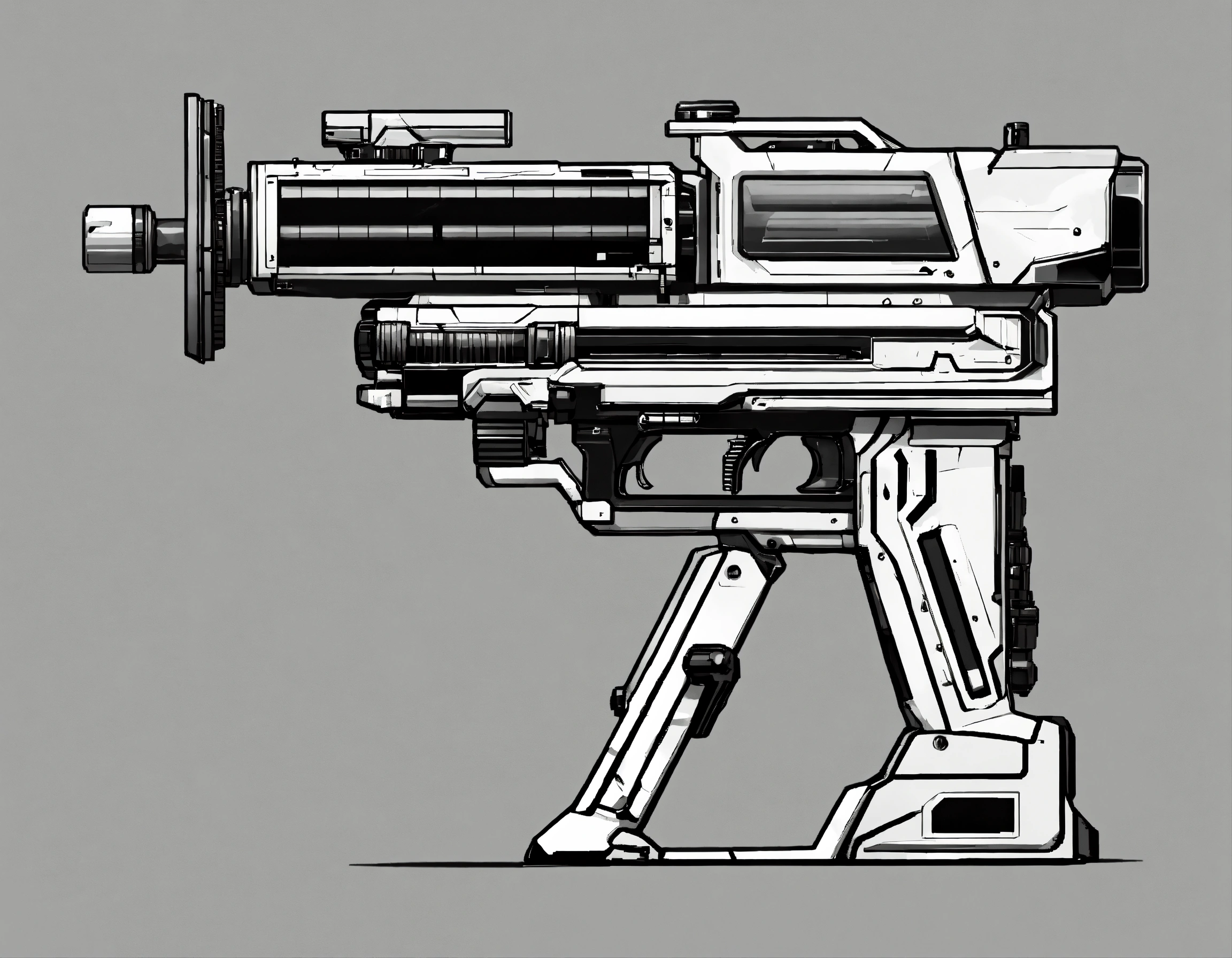 A 2d blaster gun for a sci-fi platformer game, black and white, transparent background, stickman theme. right side view