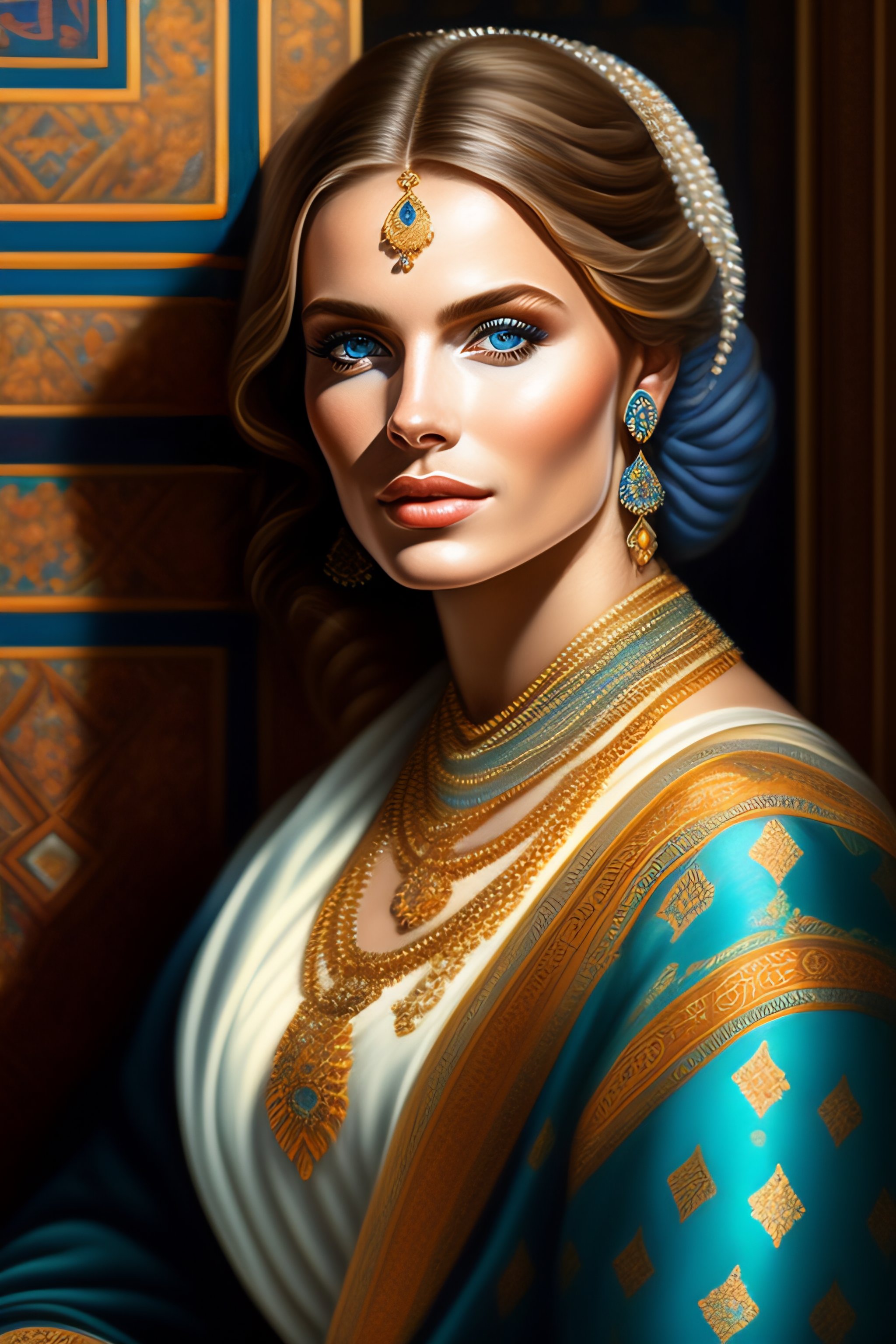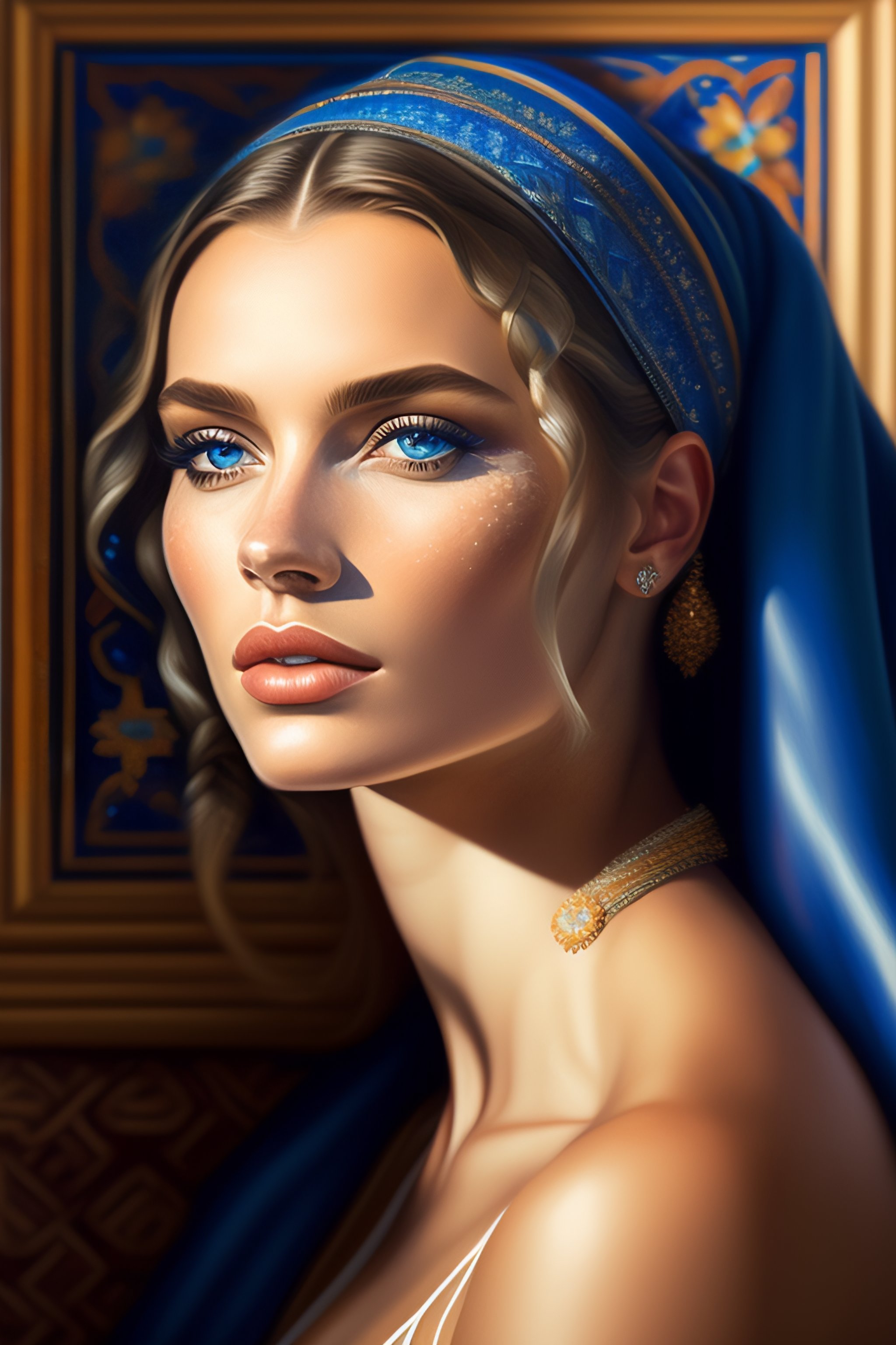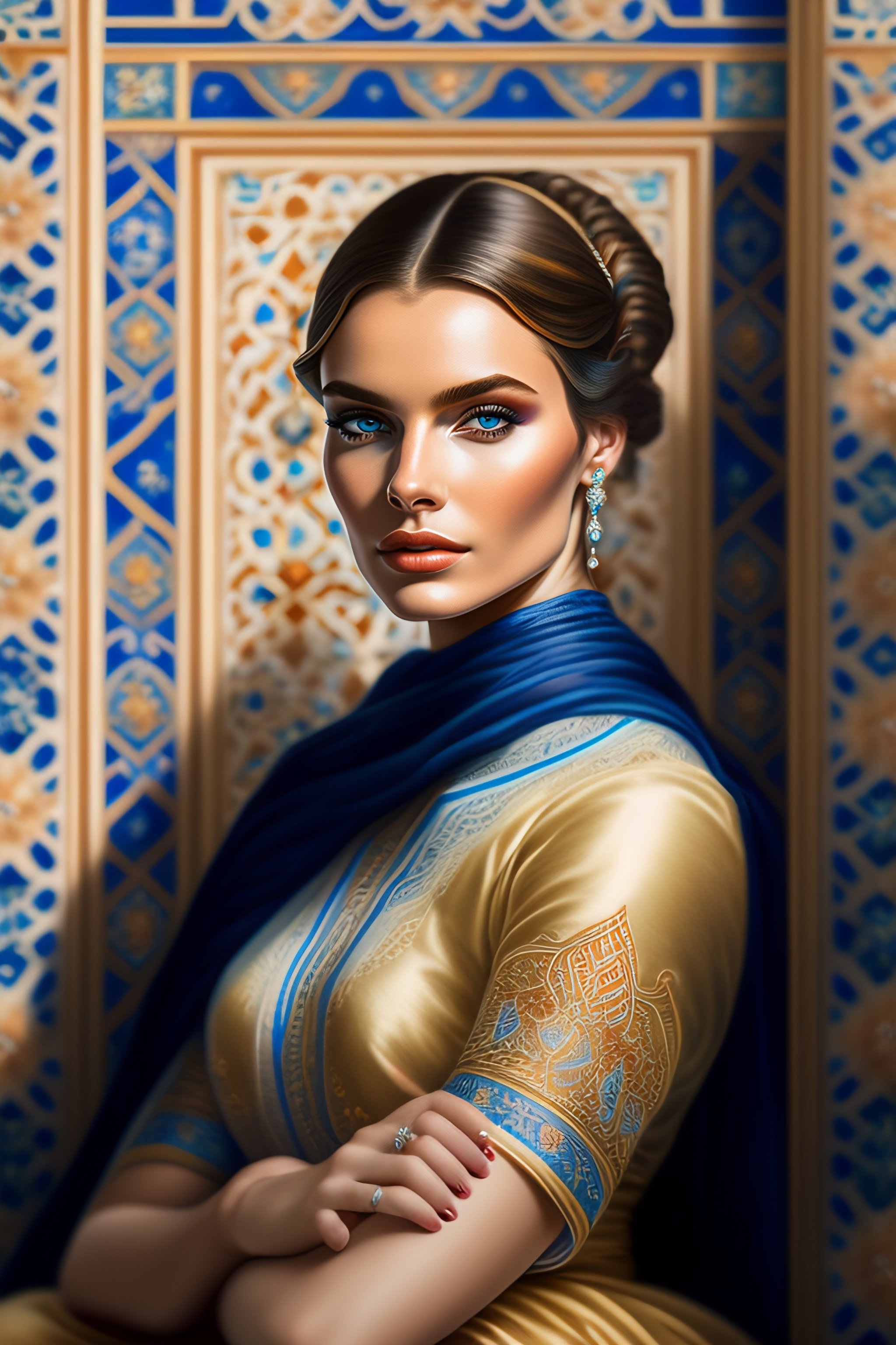 A ultradetailed beautiful panting of a stylish woman sitting on the floor in a tiled room, highly detailed face, arabic braid hairstyle, blue eyes, oil painting, by ilya kushinov