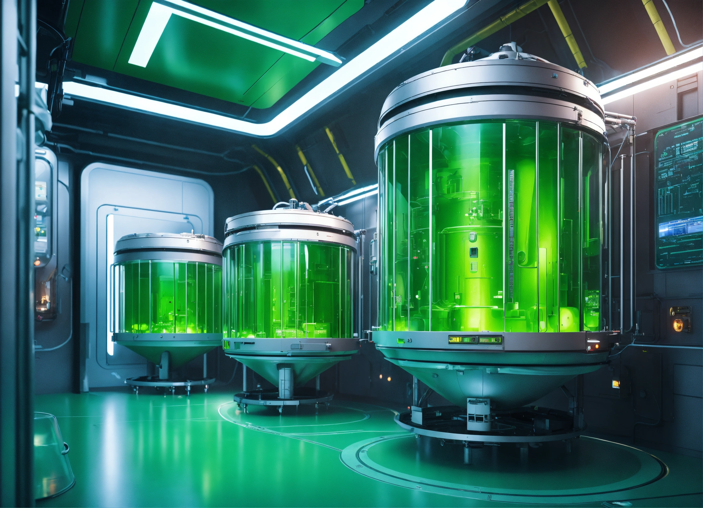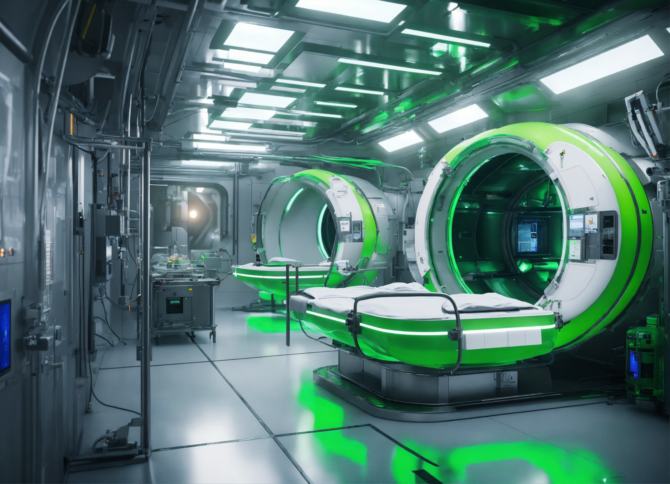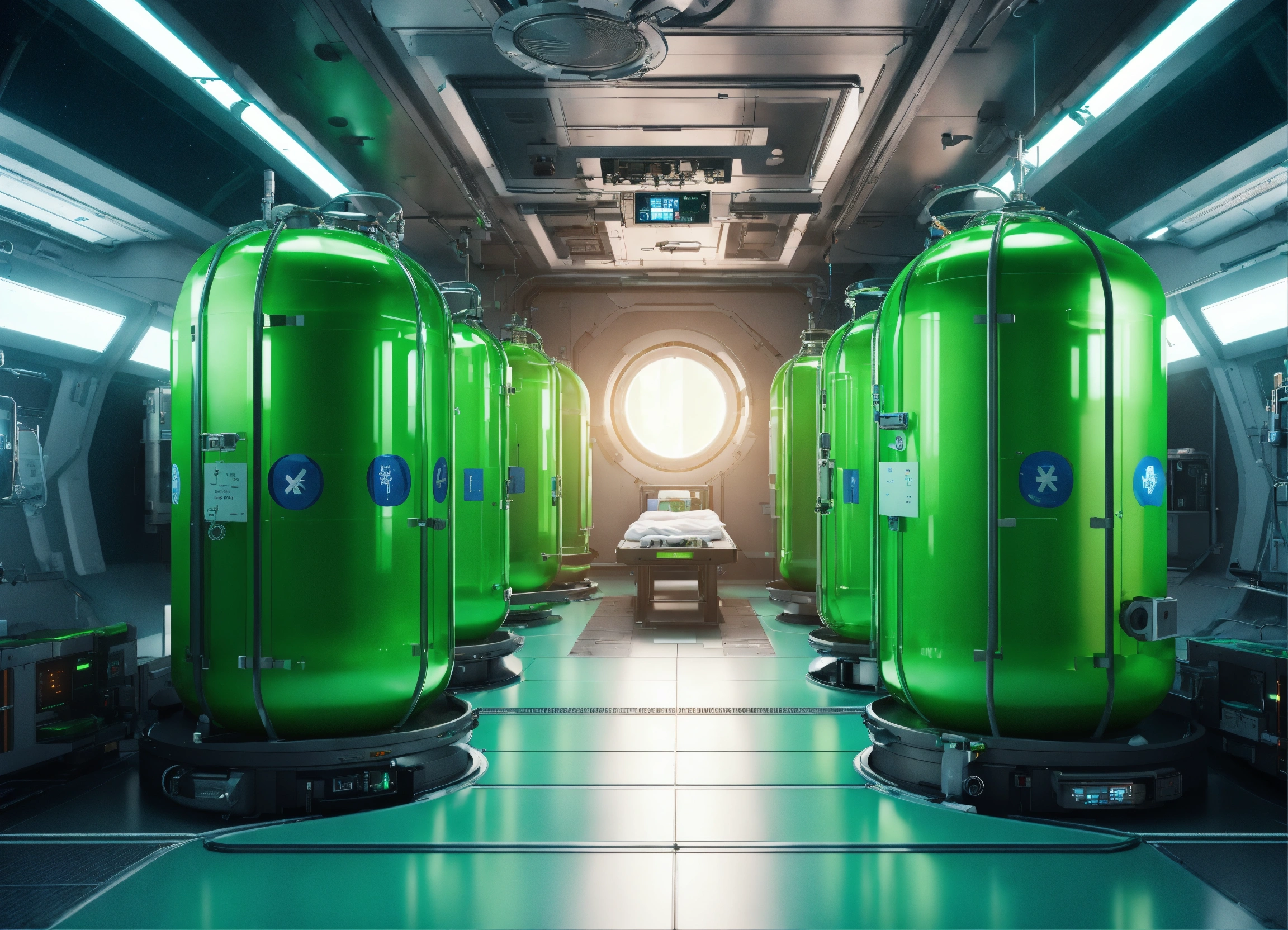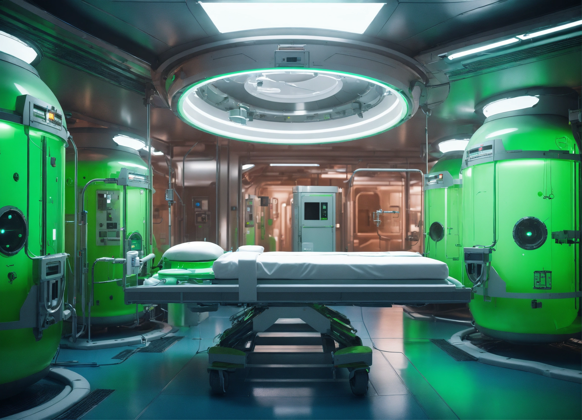 A realistic photo of an advanced medical facility, with stretchers on the sides, with large cylindrical tanks filled with a green liquid, sci-fi, in the interior of space station, hyperdetailed, hyperrealistic, 8k