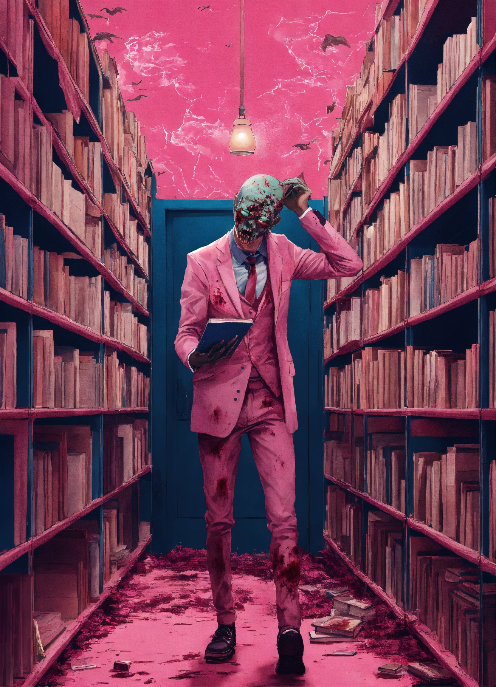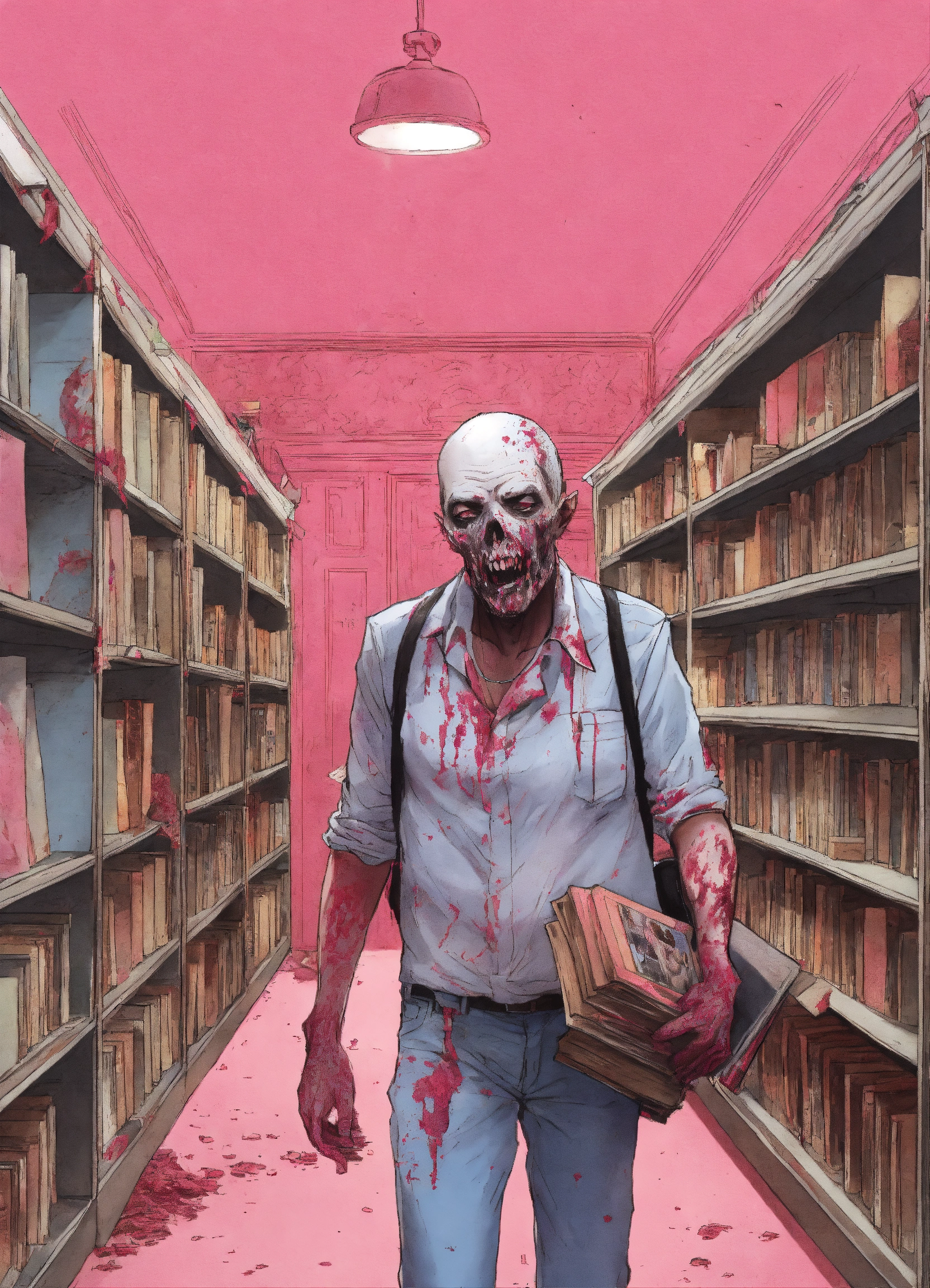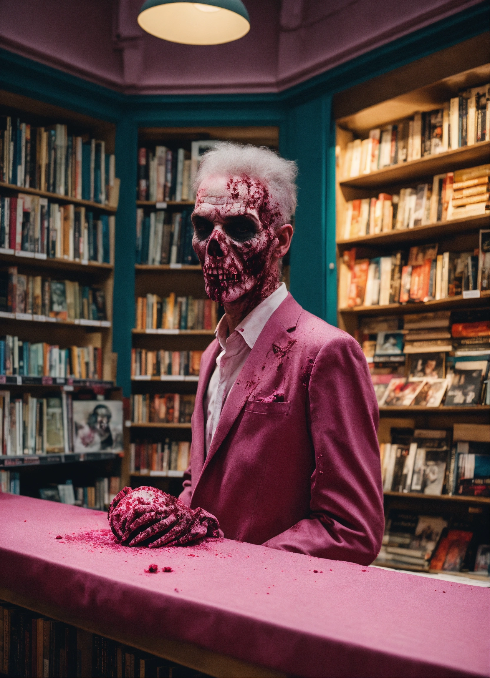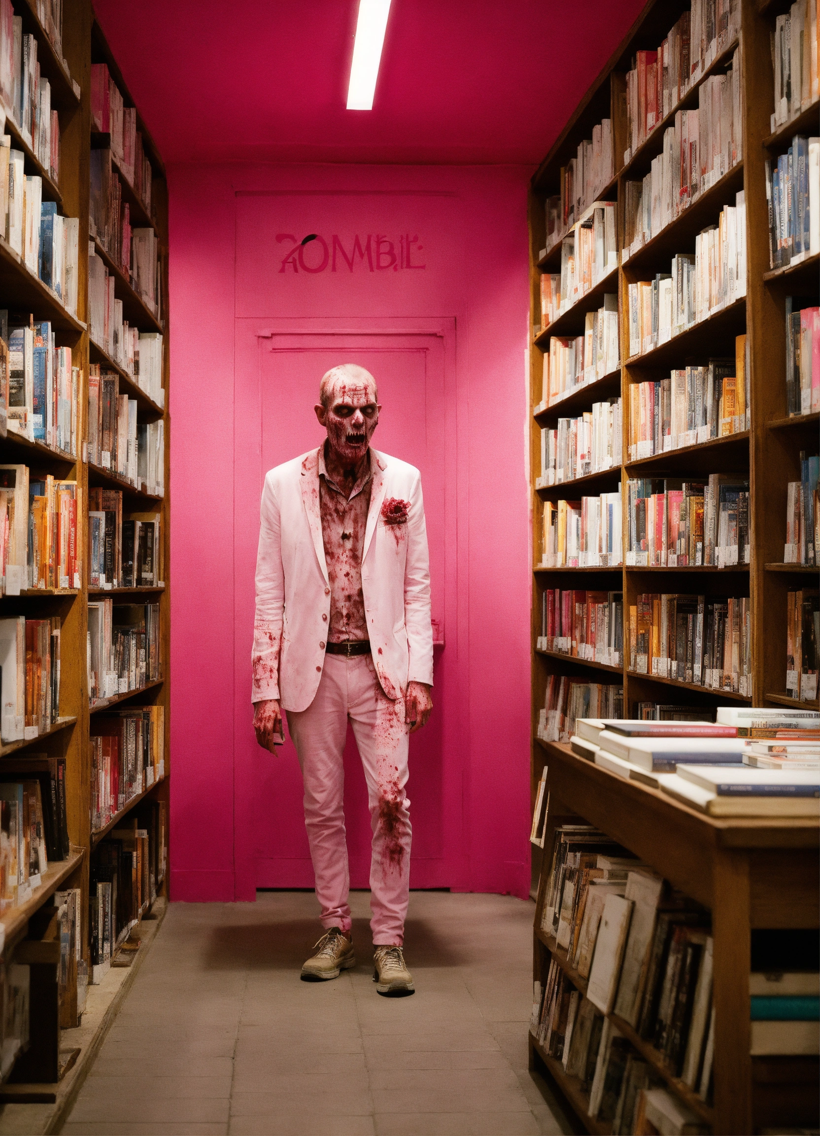 Un, zombie se tient au milieu d’une librairie tout en rose, il tient dans ses mains, un roman dans la couverture est toute blanche