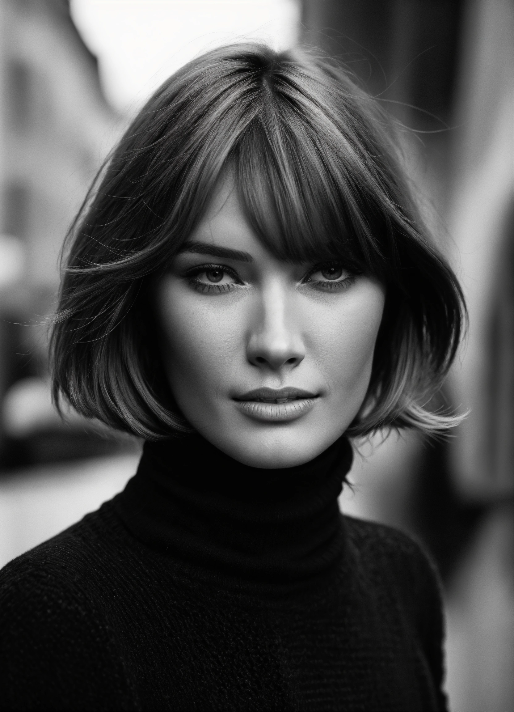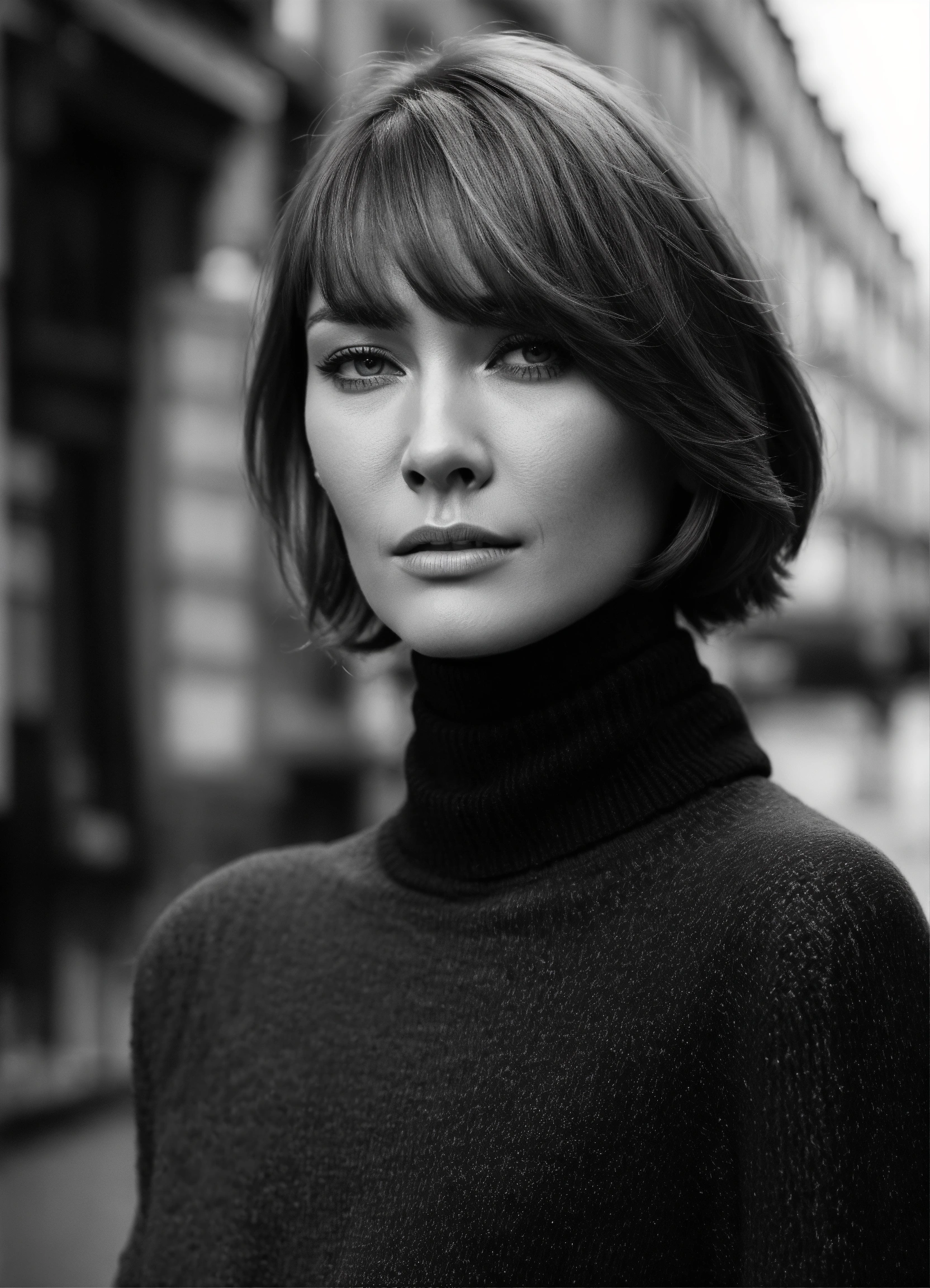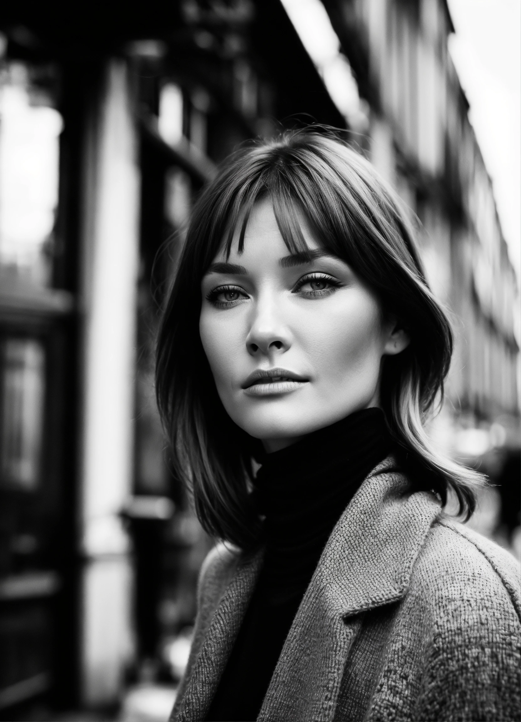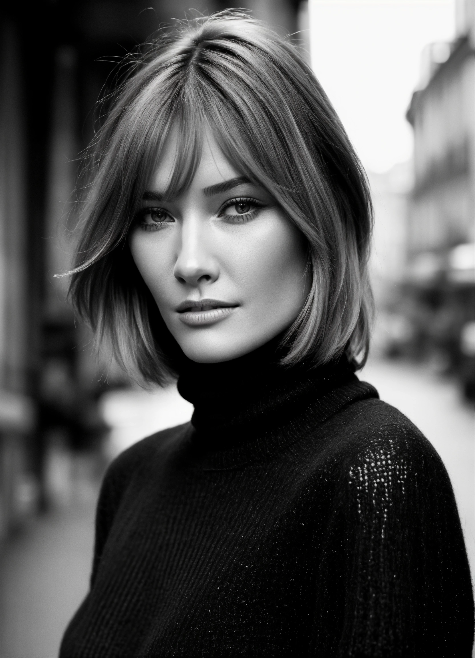 Beautiful fashion models, blonde, carla bruni style, clear eyes, black turtleneck sweater, face view, bob haircut, portrait close up, paris street background, black and white film, photography quality, high detail, high quality.
