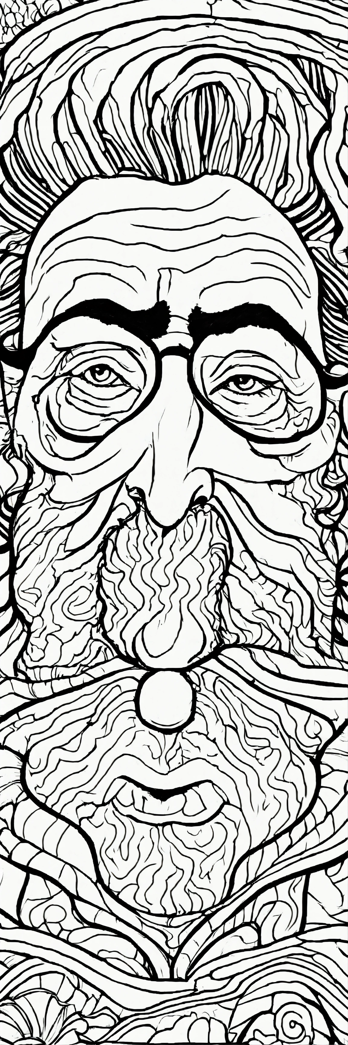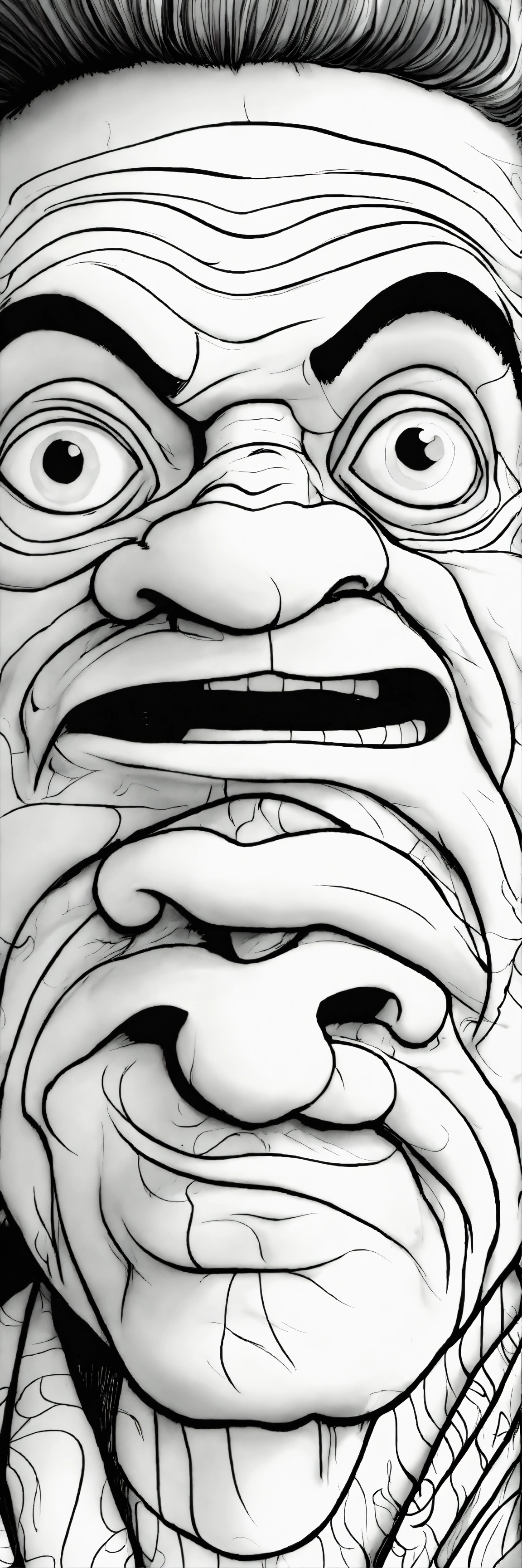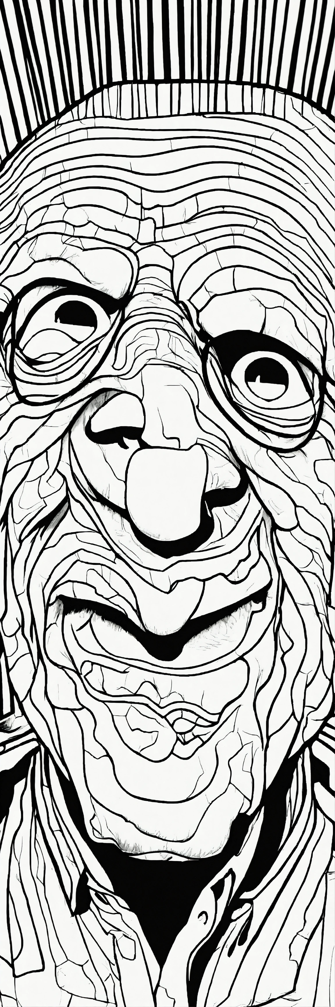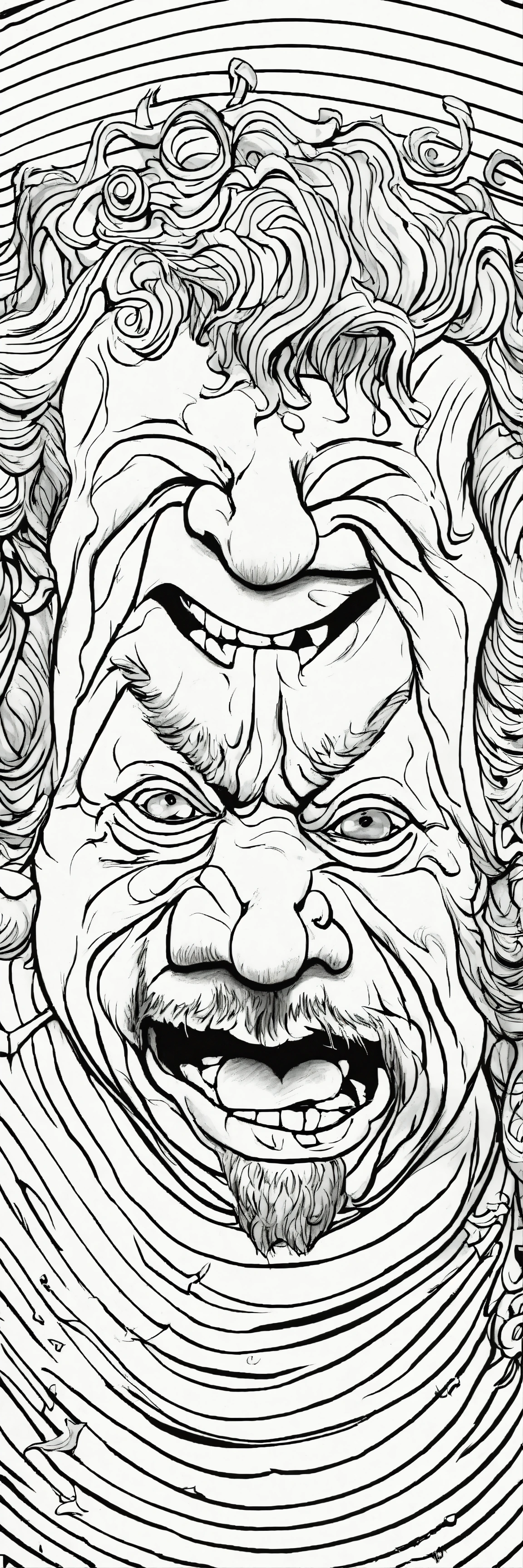 Coloring page for adults, wavy lines, mad magazine character idiot face, black and white, caricature, white background