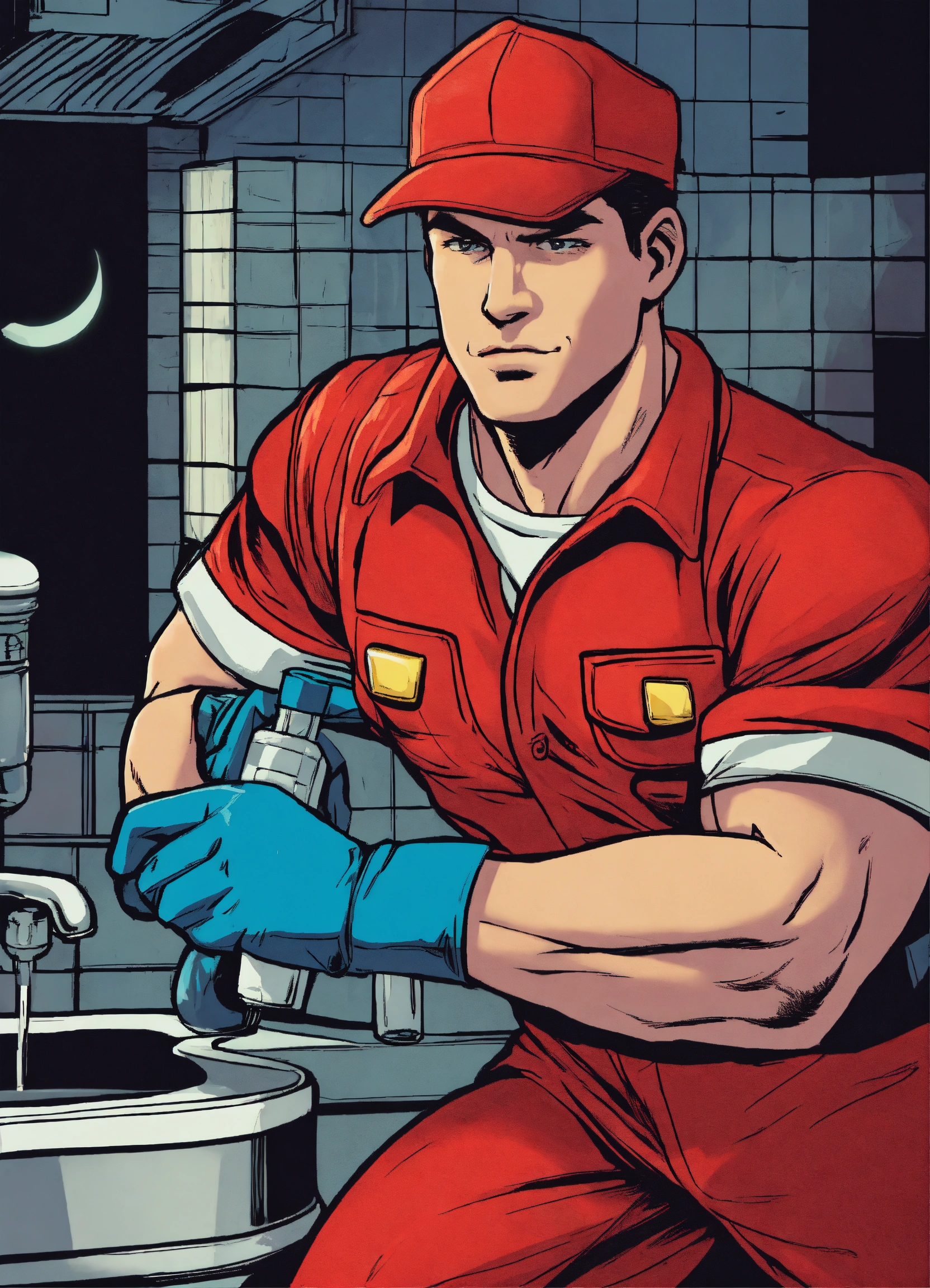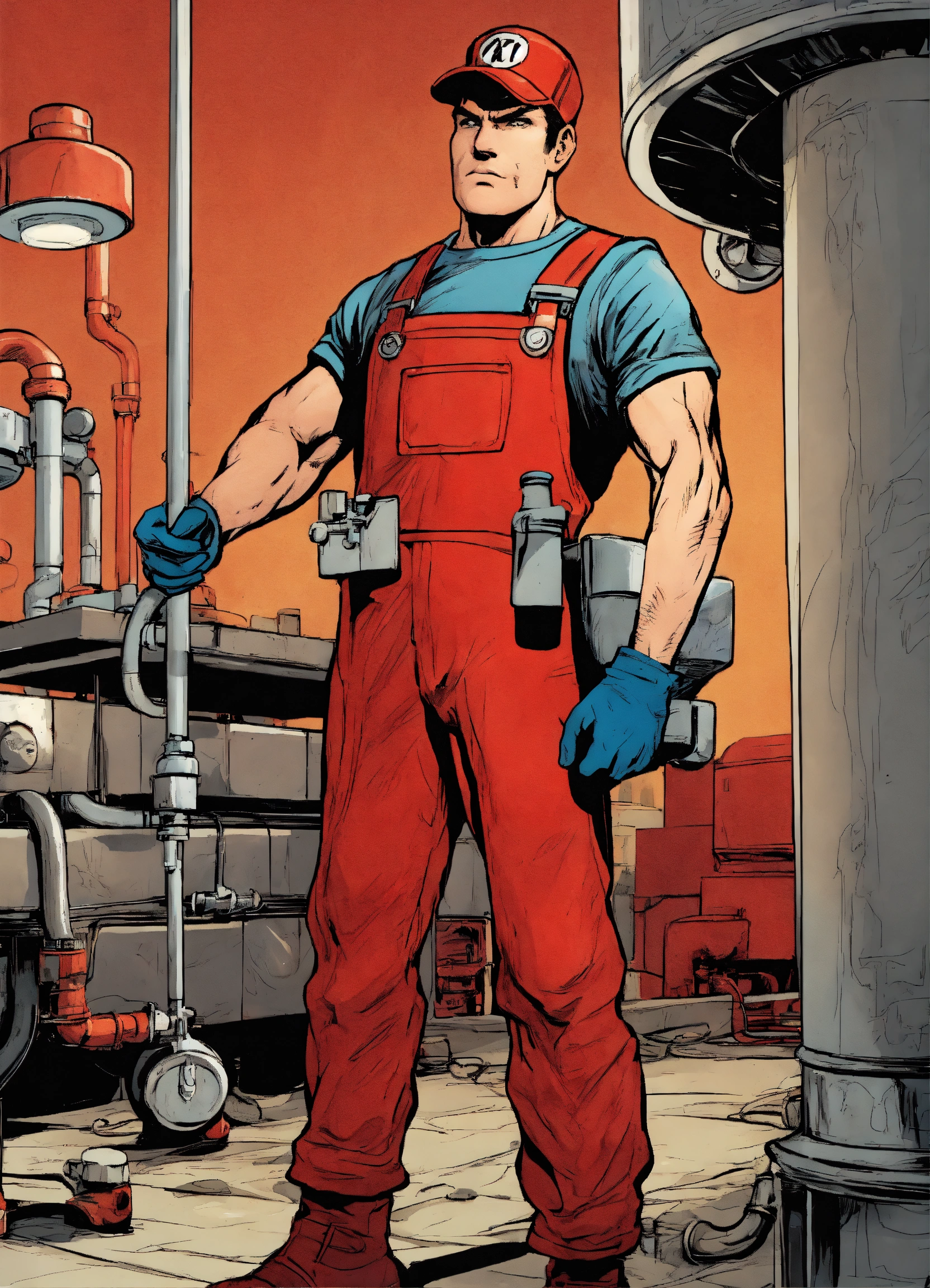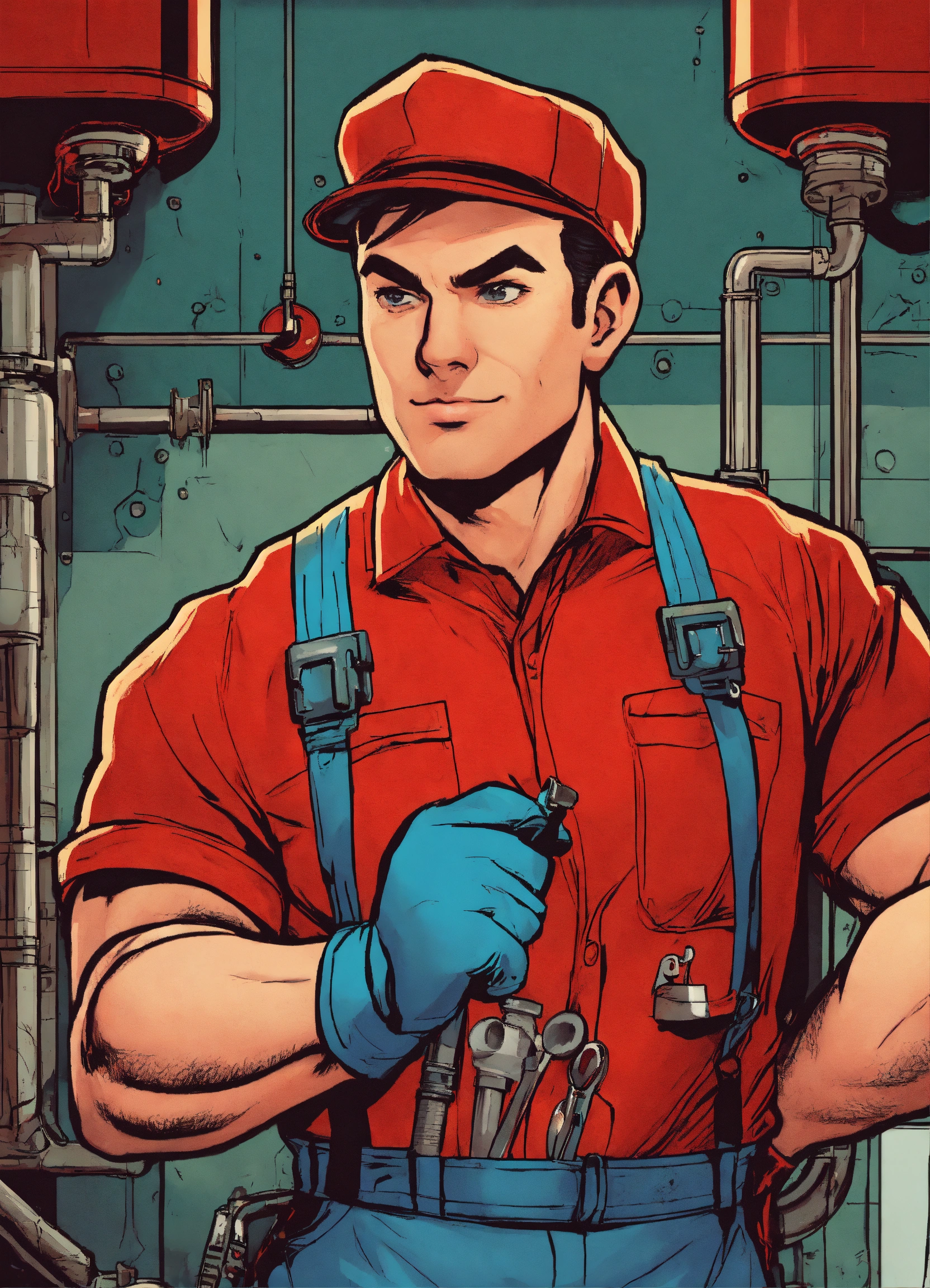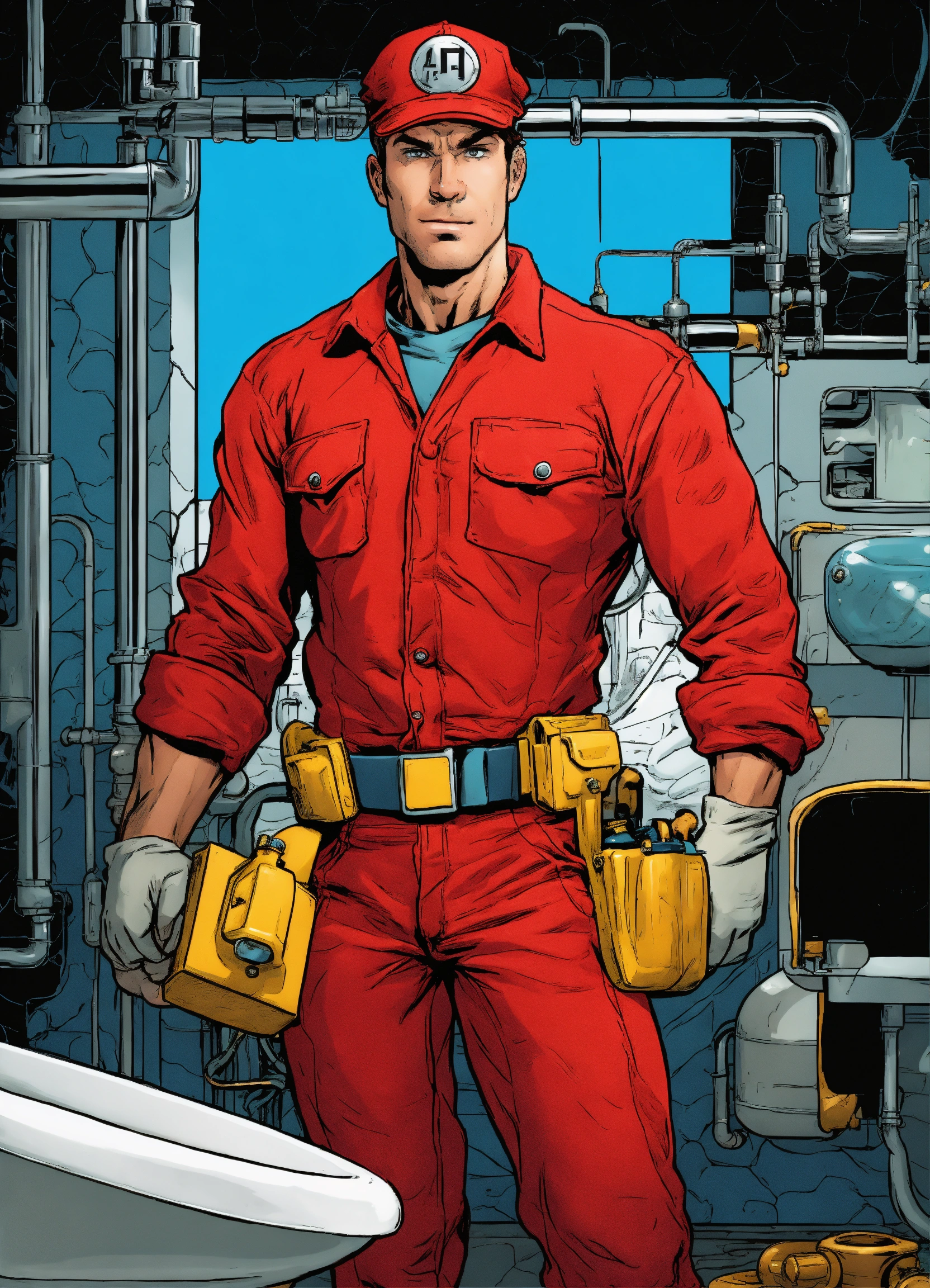 Close up of a heroic plumber in a red outfit