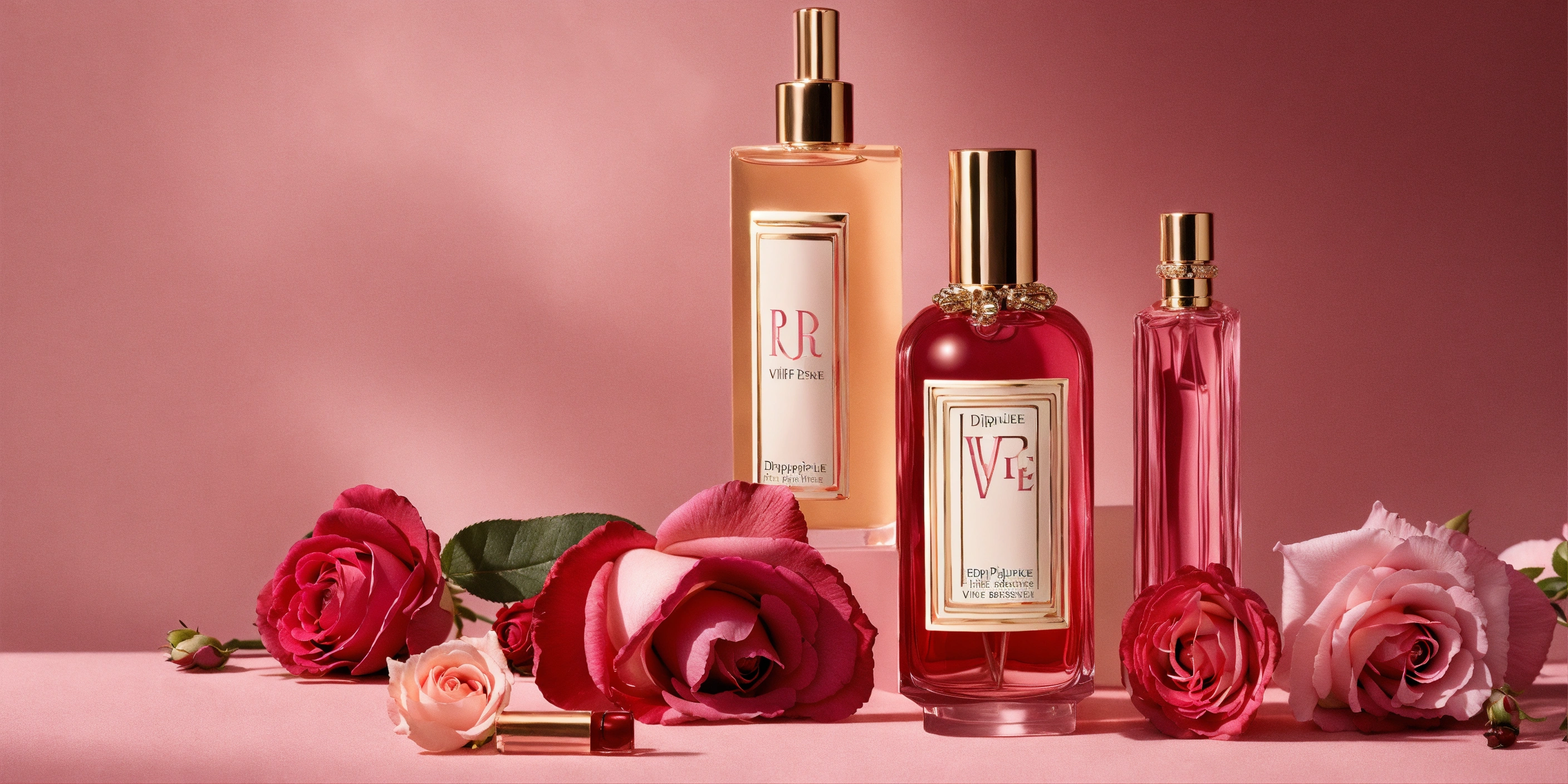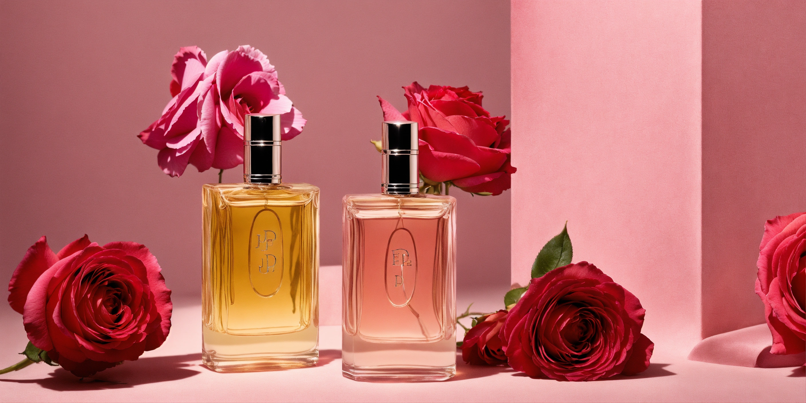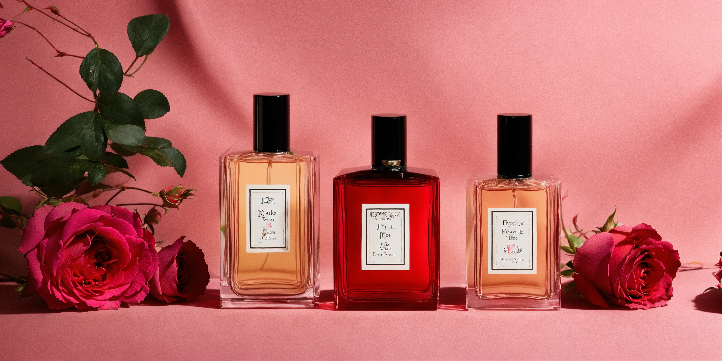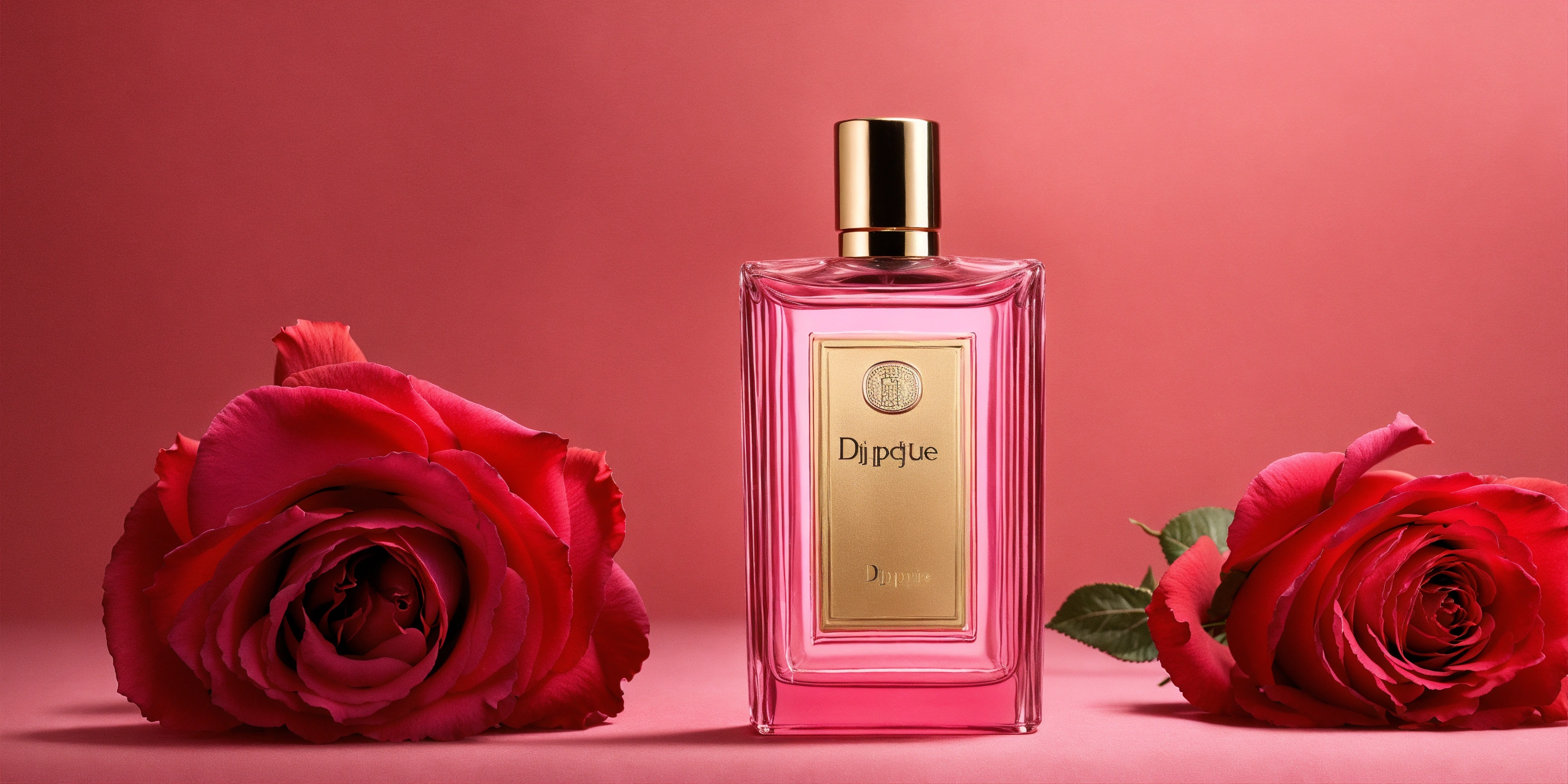 1 perfume bottles, soft curves and romantic, red pink, professional photo studio inspired by diptyque perfumes with some pastel vif red eden rose
