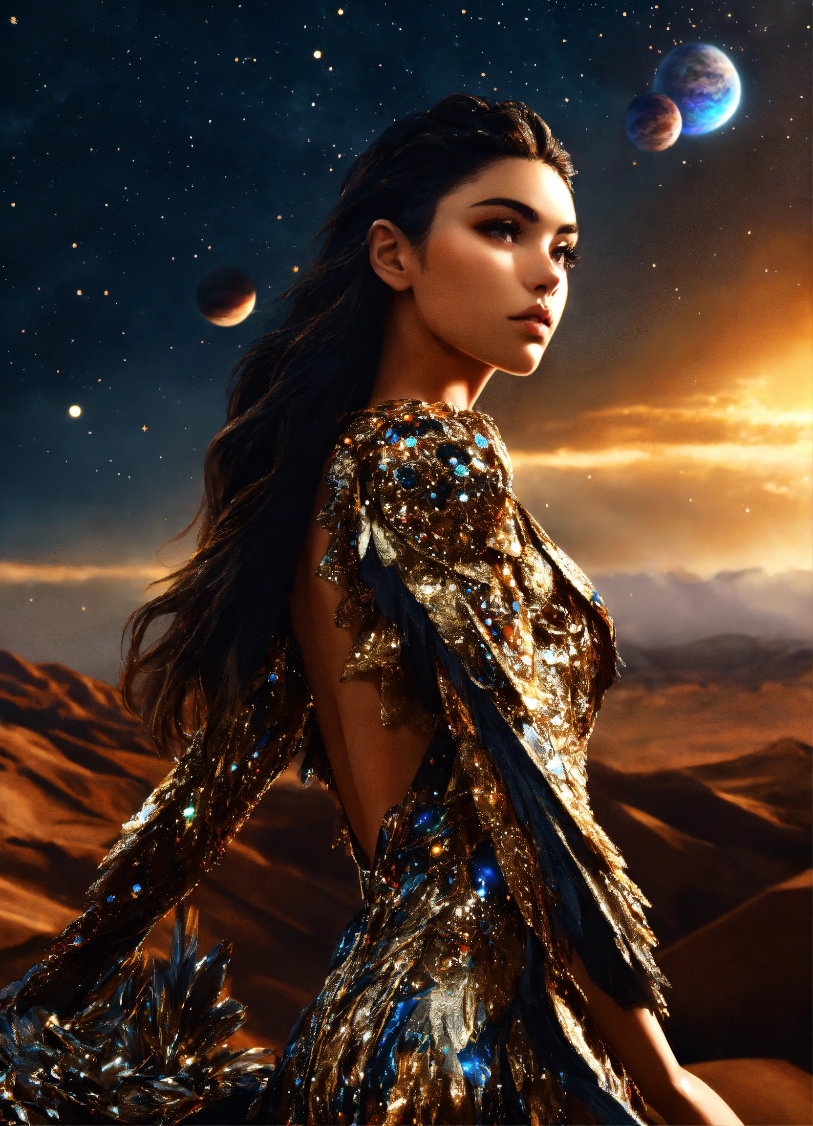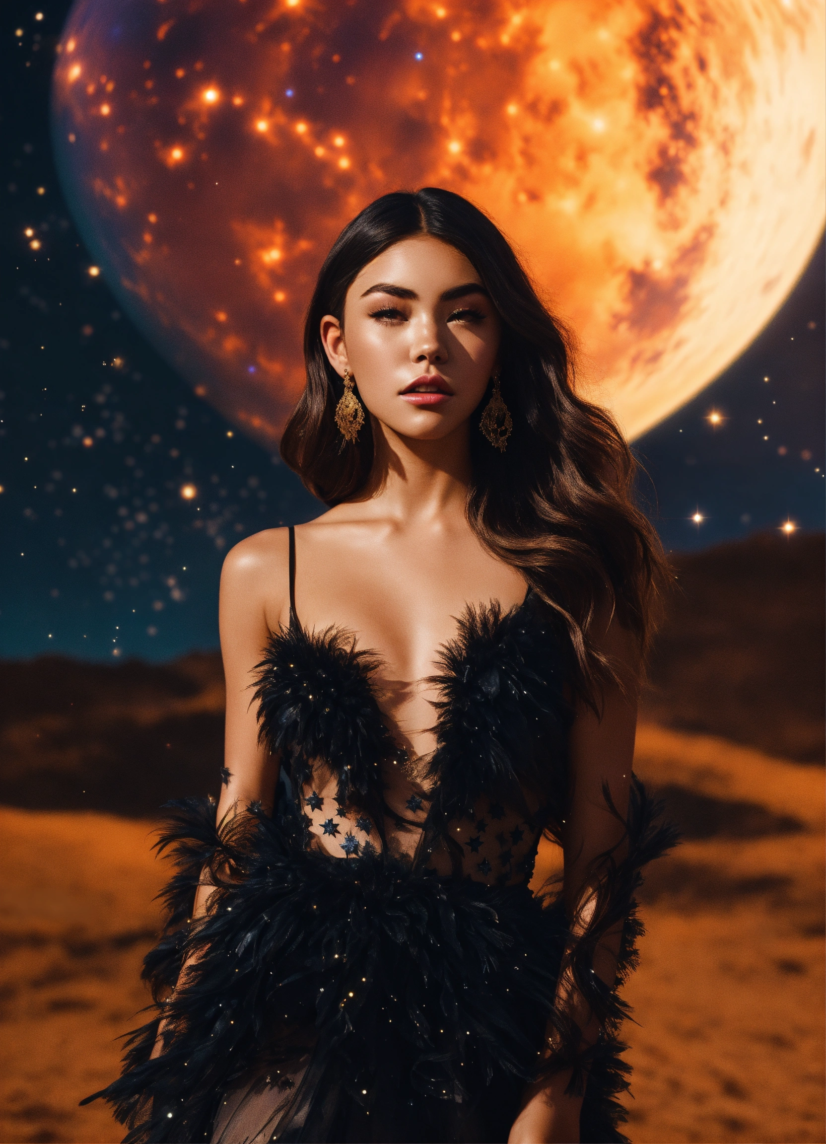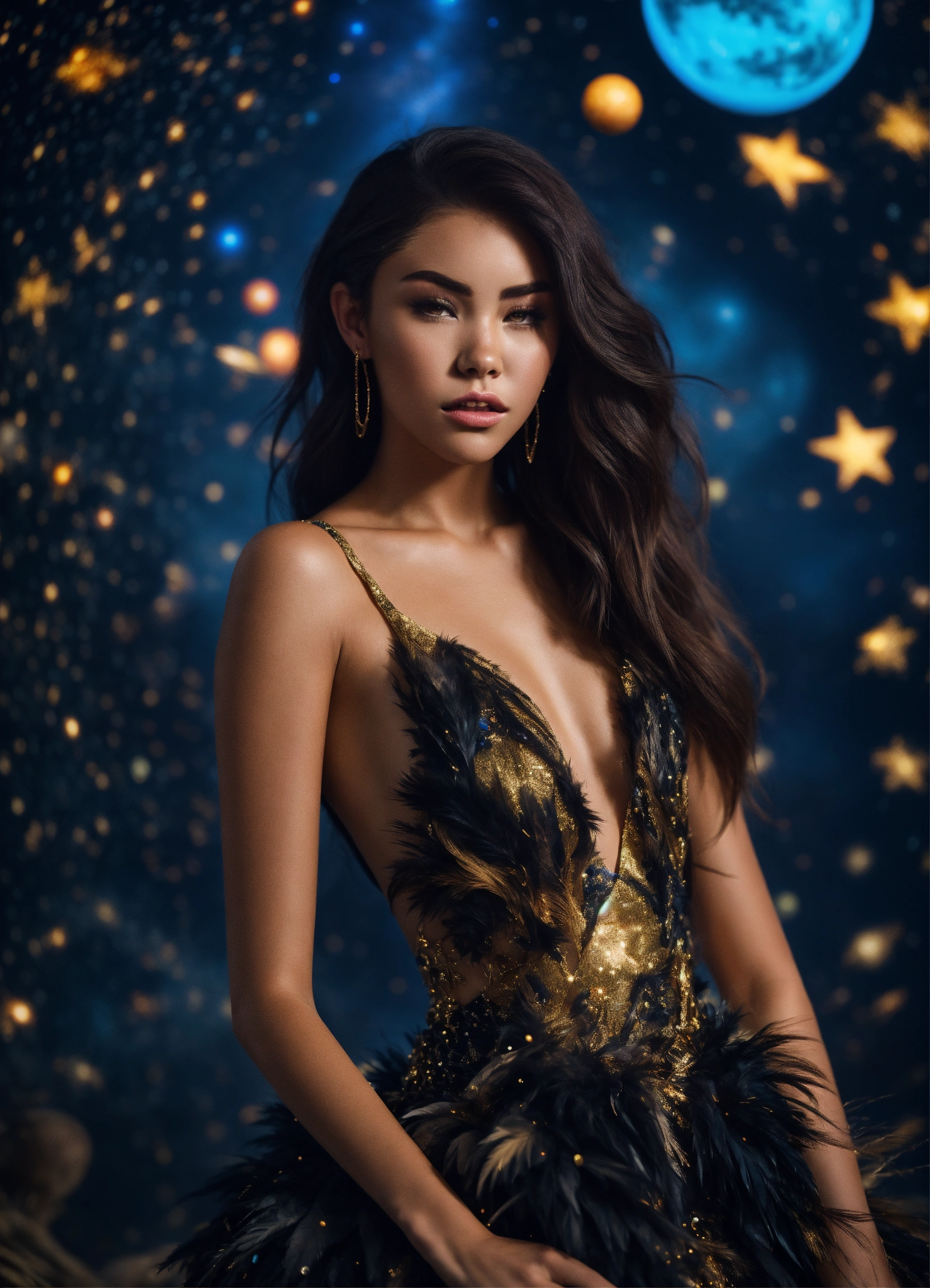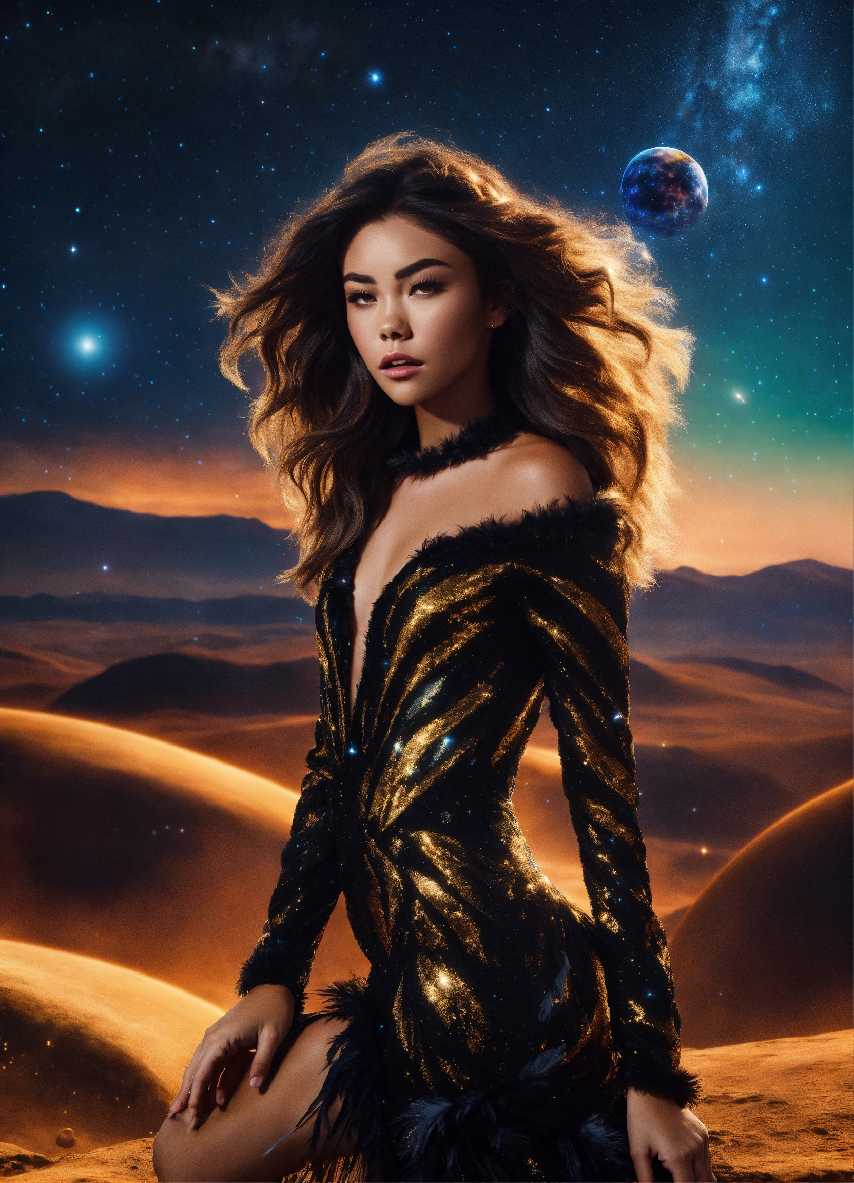 Madison beer in a feathered cocktail dress, black, on an isolated planet, back turned. stars raining down, a majestic lion with golden mane watching her. galaxy filled with planets, realistic. full body. 4k real photoshoot.