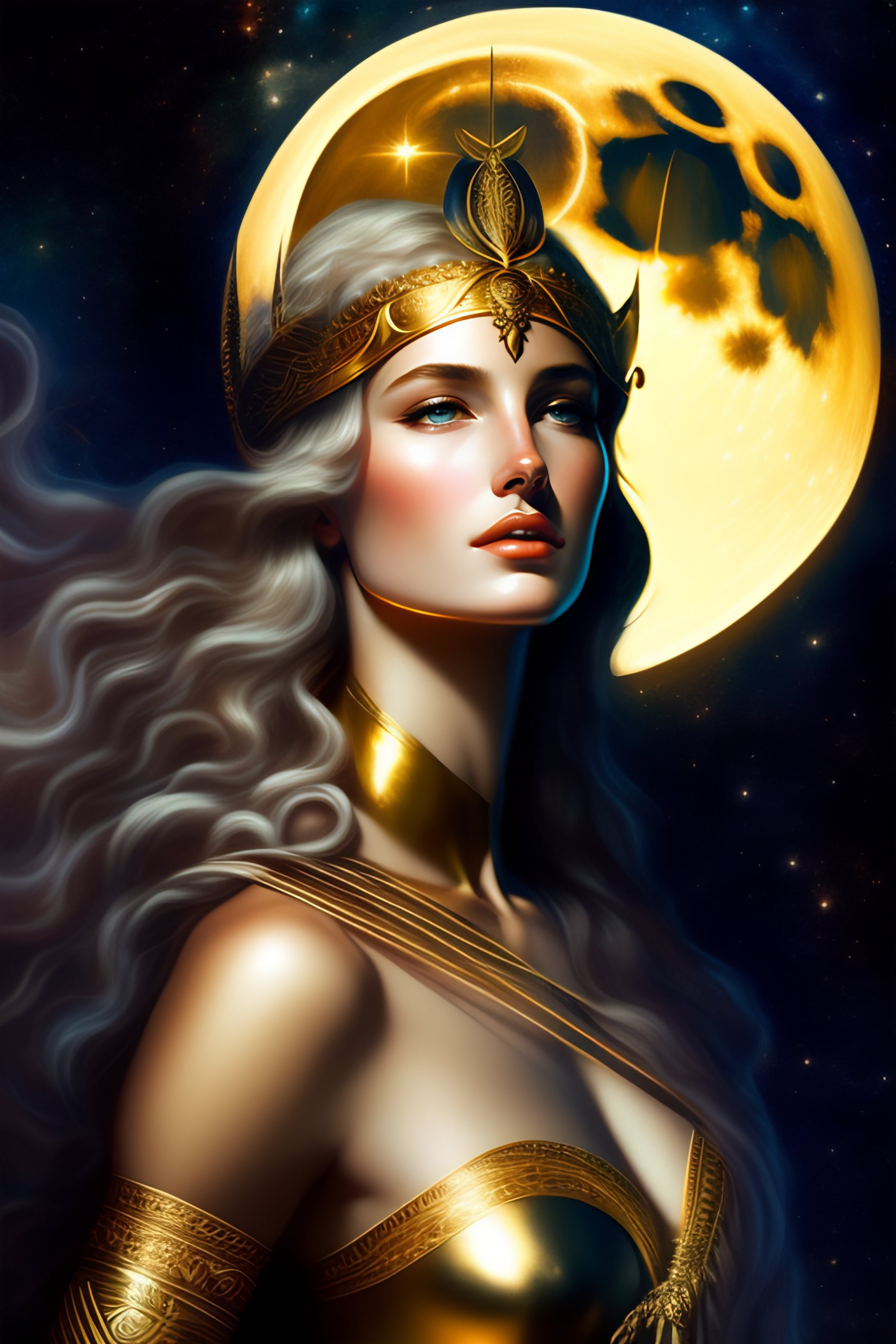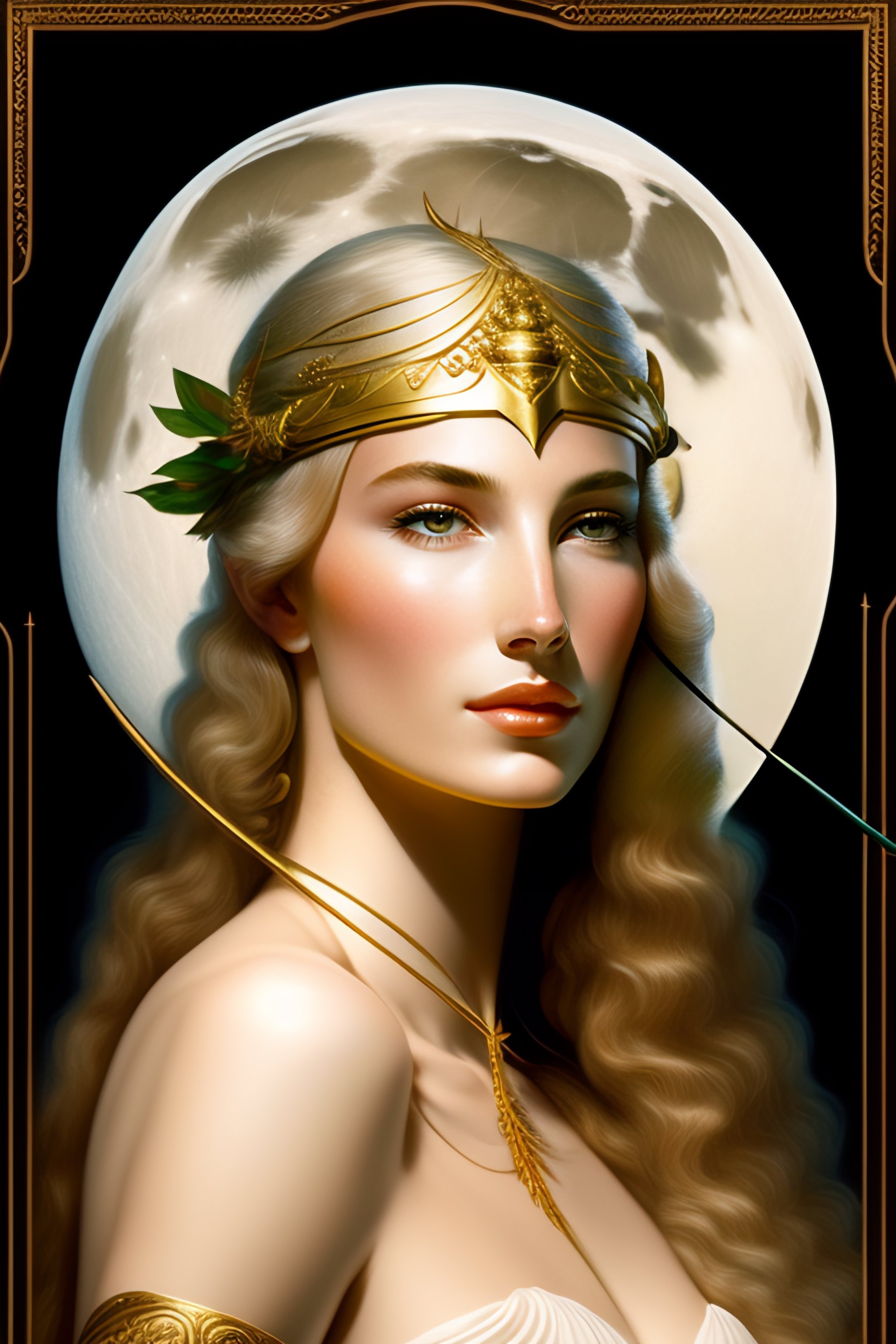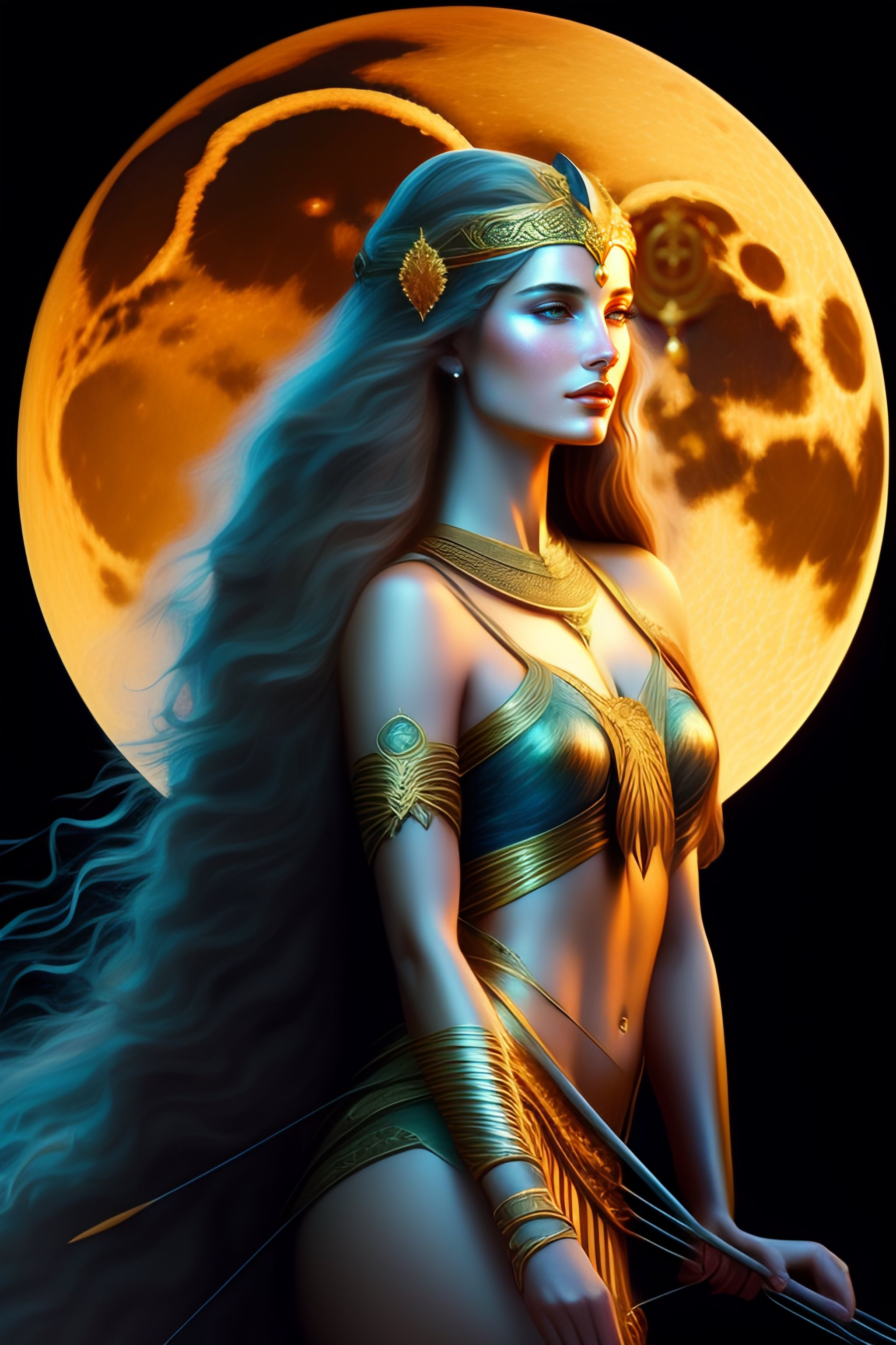 Artemis goddess of the hunt, the moon, and the wilderness being tall, slender, and beautiful, with long, flowing hair and a youthful appearance, associated with a bow and arrow, huntress, crescent moon above her head, symbolizing her association with the moon.