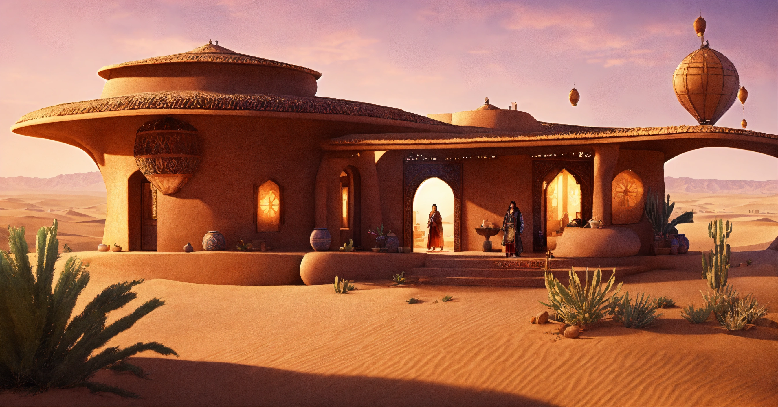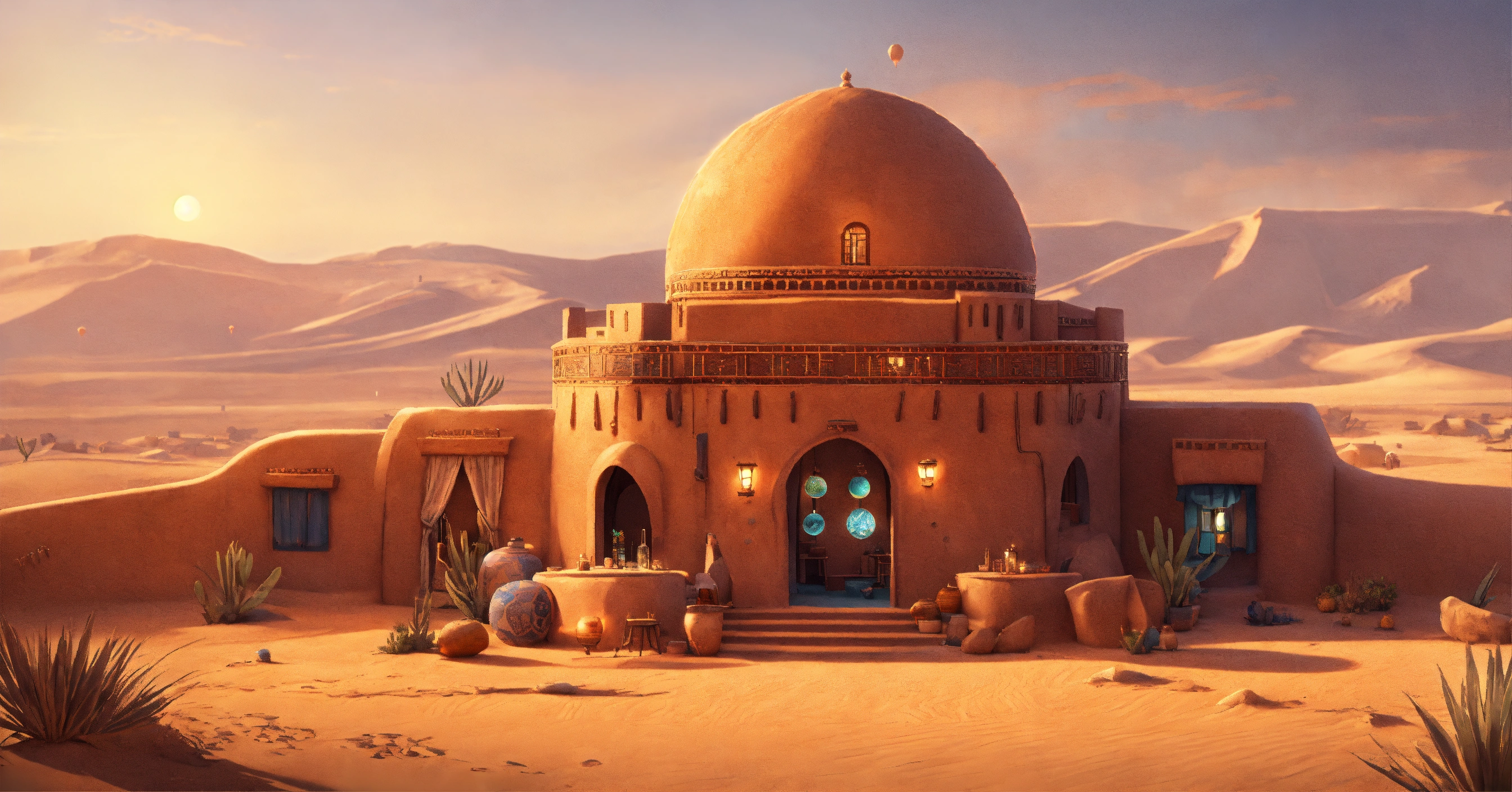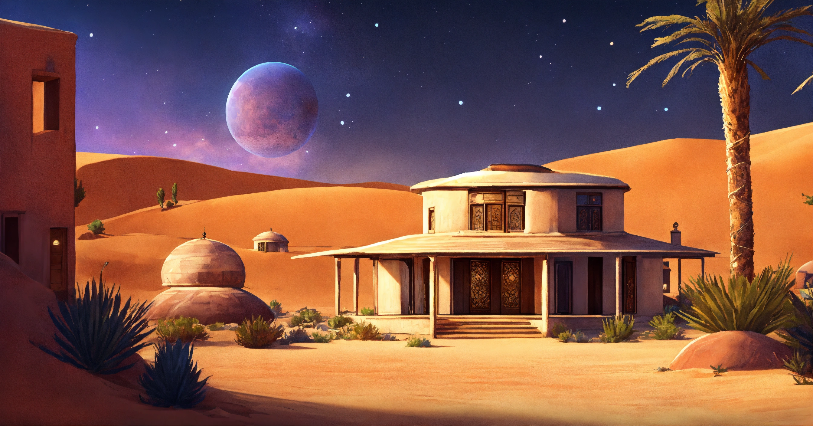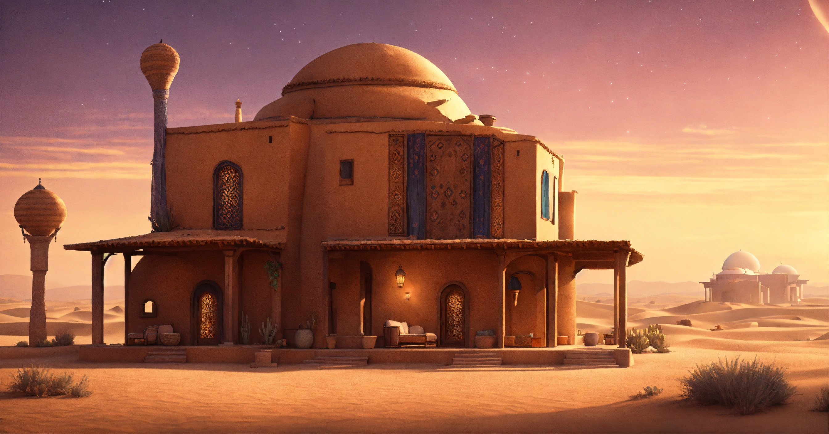 Concept art of a large desert home, jakku, desert, flat roof, several rooms, hut, two story, peasant, fire and chairs outside, survivor, charming, desert planet, multi-room, moroccan, starry desert planet sky, lanterns outside, moroccan fairy light lanterns outside poor, view from the outside, exterior view only, stucco outhouse, patterned design stucco walls, windows without glass, windows have shimmer dark magenta pattern flowing curtains, exterior only, house with courtyard in the center, beautiful, adobe, sand dunes in background, large huge two story house, alien desert planet, stranded, adobe villa, star wars, very long adobe mansion, huge, realistic, intricate, 3d, hyper realistic, two story