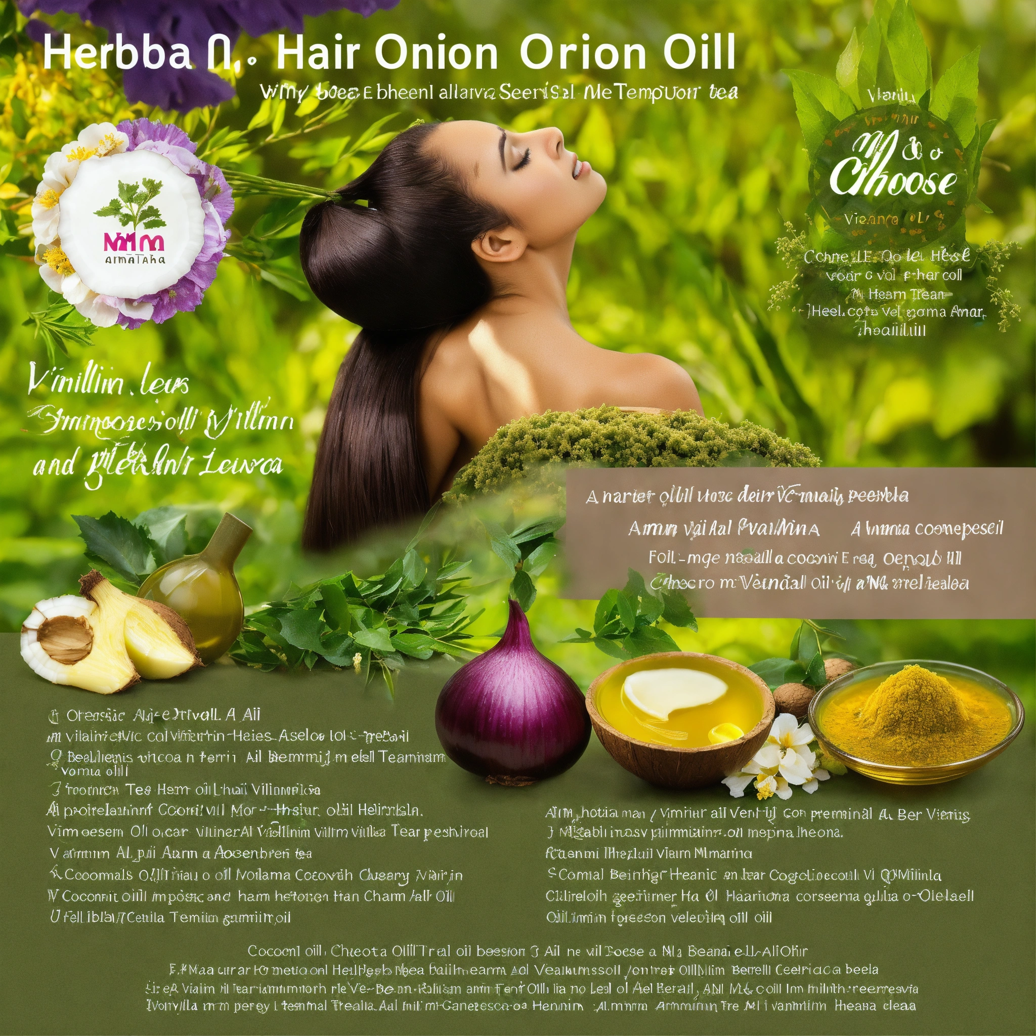 Create a template with why choose m³herbal onion hair oil? vitamin-e oil vitamin e is a crucial component for hair health, providing strength and preventing hair fall. coconut oil sesame oil olive oil tea tree oil onion hibiscus flower curry leaves cucuta (amar bel) henna (aamla)