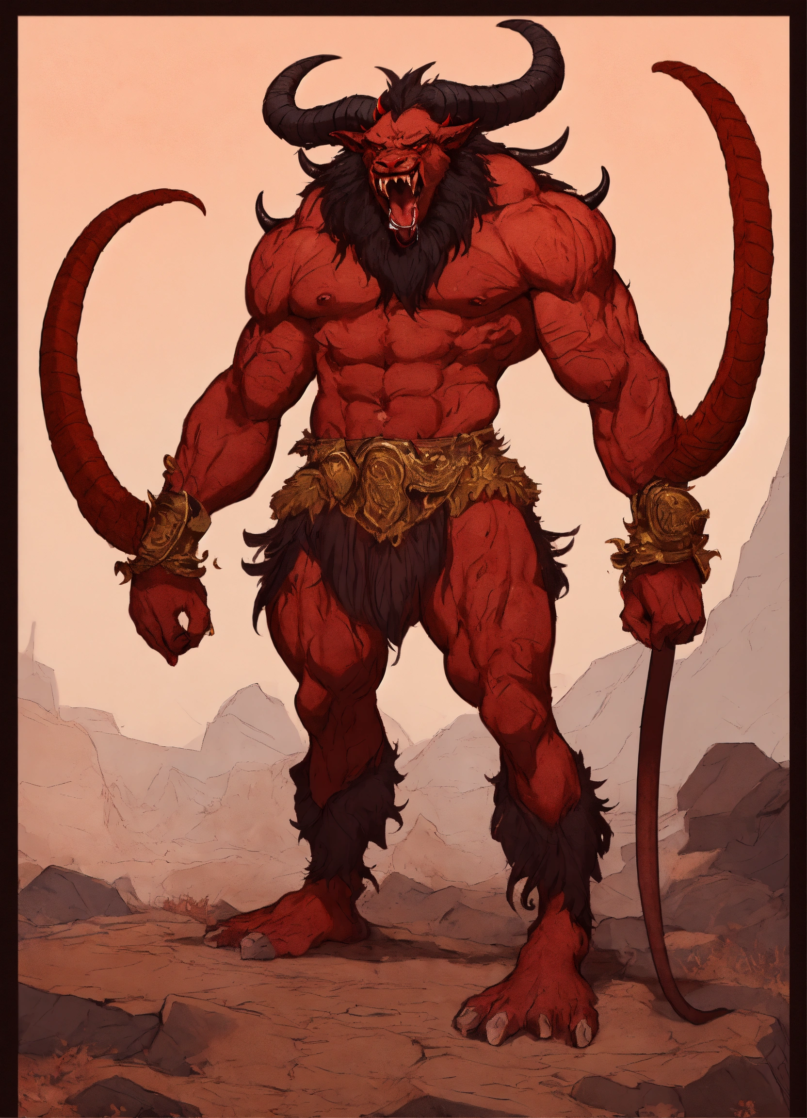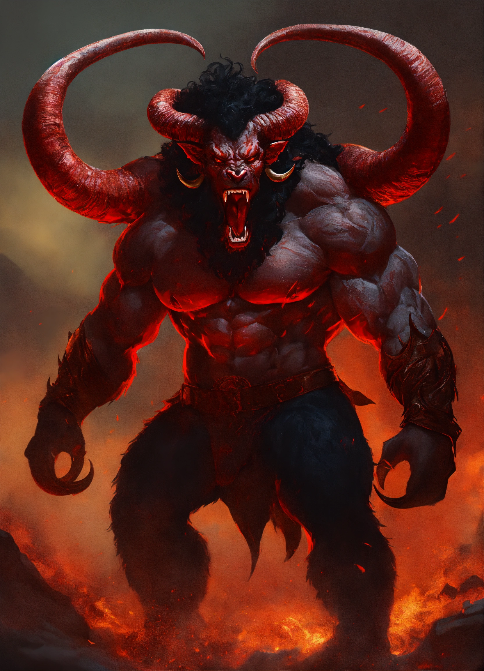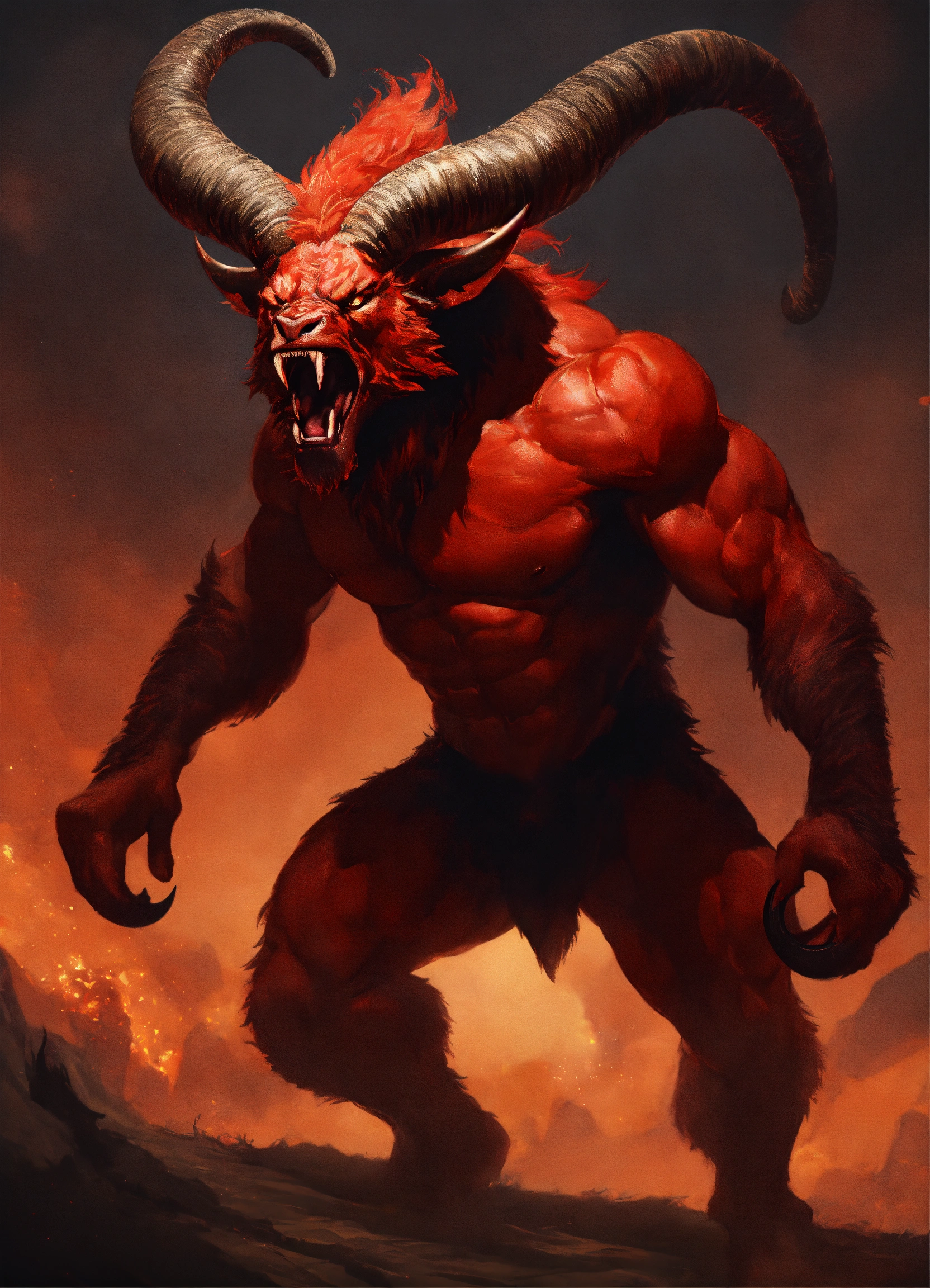 A hellish image of an absurdly muscular red-skinned and hooved feet curly long tail crazy long black horns long split tongue roaring demon with african features