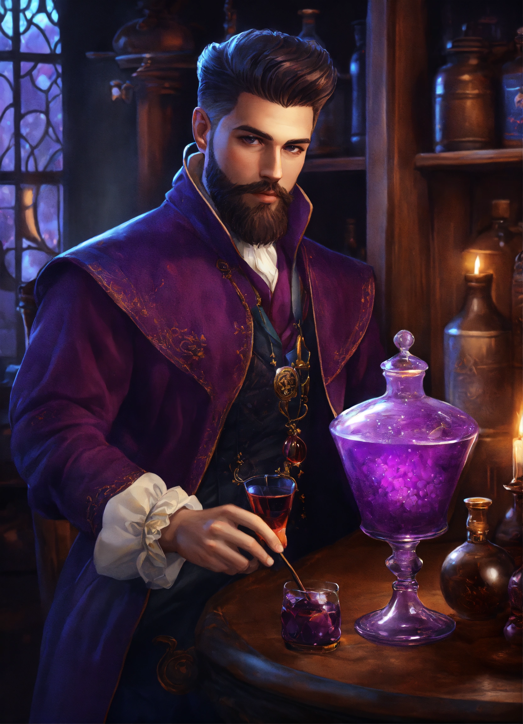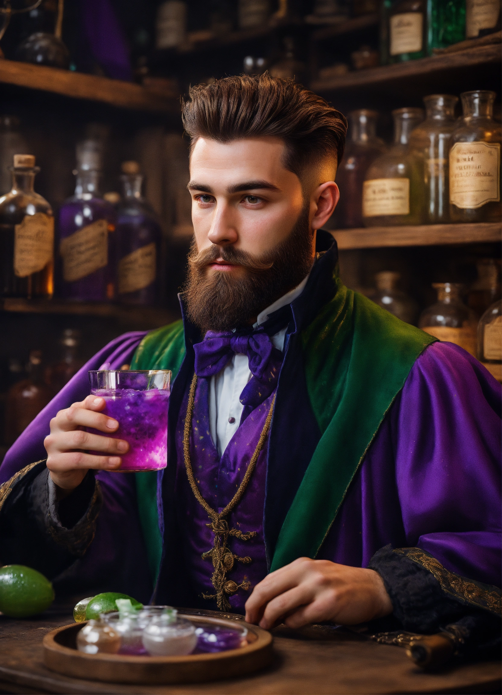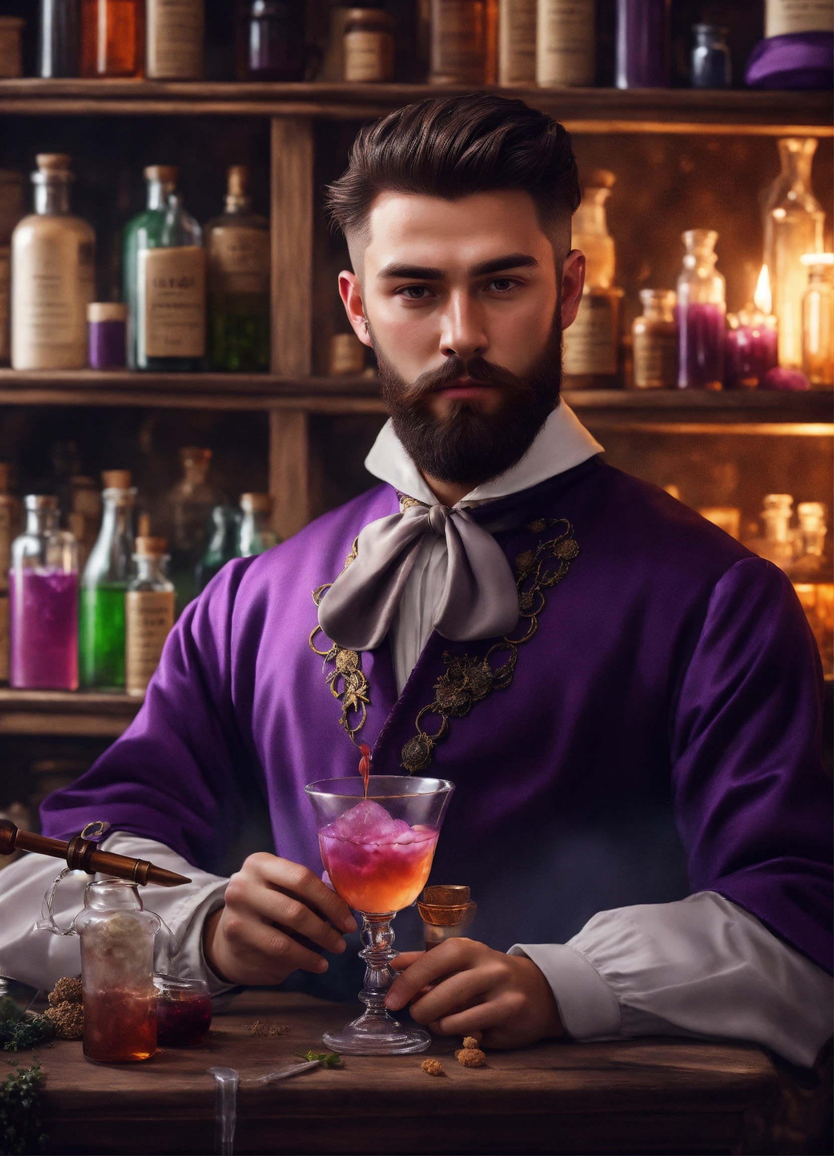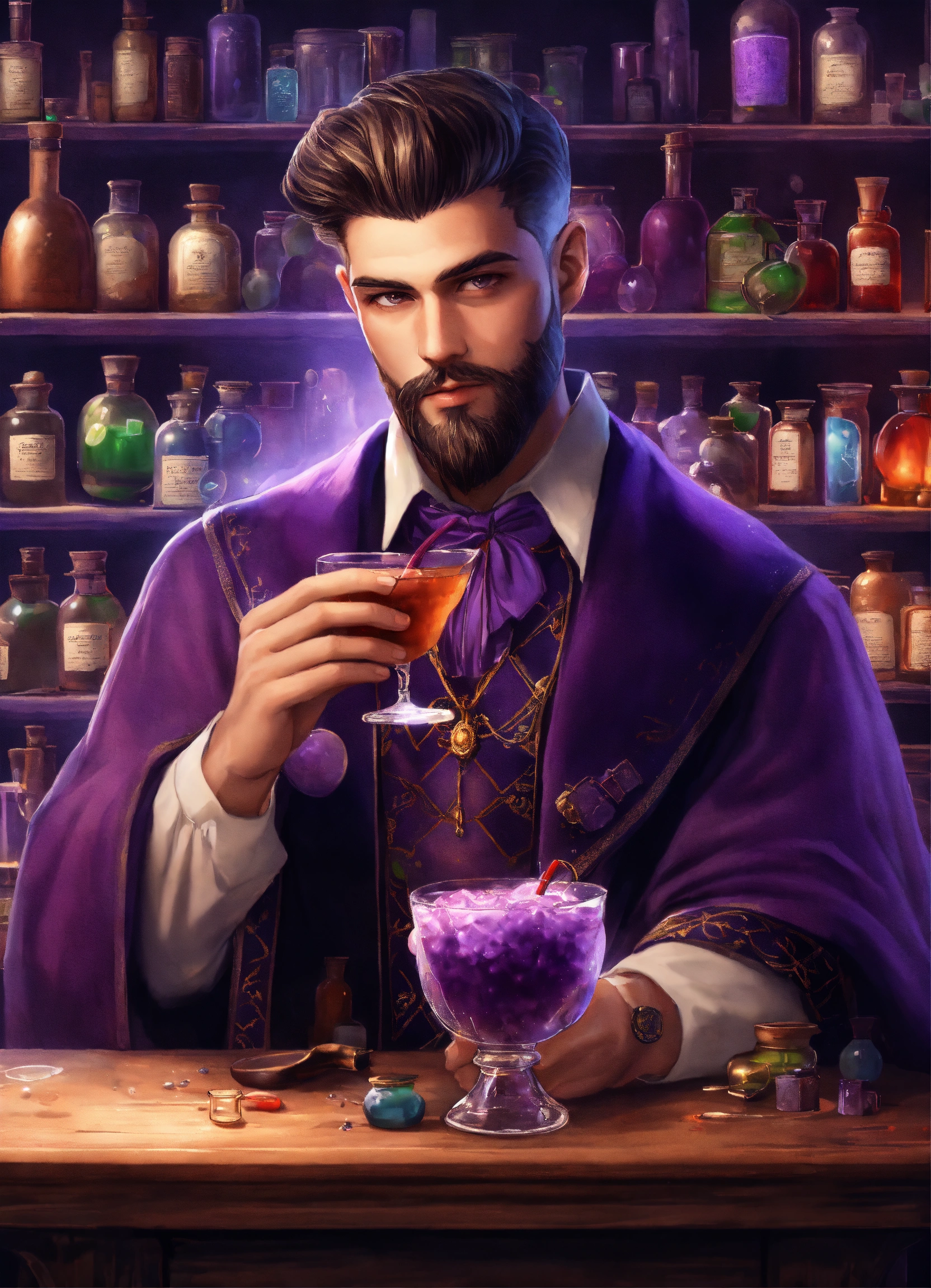 Photorealistic picture of a young handsome wizard with short full trimmed beard and classic pompadour haircut with oval face holding a purple drink, surrounded by potions in the apothecary