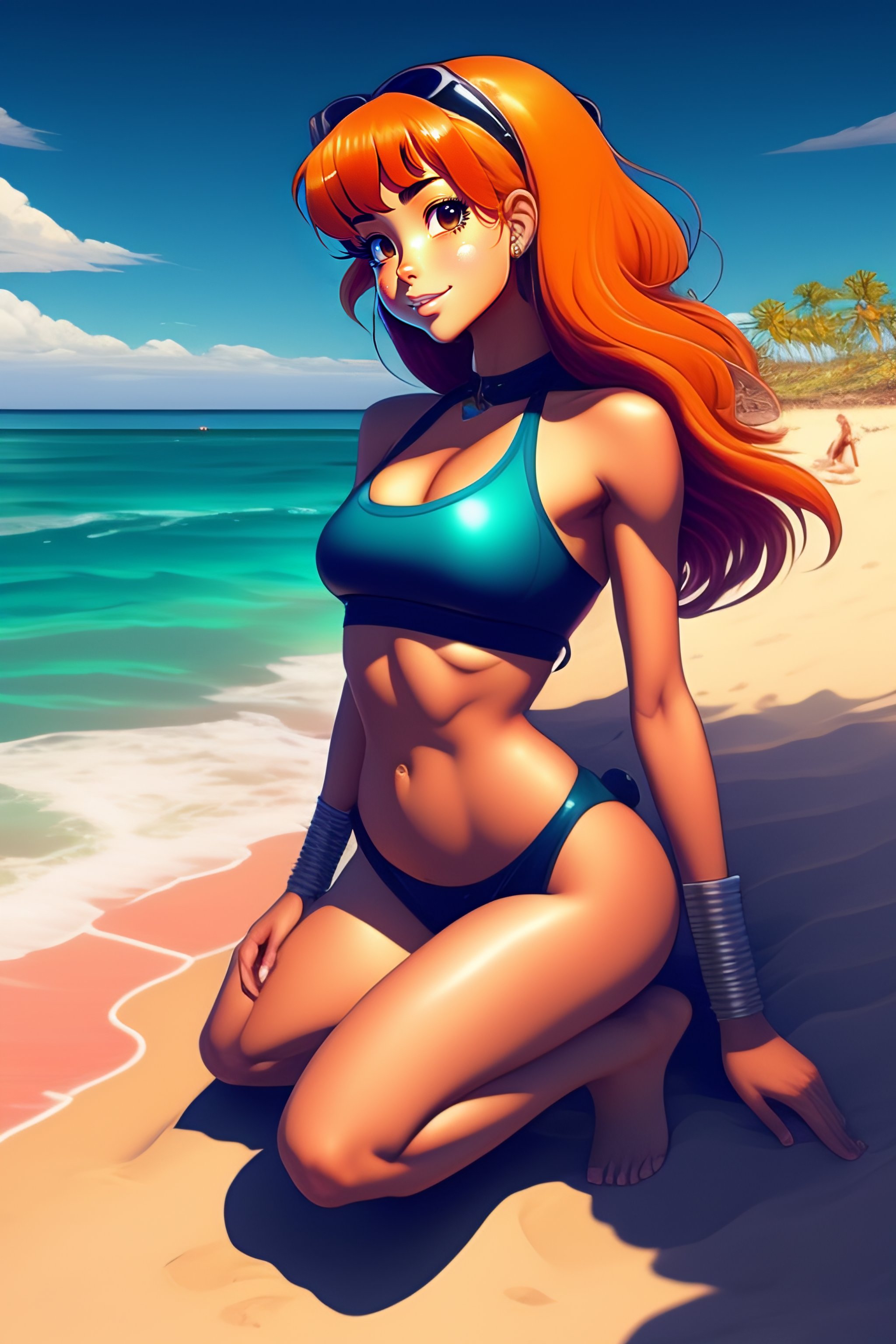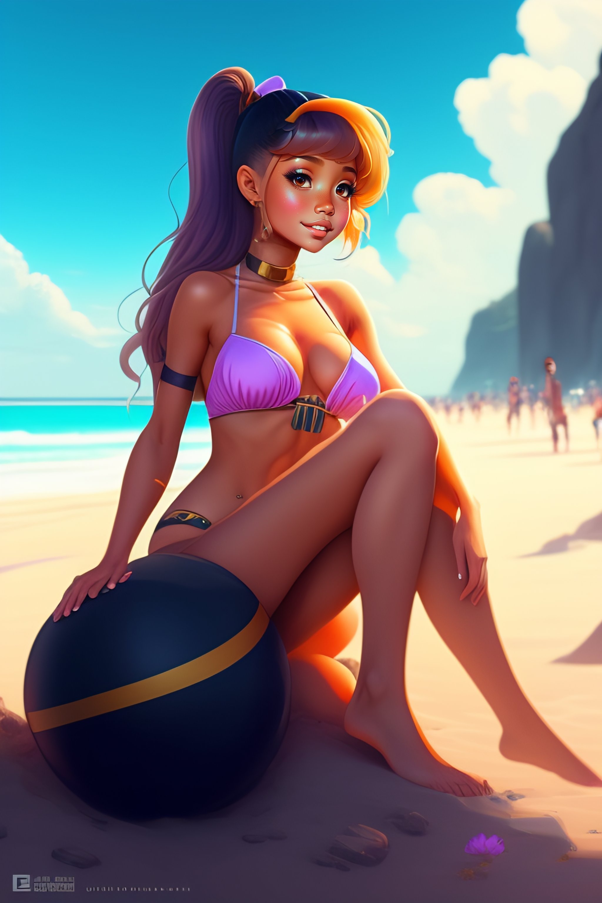 Full body ariana grande smiling girl with a micro piece of bikini sitting in a beach, hyper detailed painting, style of laurie greasley, studio ghibli, akira toriyama, 4k, vibrant colors, trending on deviantart, trending on artstation, high details