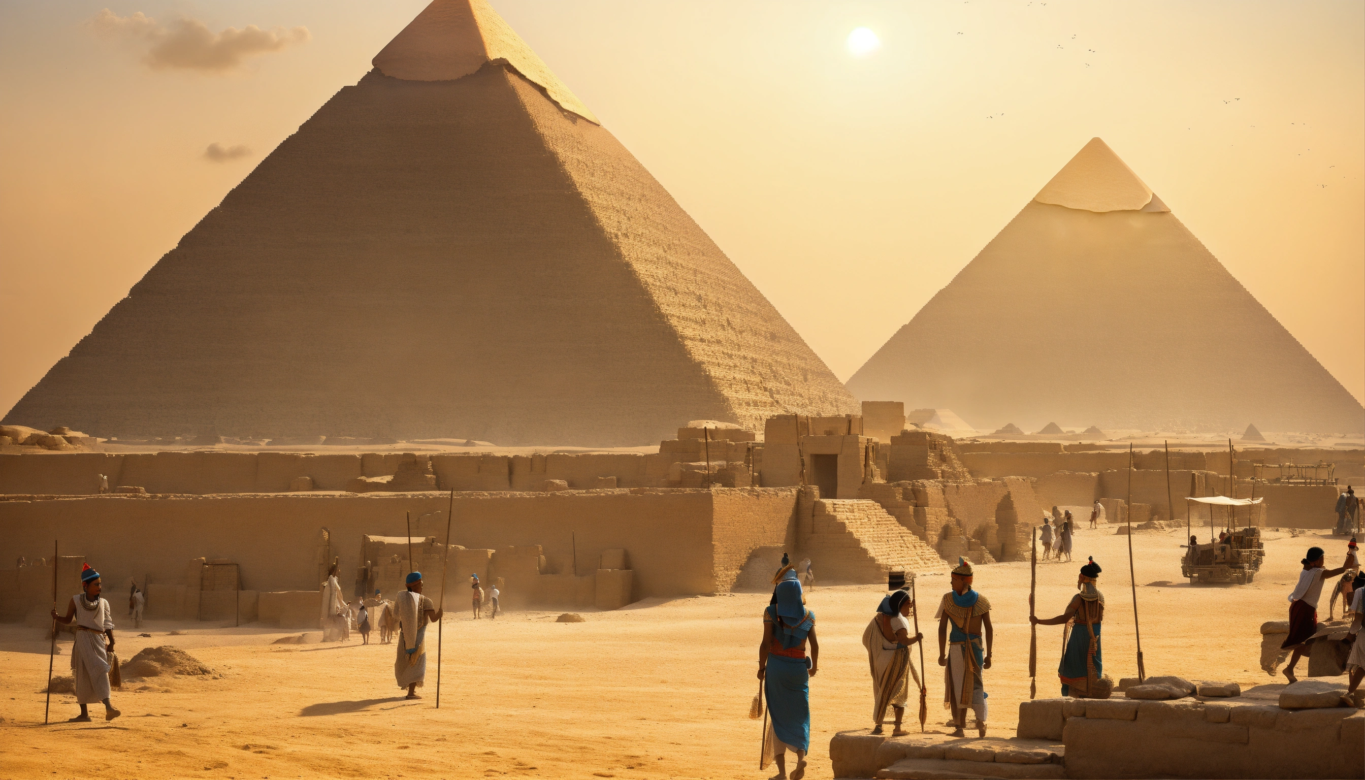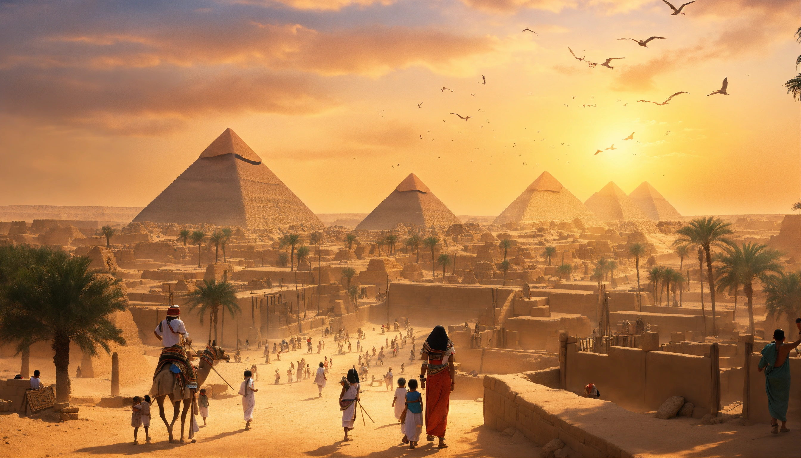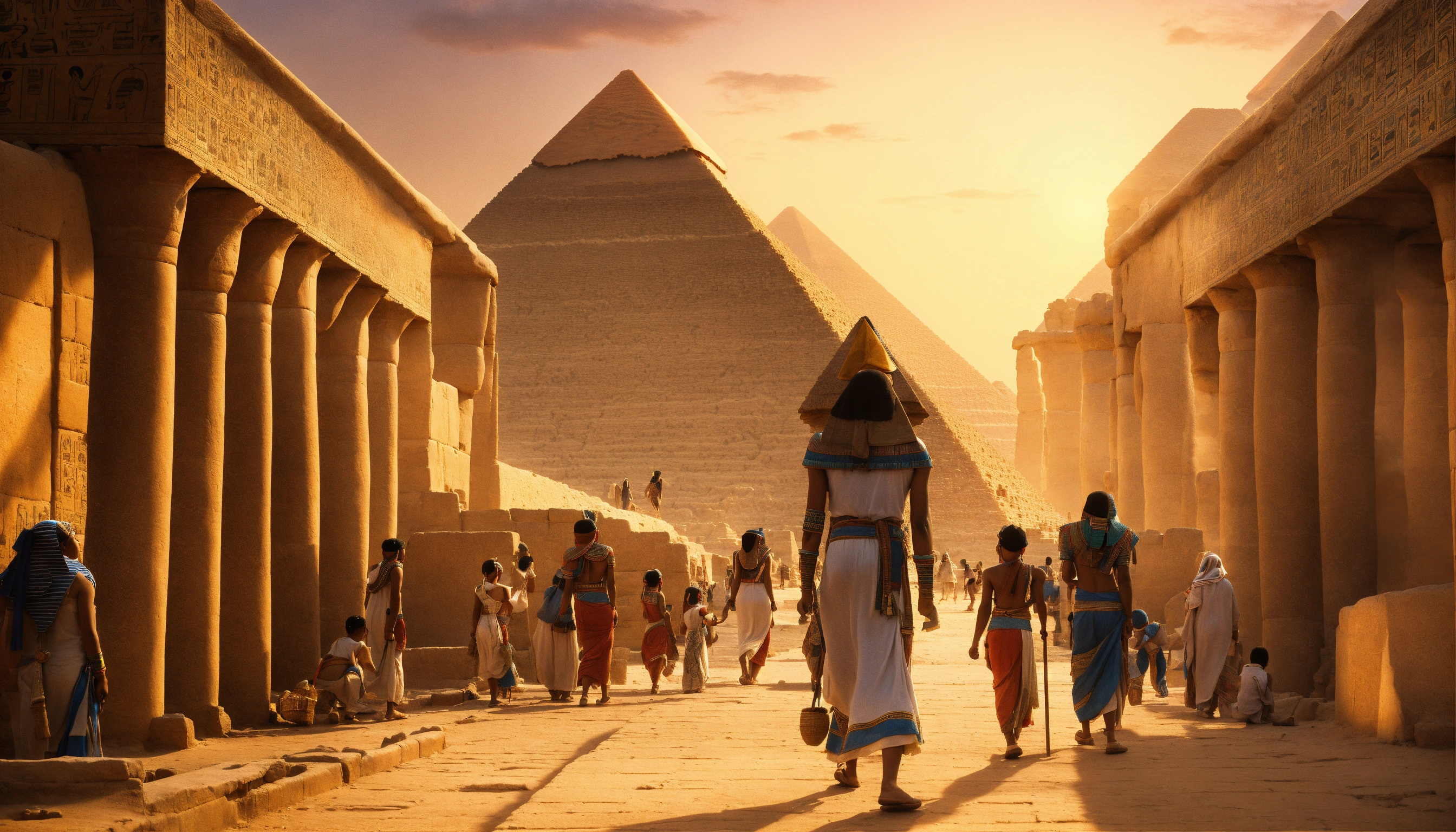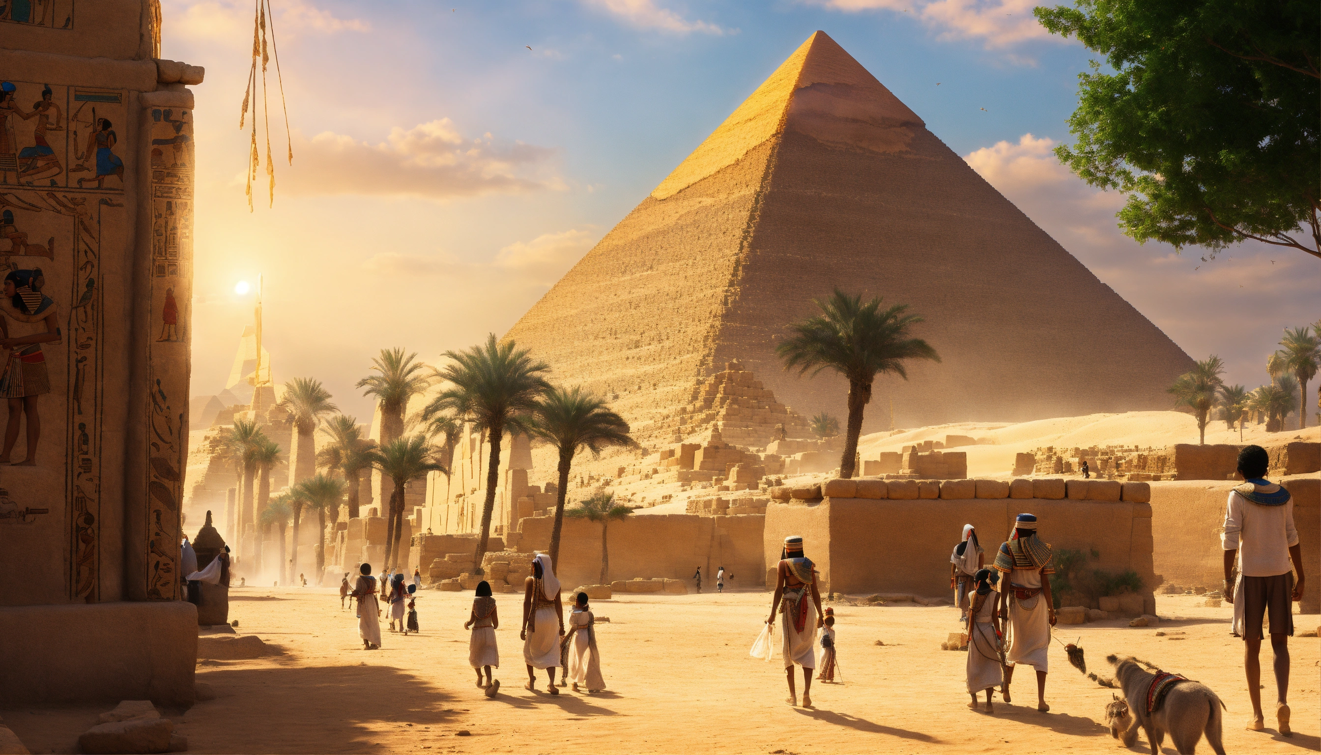 Leave the created character, the kids find themselves in the bustling streets of ancient egypt. people in traditional egyptian attire go about their daily activities. the great pyramids loom in the distance.