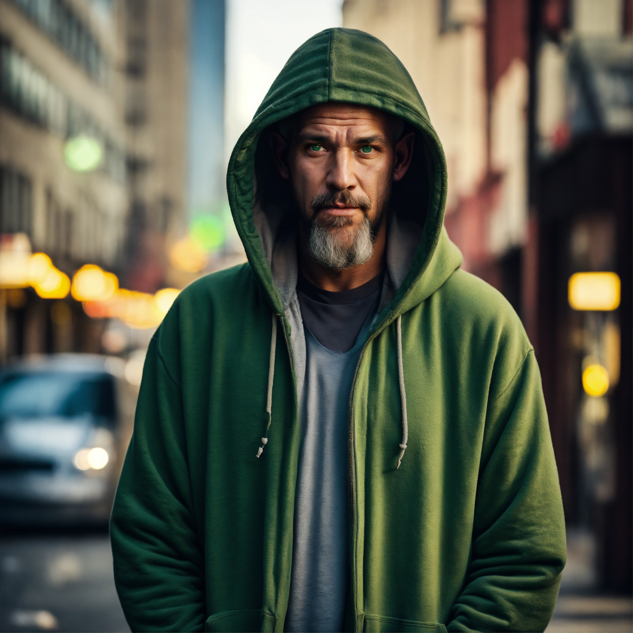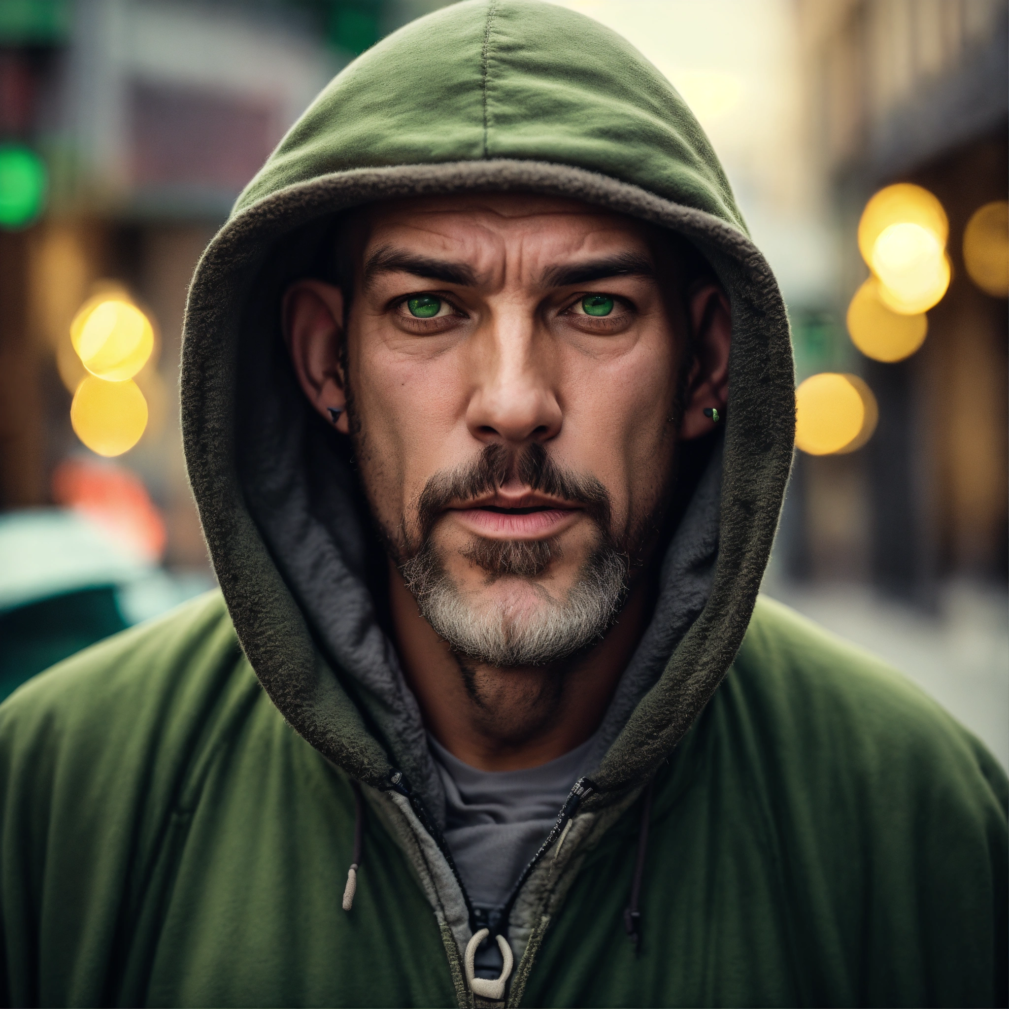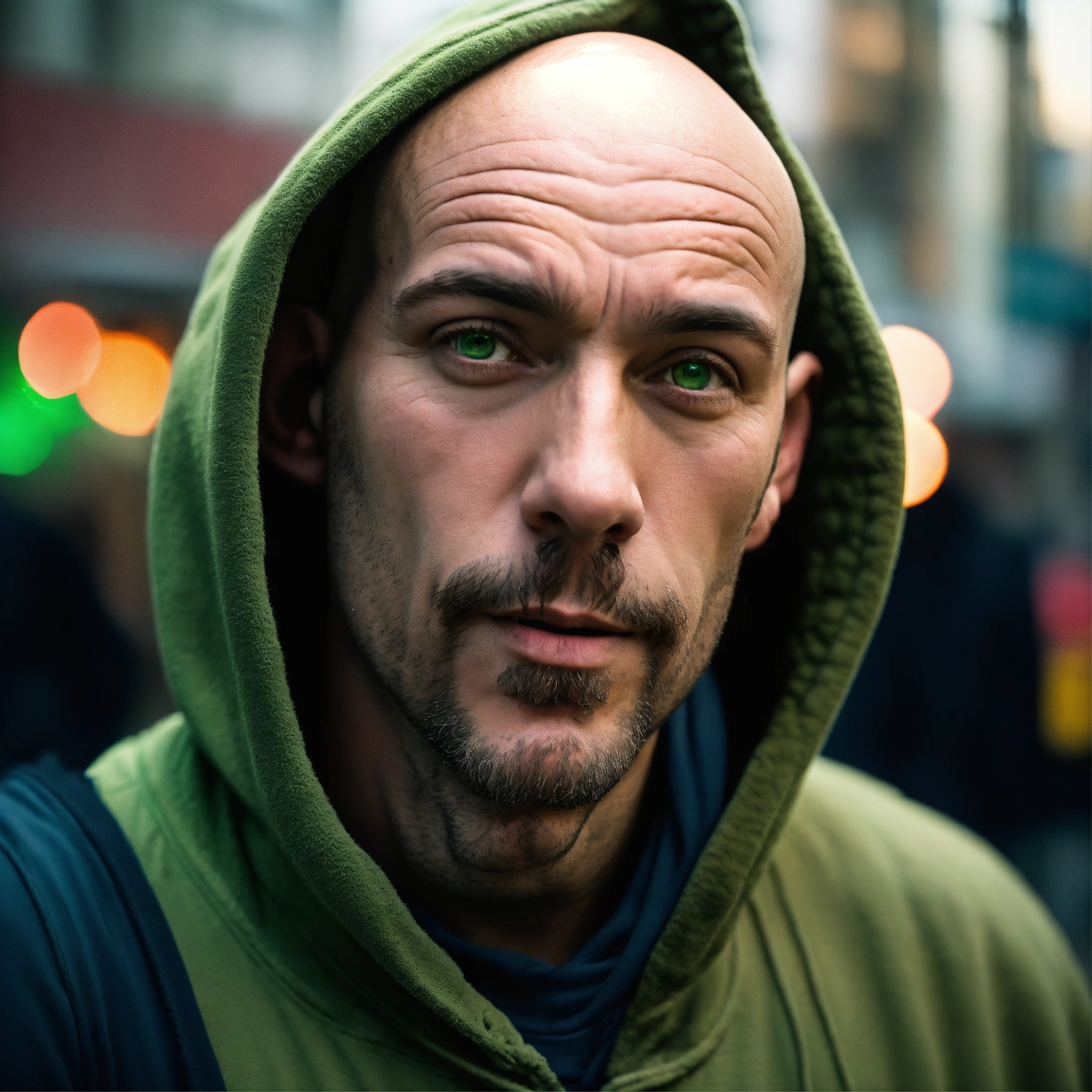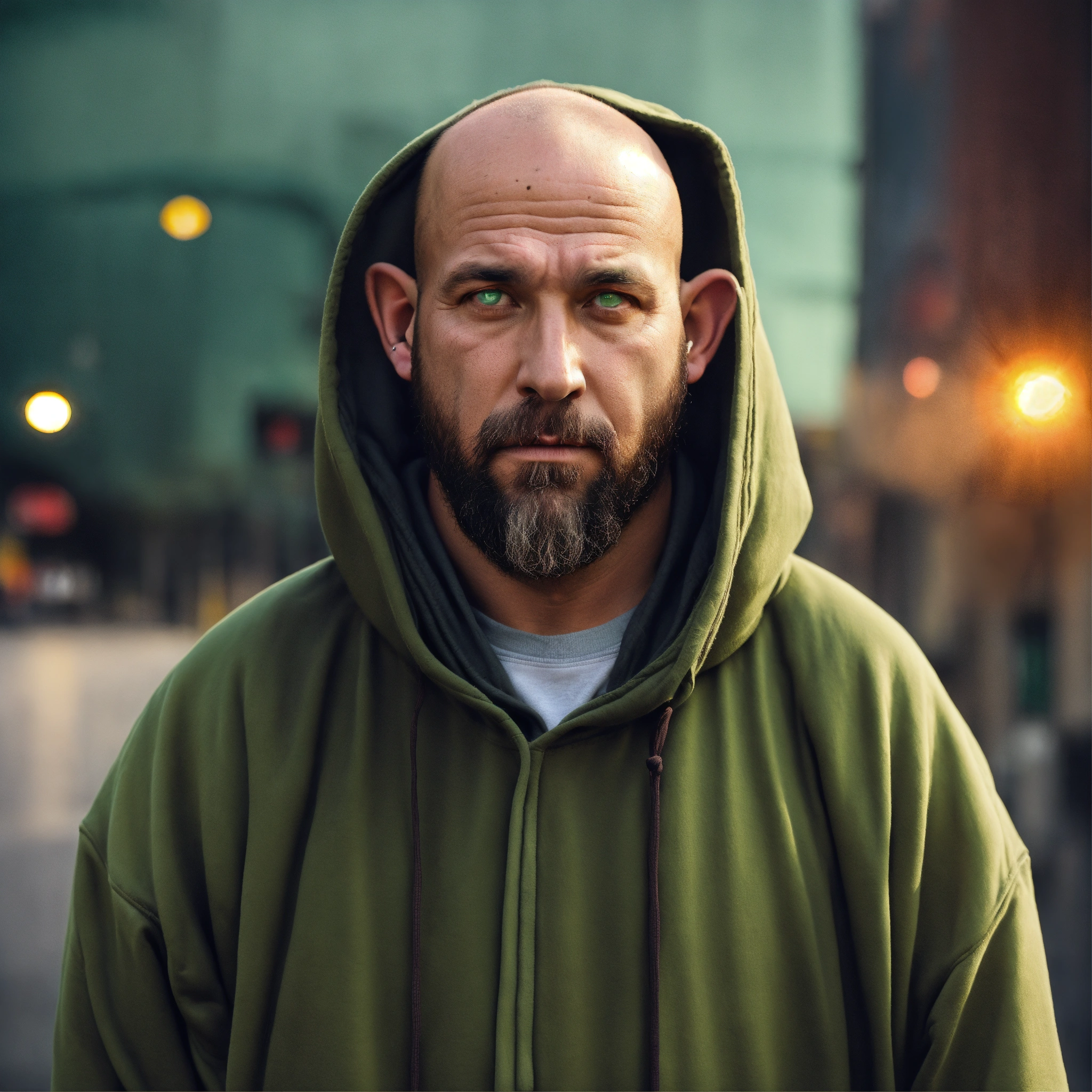 A homeless huge man with a huge lumpy bald head, a tiny goatee, protruding forehead, sunken light gray green eyes, crooked mouth, large ears, wearing a hoodie up over his head, standing in the street
