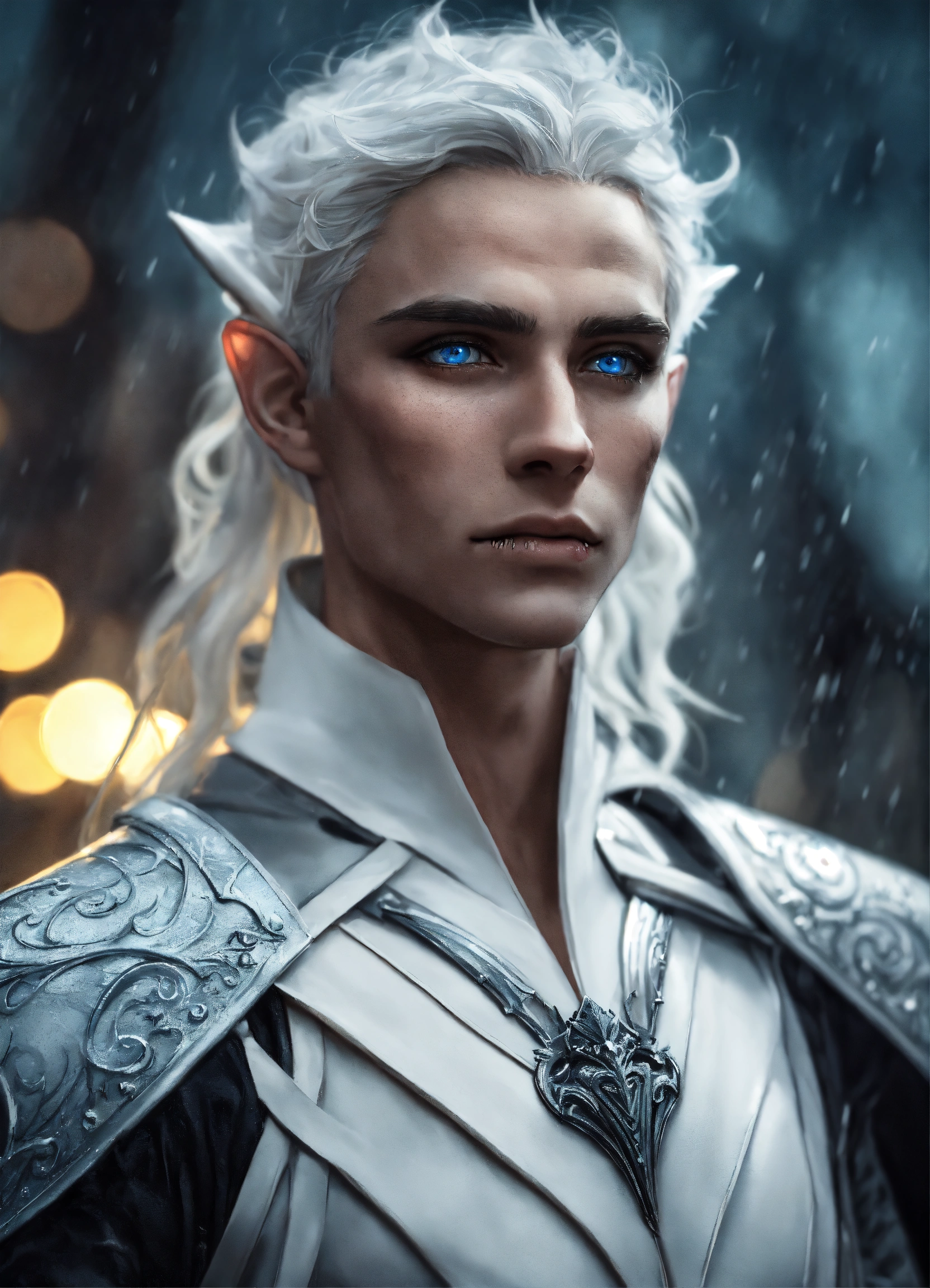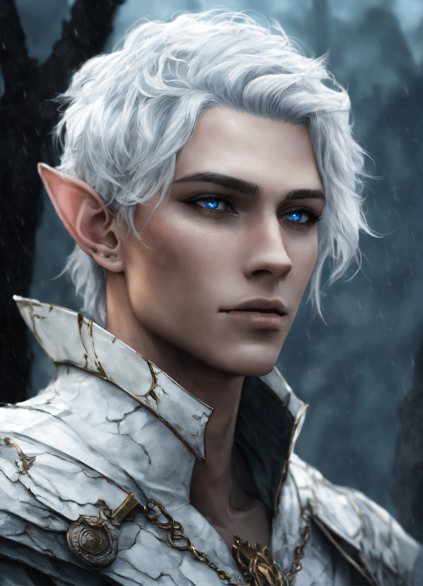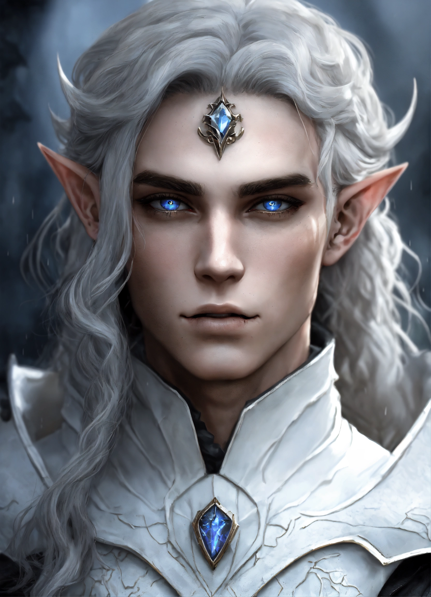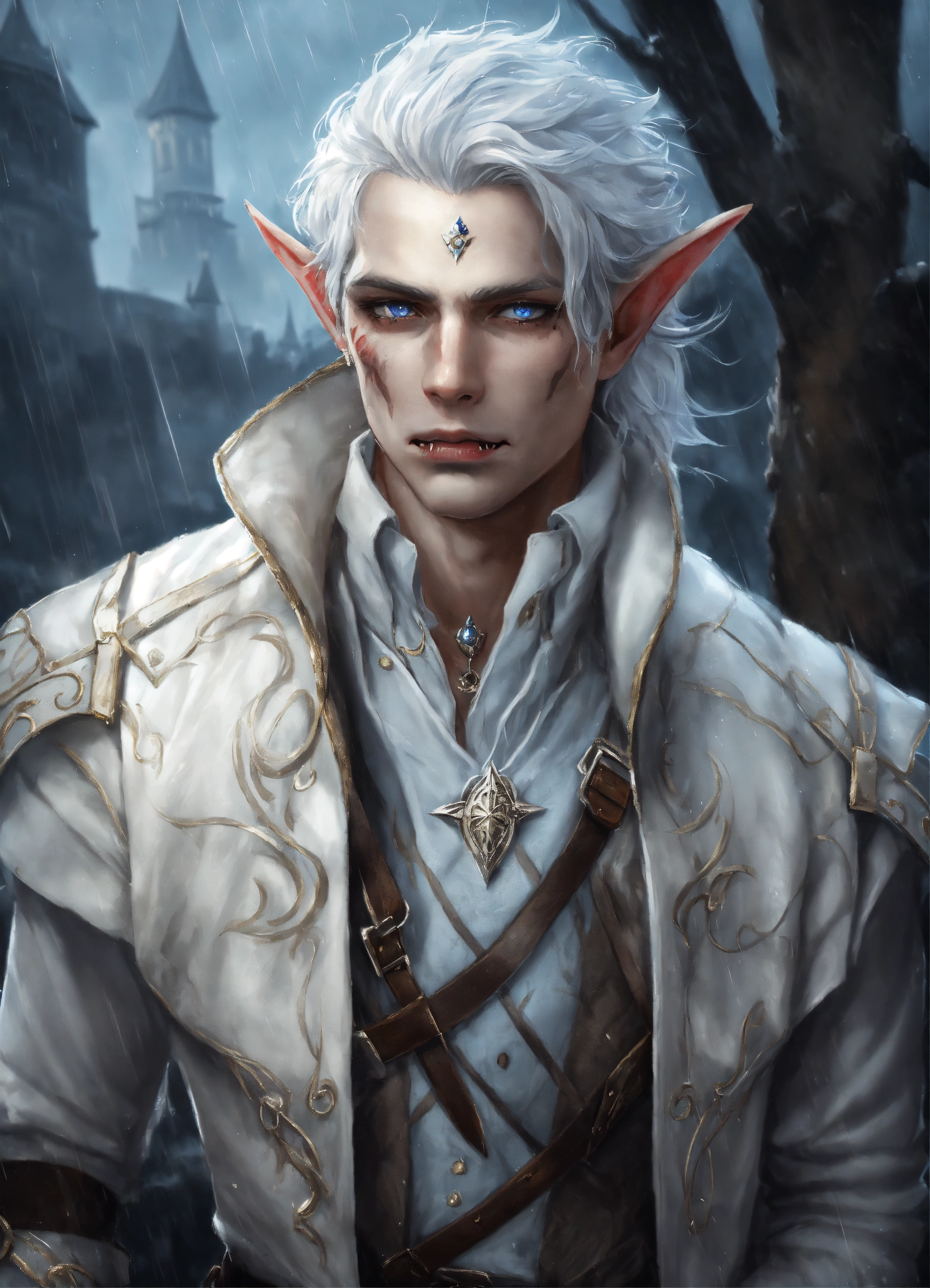 Fantasy portrait of a ash-grey skinned elf, masculine, androgynous, white sorecerer, white rogue clothes, white leather, large black facial scars, broken face, pale blue eyes, sharp features, sad expression, fangs, soft smile, glowing white curly hair, rainy castle background, ultra detailed