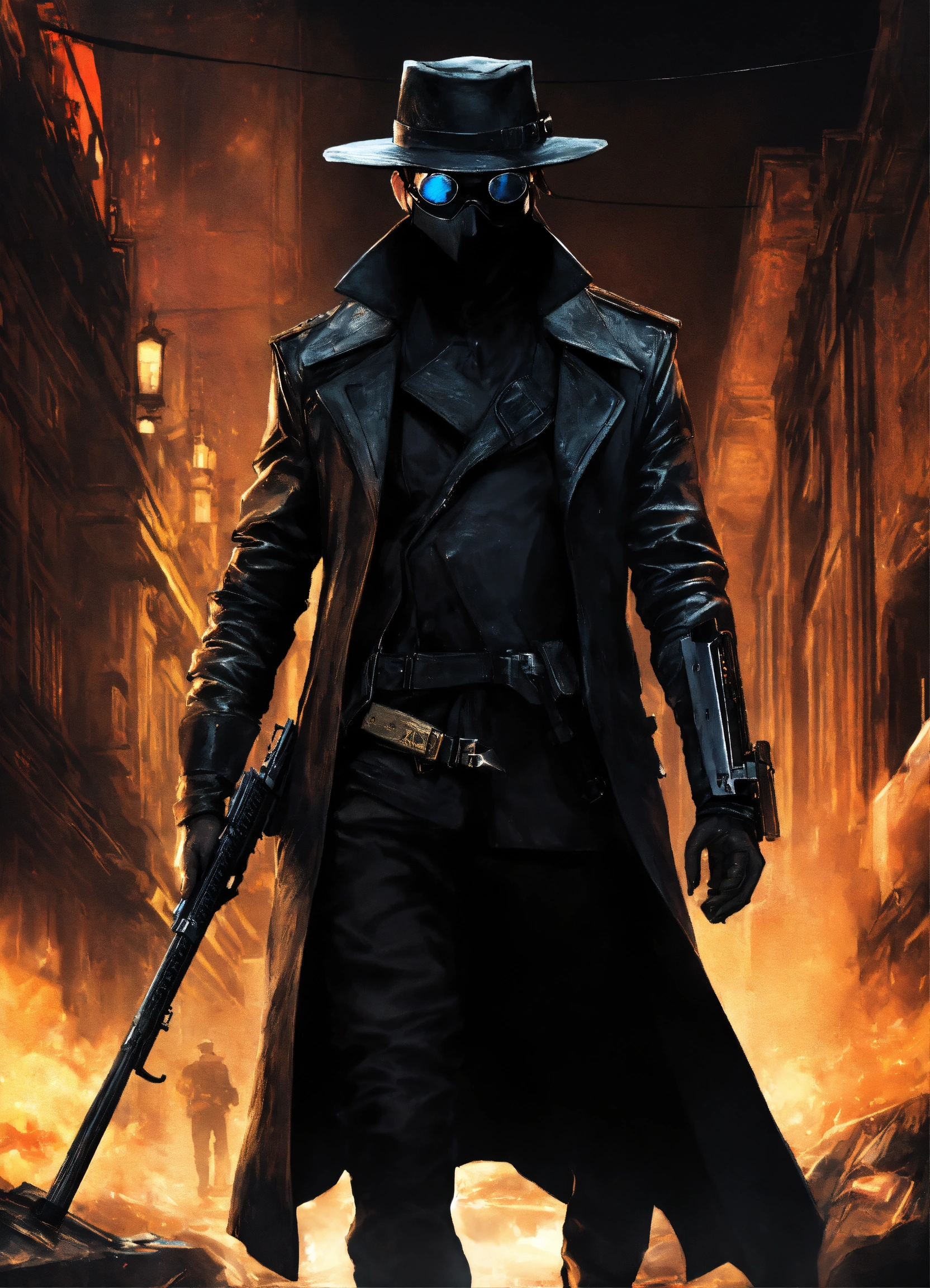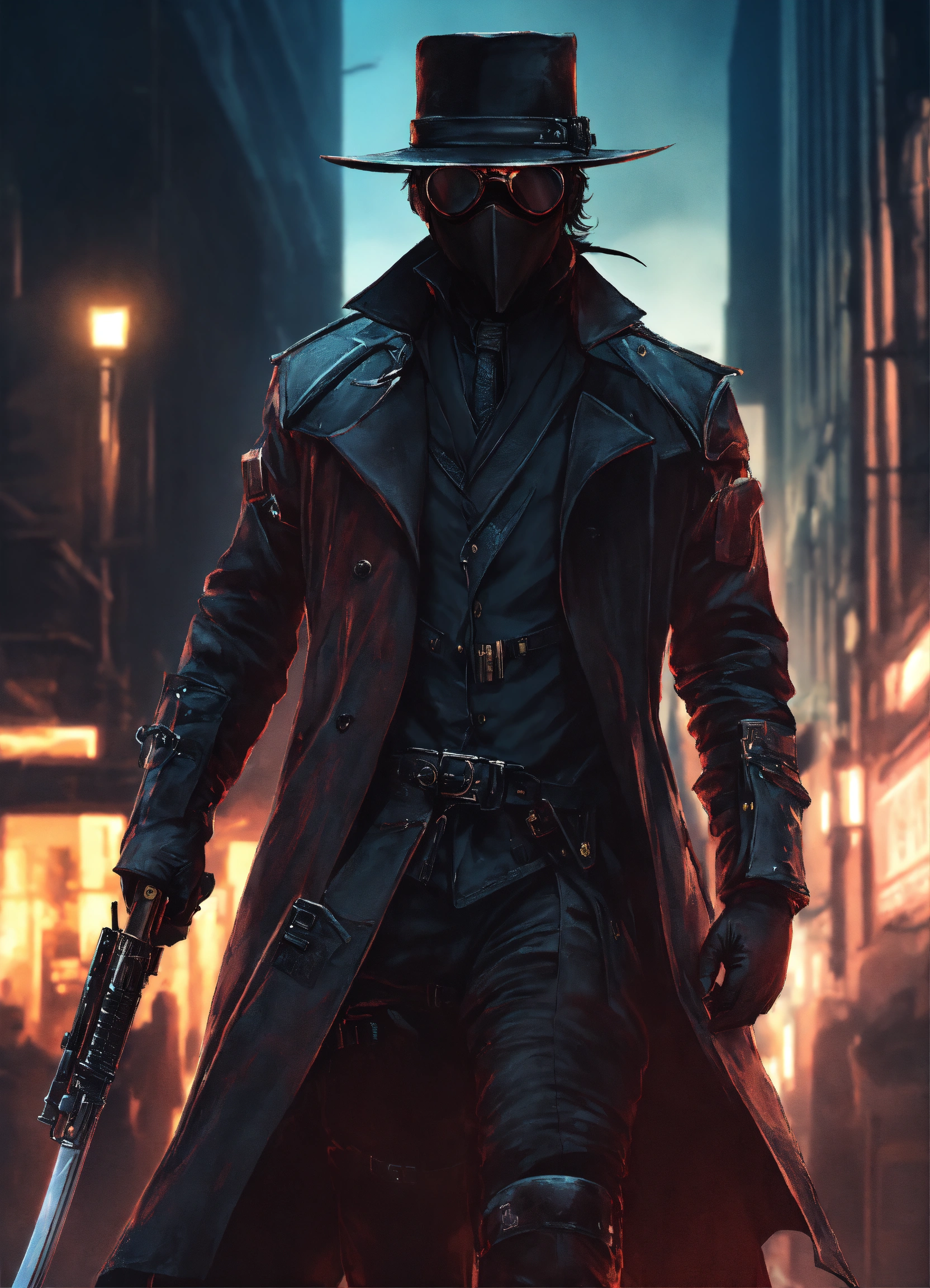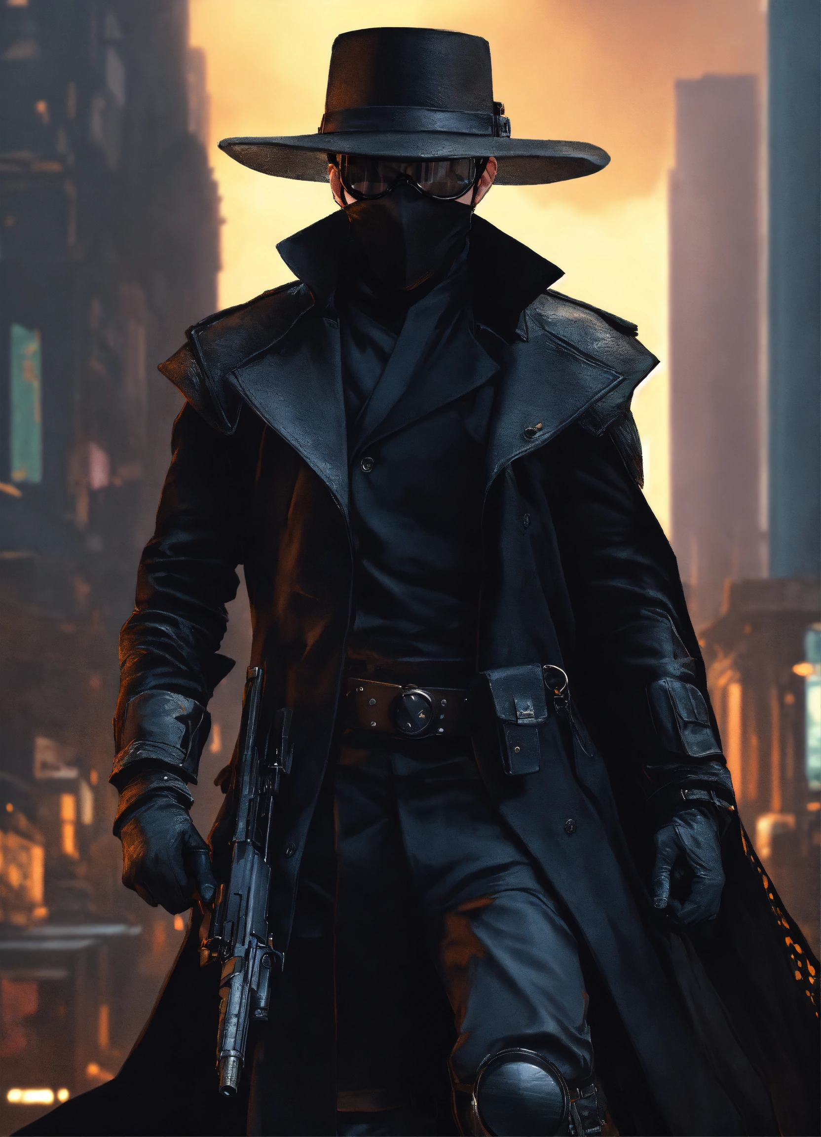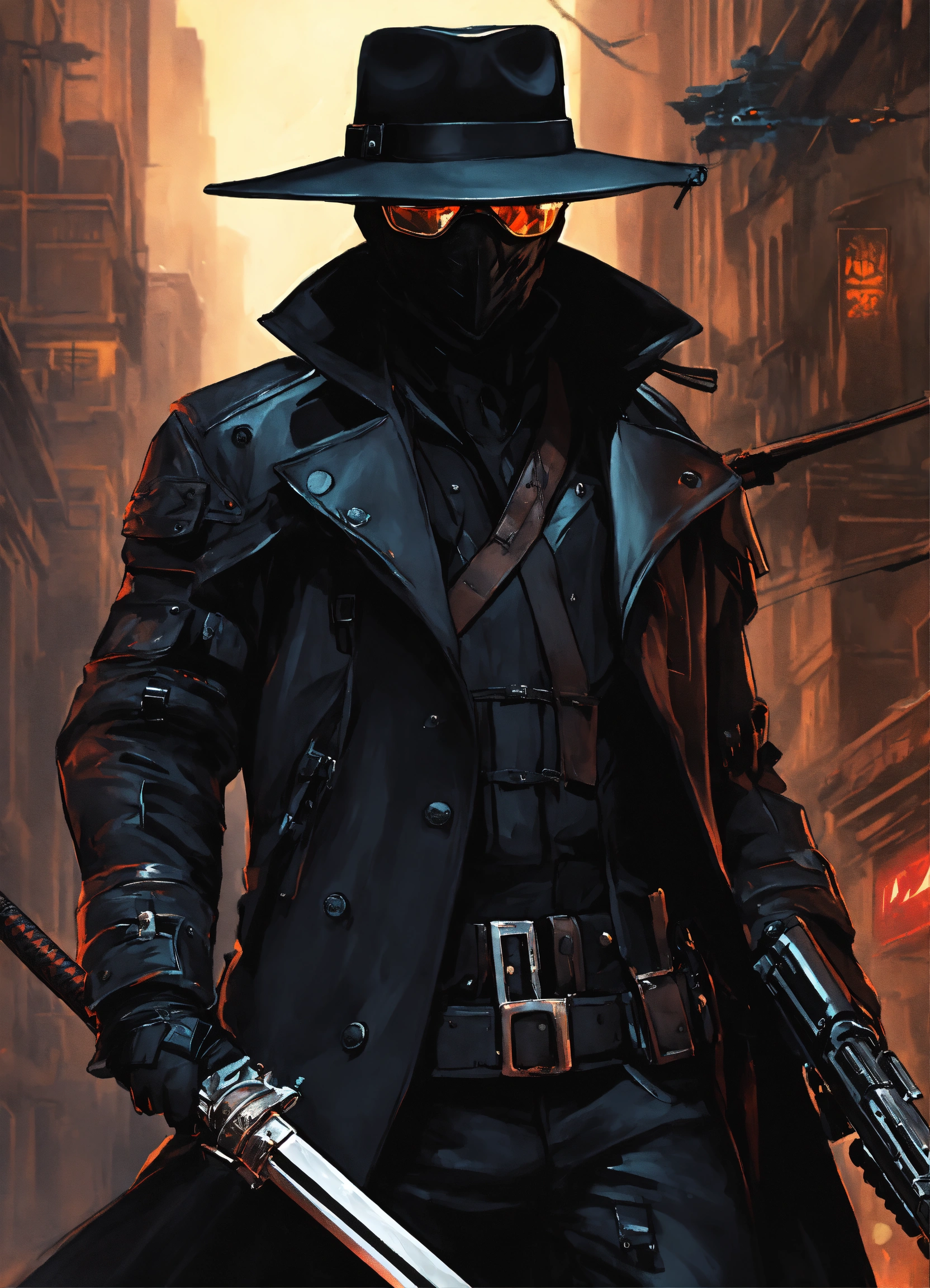 In a dystopian cityscape, a silent slayer in an black armored back leather trenchcoat with mantled shoulders wearing a black stetson hat and a black leather face mask with dark glasses over his eyes. the buttstock of a katana sticks up behind his right shoulder. in his hand he carries a pistol with a thermal vision goggles on a rail.