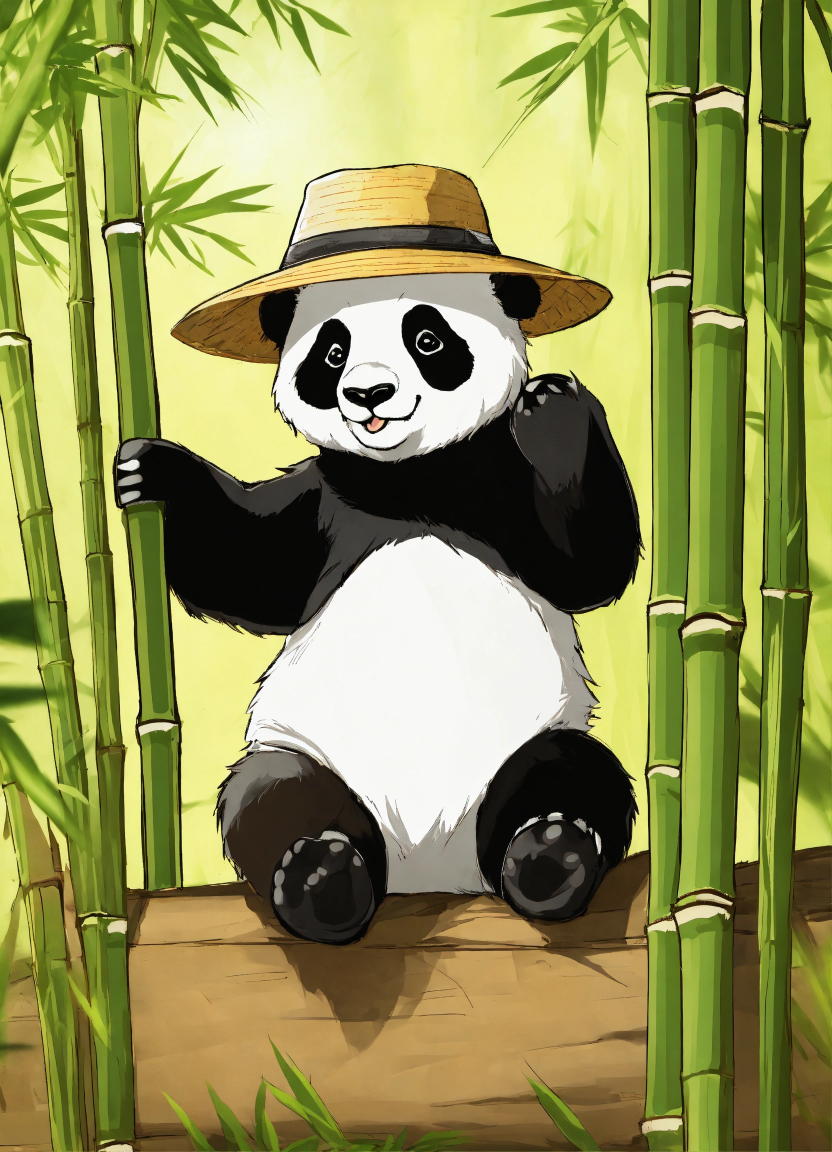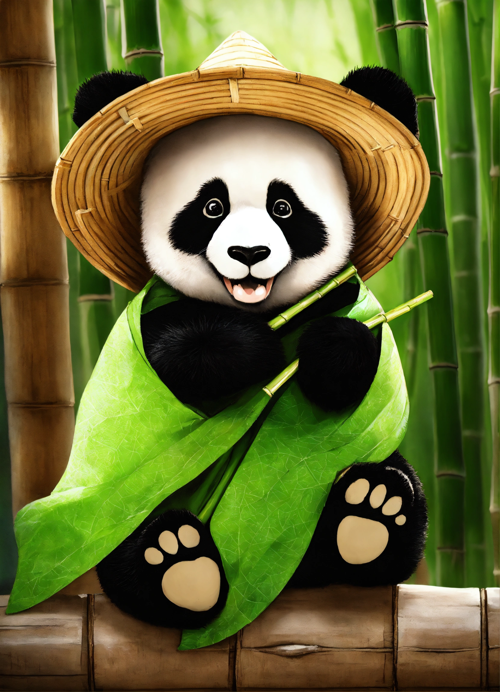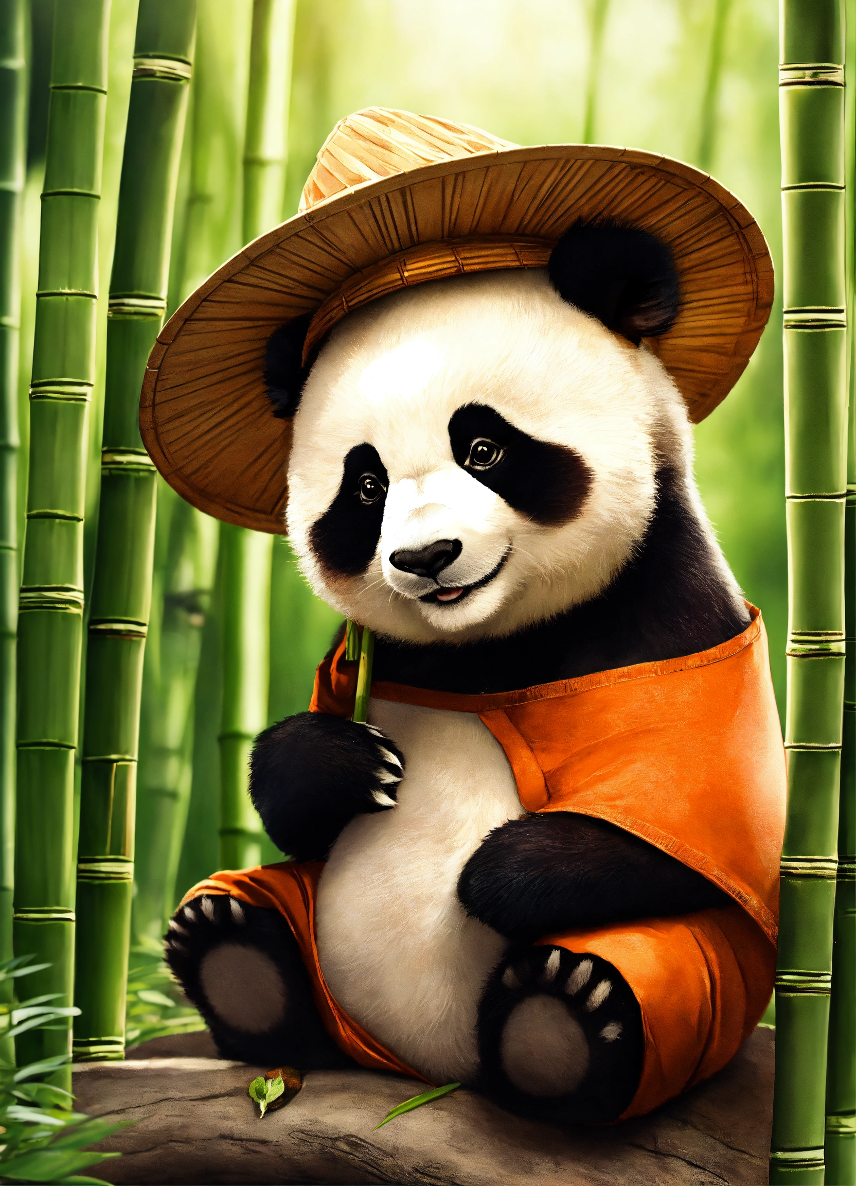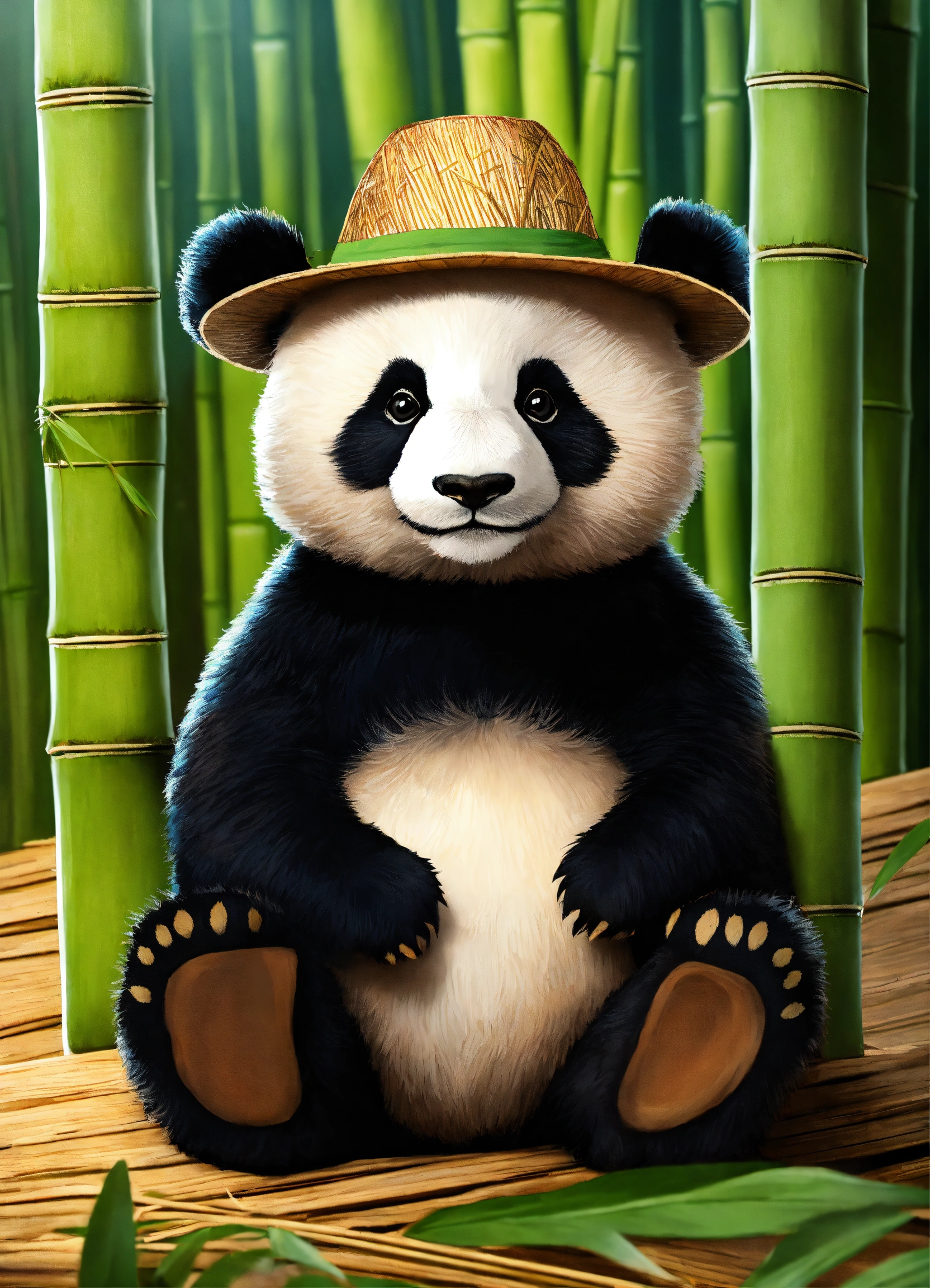 A cute panda in bamboo wearing a hat