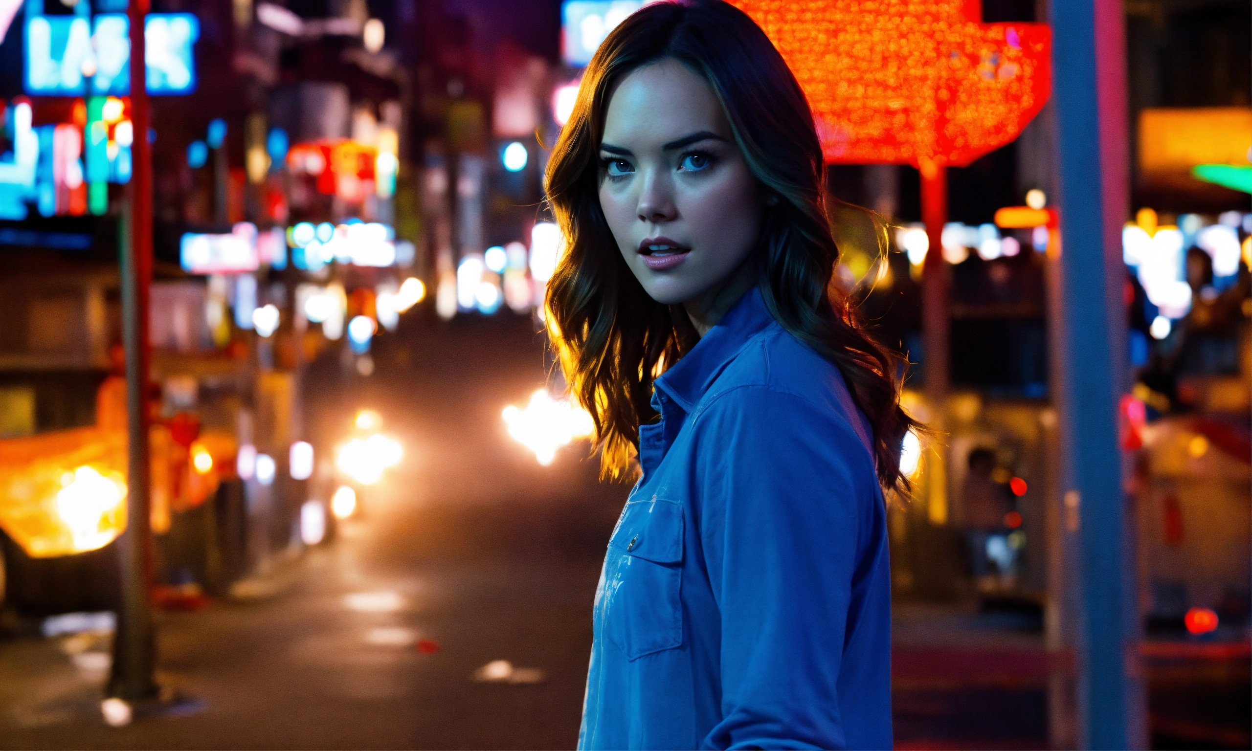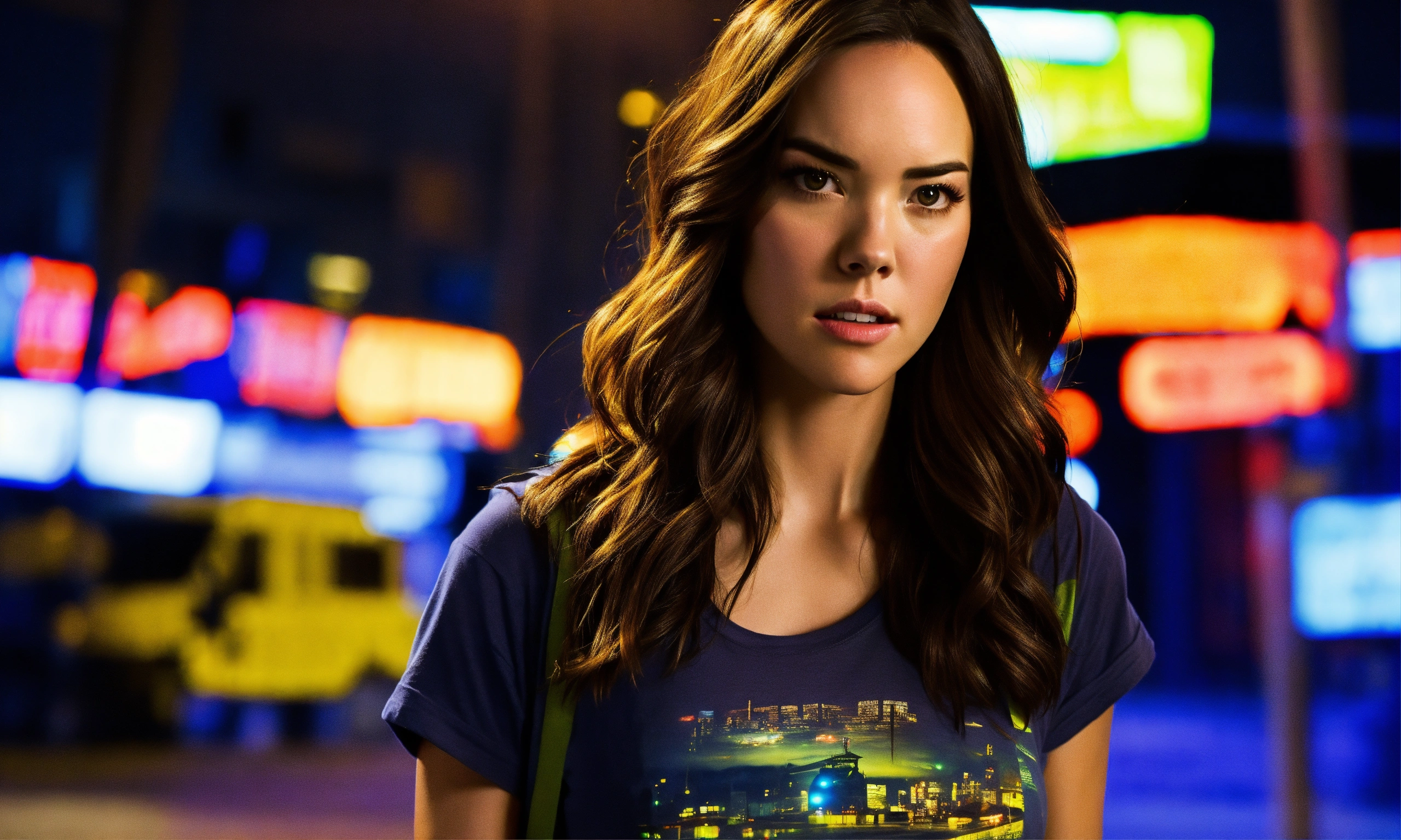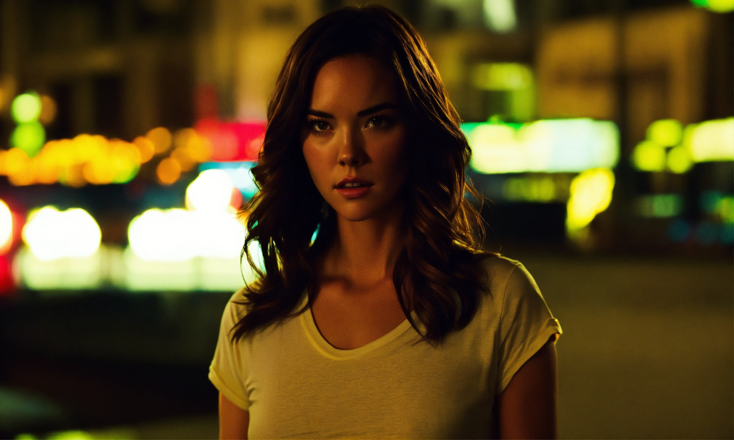 Beautiful odette annable, big eyes with chestnut hair, walk, thriller style, danger, detective story, scared, night, cinematic, neon, t-shirt