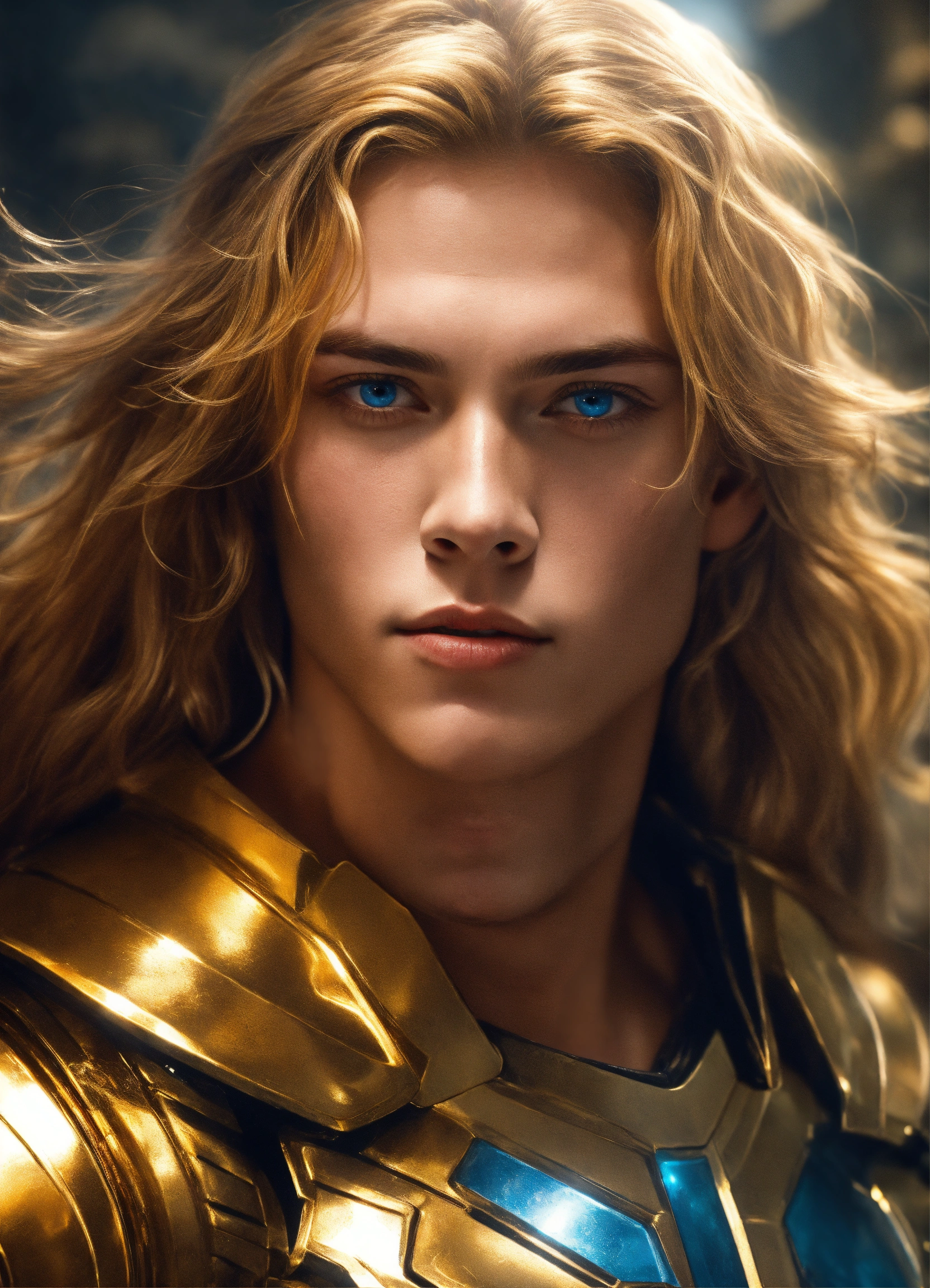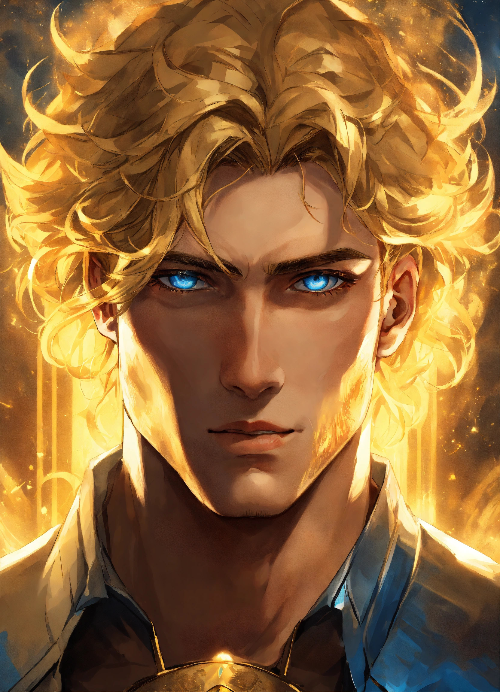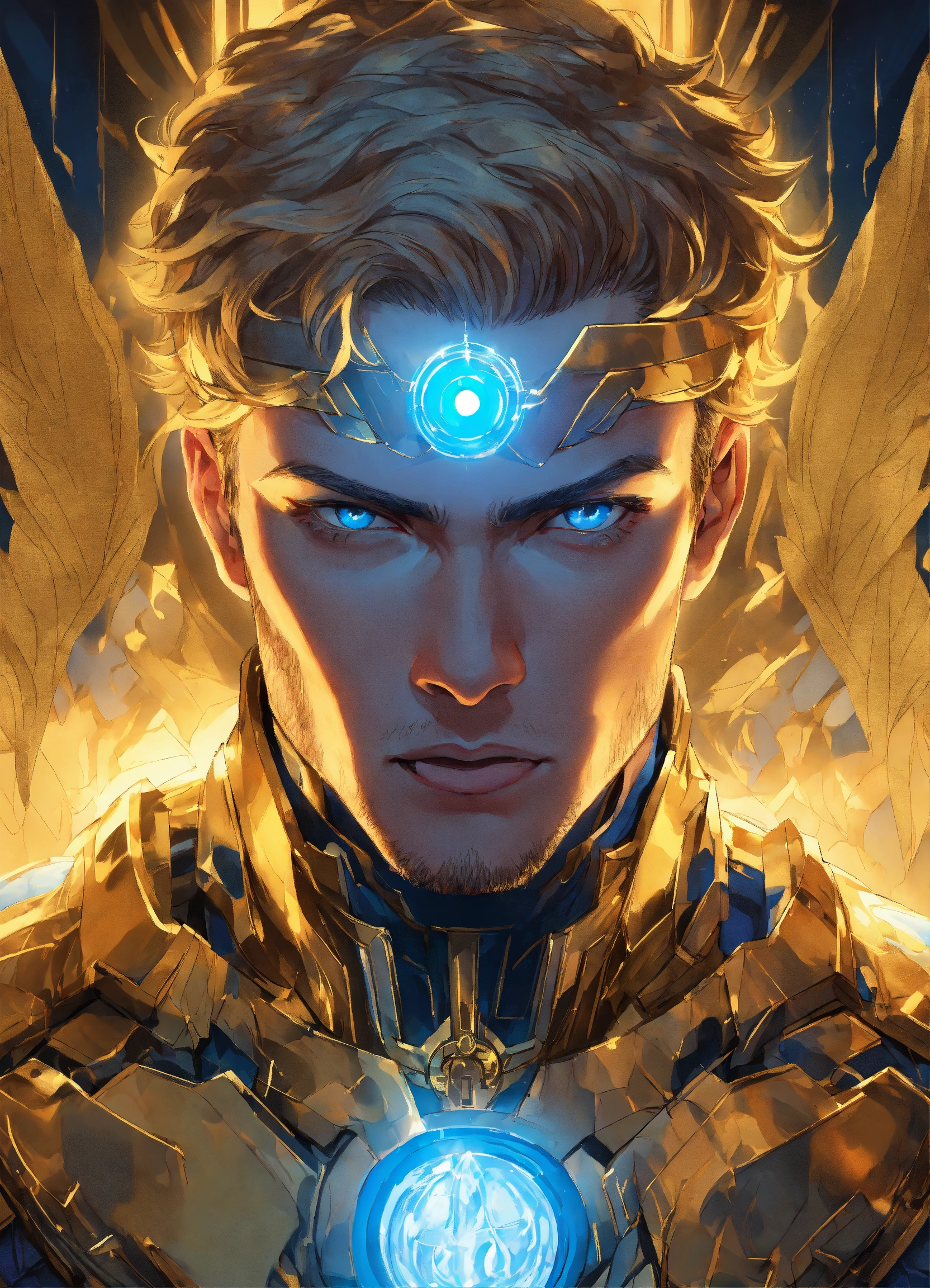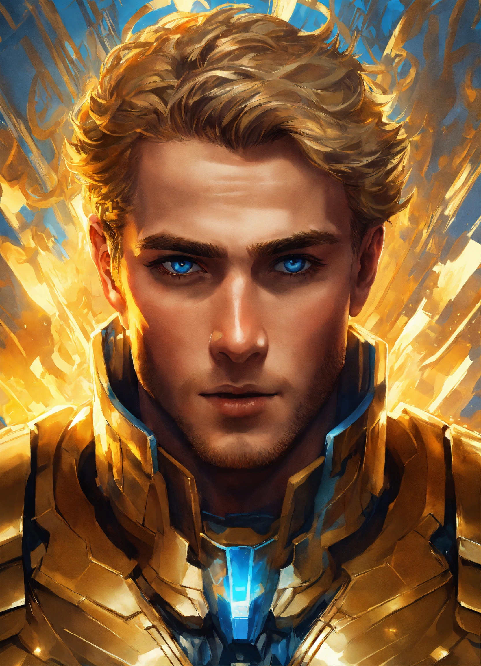 Mighty god . muscular short golden hair, shining blue eyes, his face iron from the millennia of life but still healthy and young, a halo over his head. black lines around the eyes