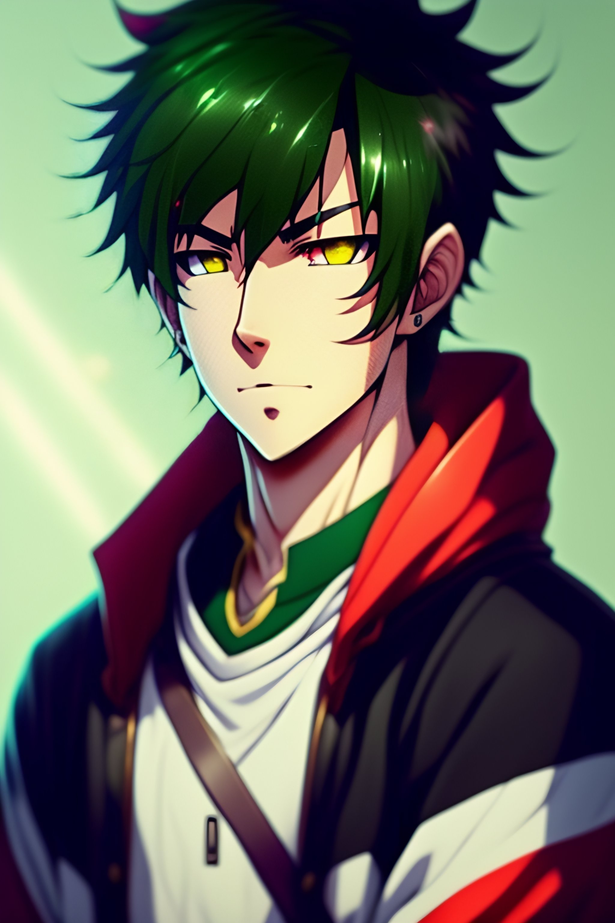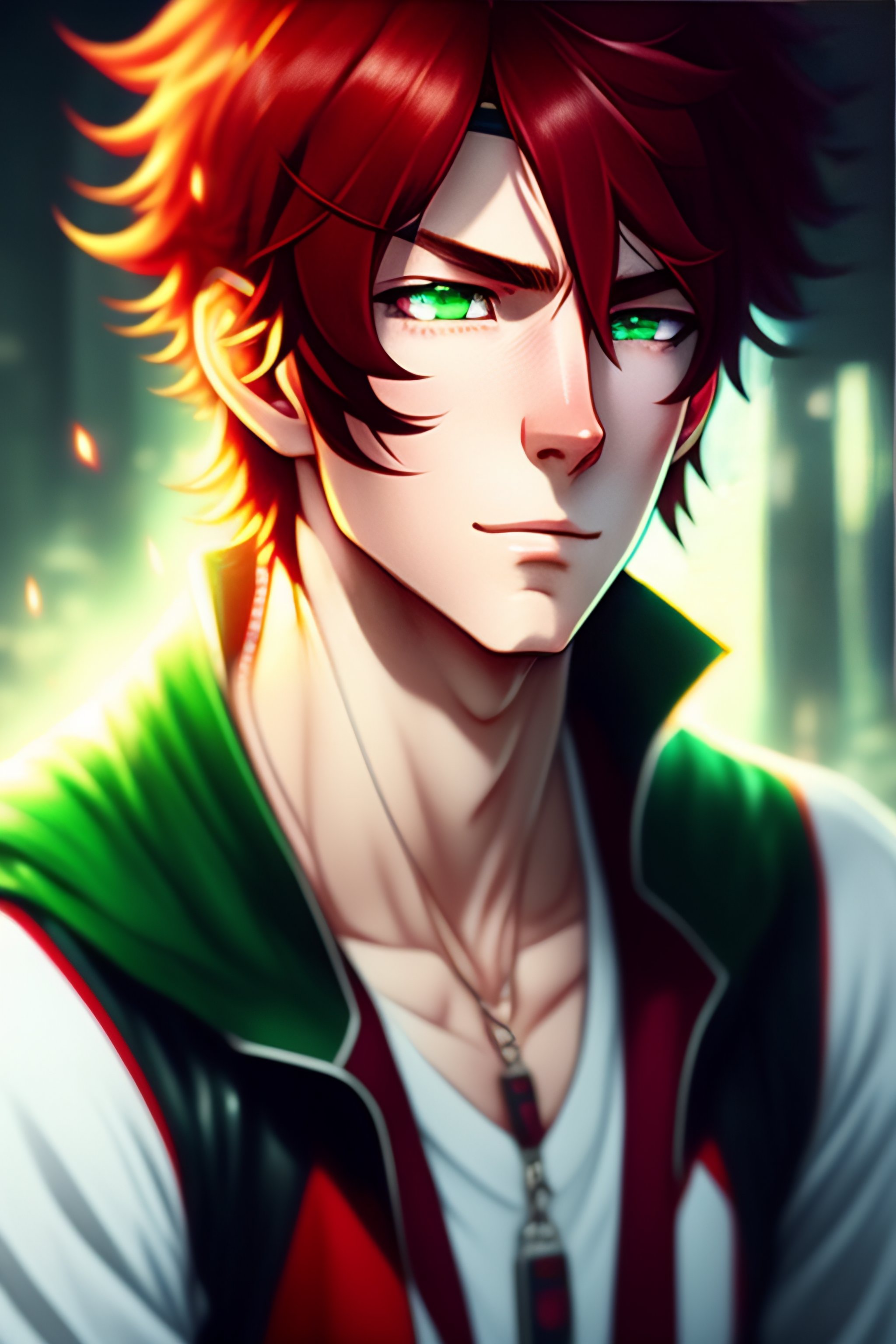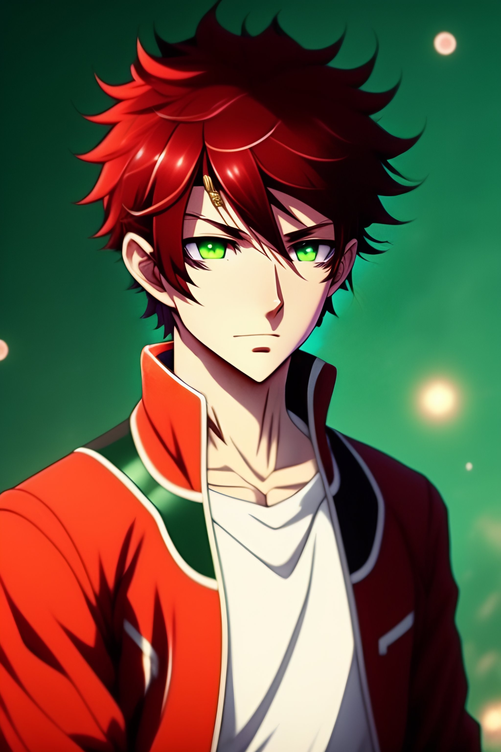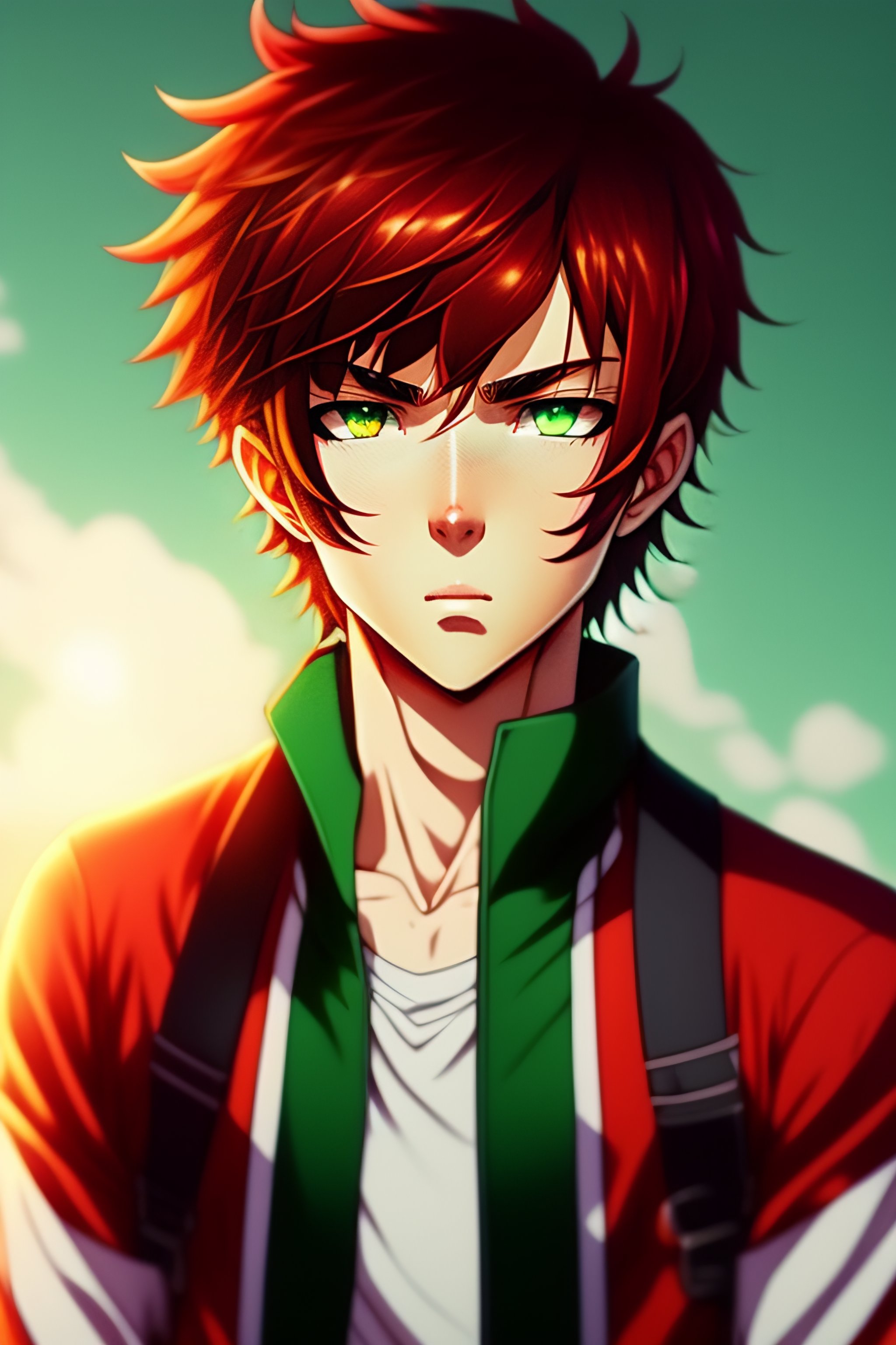 Green eyes slightly reddish hair white streaks in the hair red clothes with light white bands boy anime
