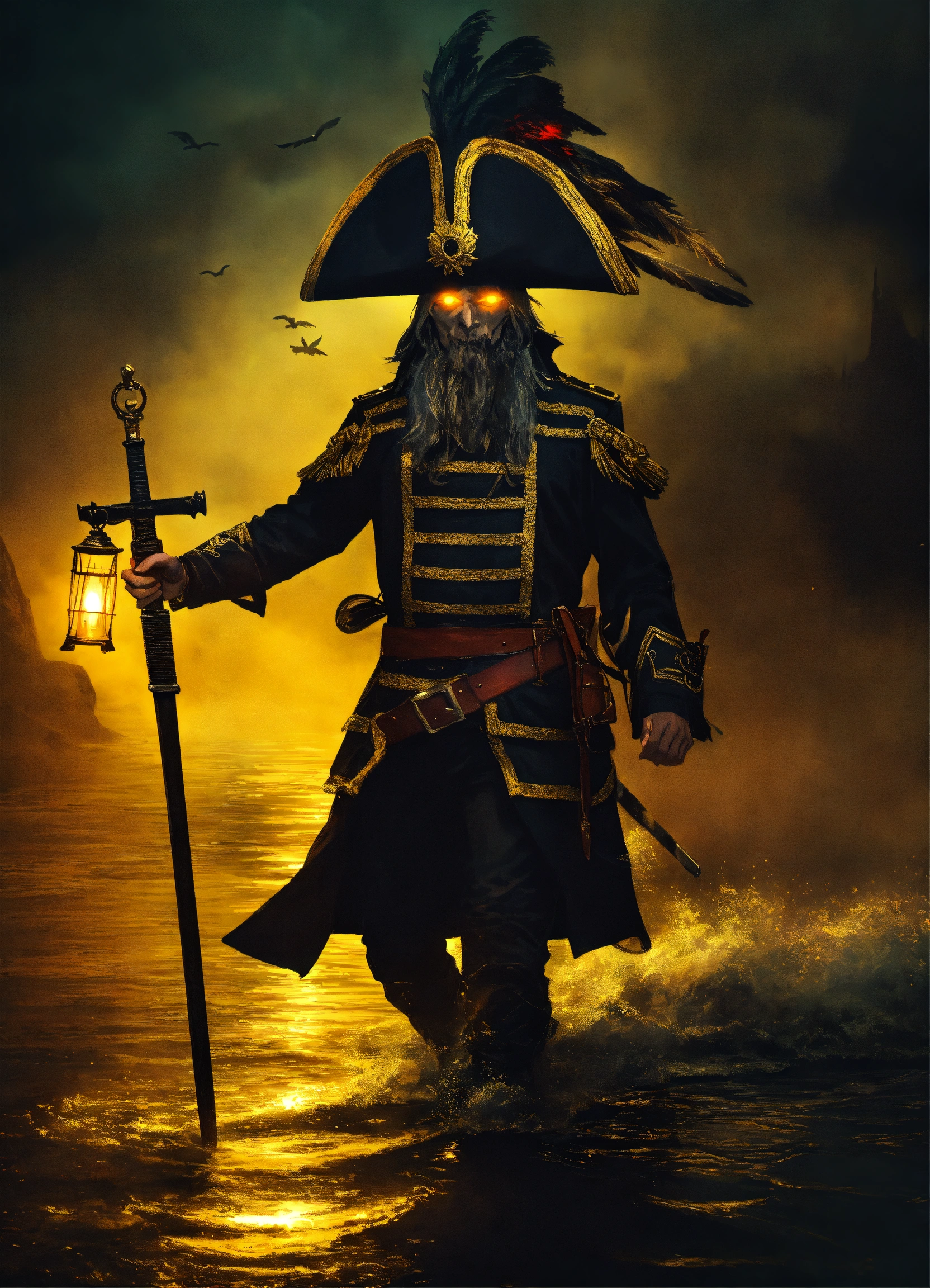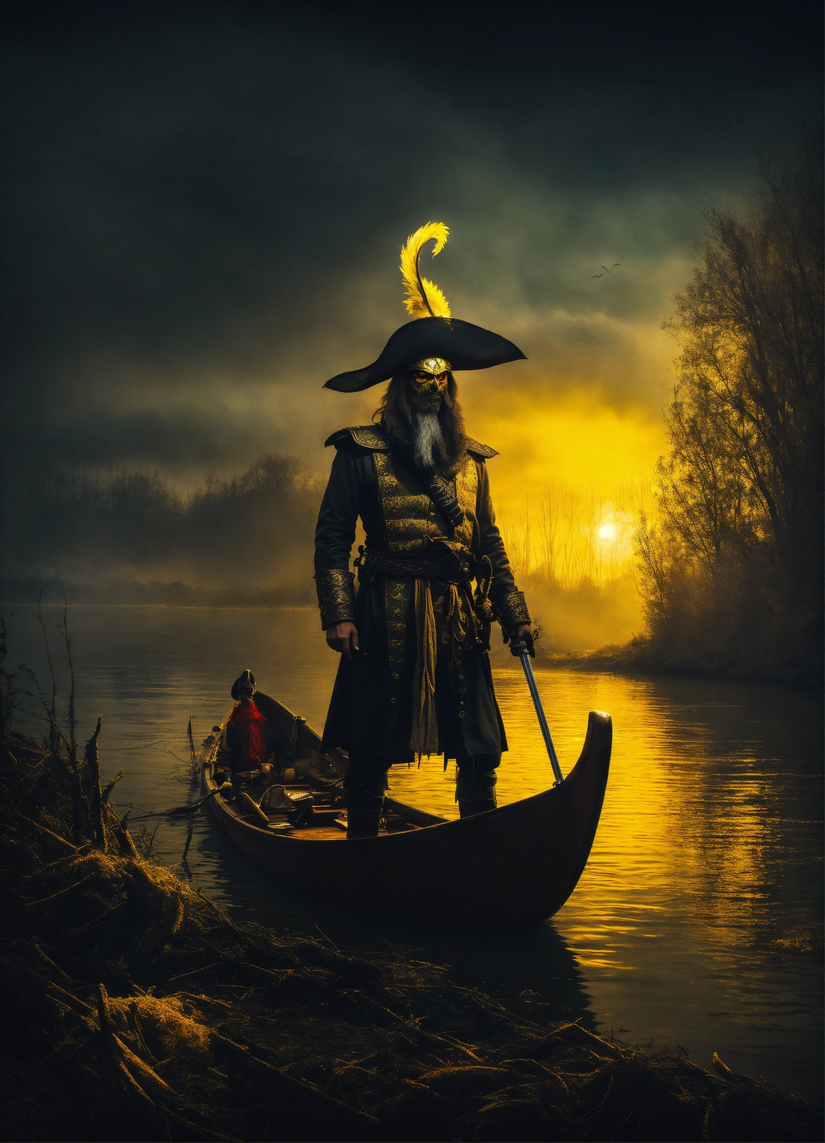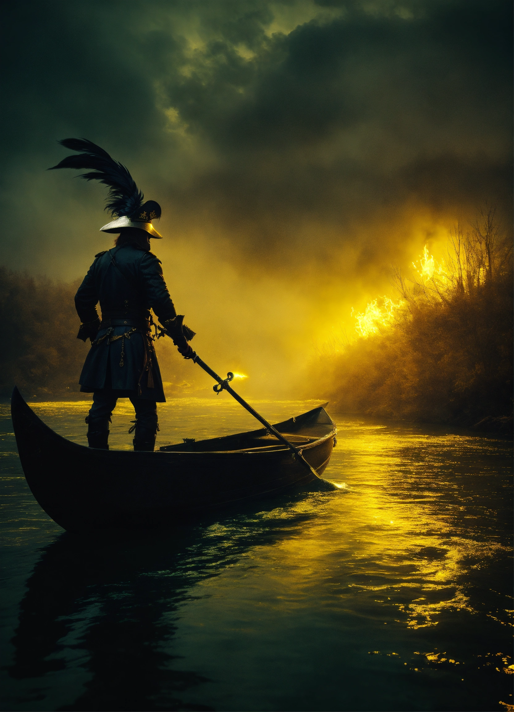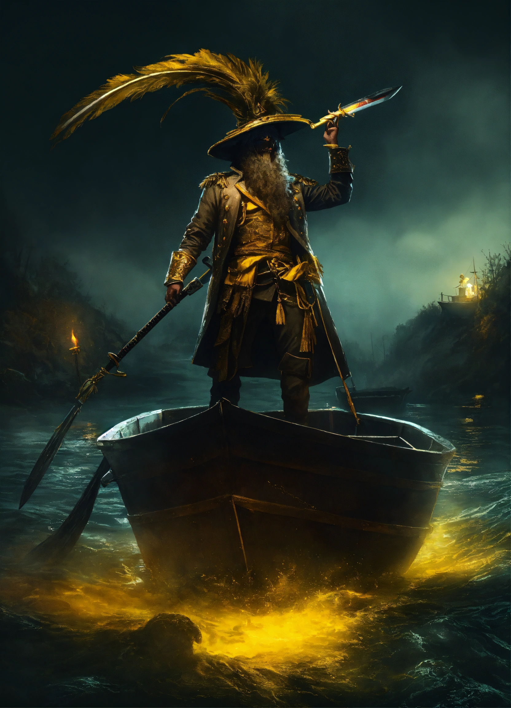 Dark and scary image of the river styx with a mysterious boatman with glowing yellow eyes wearing a feathered tricorne hat and a captains jacket blowing in the wind, holding a sword