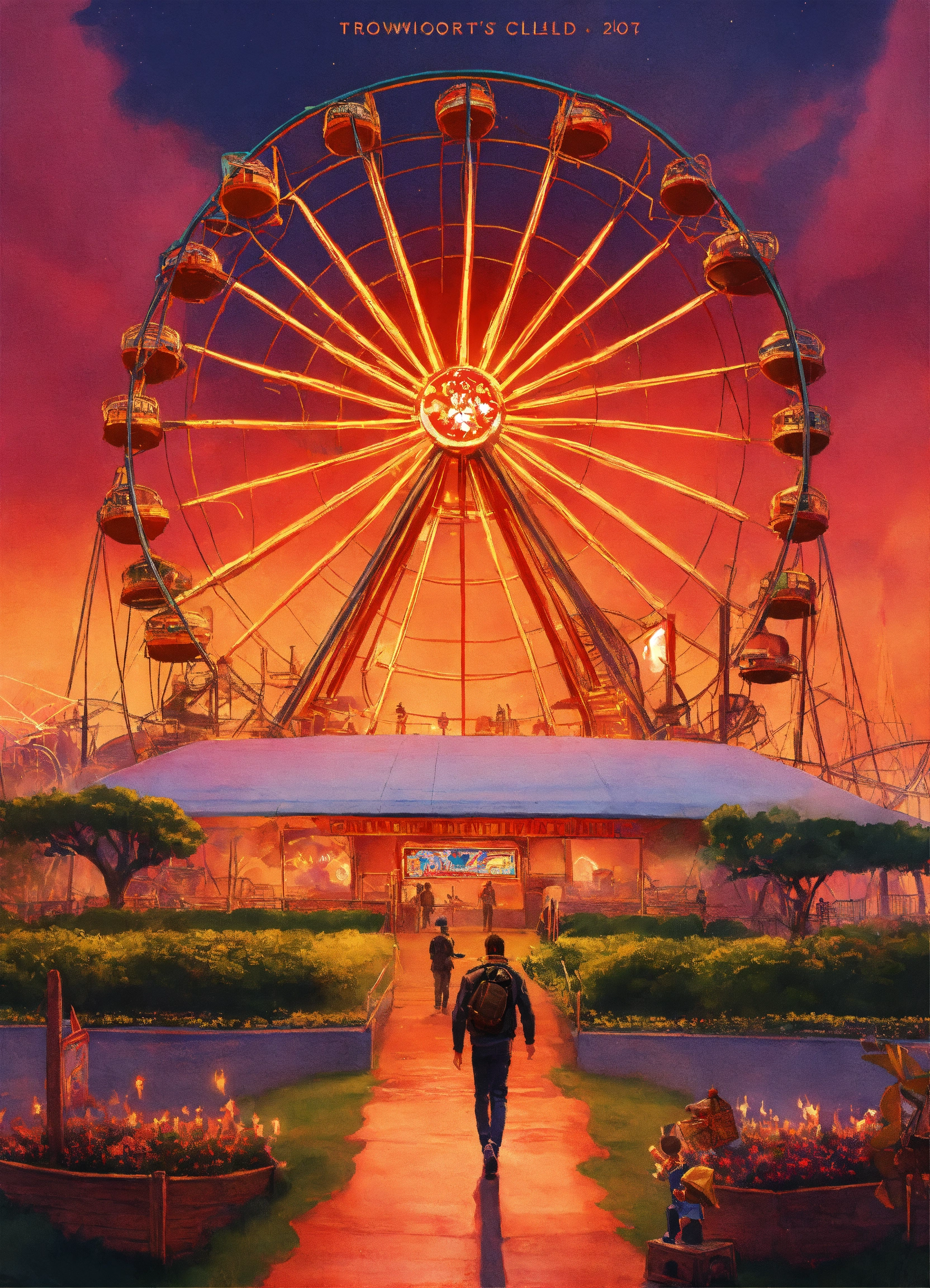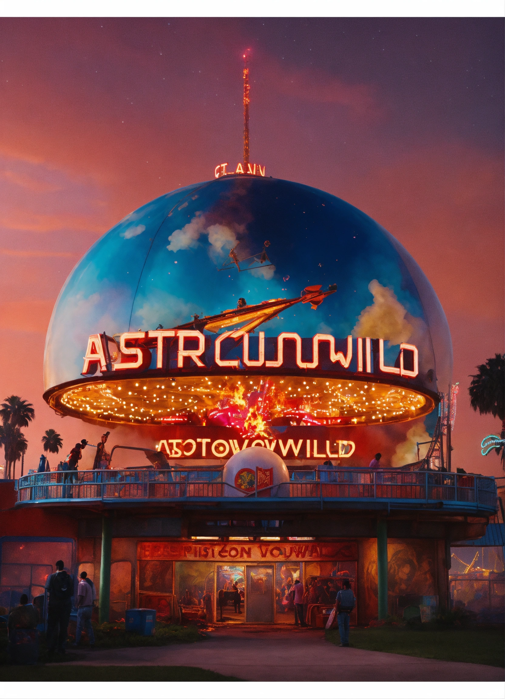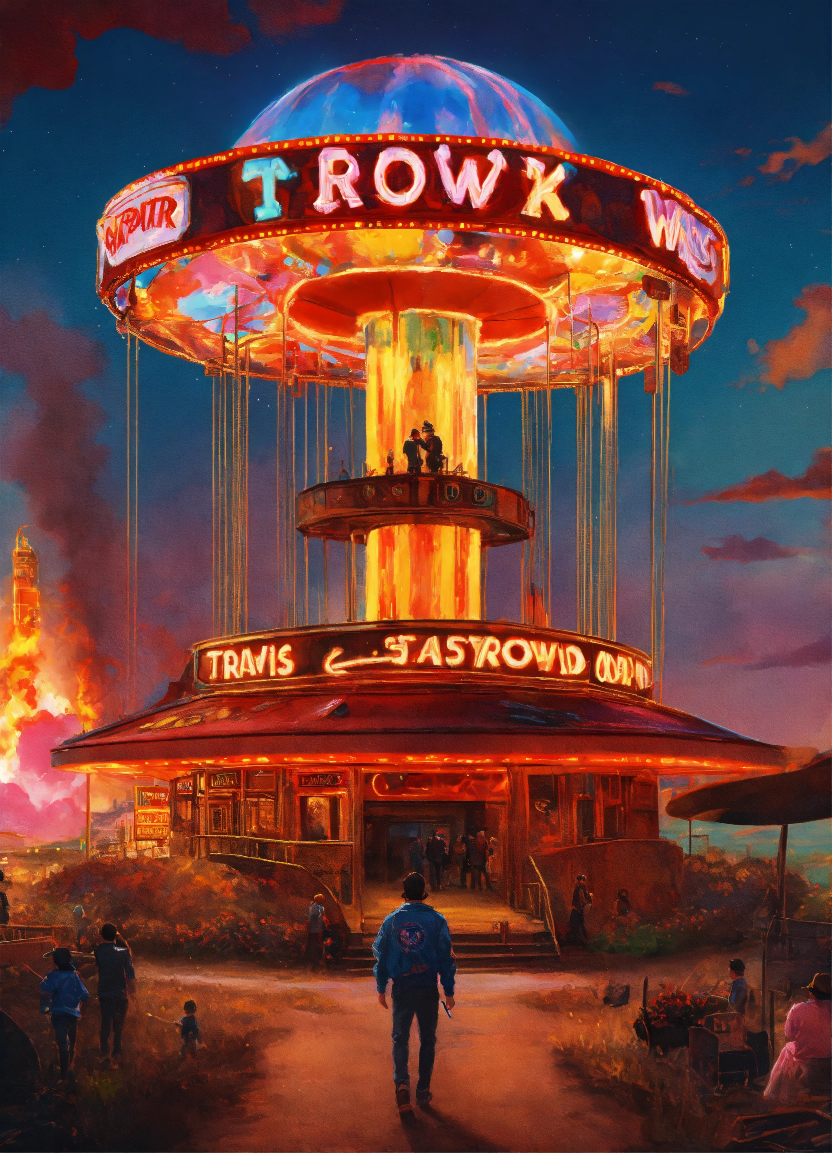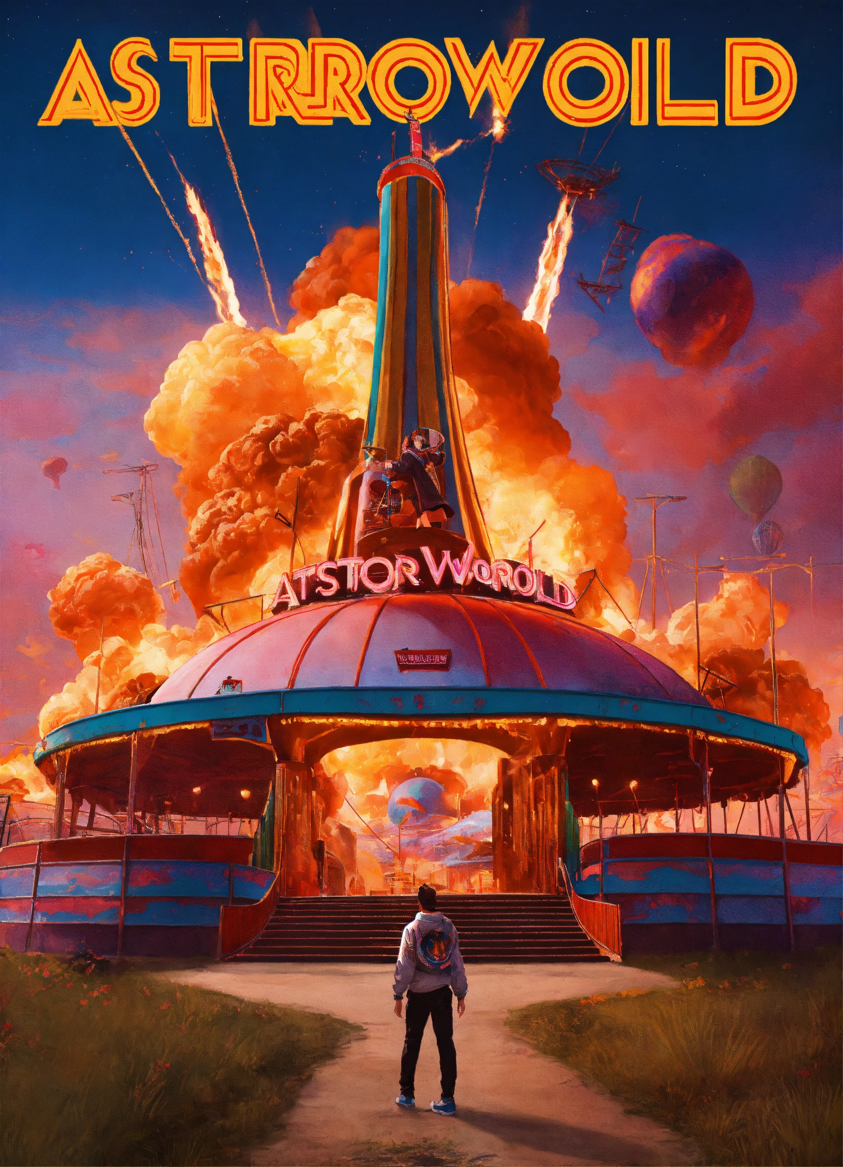 Travis scott's 'astroworld' is an album that pays homage to a theme park from his childhood. it explores themes of nostalgia, escapism, and the allure of fame. the album cover features a burning amusement park entrance, symbolizing the destruction of childhood dreams and the harsh reality of adulthood, i want you to put me travis closer in front keeping the same structure as in picture 1