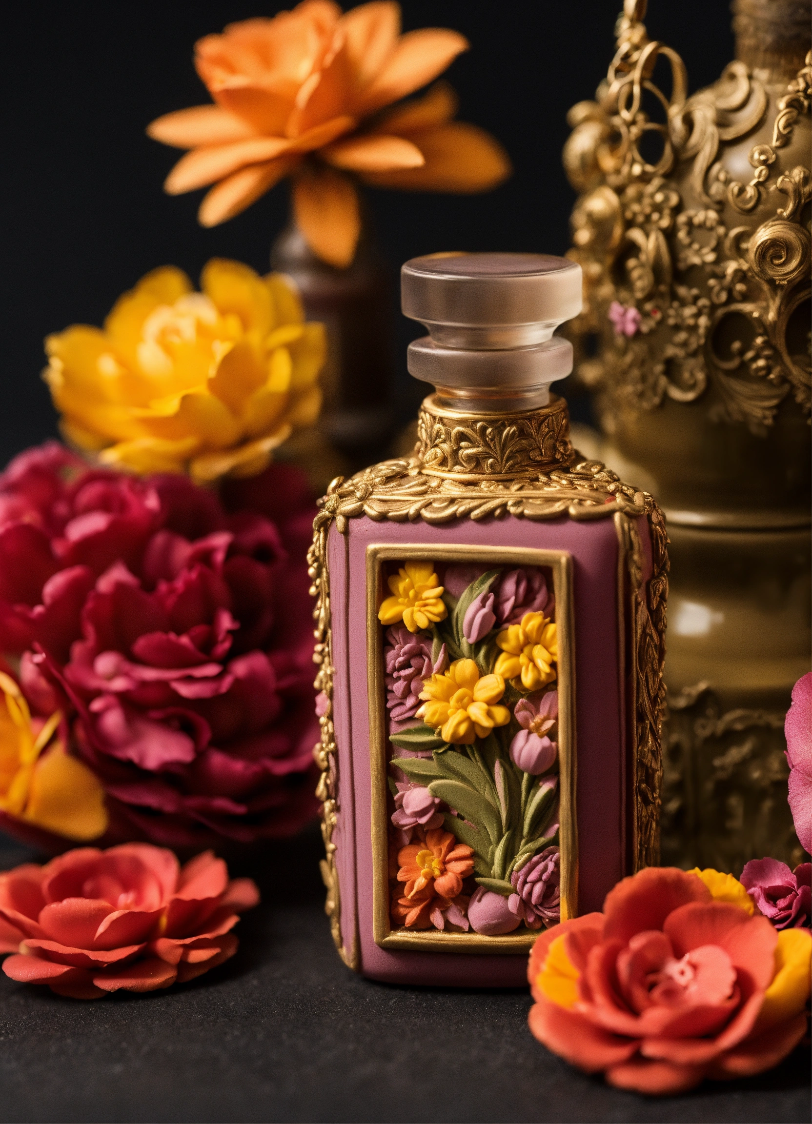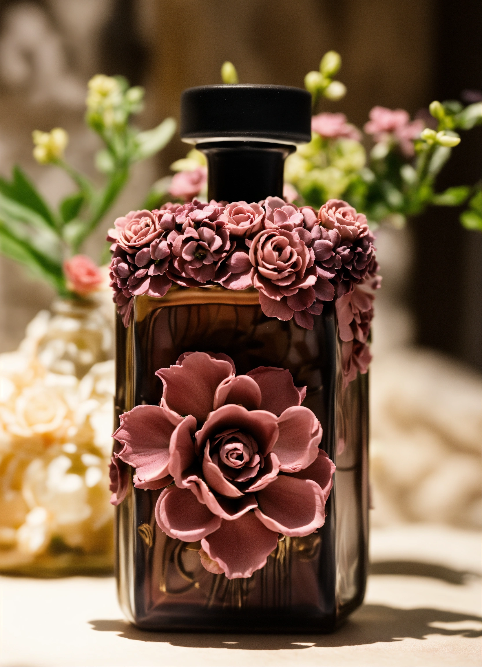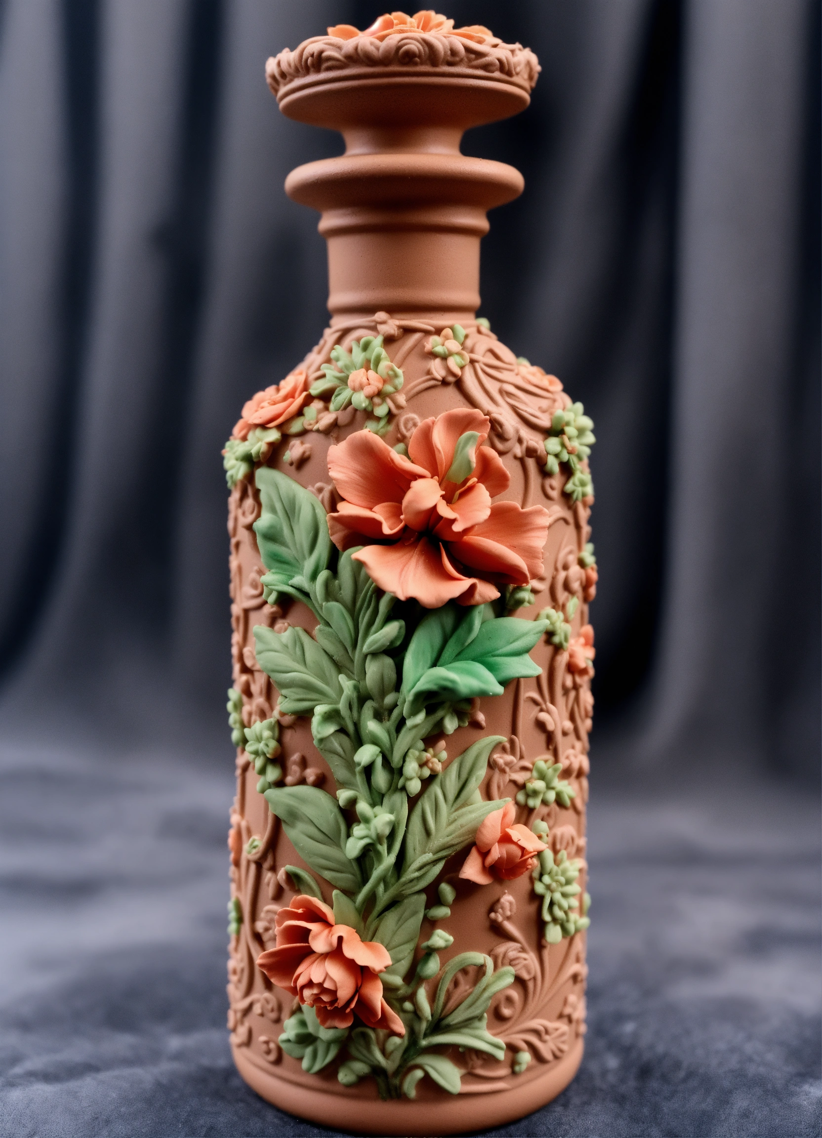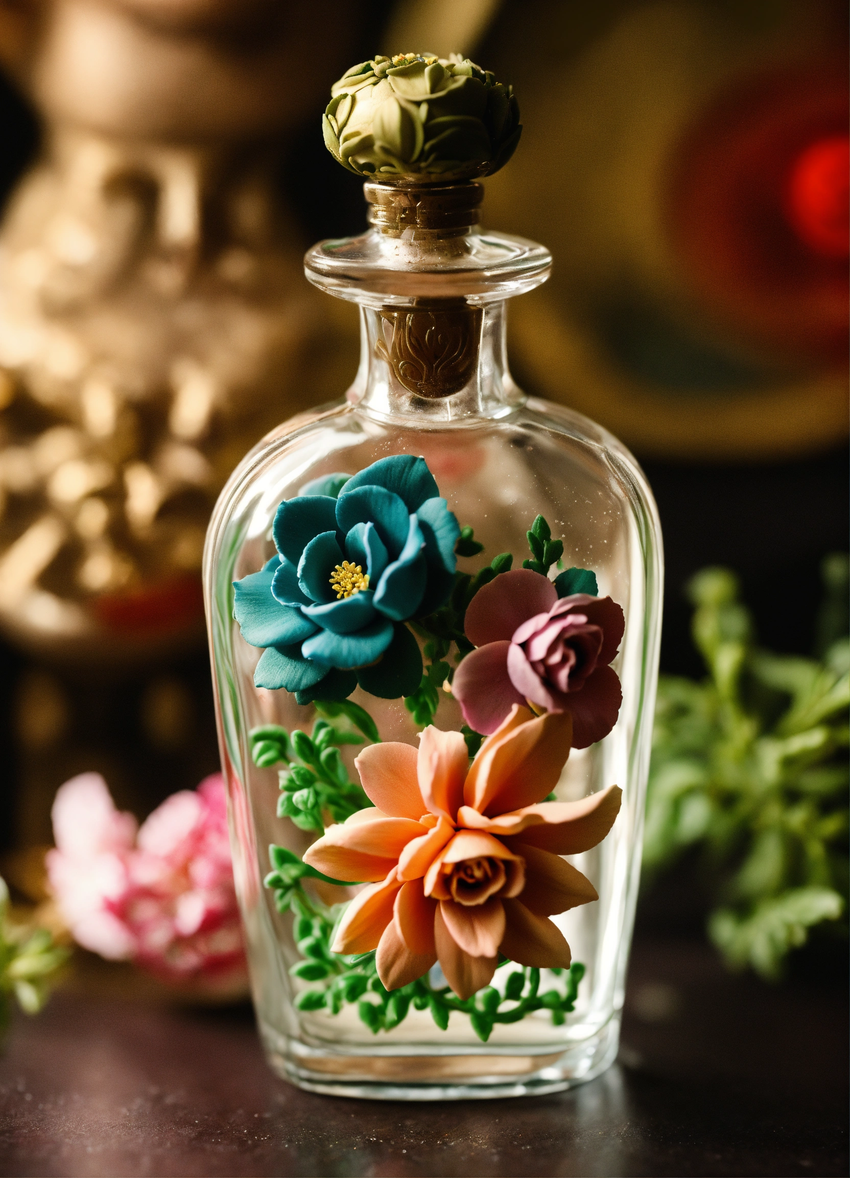 Hand-made modeling clay work. floral-inspired scent bottle, gallery art exposition, close up view on fragrance bottles, marquis de sade controverse writer universe