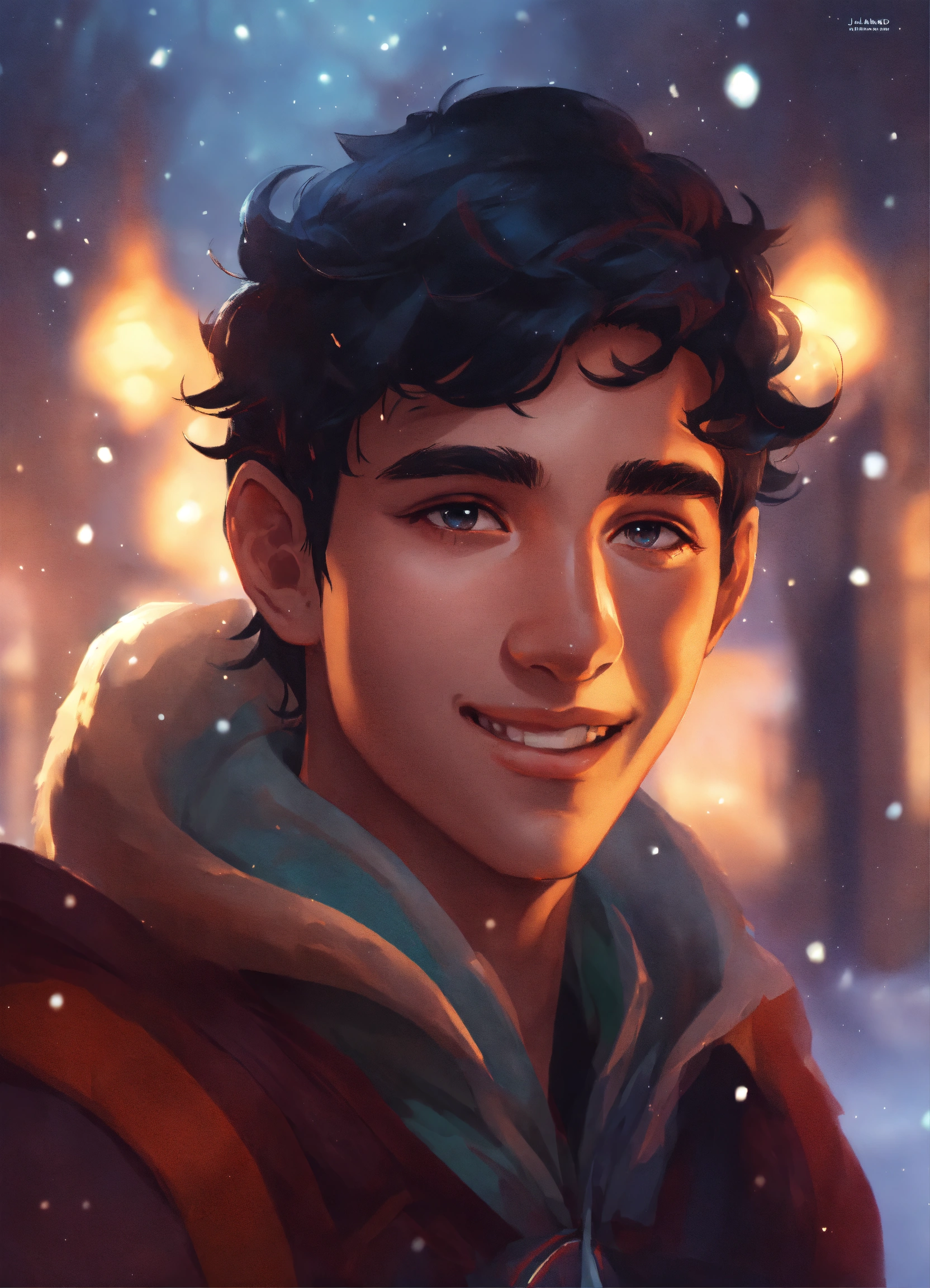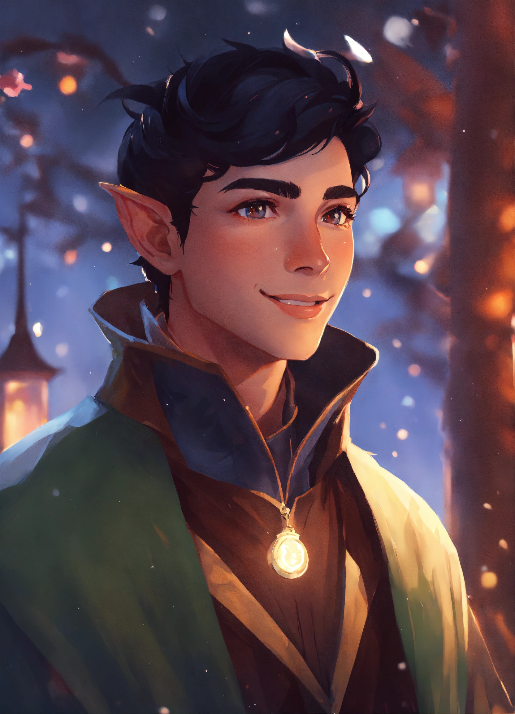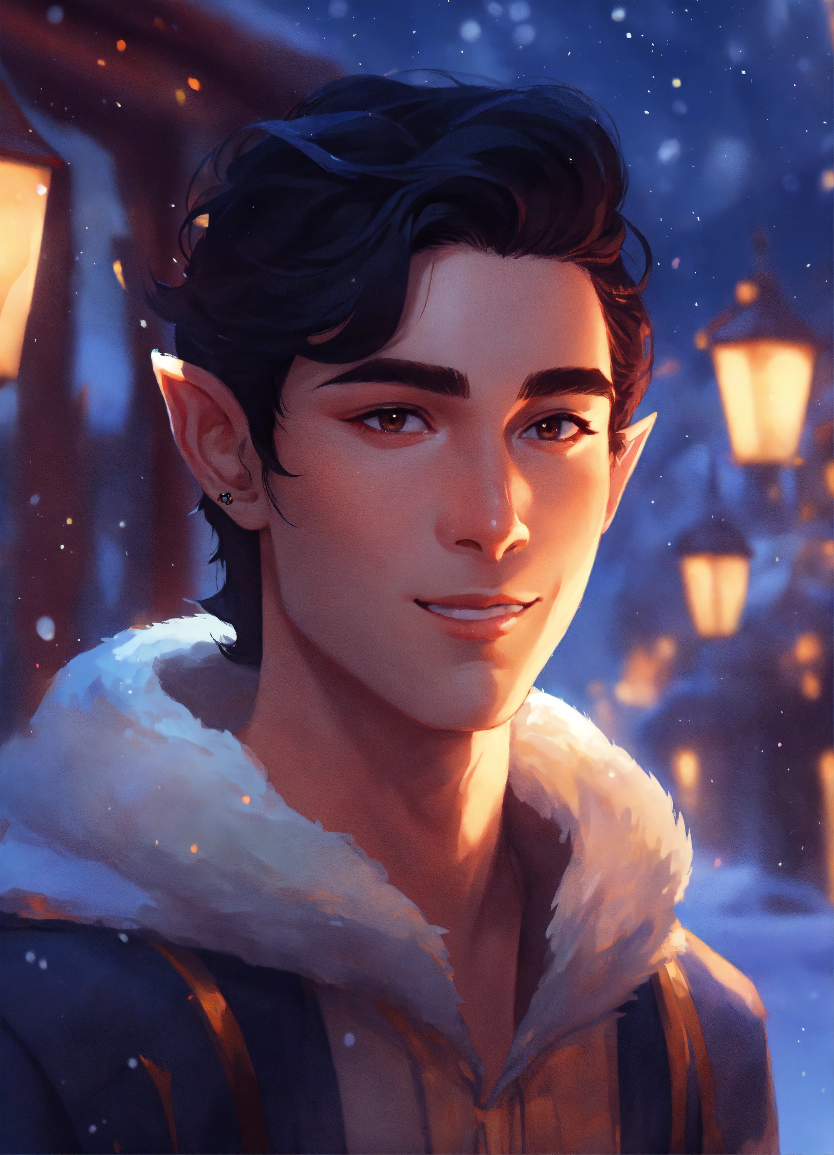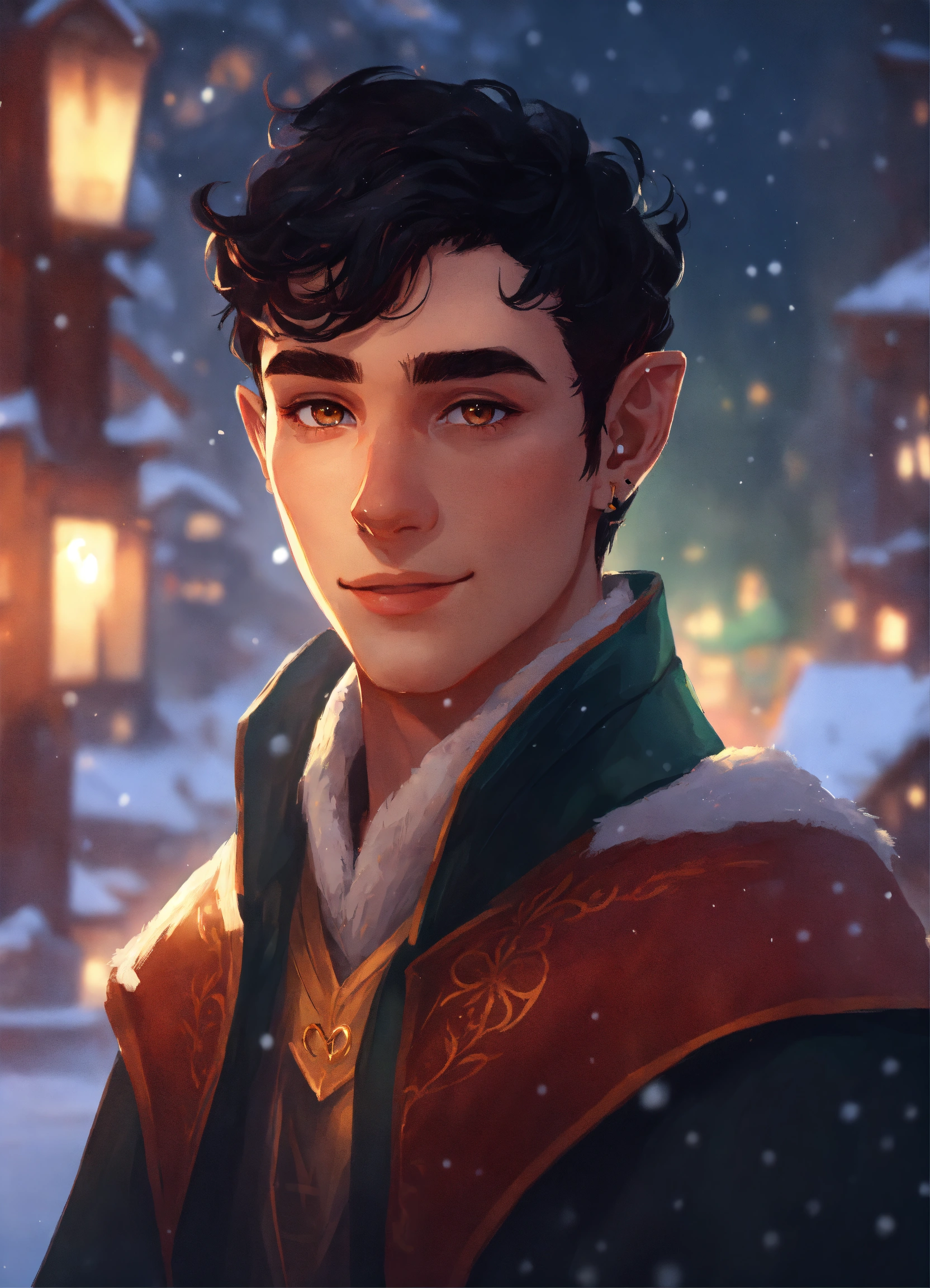 25 year old elf man, black hair, hazel eyes, smile, by james gilleard, fantasy world, wizard, simple silver earing, winter, magic