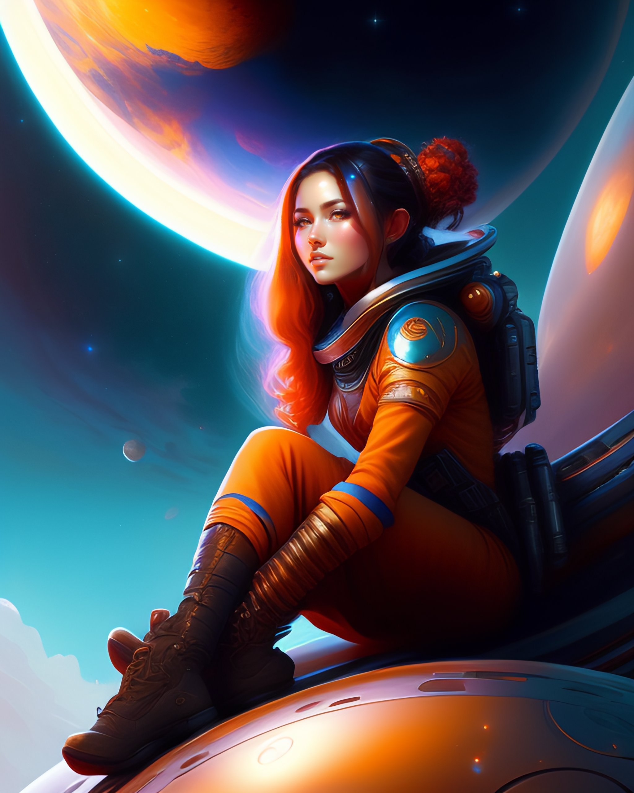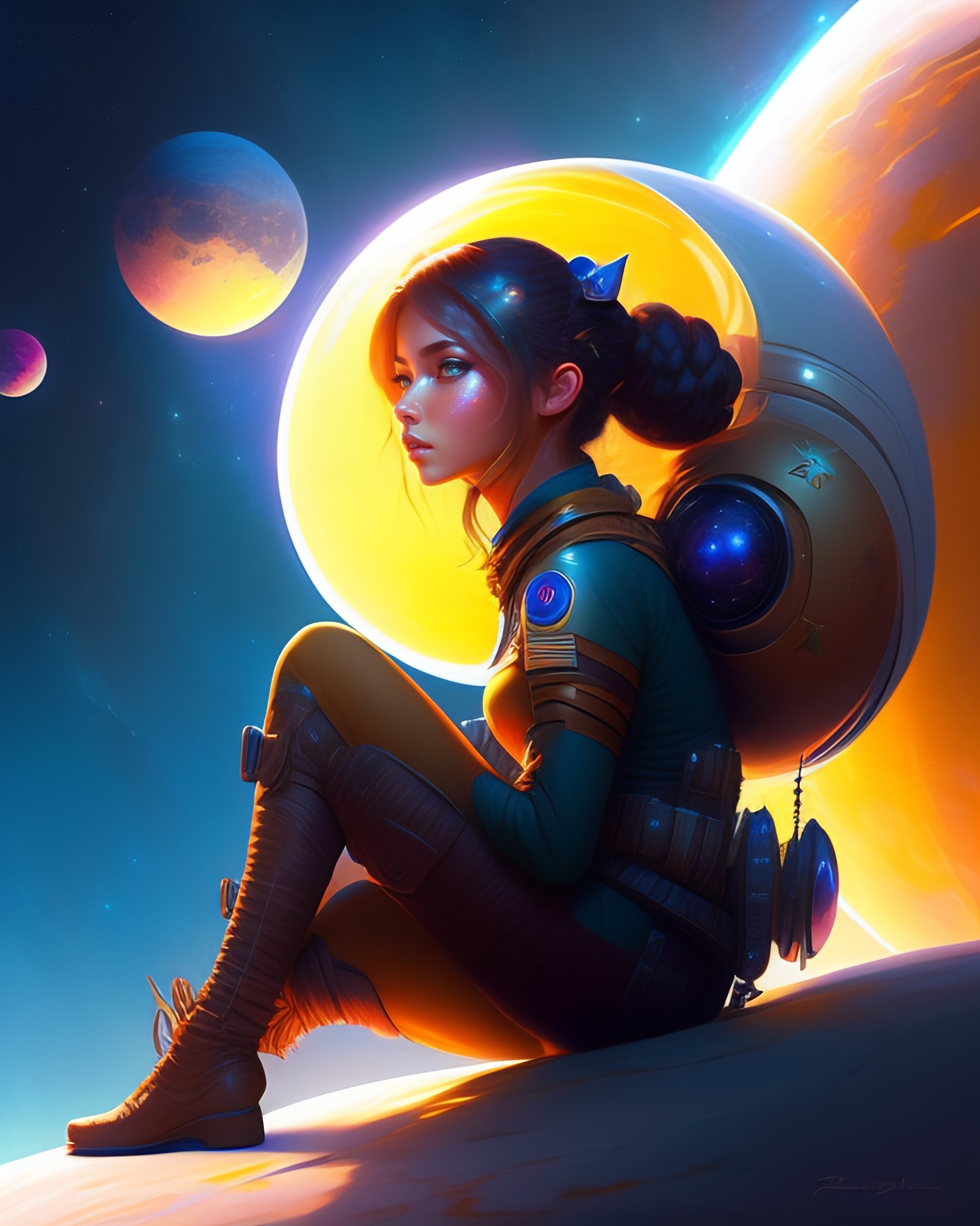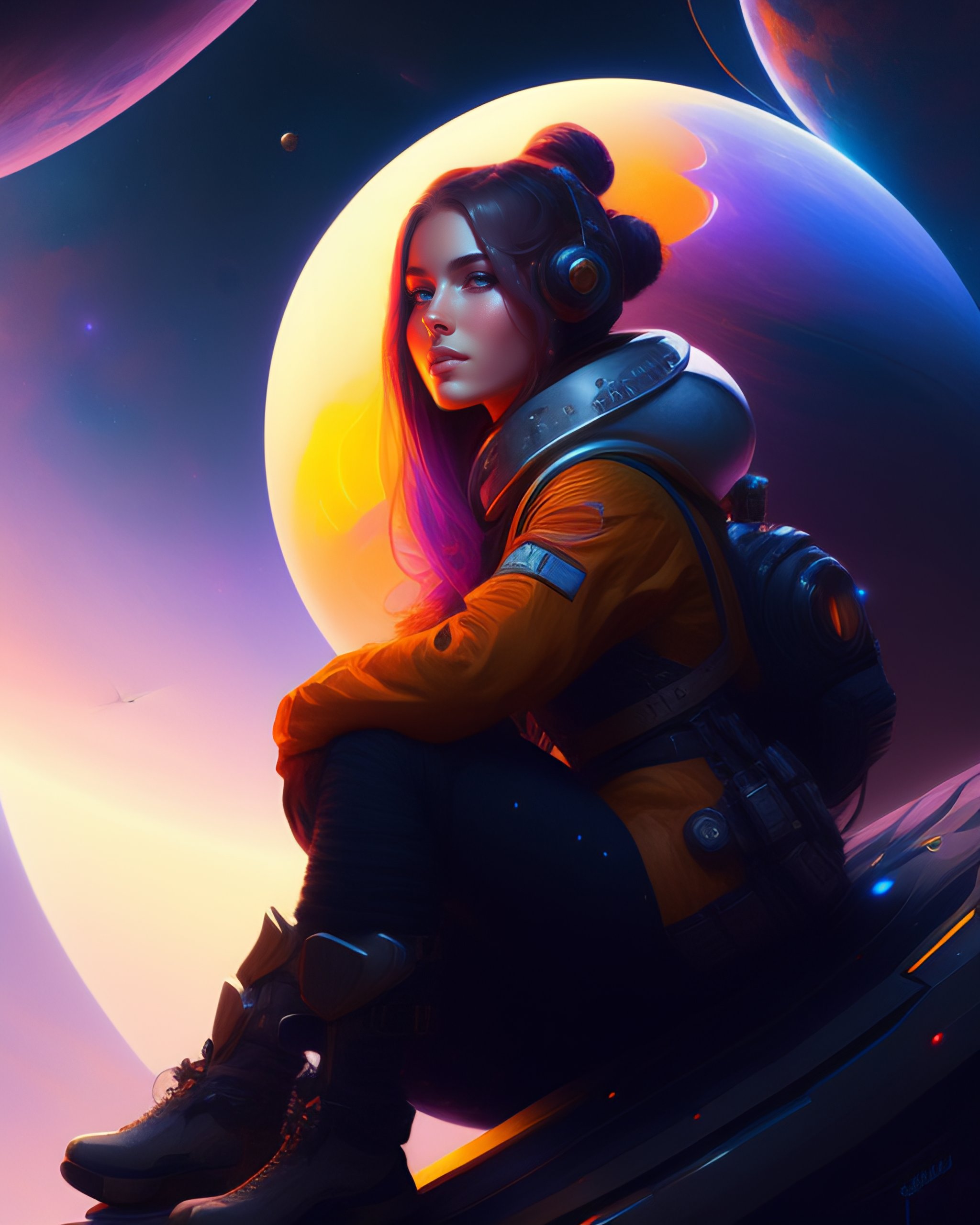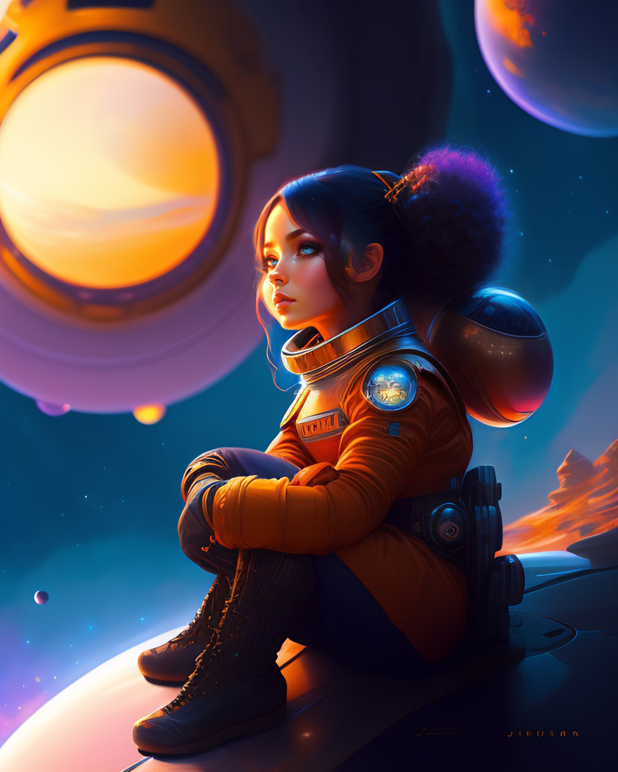 Beauty emo girl sitting on a little futuristic planet, deep space background, by justin gerard and greg rutkowski, digital art, realistic painting, trending on artstation, vibrant colors