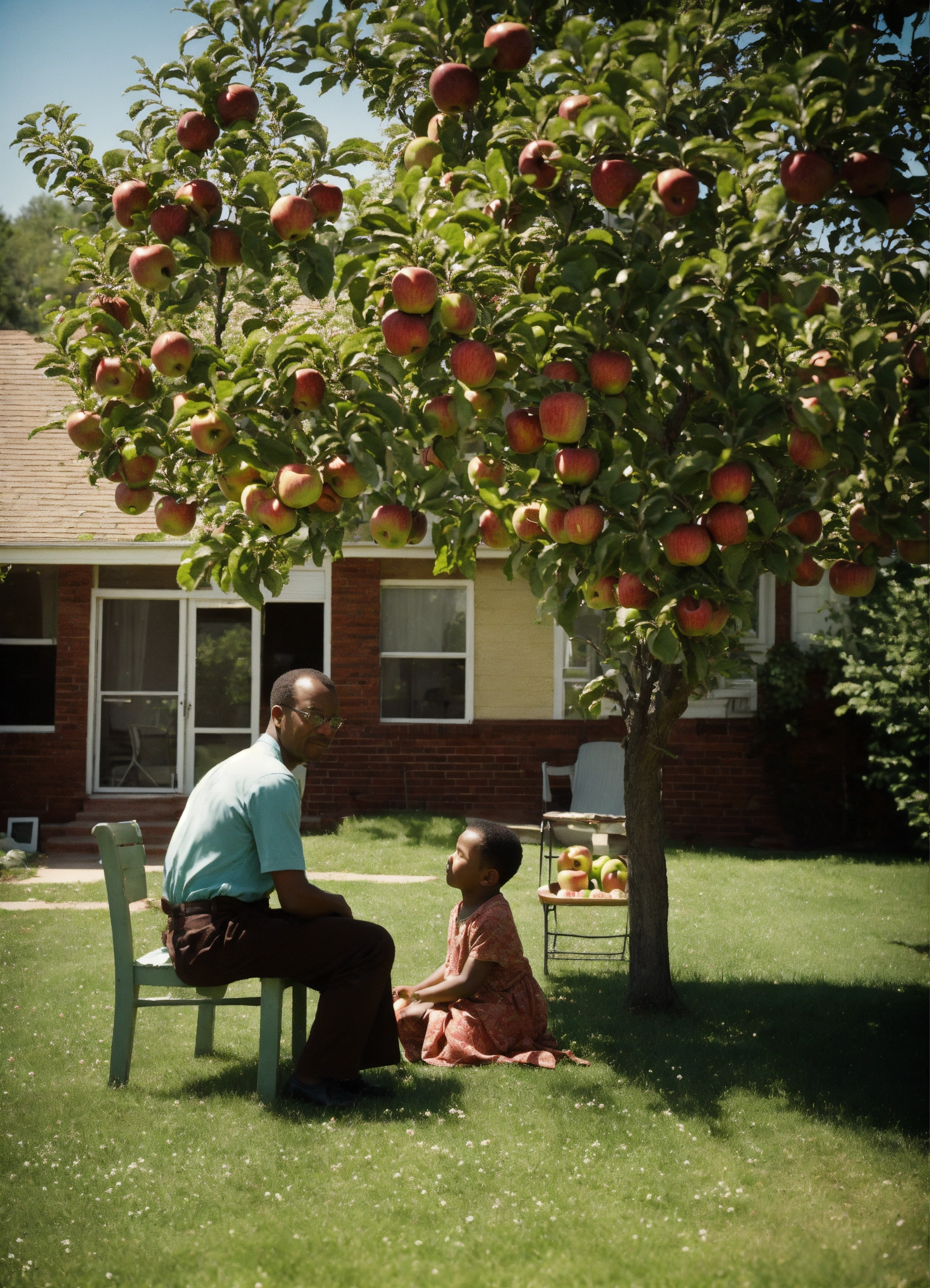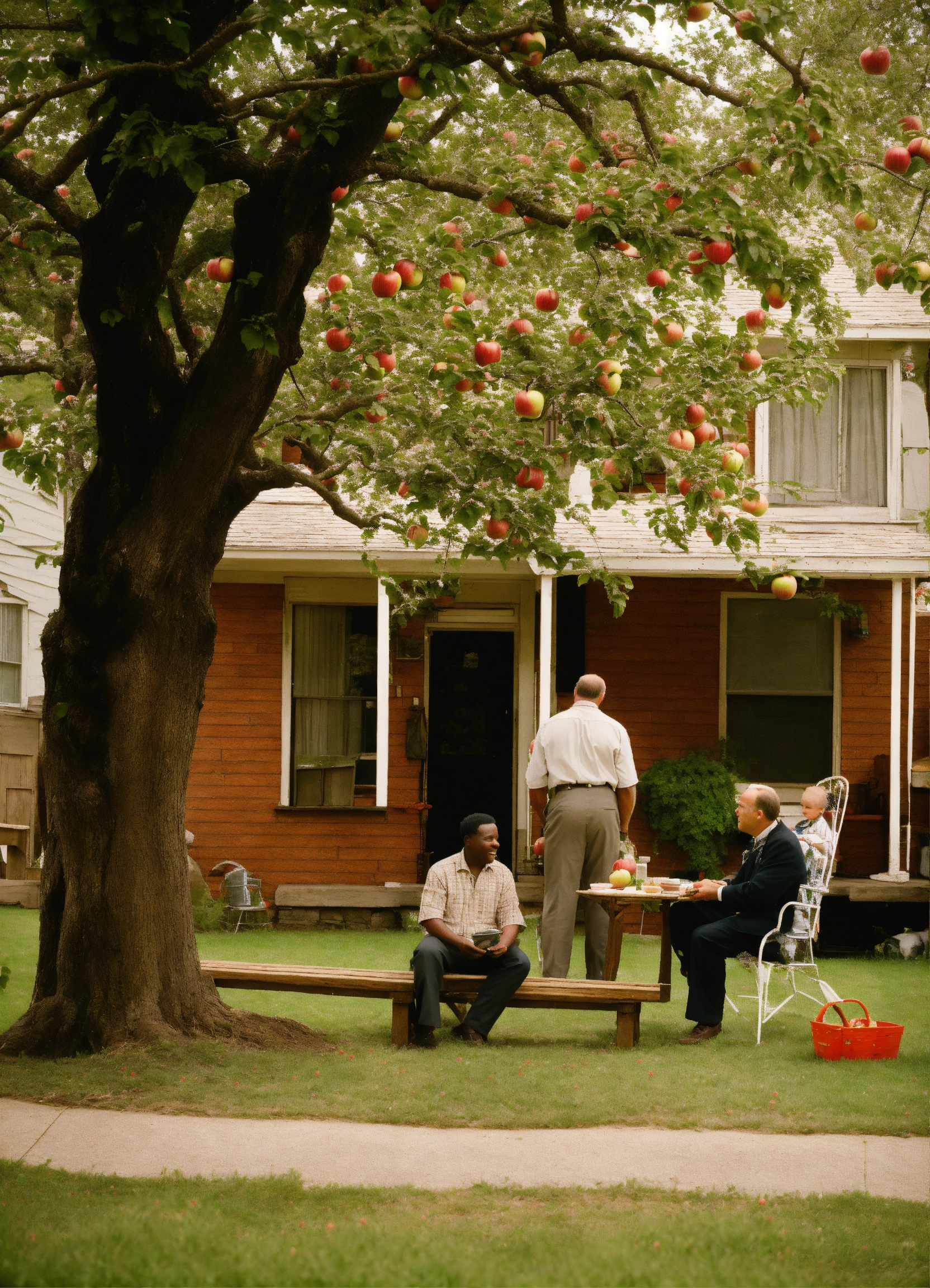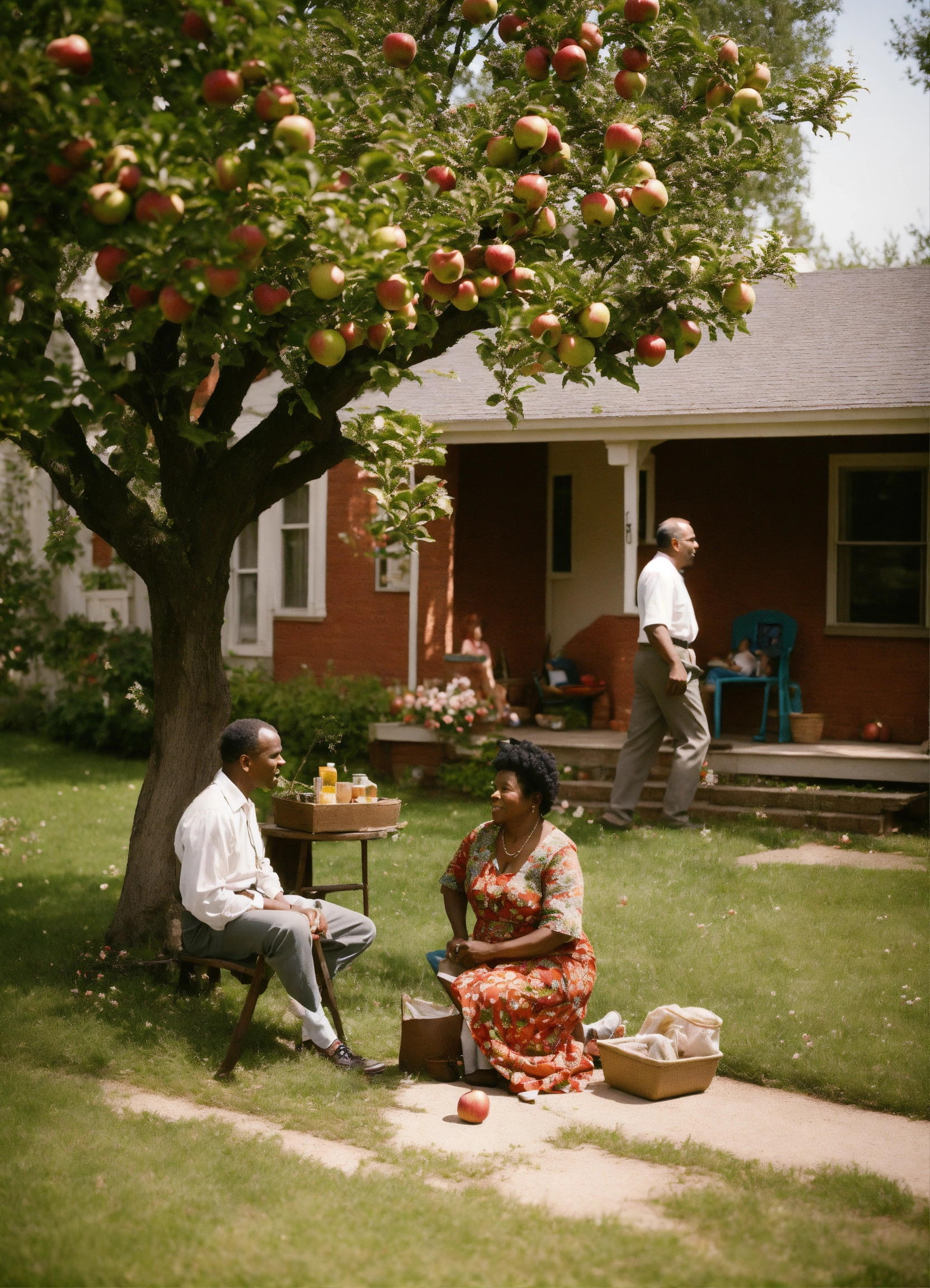 Setting 1960s backyard and porch of an urban home. in the foreground a black, 55-year-old woman is seated on the porch, she is holding a five-year-old boy. in the background a 25-year-old man on the lawn, under the apple tree. a balding, 55-year-old man under an apple tree men are having a conversation by themselves. a well-grown apple tree, possibly discussing it.