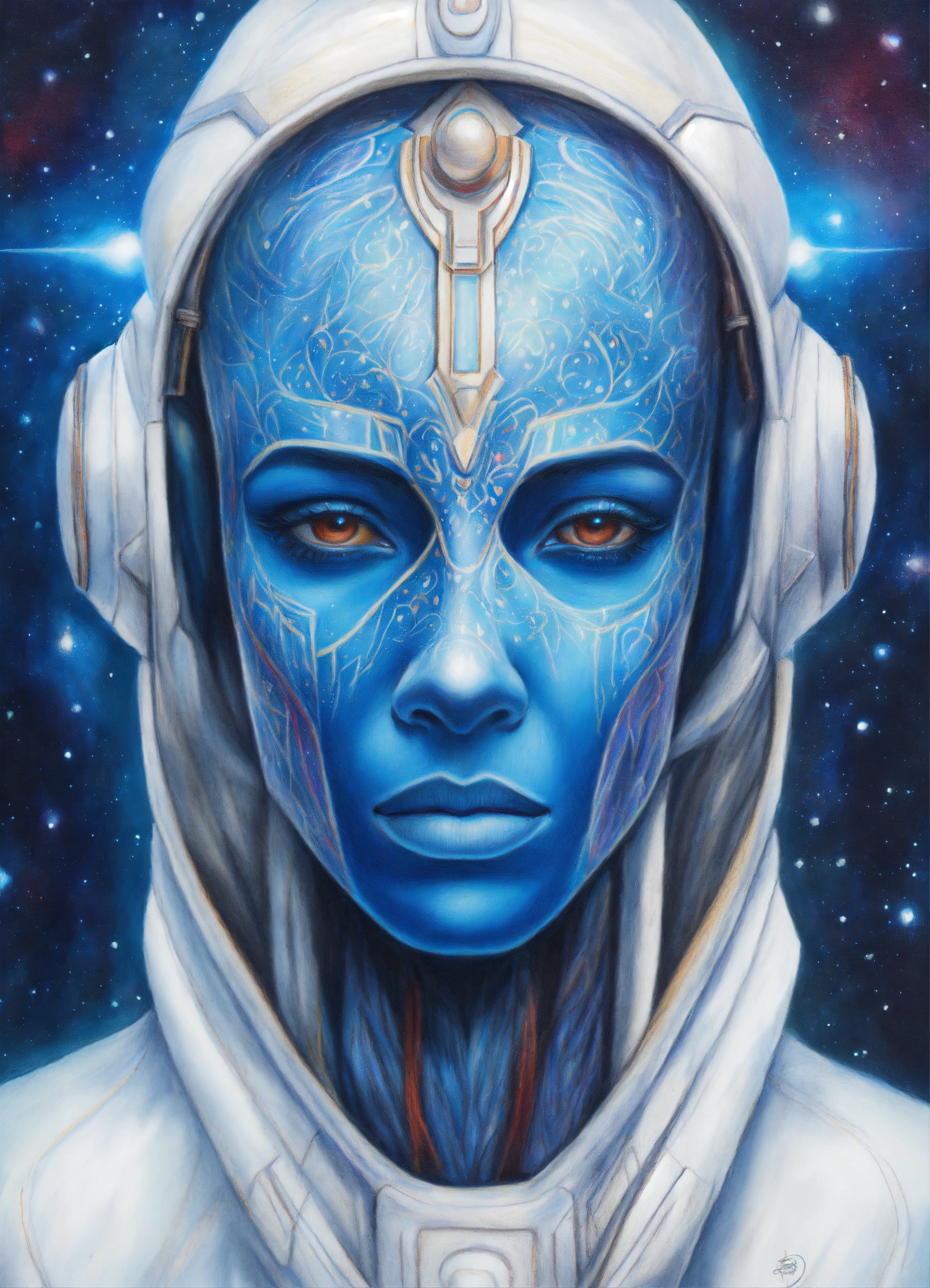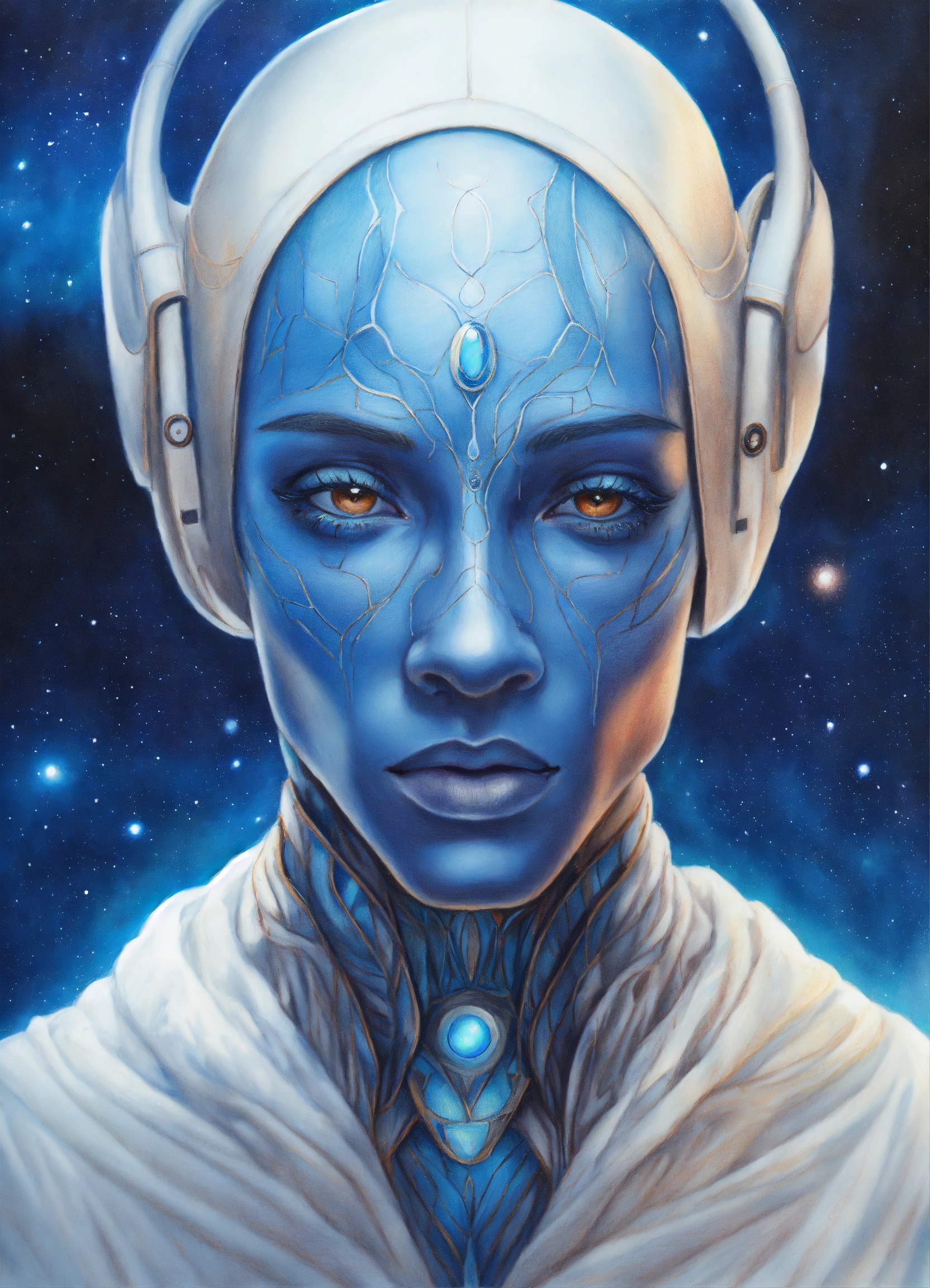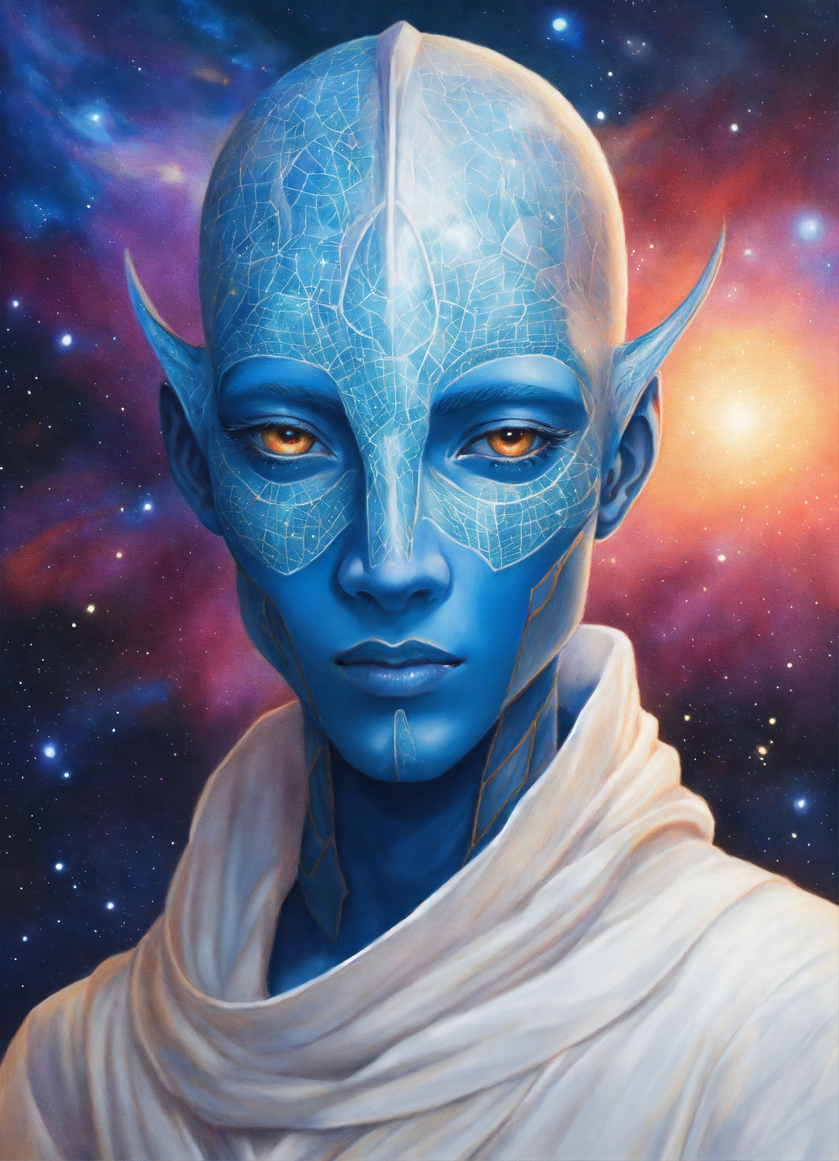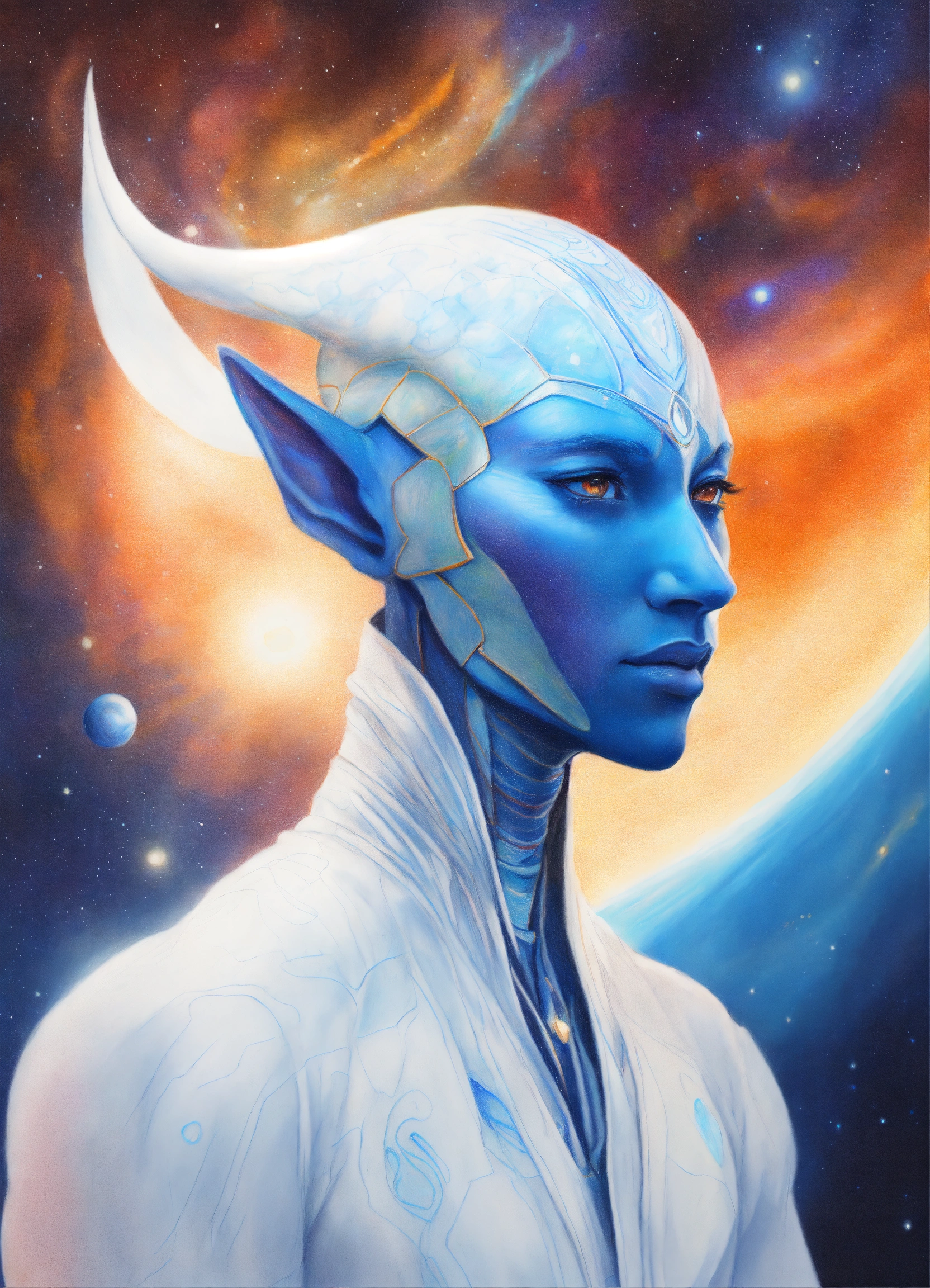 Realistic colored pencil drawing of portrait of a humanoid arcturian with blue skin and an elongated head. loving eyes, kind, friendly, sympathetic. wearing white clothes. galaxy background.