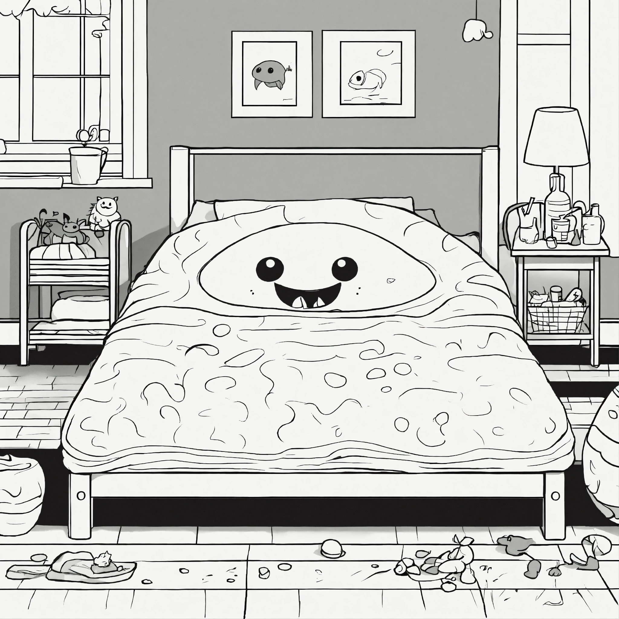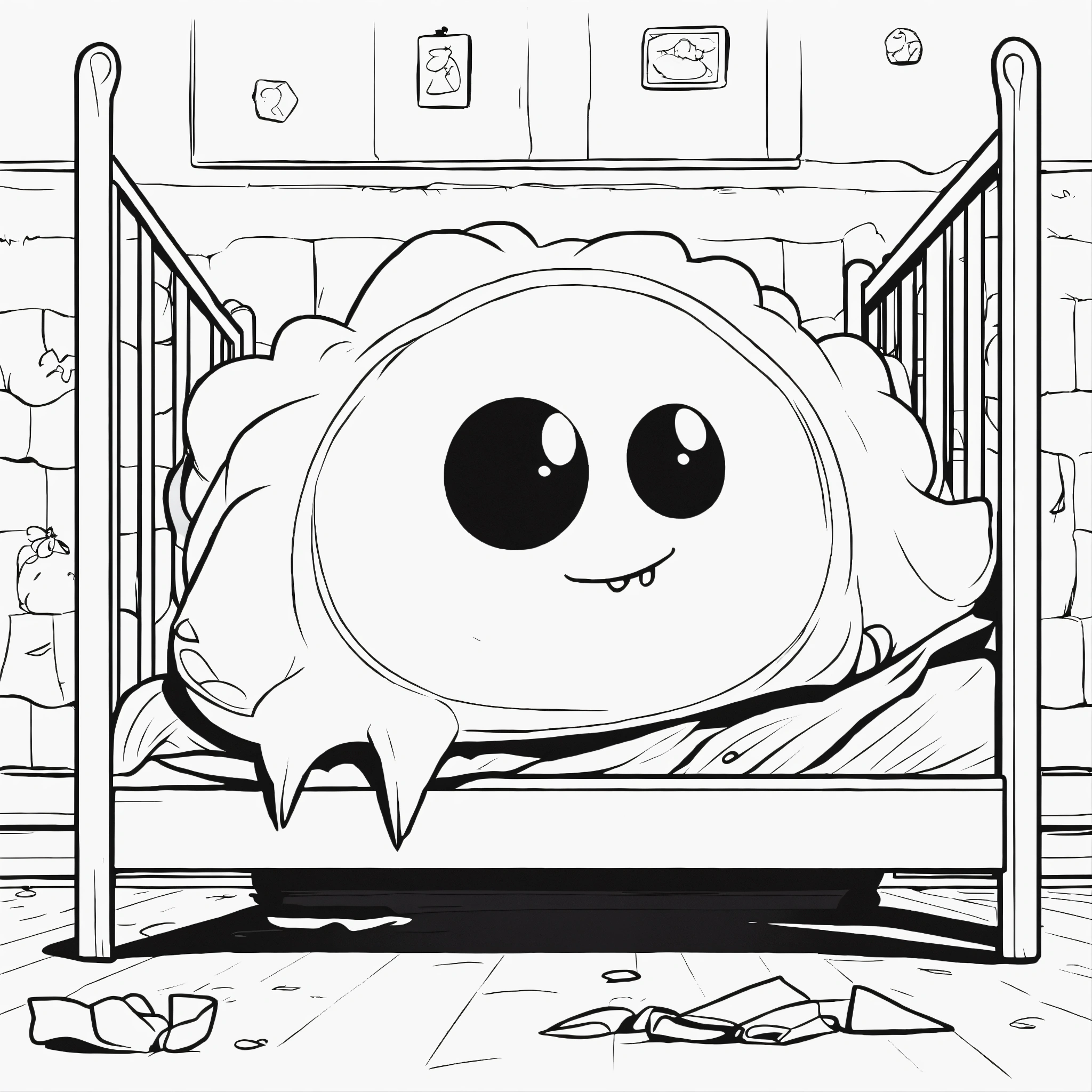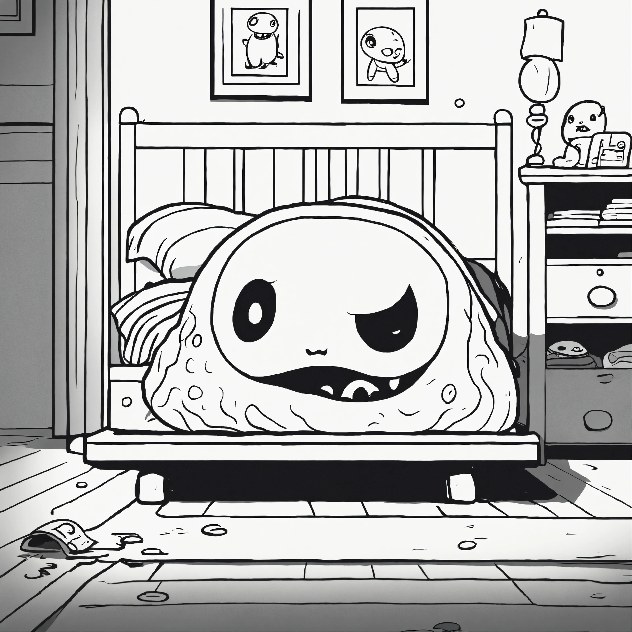 Cute monster under the bed a little monster that hides under the bed. for a toddler's, pixar style, simple outline and shapes, black and white coloring book, flat vector, white background, clean line art, studio ghibli studio