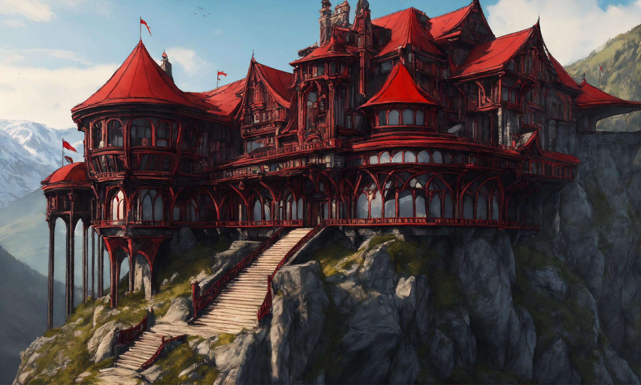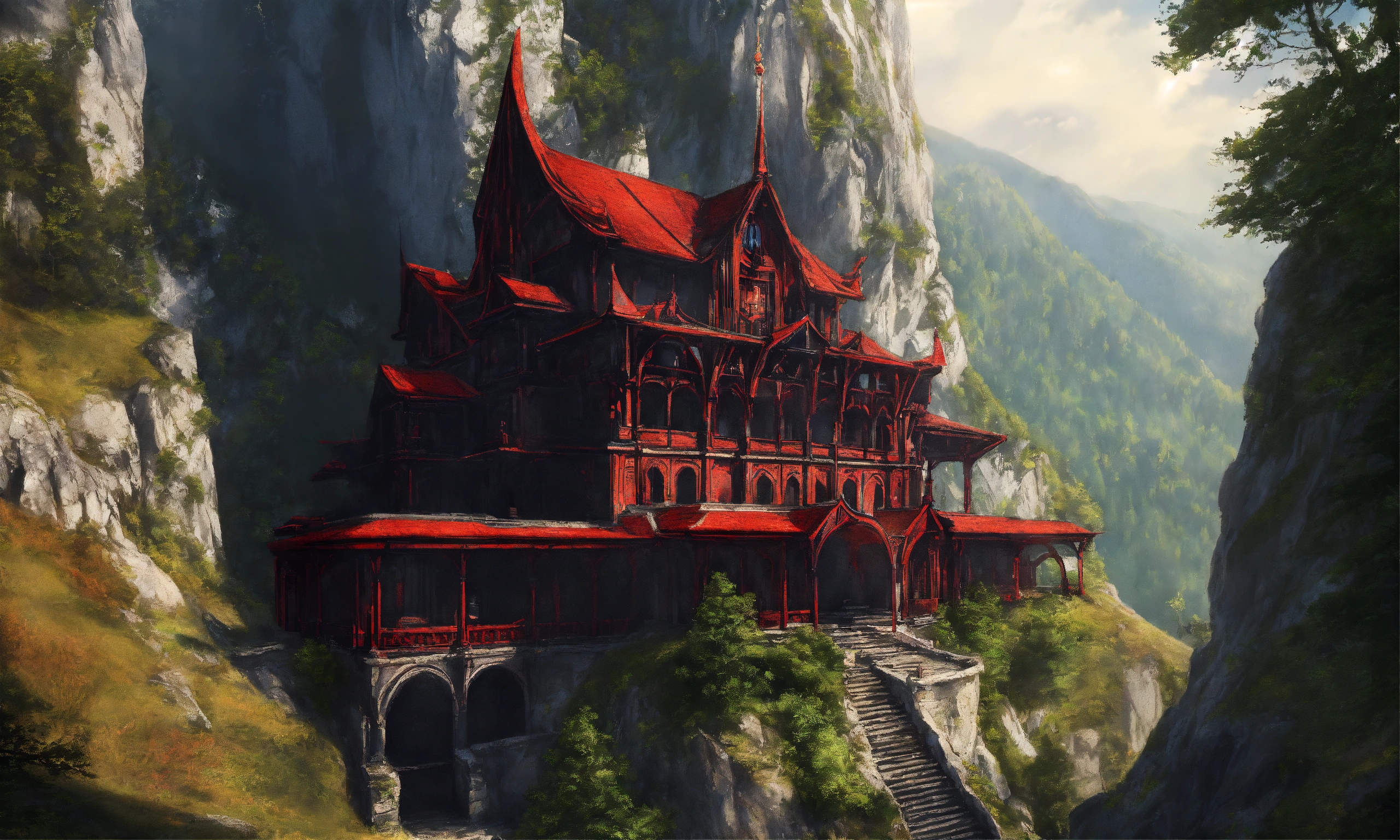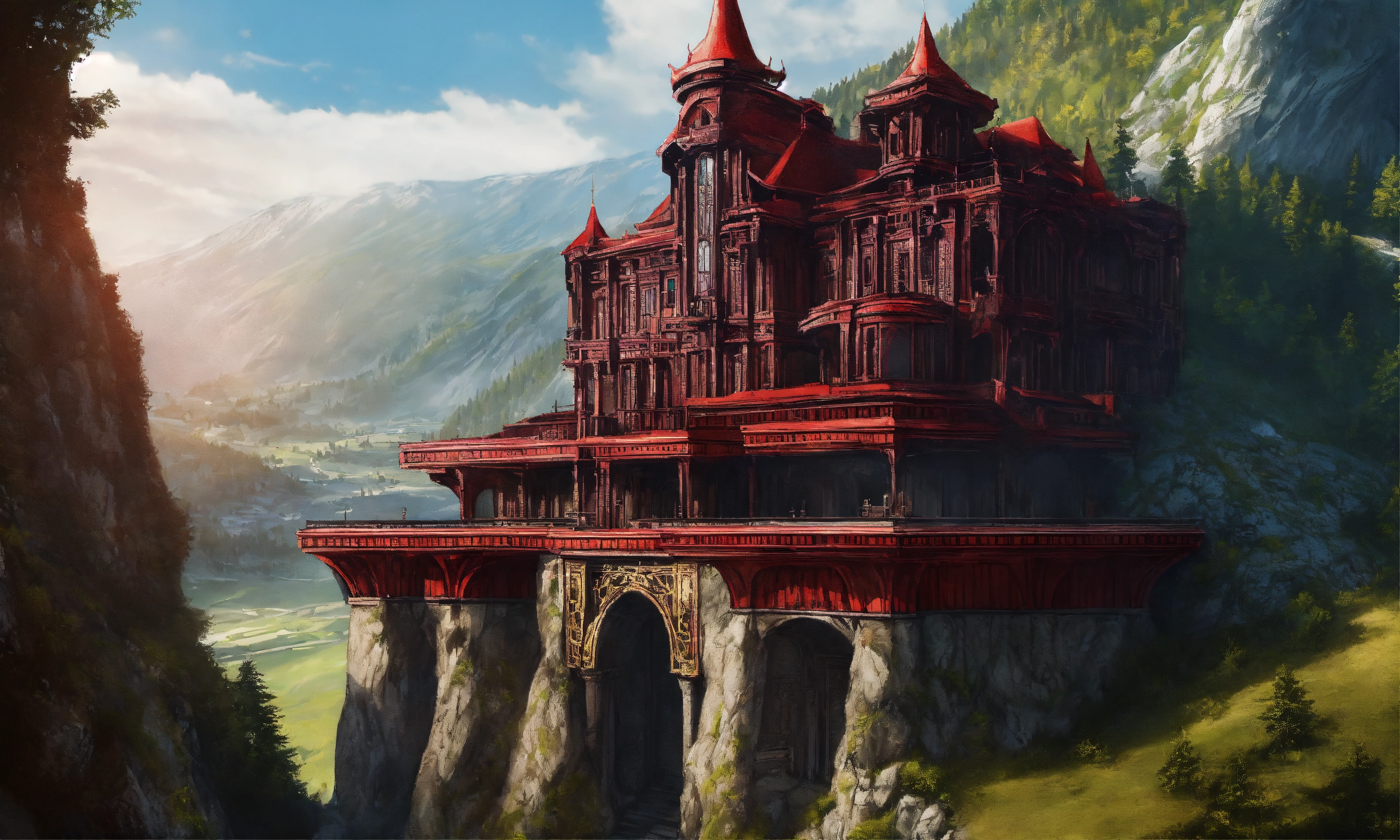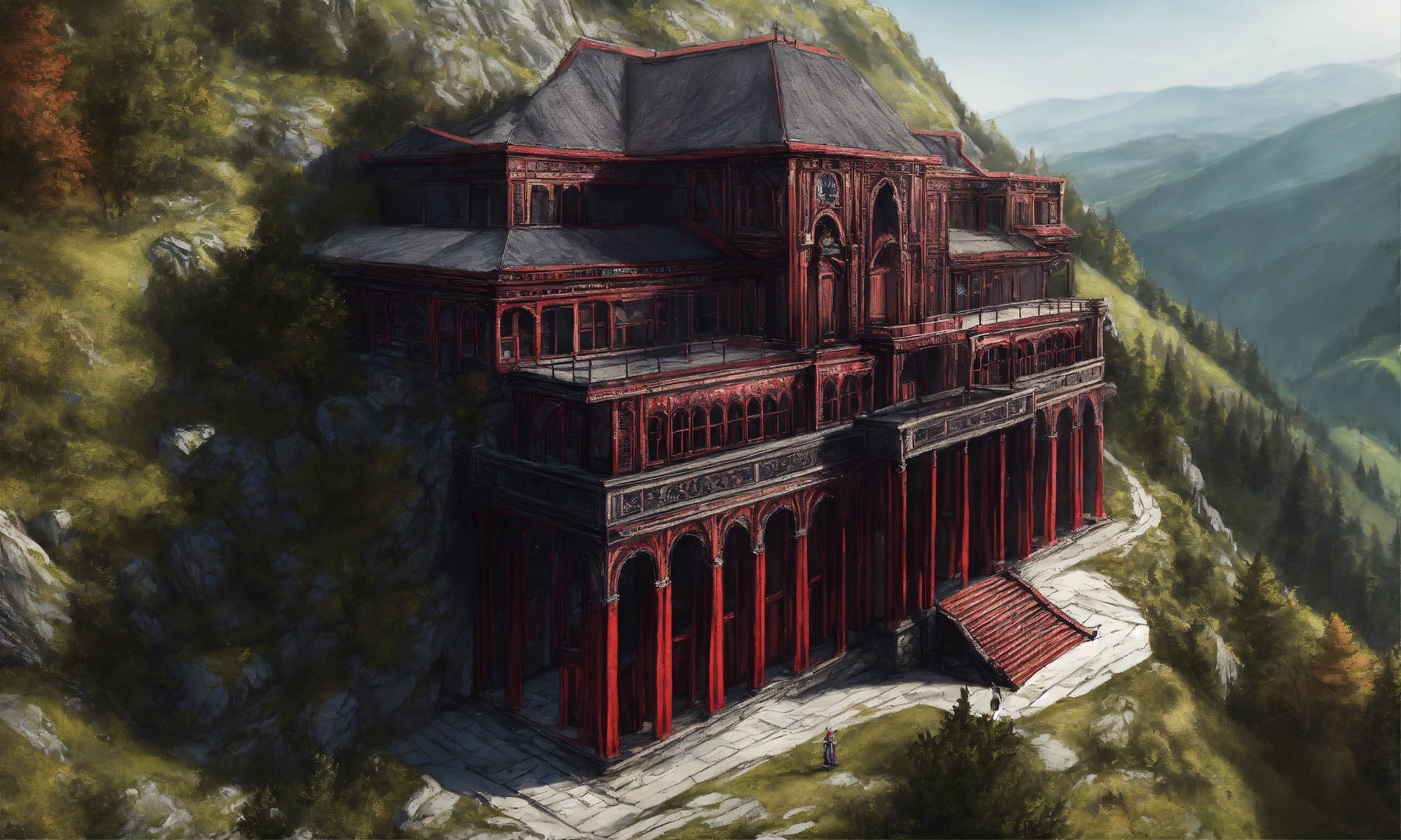 Drawing of an elegant high elf sci fi black and crimson palace built into a mountainside in romania, elf architecture, beautiful day, immensely detailed, high definition