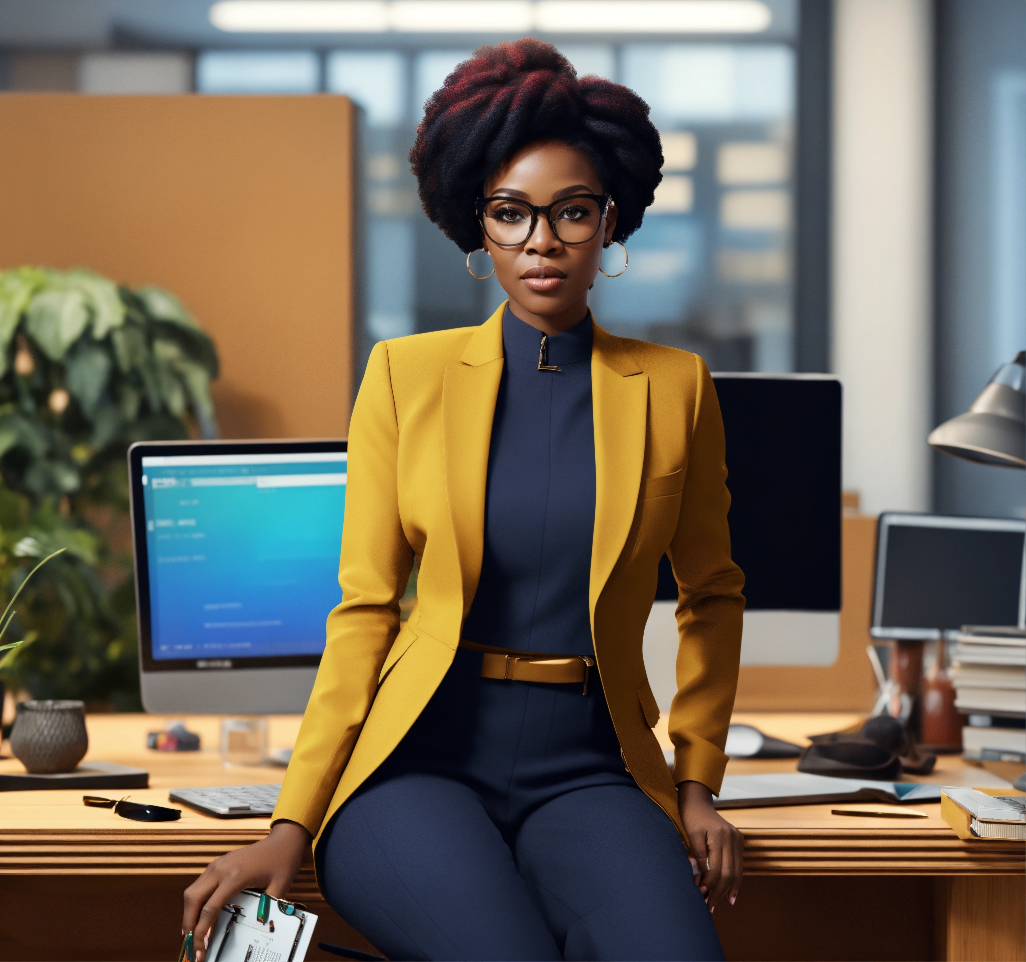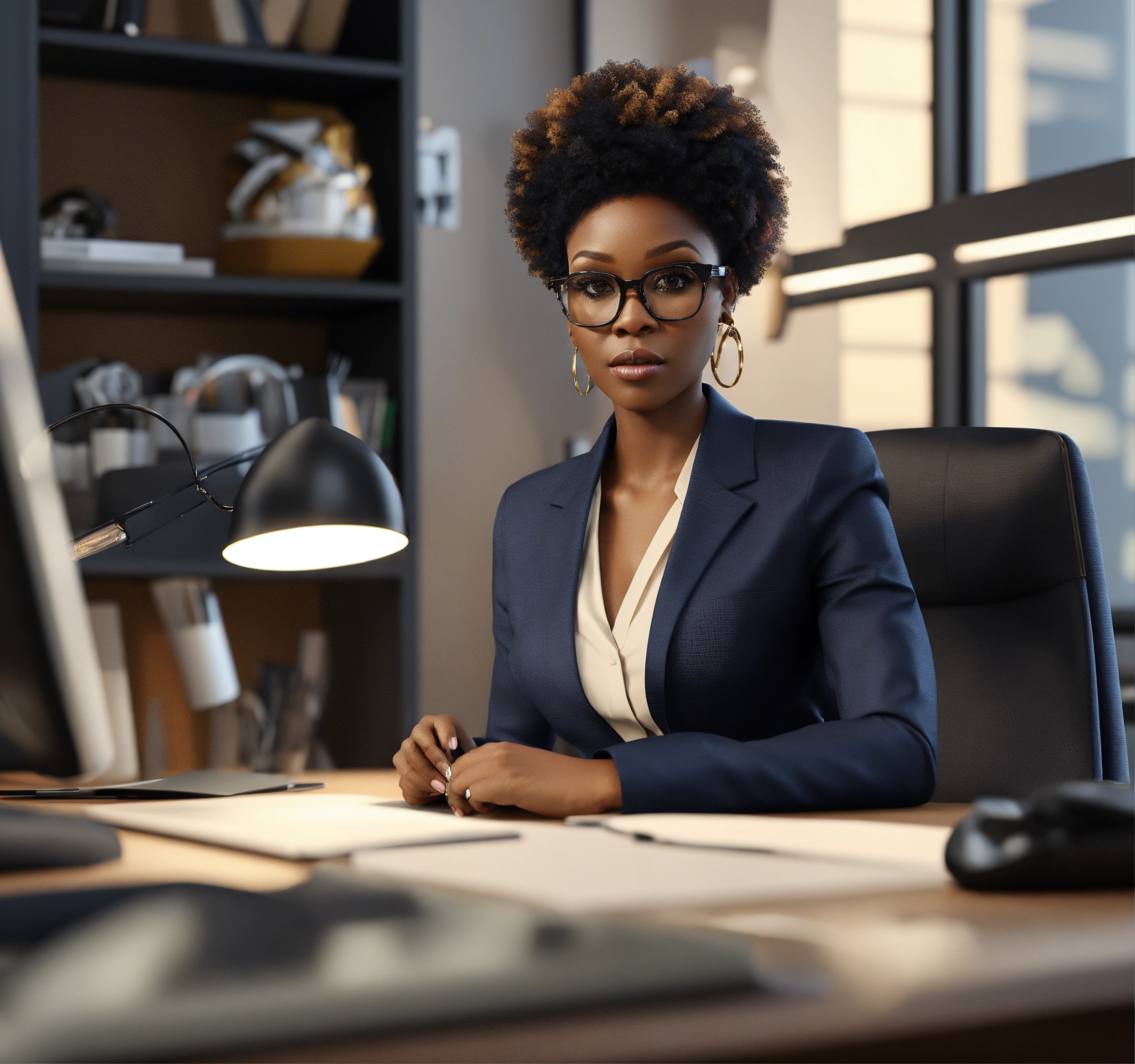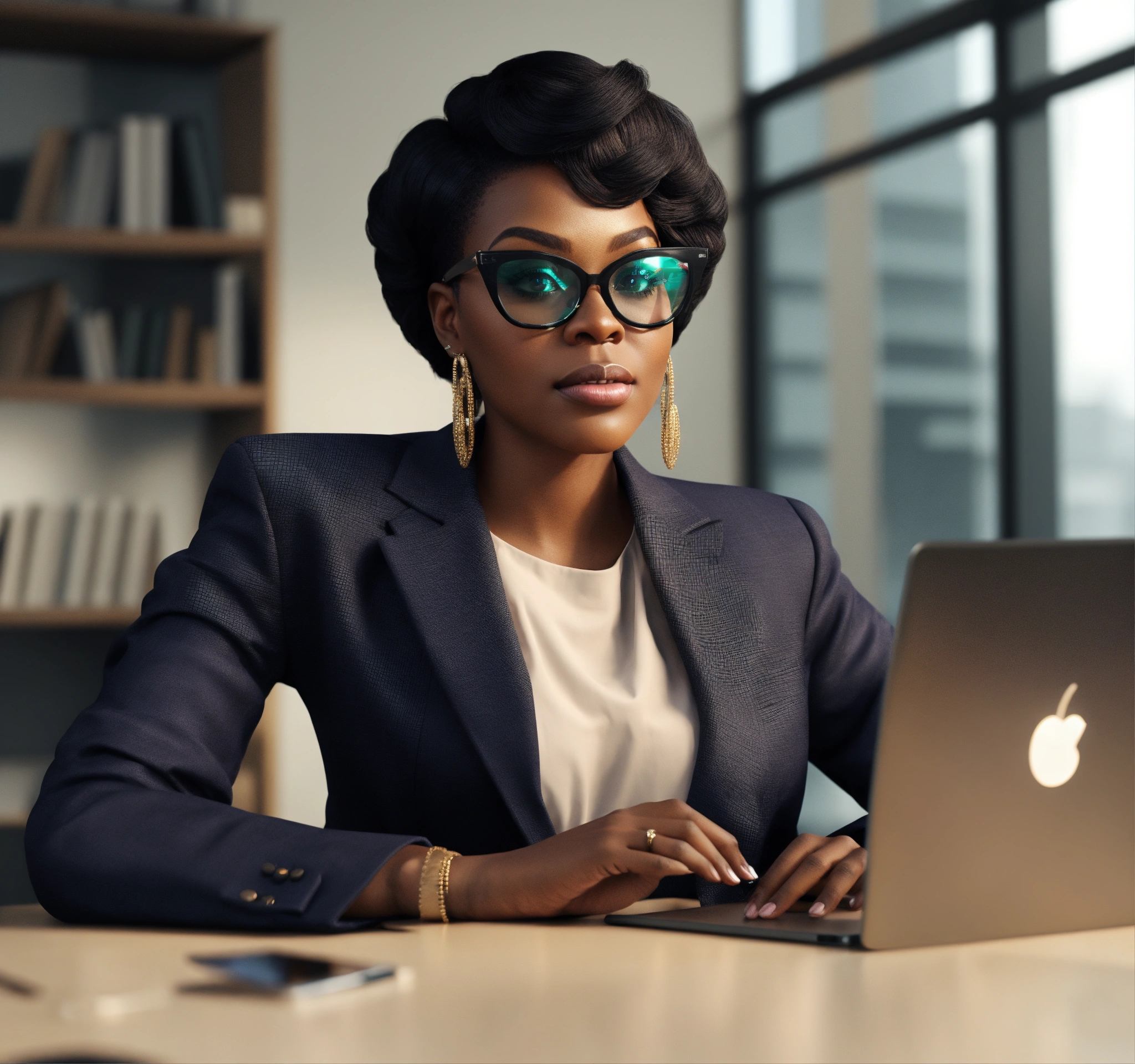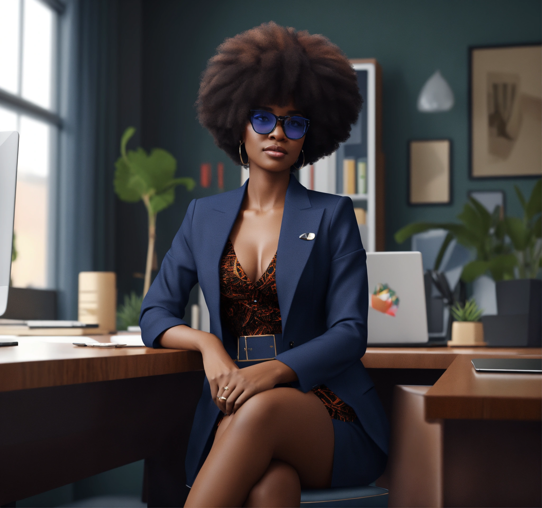 .3d render of an afrocentric black woman, short asymmetrical bob hair style with oversized cat eye designer glasses, at the work office, designer jacket pants suit for the office, sitting at a desk