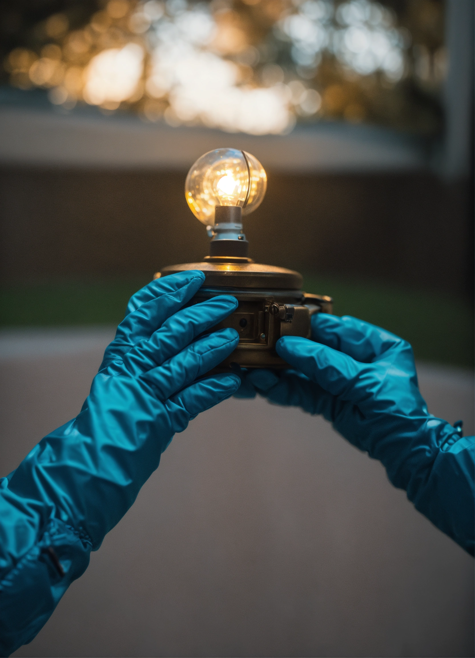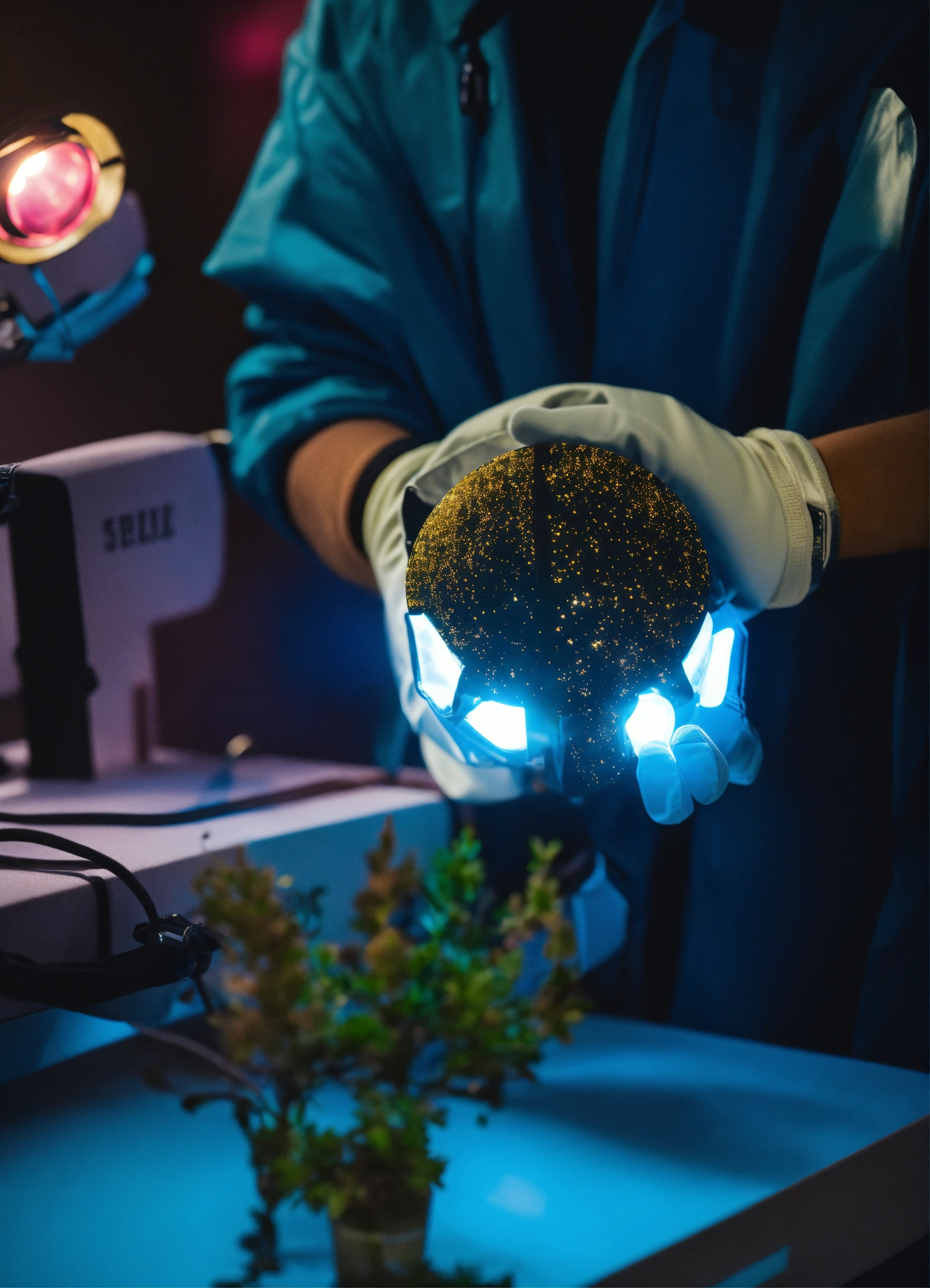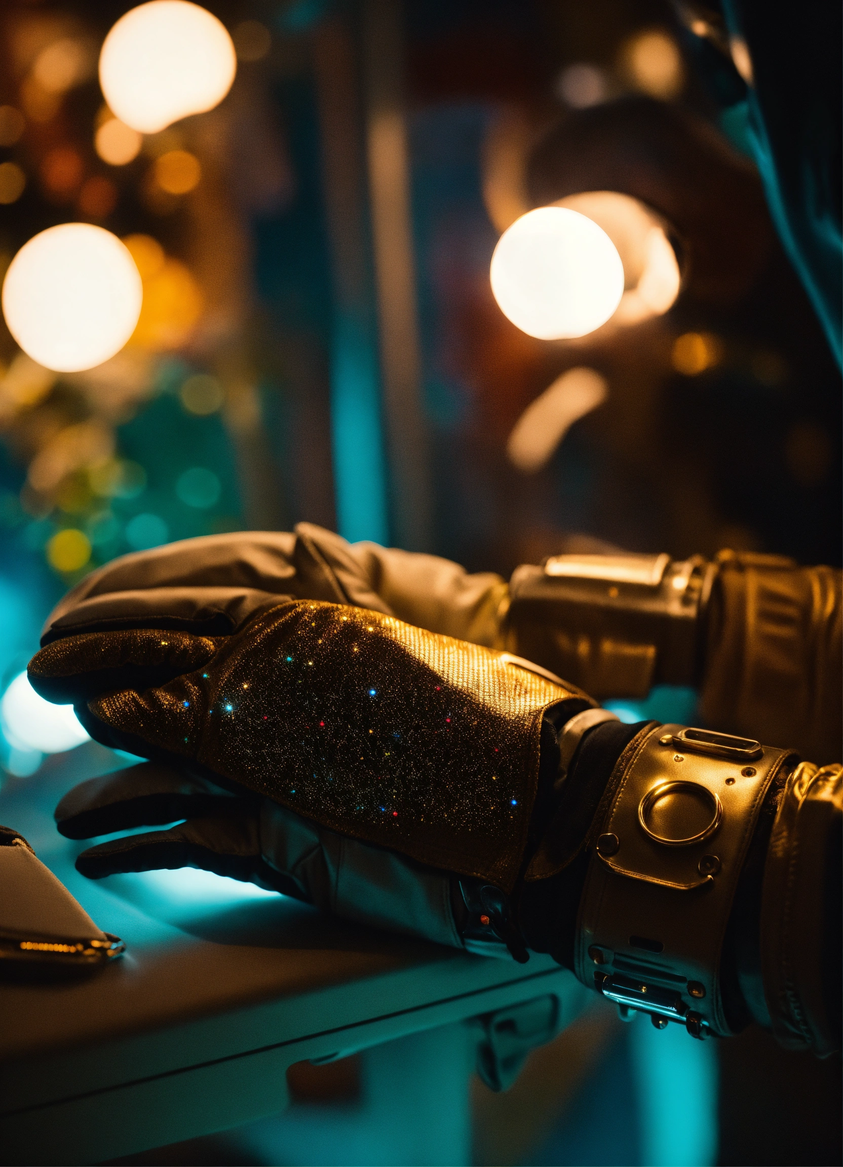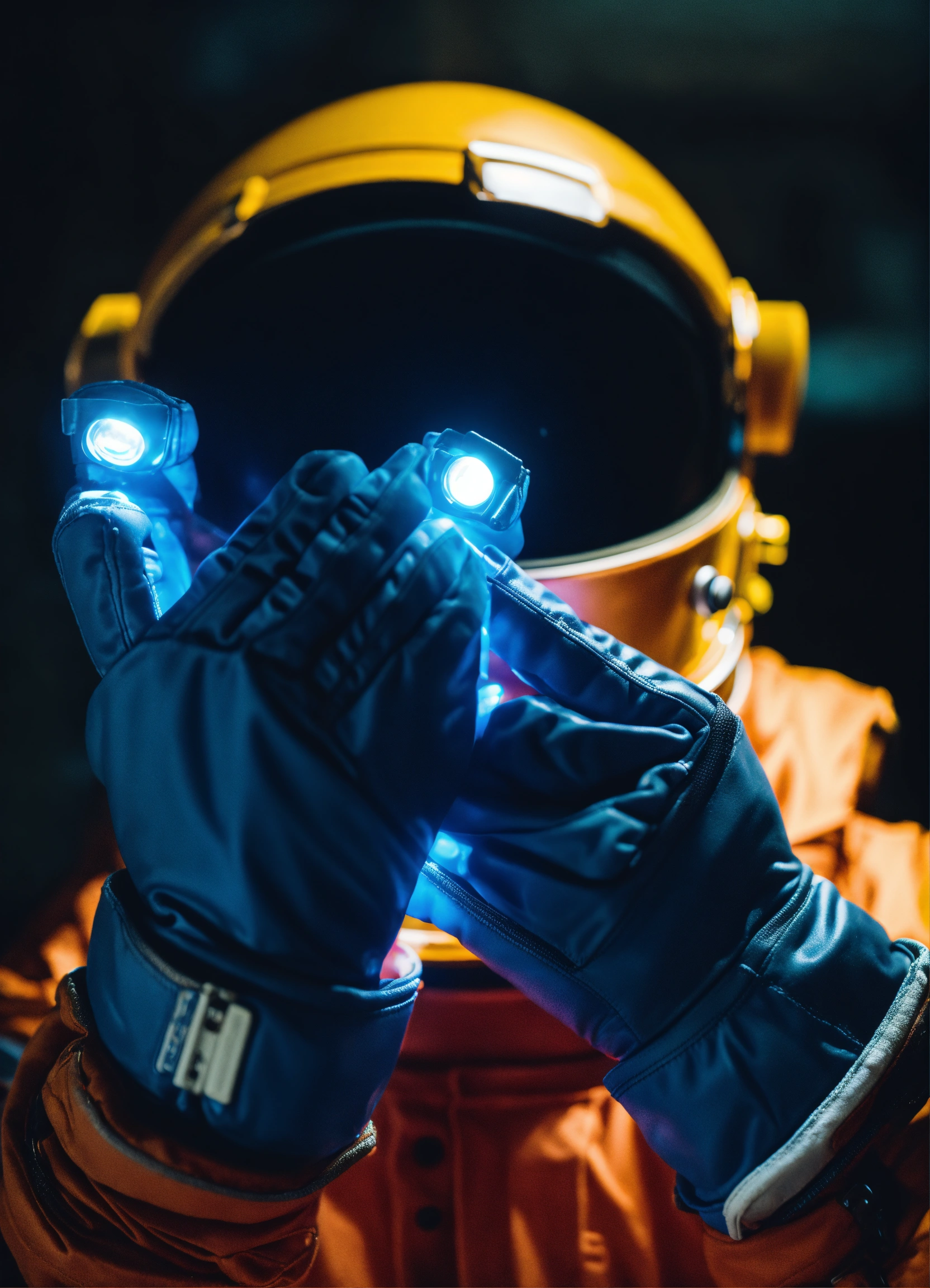 Close up of hands with space gloves giving away a secret light