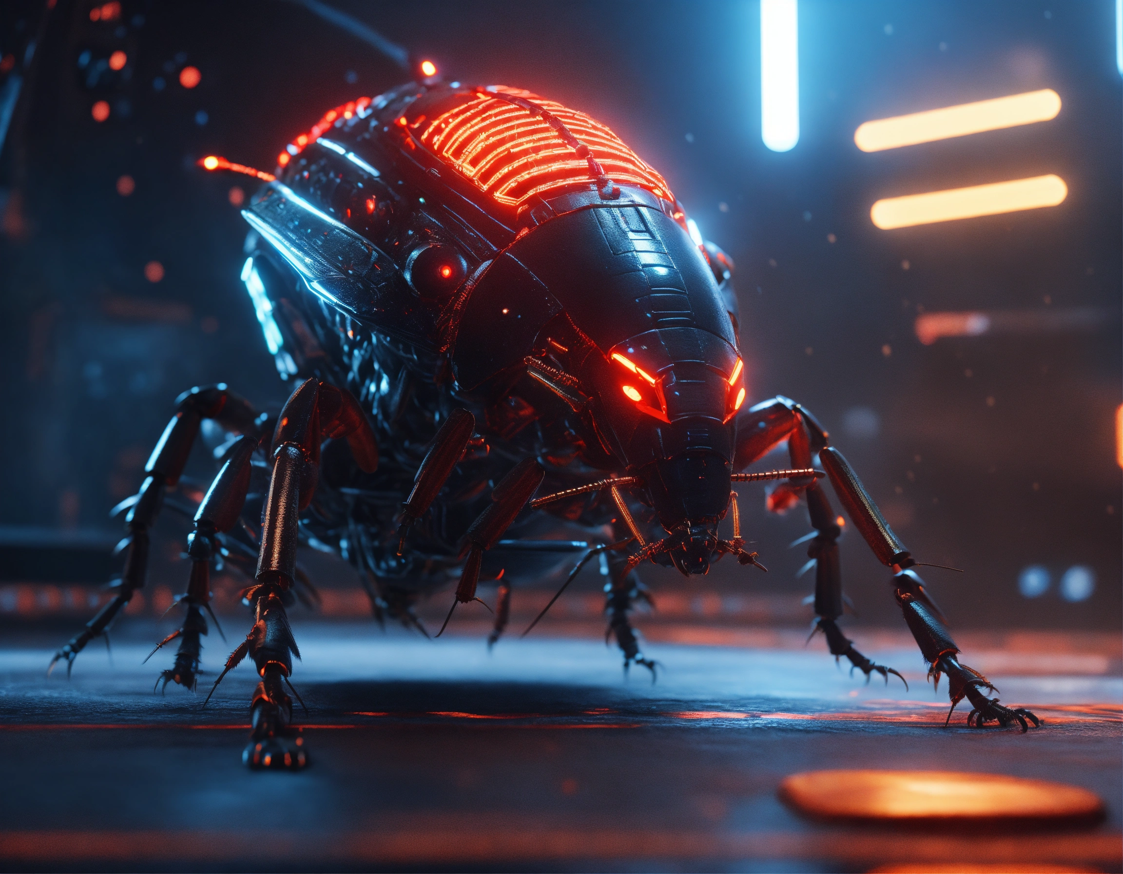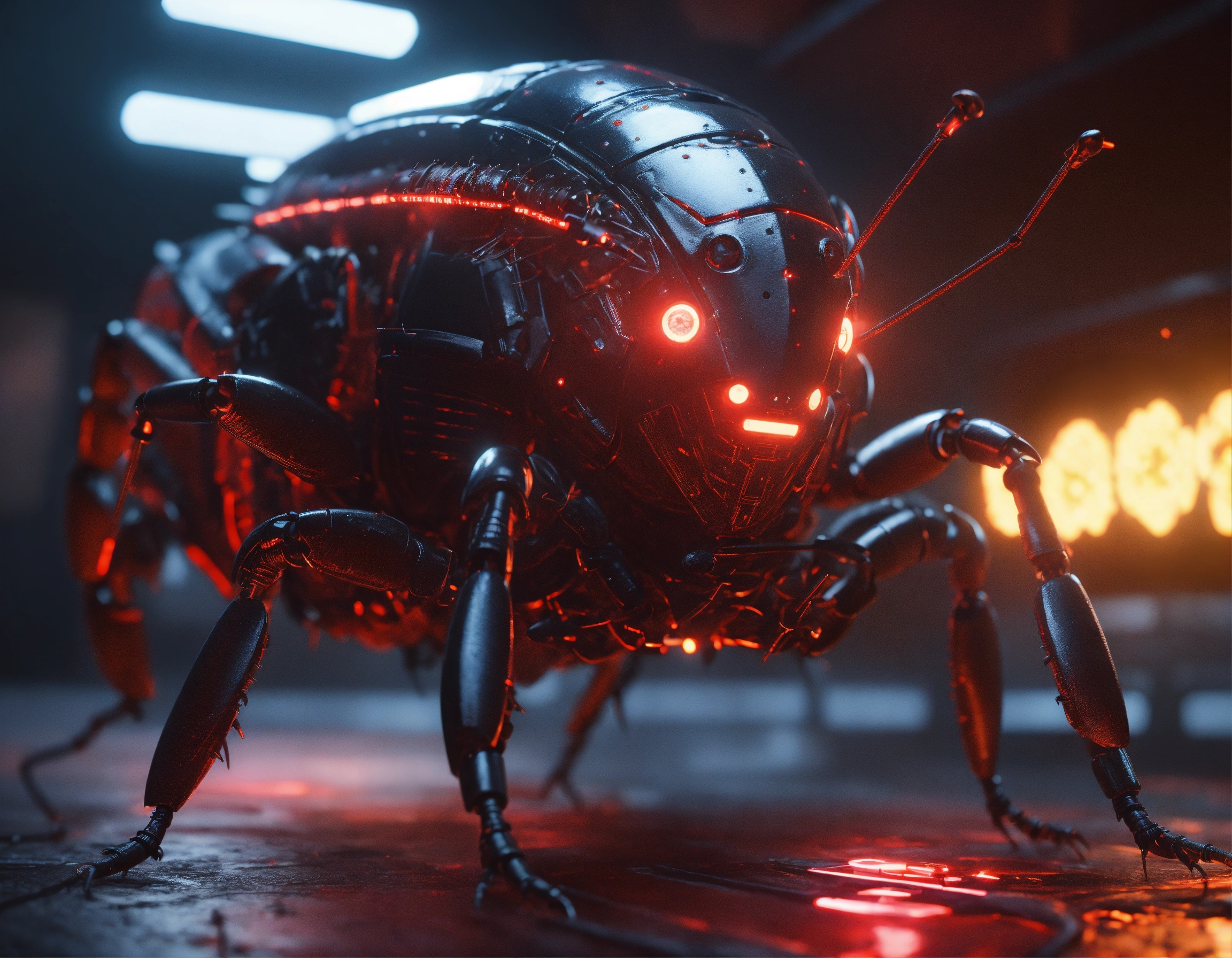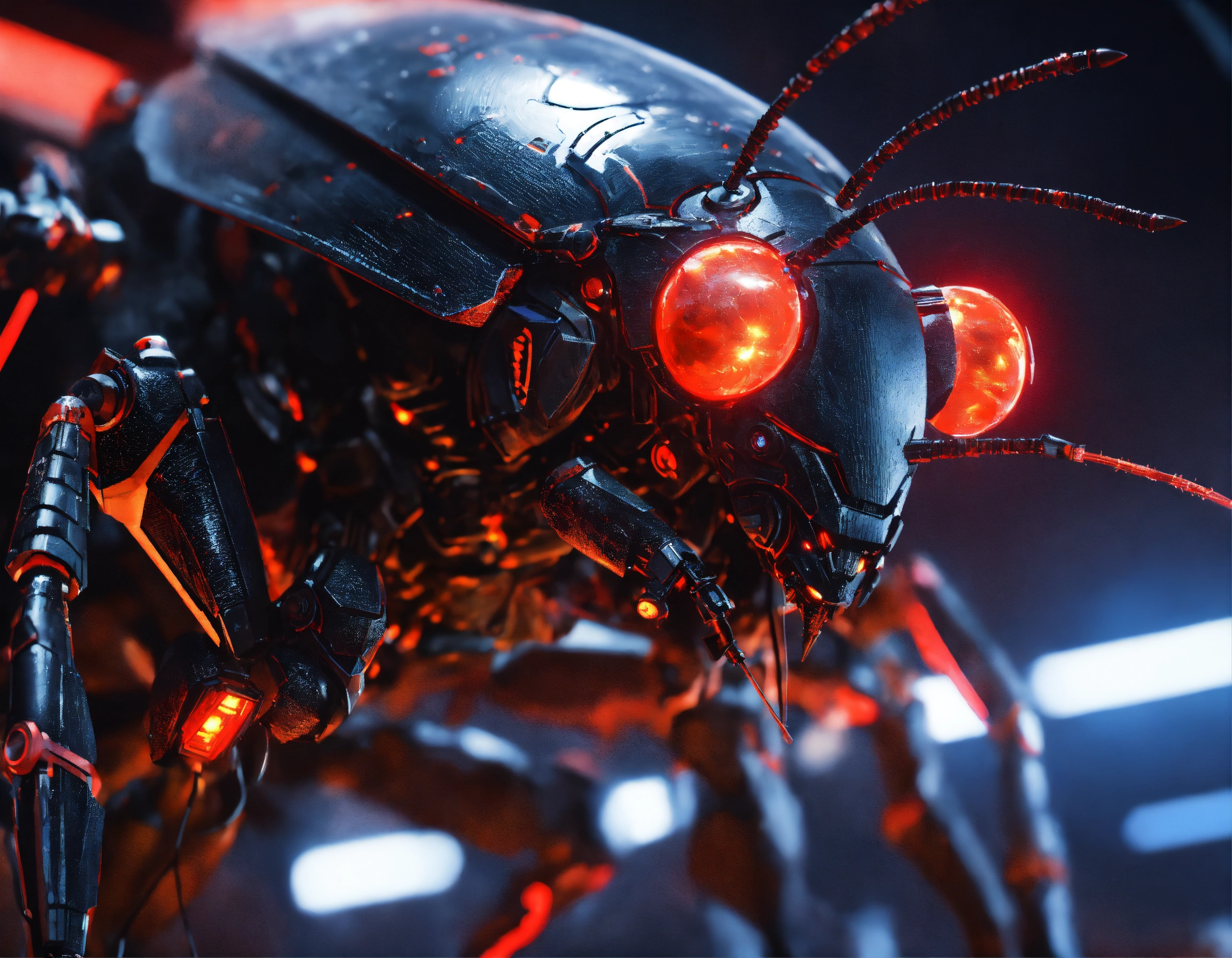 Zoom out shot of standing black cockroach faced humanoid with red glowing eyes, detailed armor with circuitry decor, lightning bolts shoot from its antenna as it attacks creatures in a spaceship, realistic, pixar, 8k, unreal engine