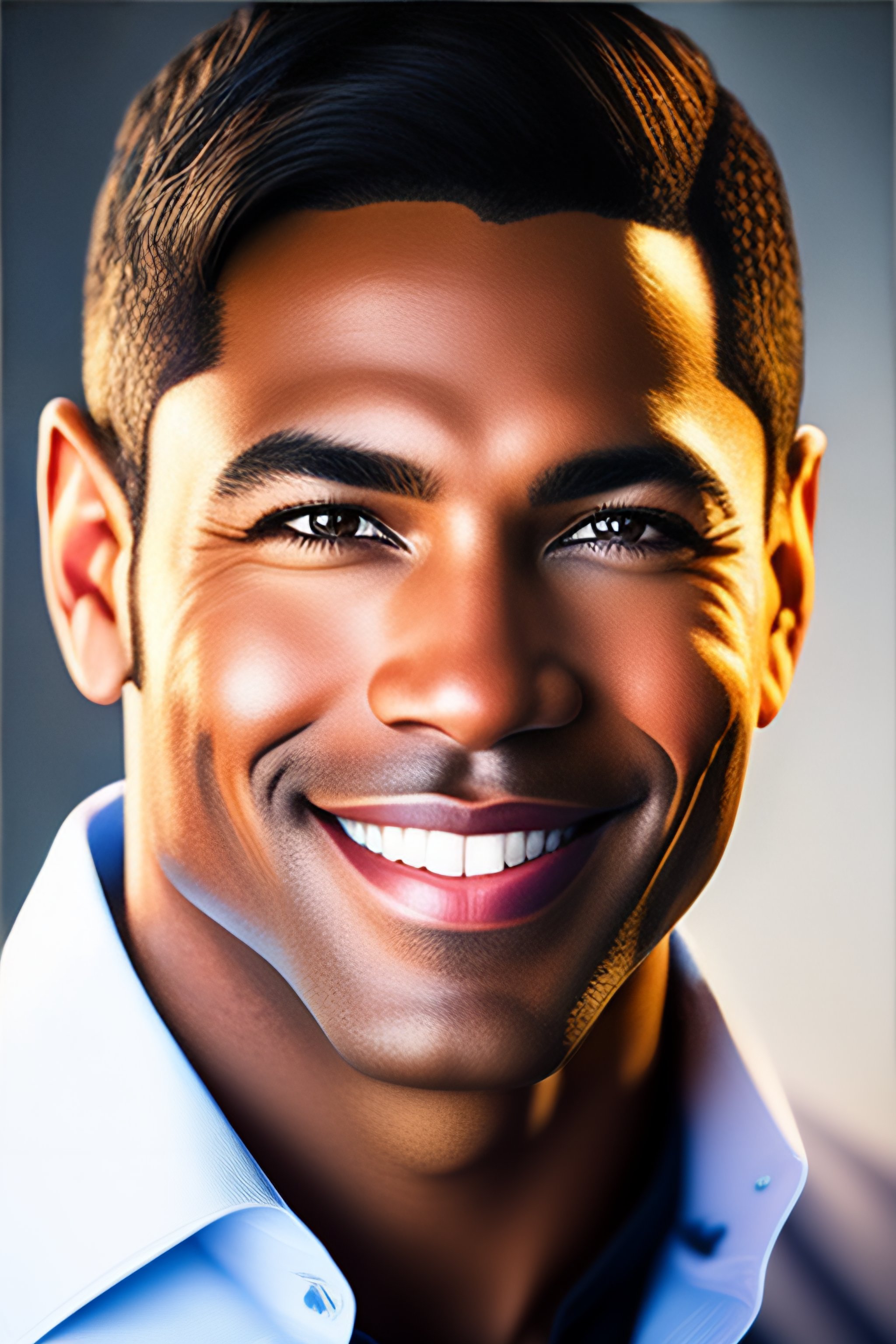A corporate professional profile photo of a successful man smiling, highly detailed full-color upper half body headshot photograph, best corporate photography photo winner, centered uncropped symmetrical beautiful masculine facial features, 4 k high resolution, canon 5d mark iii photo, professional studio lighting, face must be like clear smooth face of a person, camera facing expressive eyes, super resolution, proportionate lighting