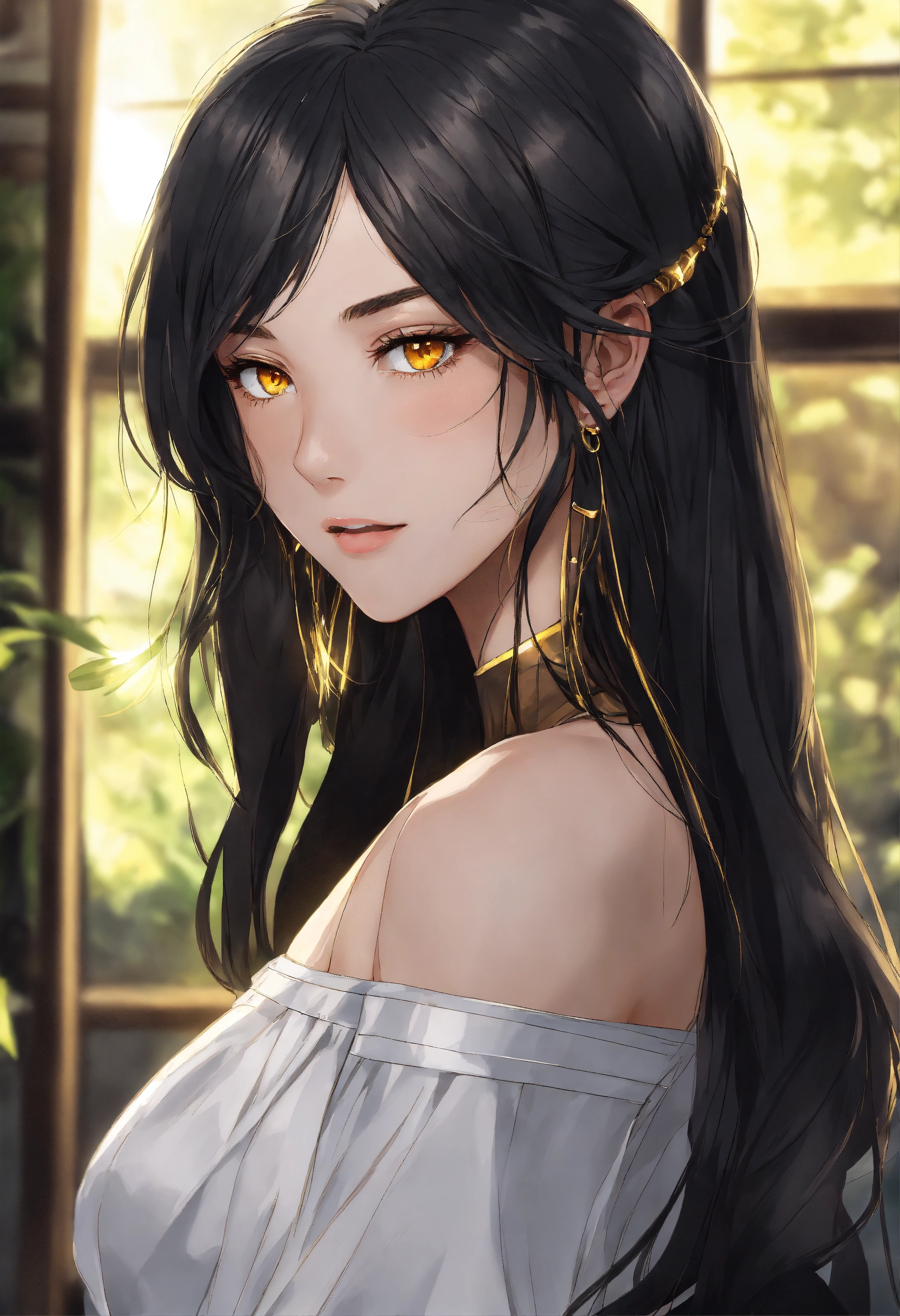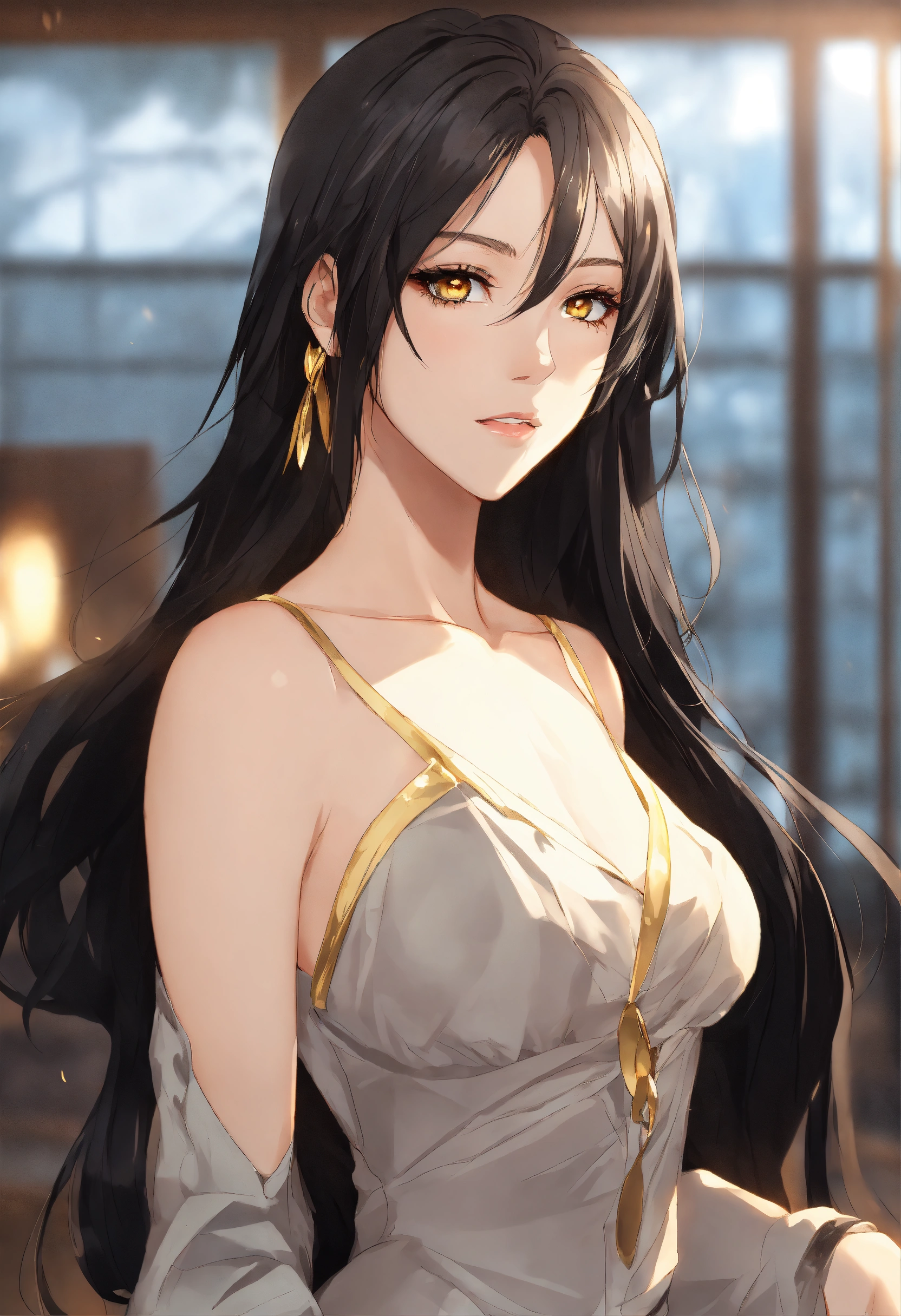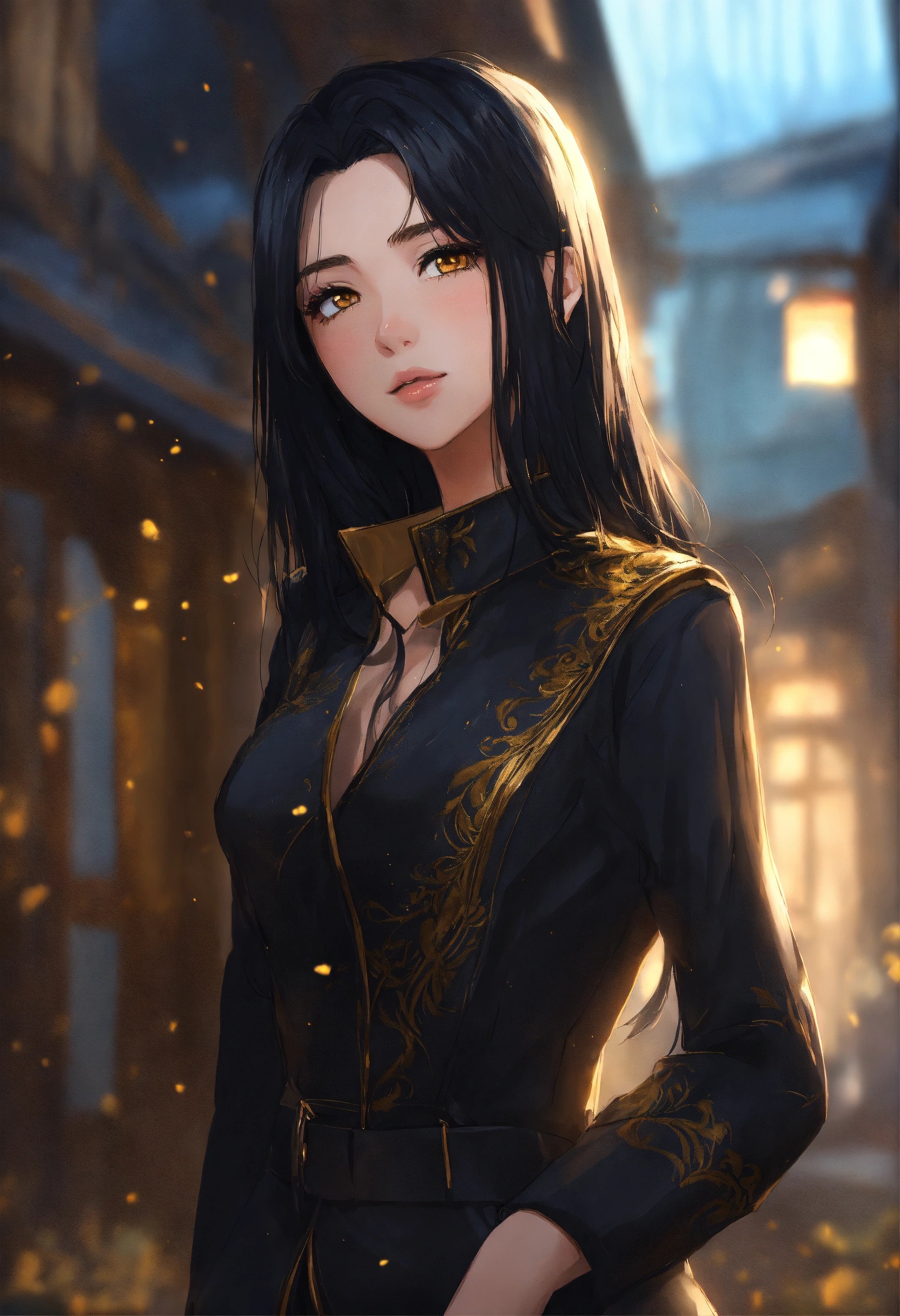 Woman 18 years old. shoulder length black straight hair. golden eyes. the face is beautiful, but not flashy. anime reskin style