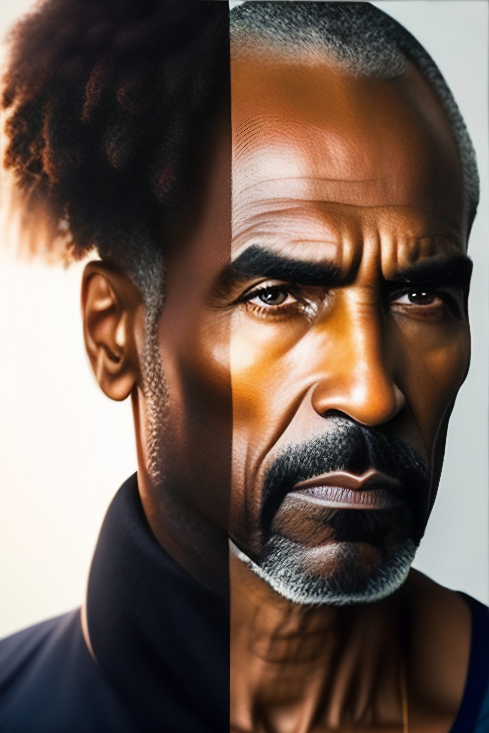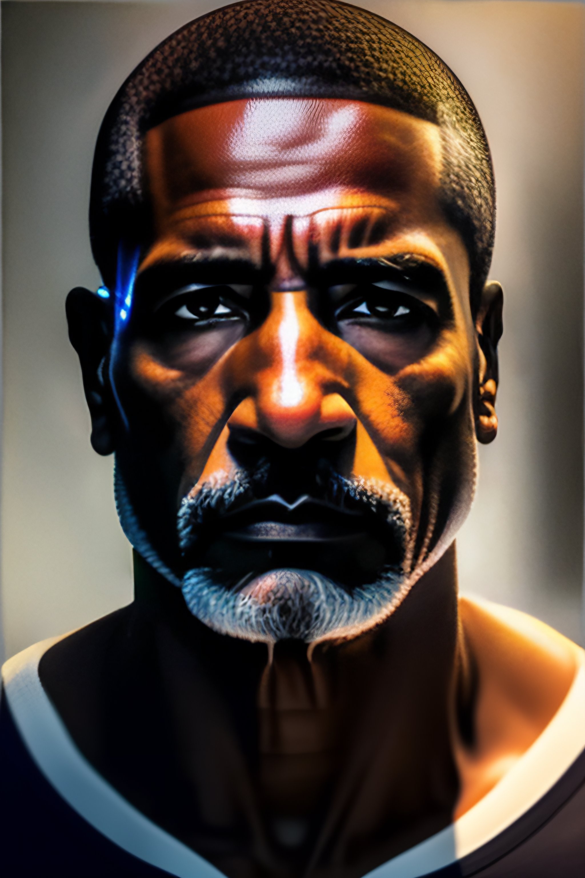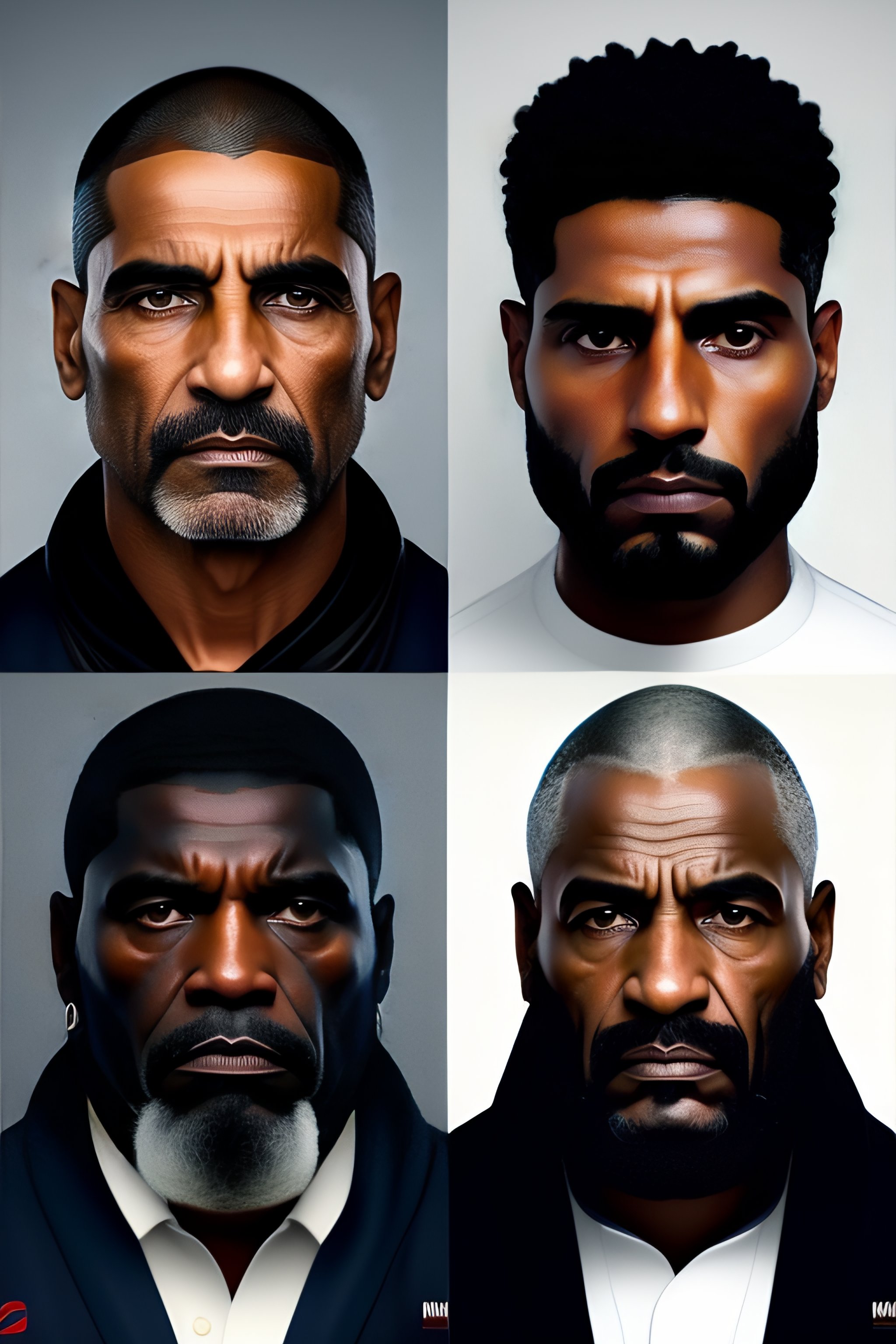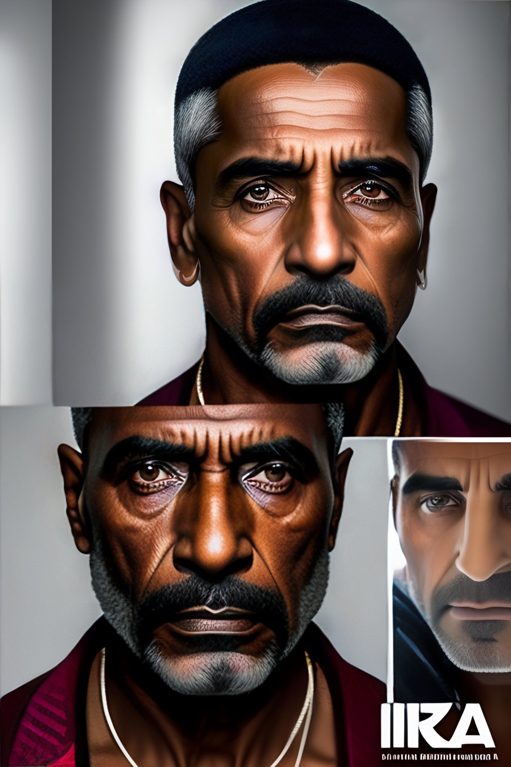 Hombre de mediana edad con rasgos árabes, cabeza rapada y abundante barba, nariz prominente con cejas gruesas y expresión fuerte, mirada penetrante y ojos negros